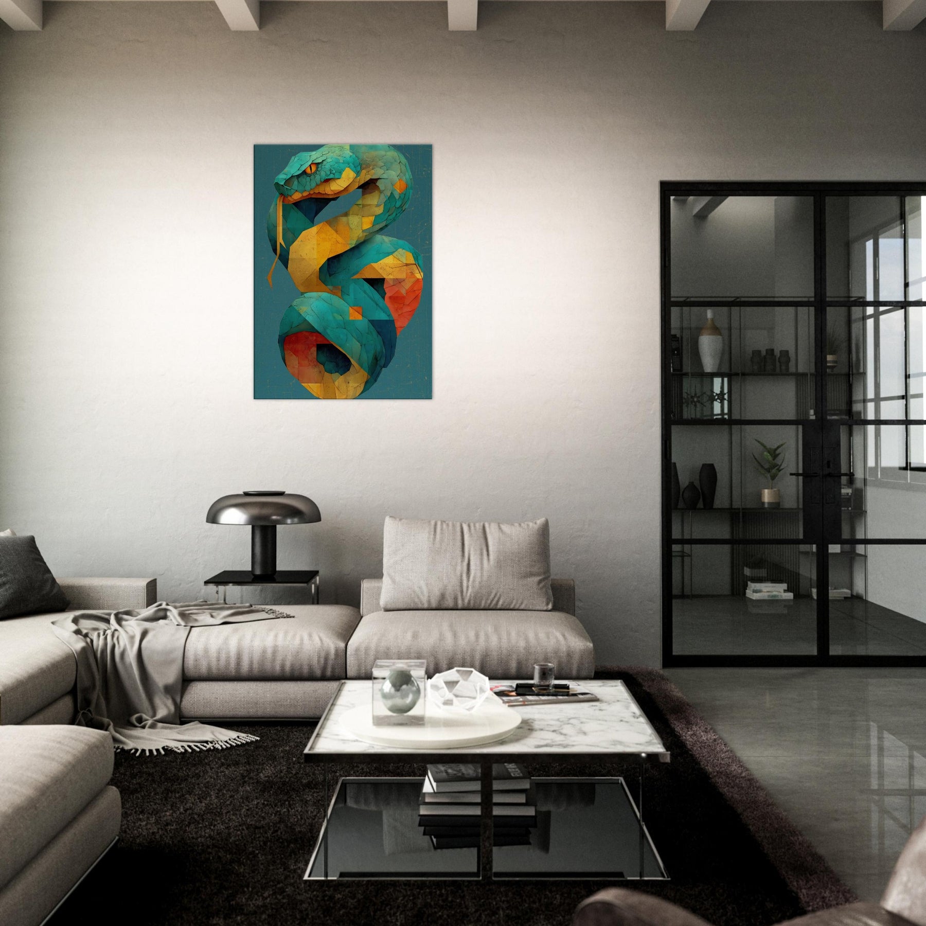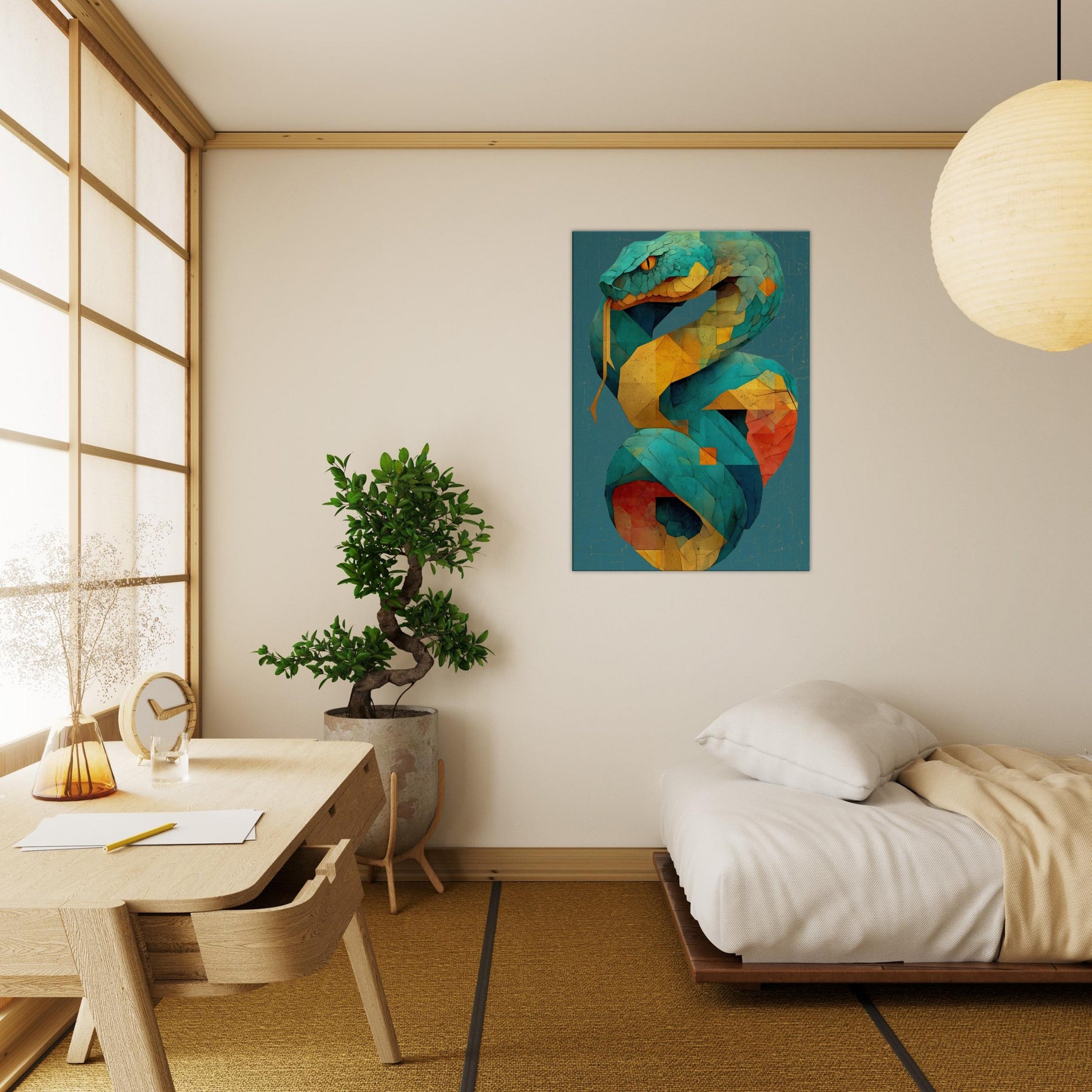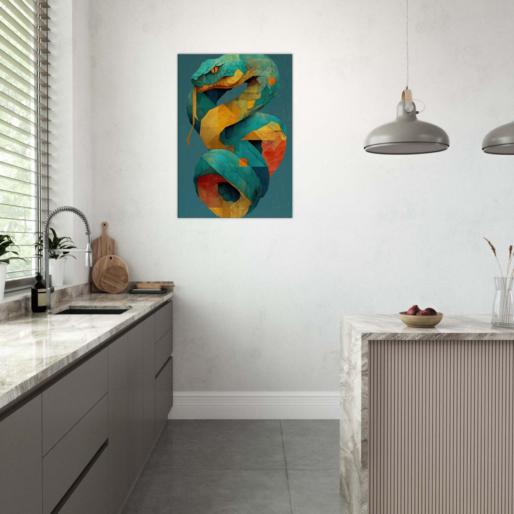 Infinity Serpent unfurls in shimmering tessellations, a living coil of color that glides through space with quiet grace. This abstract, mystical sculpture of light evokes a serpent coiled in time, its turquoise scales catching sun and lamp alike as yellow and coral facets pulse with warmth. Hang it where glow reflecting surfaces can echo its rhythm, and let the room breathe with a sense of moving infinity an atmosphere that invites contemplation, conversation, and a subtle, otherworldly energy.