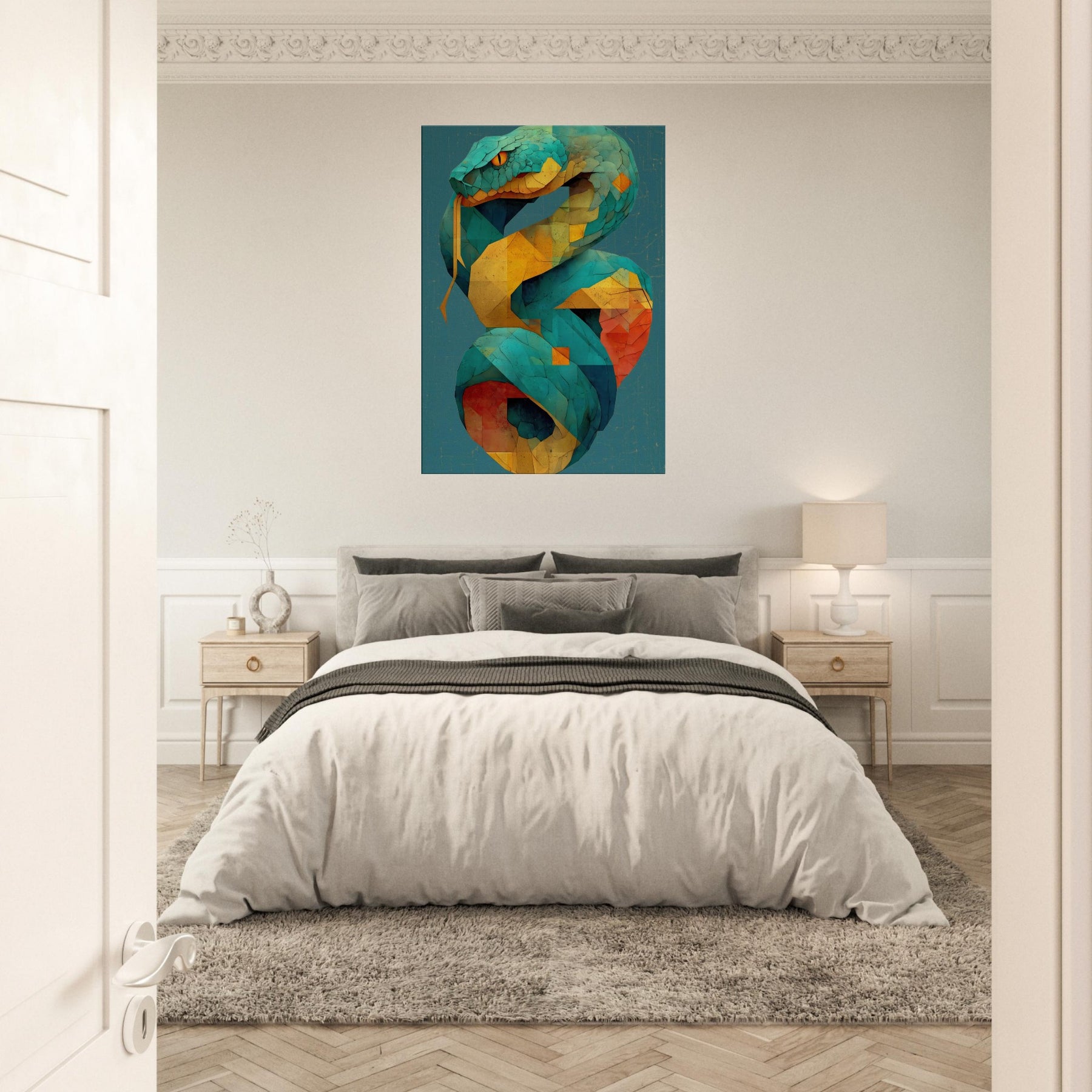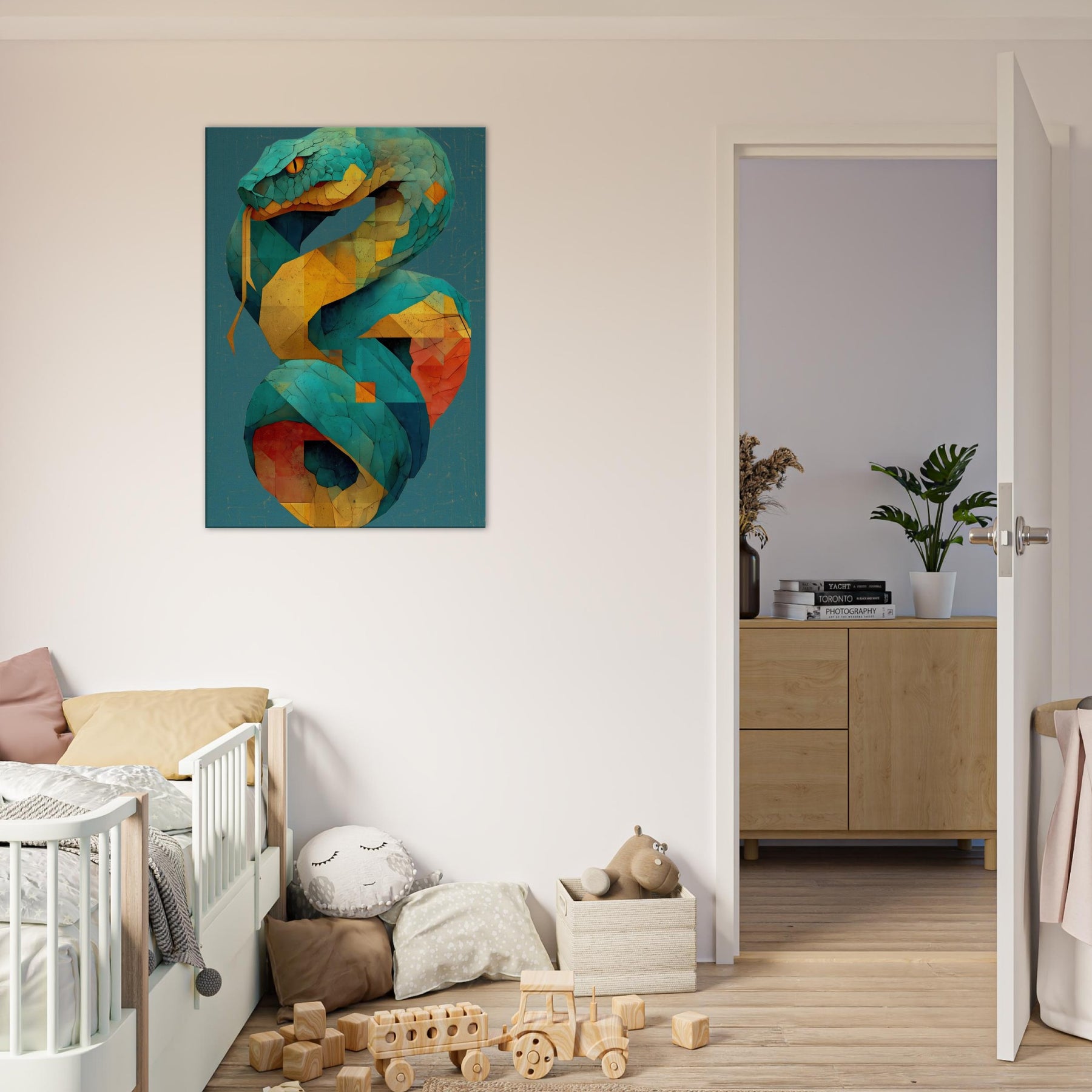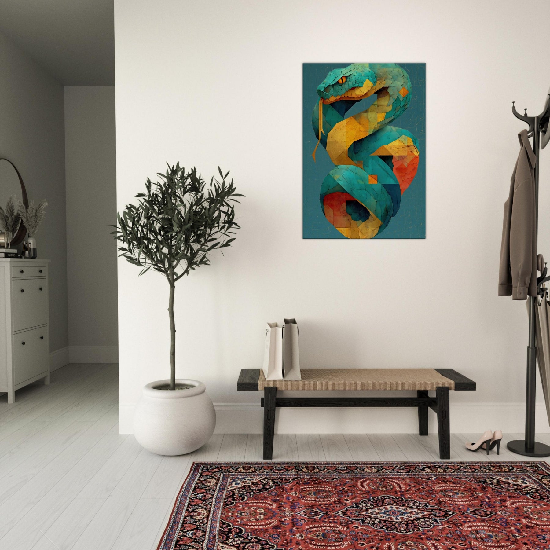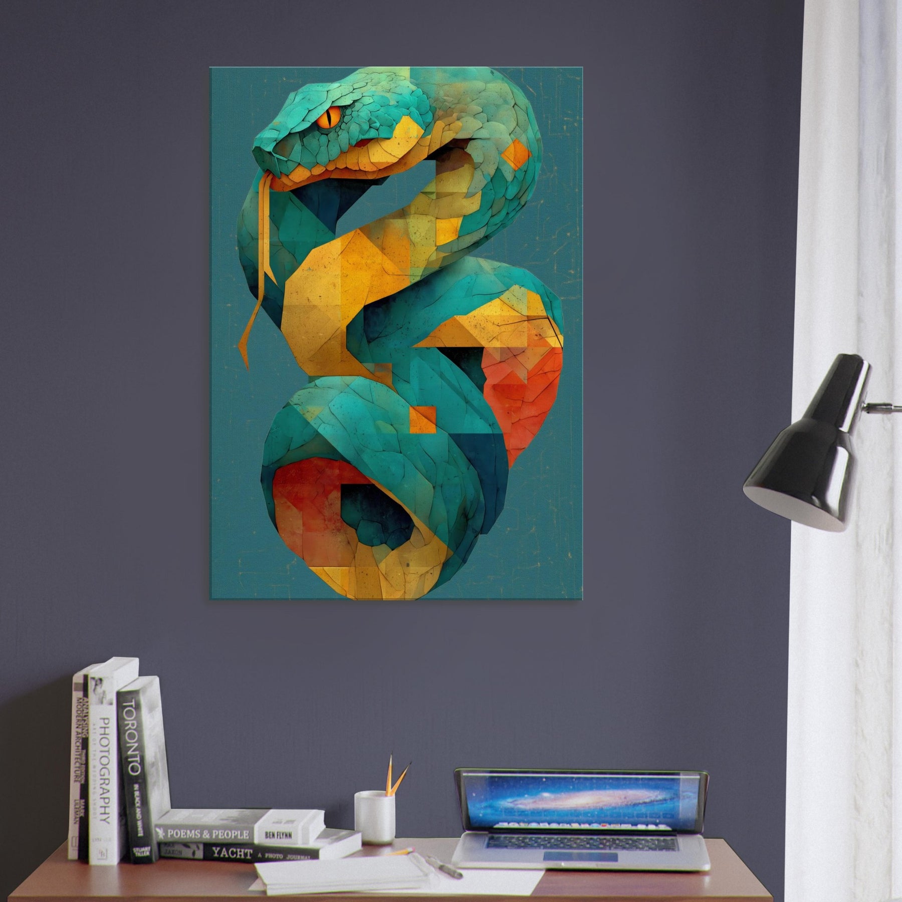 Infinity Serpent unfurls in shimmering tessellations, a living coil of color that glides through space with quiet grace. This abstract, mystical sculpture of light evokes a serpent coiled in time, its turquoise scales catching sun and lamp alike as yellow and coral facets pulse with warmth. Hang it where glow reflecting surfaces can echo its rhythm, and let the room breathe with a sense of moving infinity an atmosphere that invites contemplation, conversation, and a subtle, otherworldly energy.