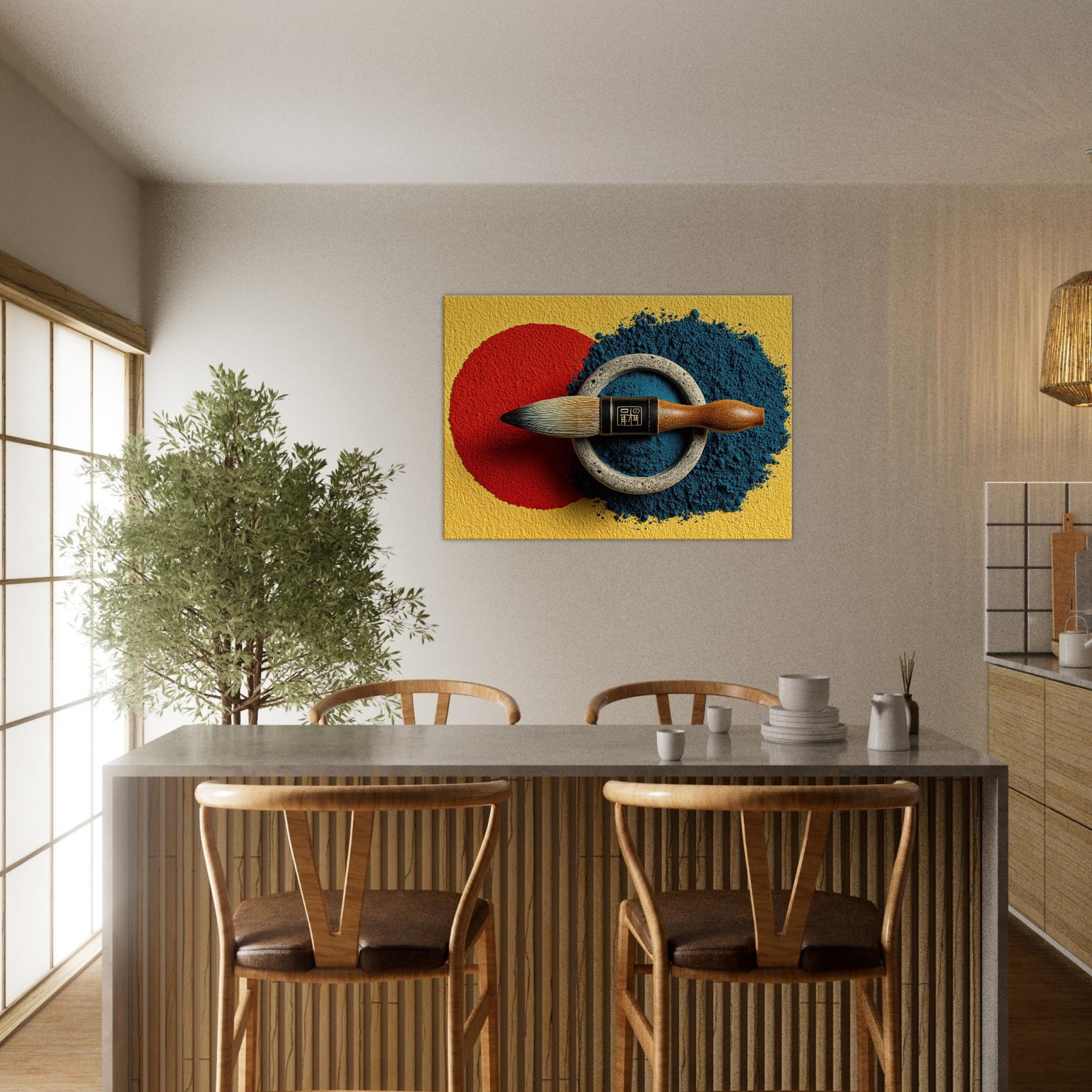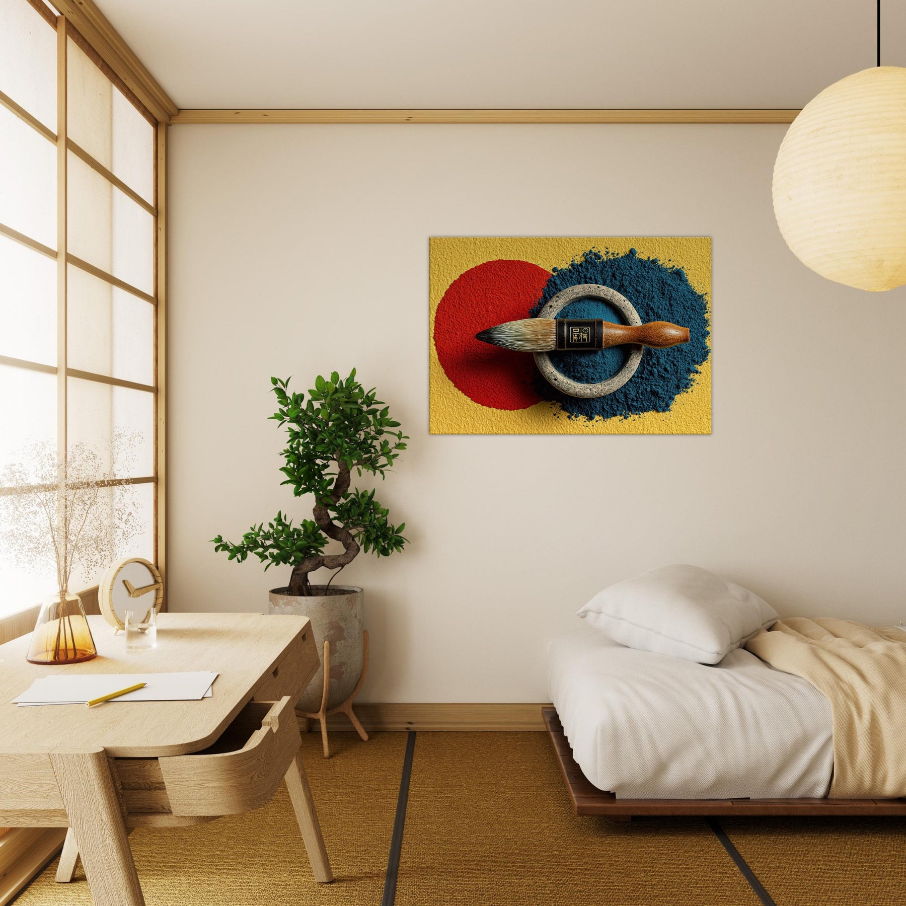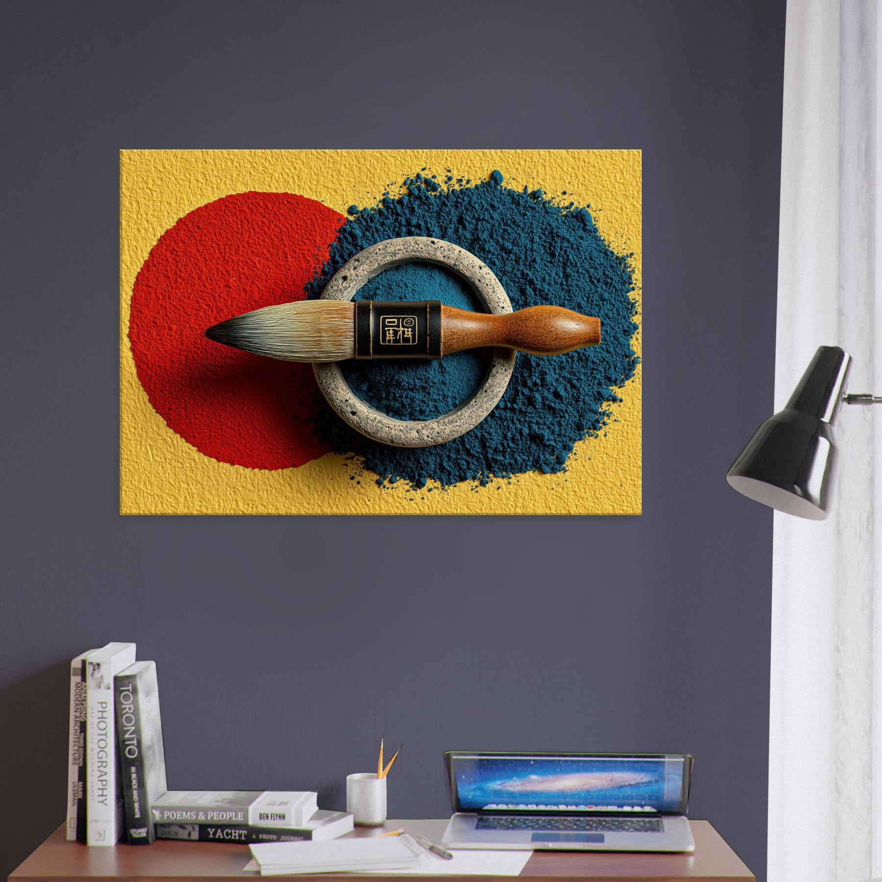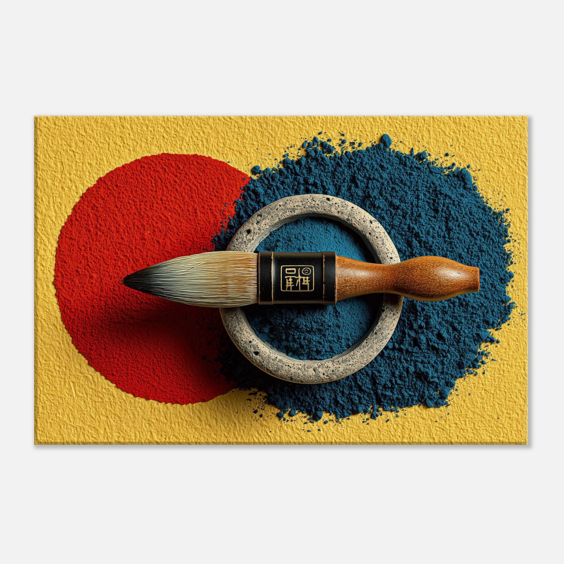 Enveloped in soft lamplight, the Calligraphy Brush & Inkstone invites a room to breathe with deliberate calm. The abstract arrangement nests a vivid red circle against a midnight blue spill, ringed by weathered metal that feels ancient and honest. This piece carries the scent of ink and the memory of practice, turning walls into a whisper of ritual. Hang it in a living room or study to slow the day, inviting focus, poetry, and quiet refinement.