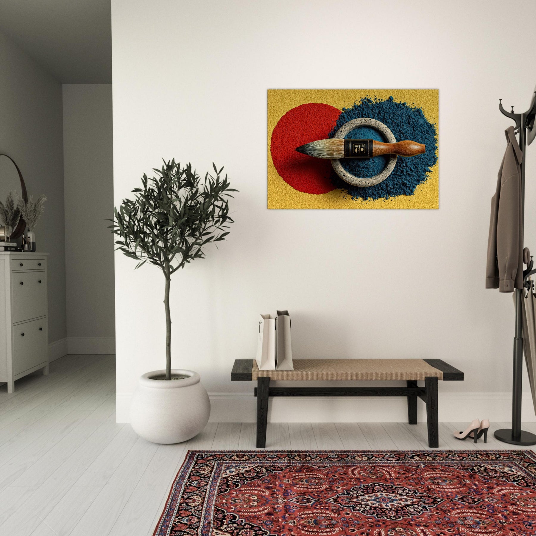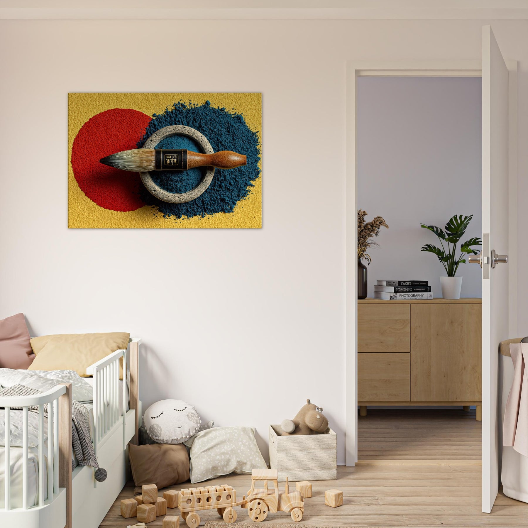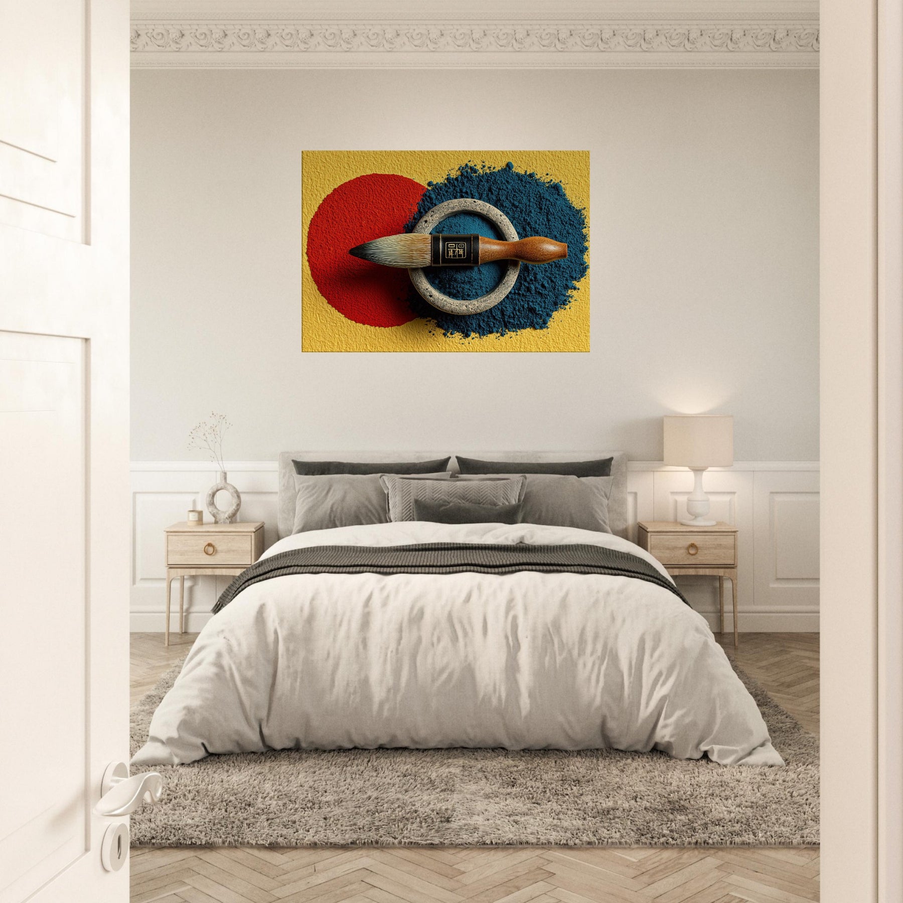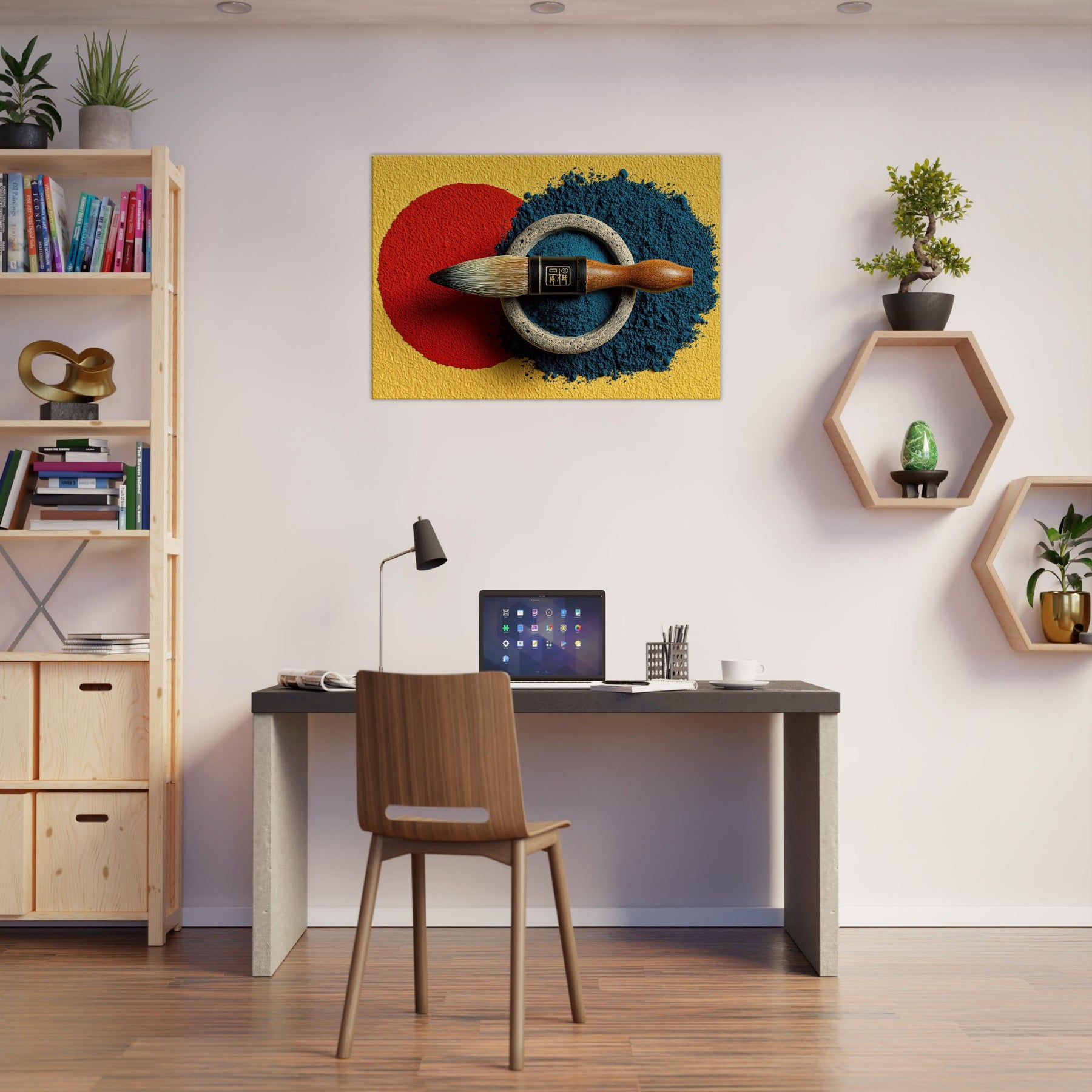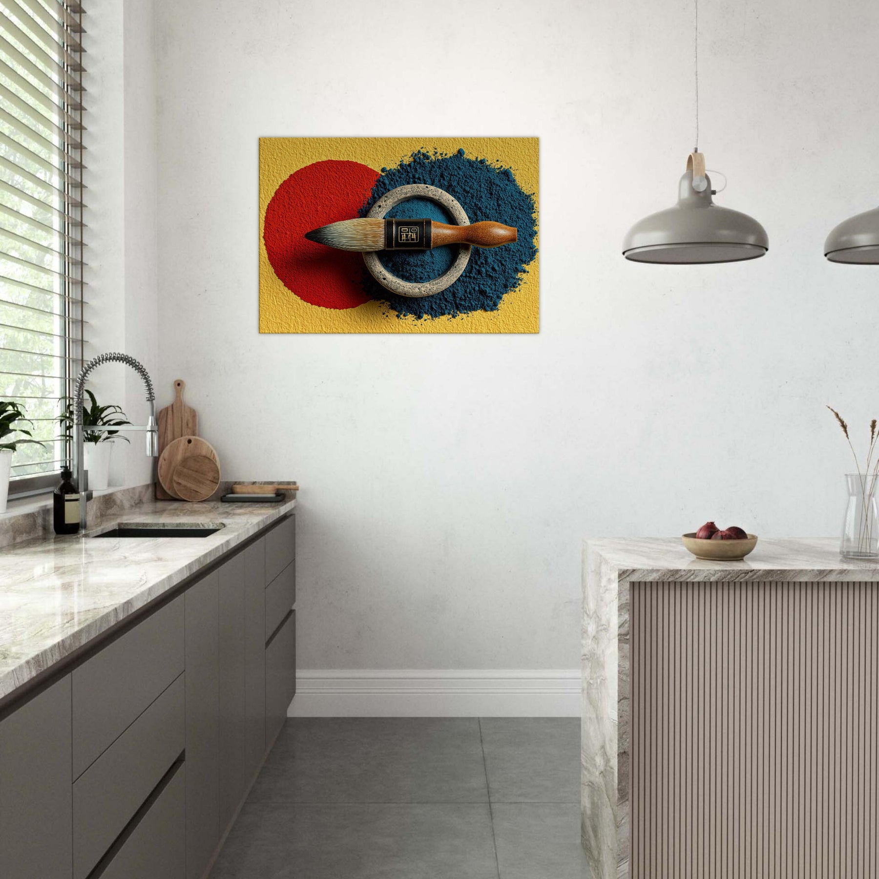 Enveloped in soft lamplight, the Calligraphy Brush & Inkstone invites a room to breathe with deliberate calm. The abstract arrangement nests a vivid red circle against a midnight blue spill, ringed by weathered metal that feels ancient and honest. This piece carries the scent of ink and the memory of practice, turning walls into a whisper of ritual. Hang it in a living room or study to slow the day, inviting focus, poetry, and quiet refinement.