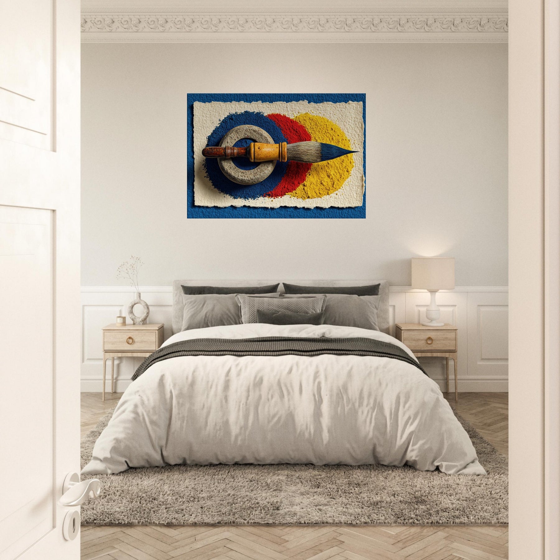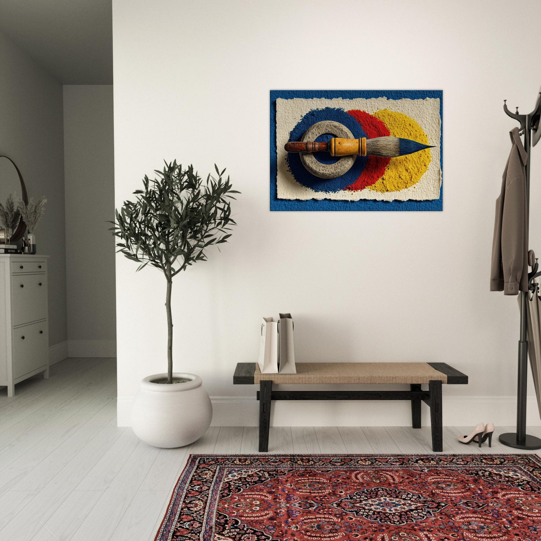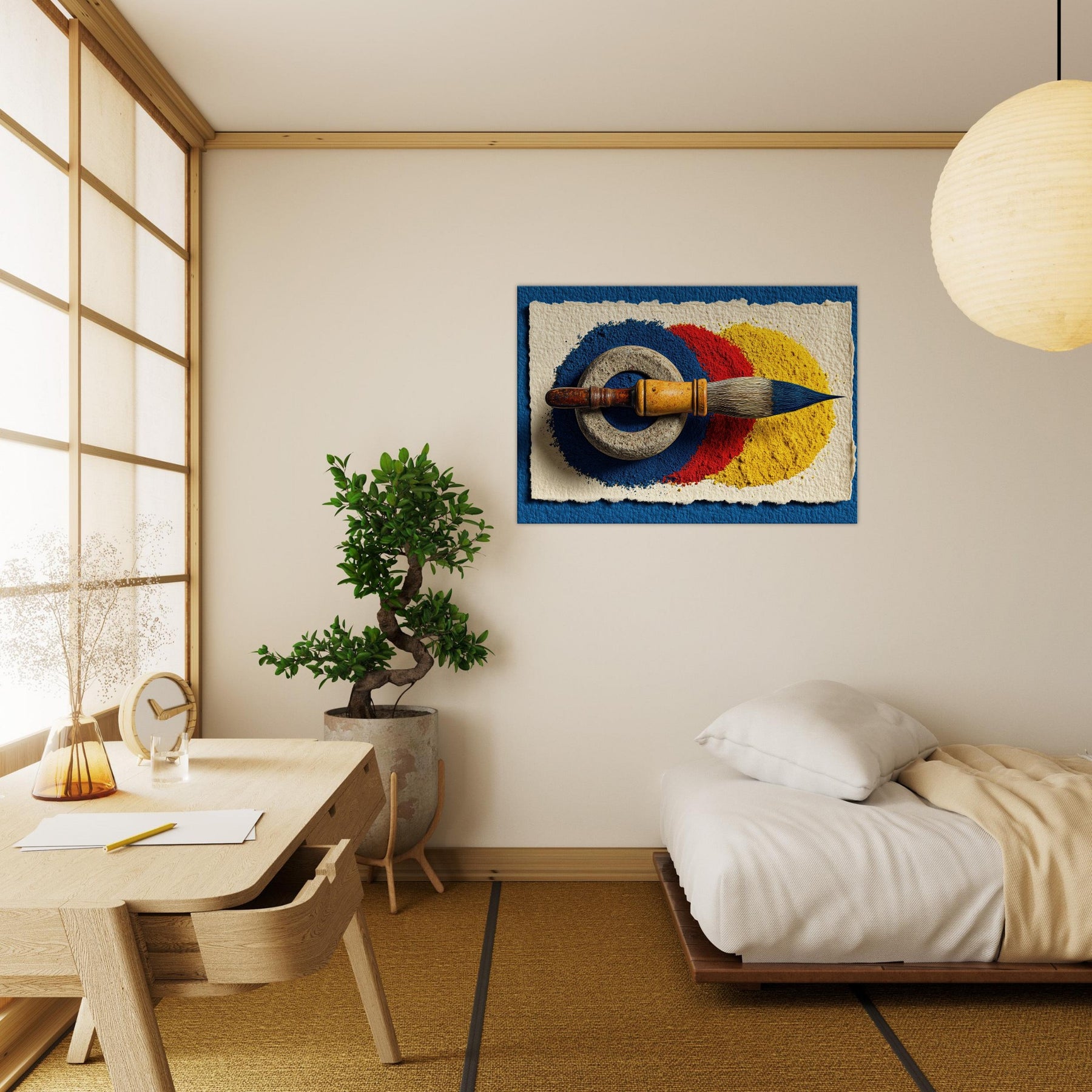 The Primary Subject, a Calligraphy Brush & Inkstone, lies at the heart of this abstract study, where history and present mingle in a single breath. A ring of stone mirrors the brush's calm arc, while pigments bloom behind in deep blue, bold red, and warm yellow, like a sonic print in motion. The piece invites soft, contemplative light into a living space, layering texture and color on walls, inspiring focus and quiet conversation. It feels both ancient manuscript and contemporary sculpture.