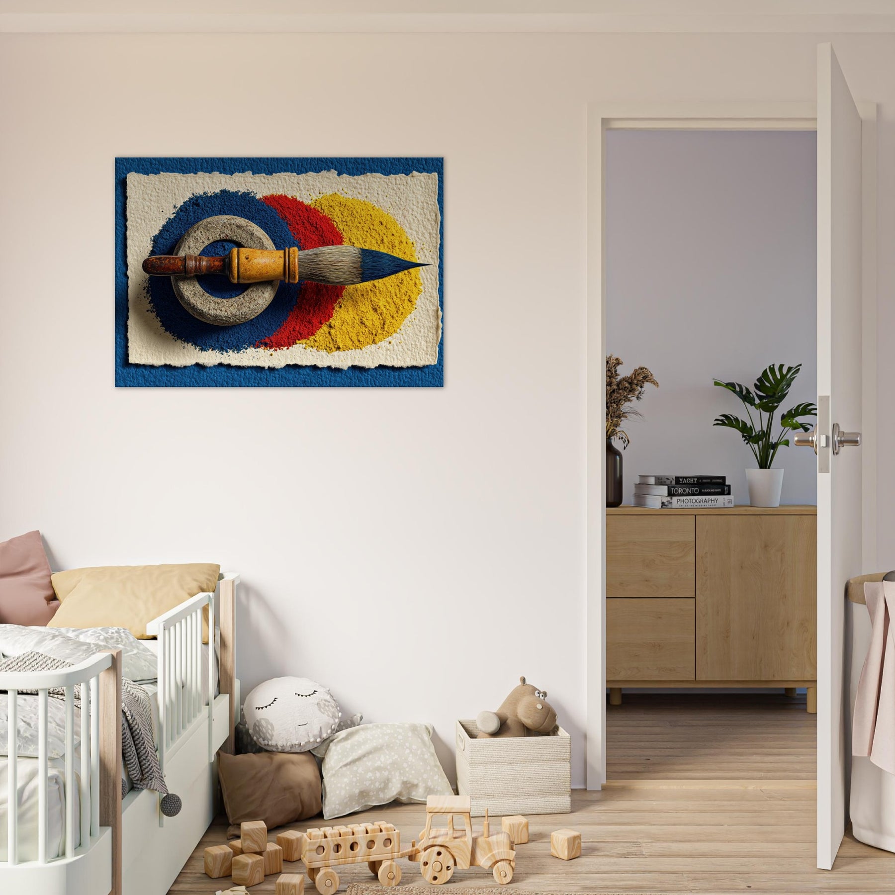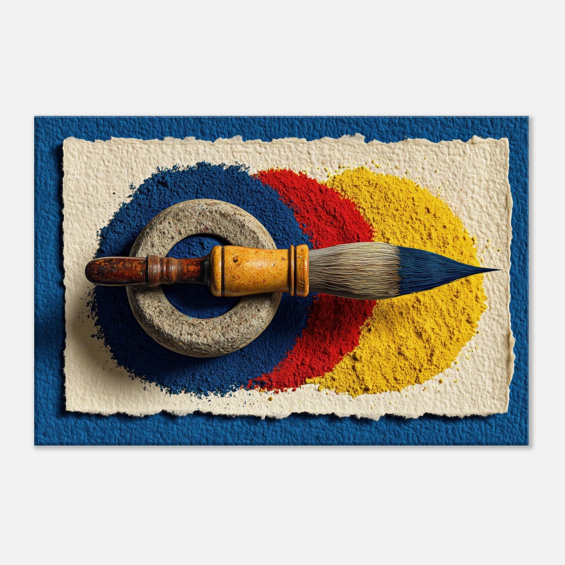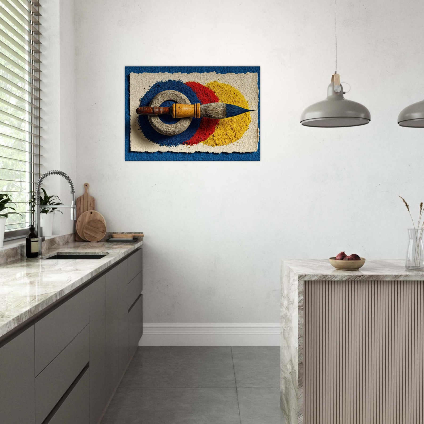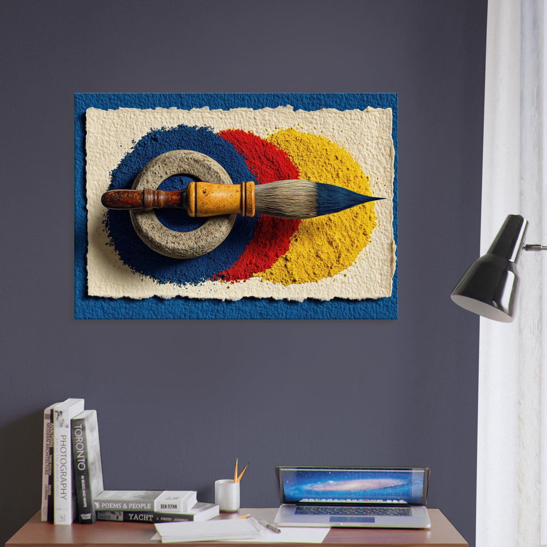 The Primary Subject, a Calligraphy Brush & Inkstone, lies at the heart of this abstract study, where history and present mingle in a single breath. A ring of stone mirrors the brush's calm arc, while pigments bloom behind in deep blue, bold red, and warm yellow, like a sonic print in motion. The piece invites soft, contemplative light into a living space, layering texture and color on walls, inspiring focus and quiet conversation. It feels both ancient manuscript and contemporary sculpture.