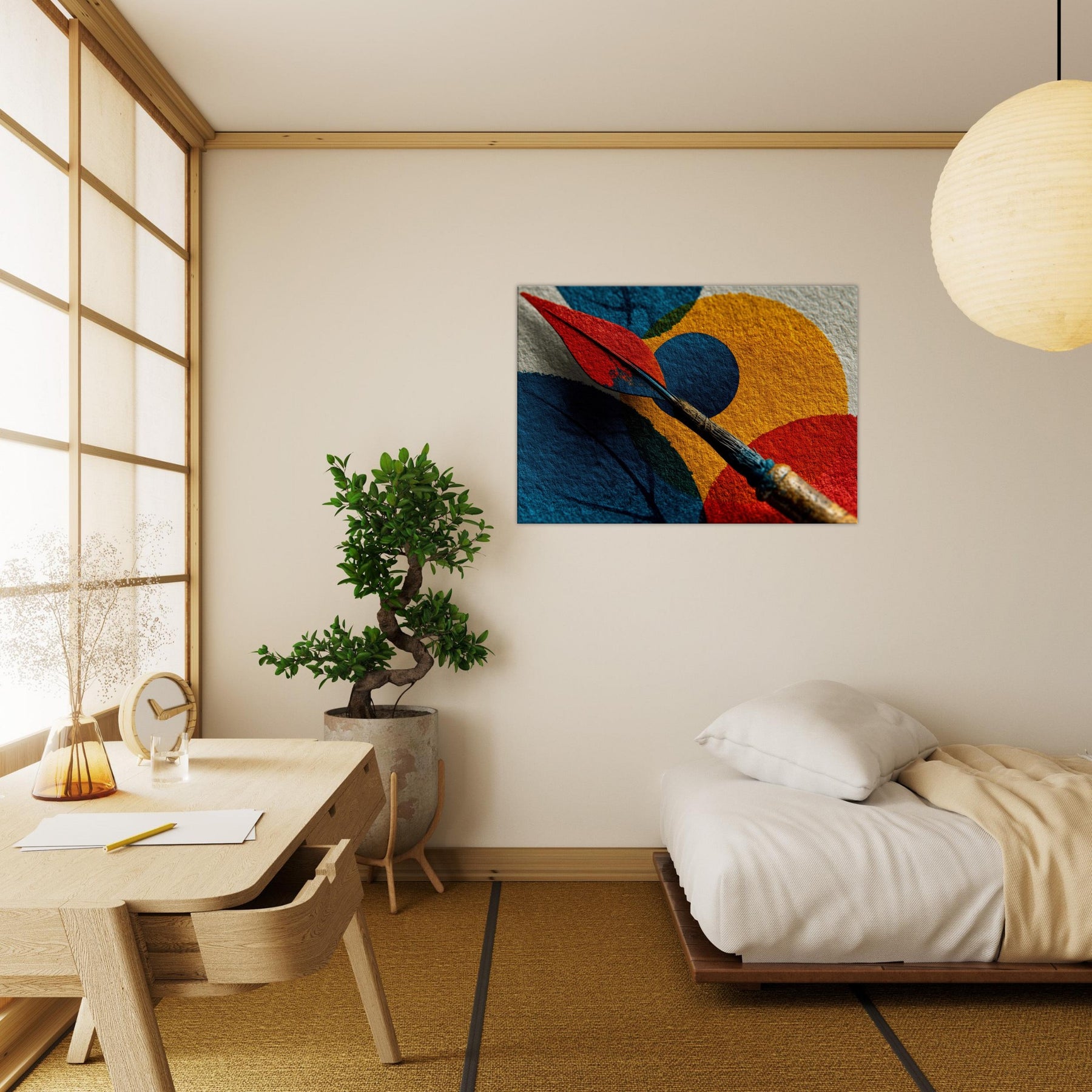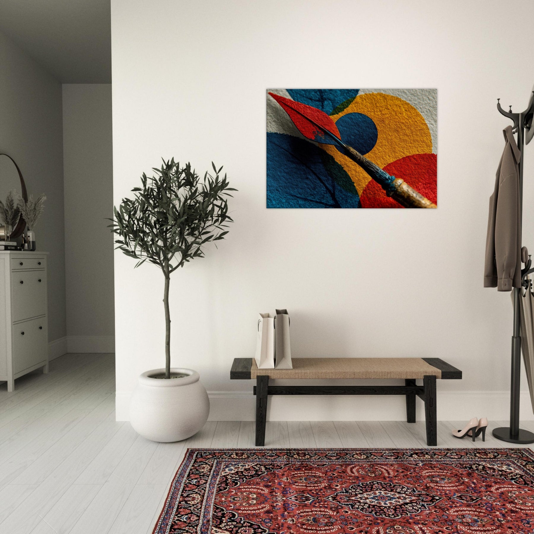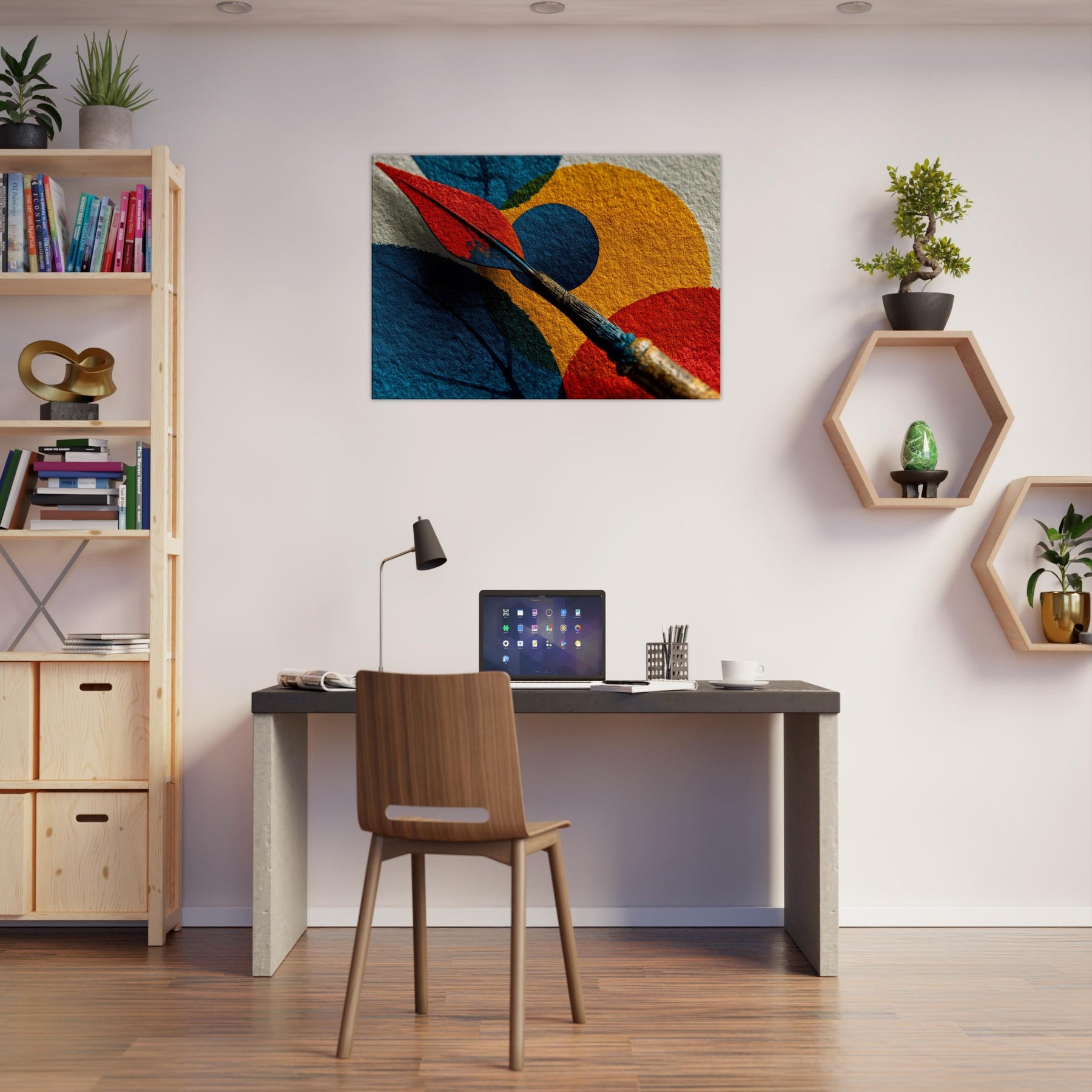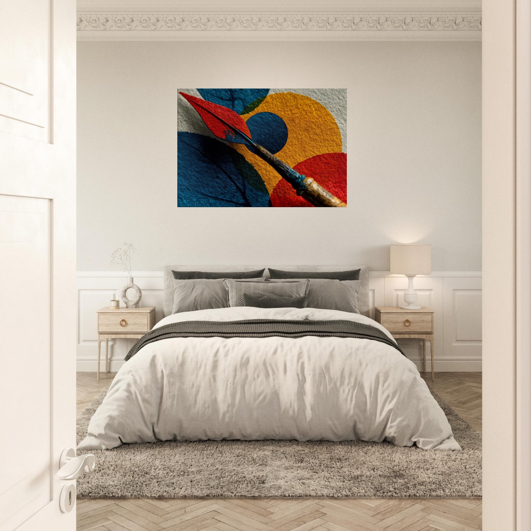 Let your walls breathe with a nocturnal blaze of color and quiet precision. This work centers on the Calligraphy Brush & Inkstone, captured in abstract form as if the act of writing itself were a . The brush’s red arc cuts across layered circles of blue, gold, and charcoal, inviting the eye to travel and rest. Ideal for a living room or study, it conjures focus without stiffness, a tactile, ink scented presence that elevates the space with movement and meaning.