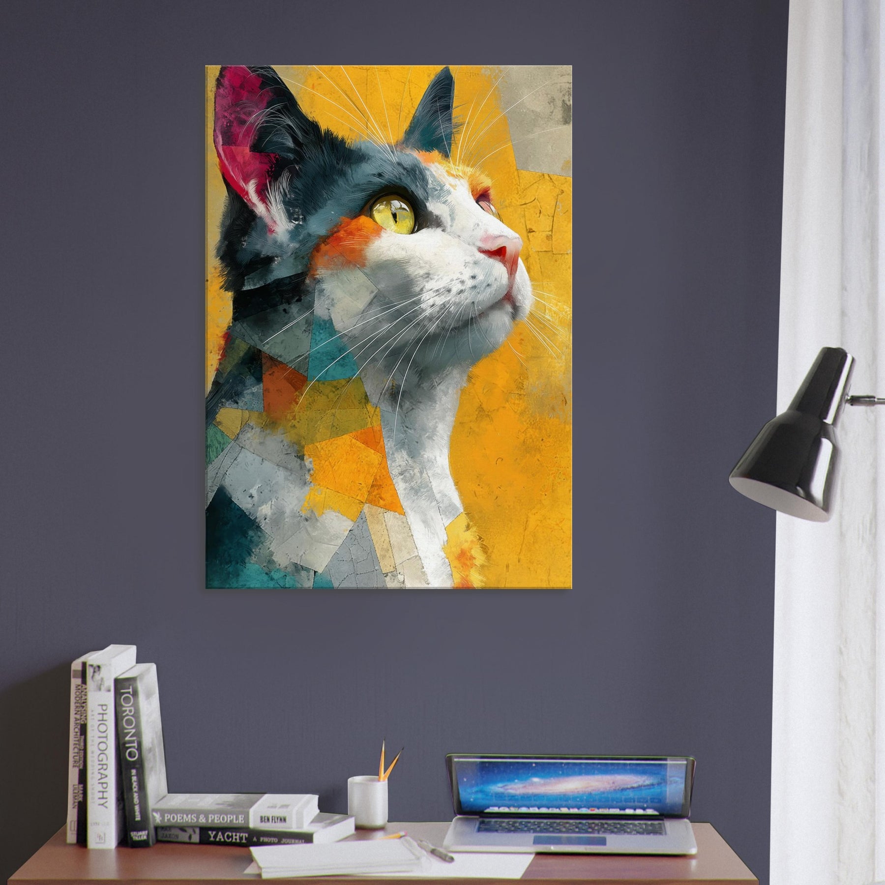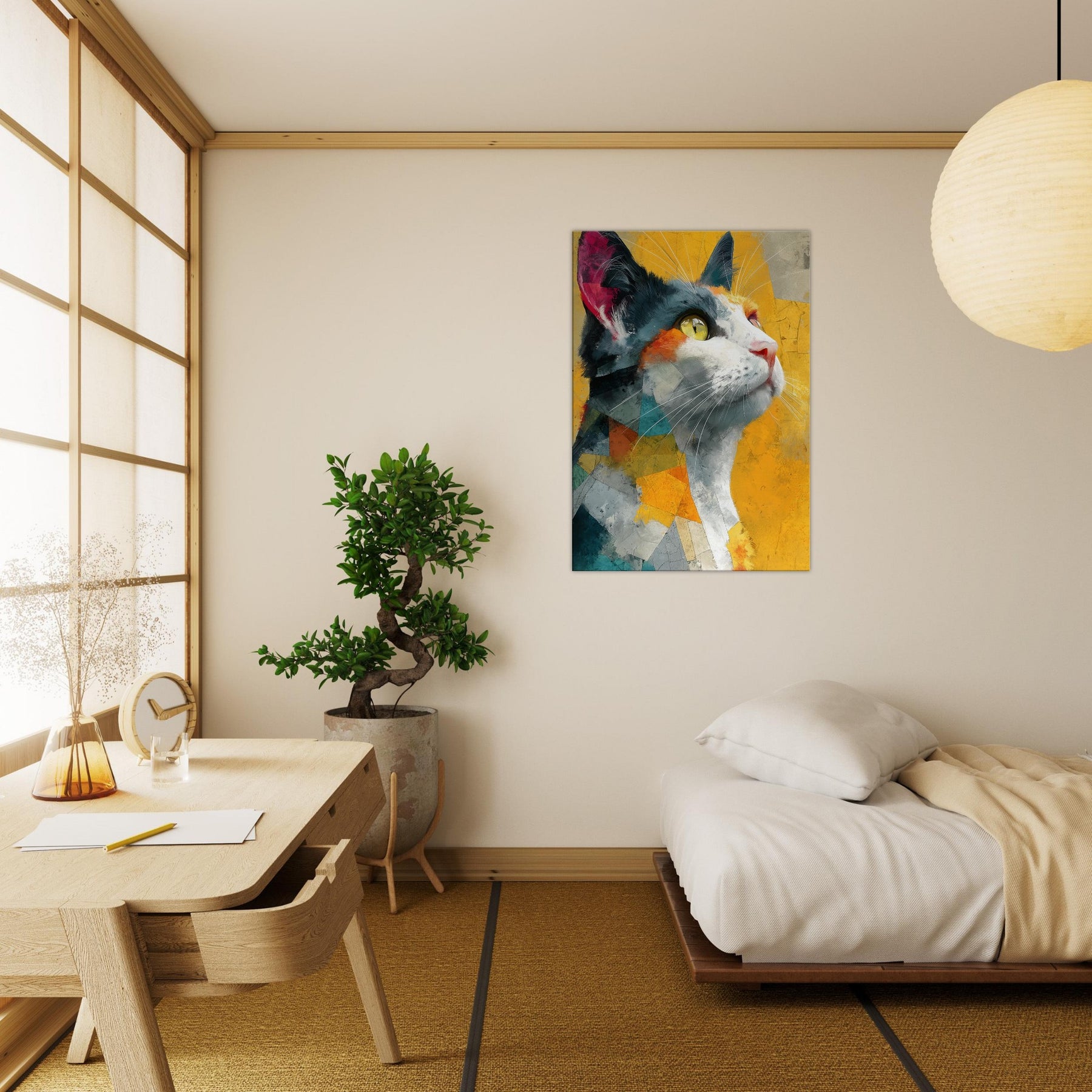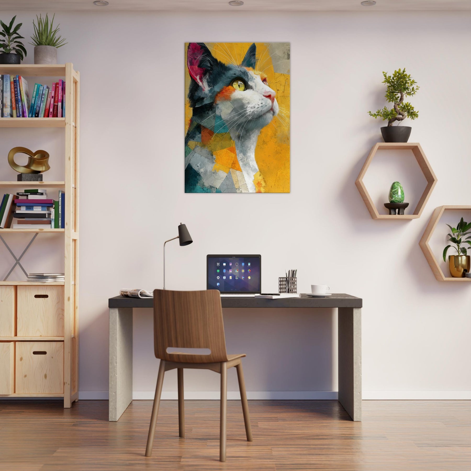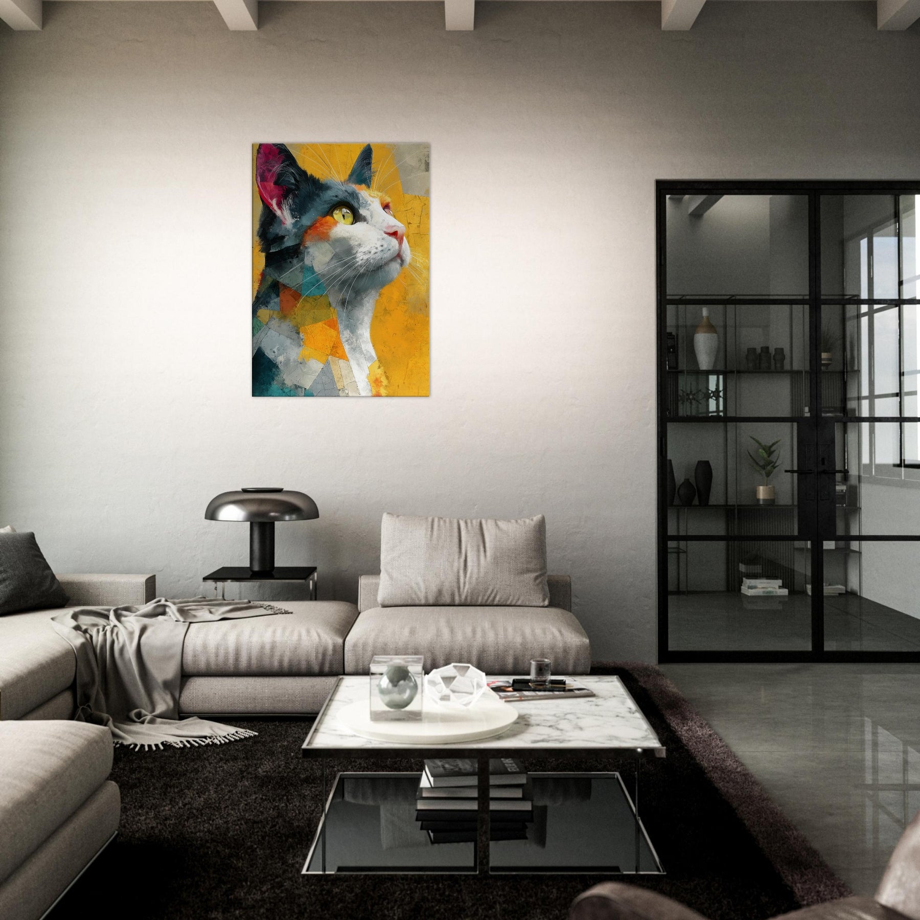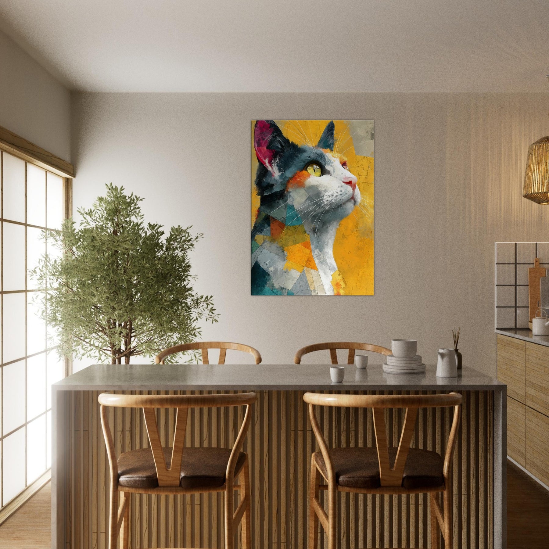 Against a sun washed yellow backdrop, this Cat becomes a dance of light and texture. The painterly shards scatter across the neck and chest, like sunlit mosaic, while delicate whiskers arc free in the air. The gaze is bright and curious, inviting quiet moments of wonder. In a living room, this piece radiates warmth, capturing a playful yet serene energy that softens corners and sparks conversation. A striking fusion of form and color, it makes a space feel larger, more intimate, and endlessly inviting.
