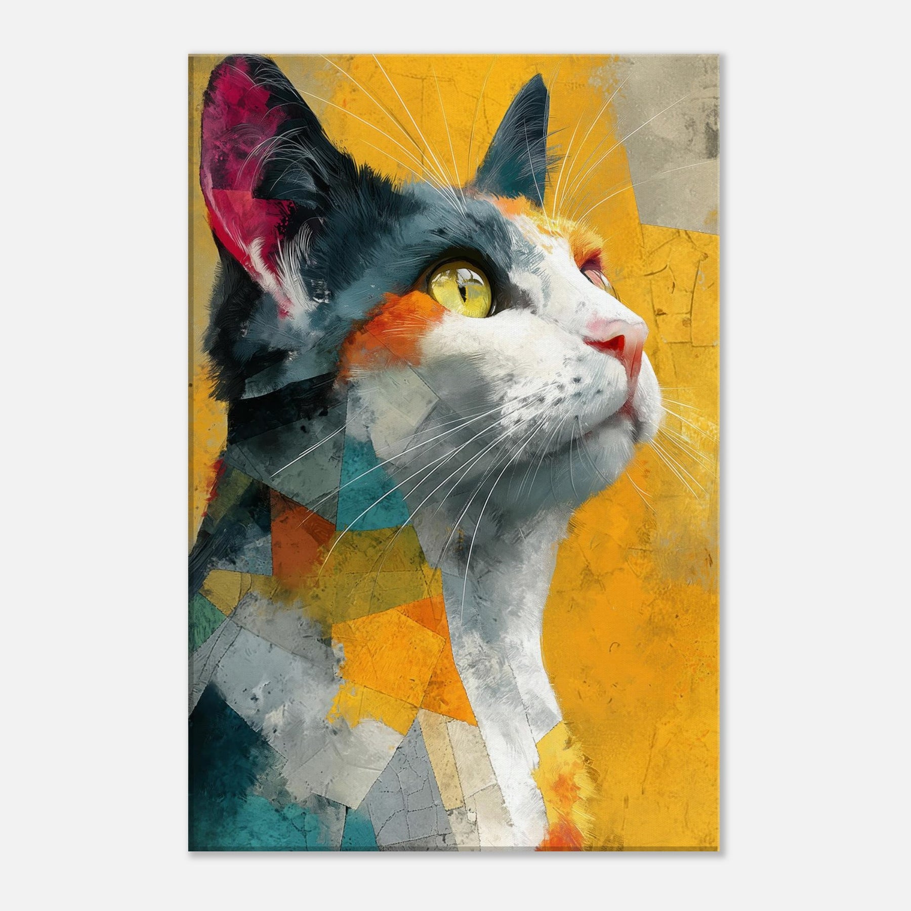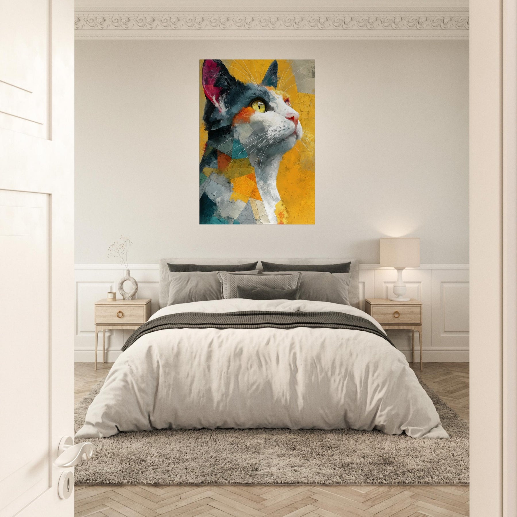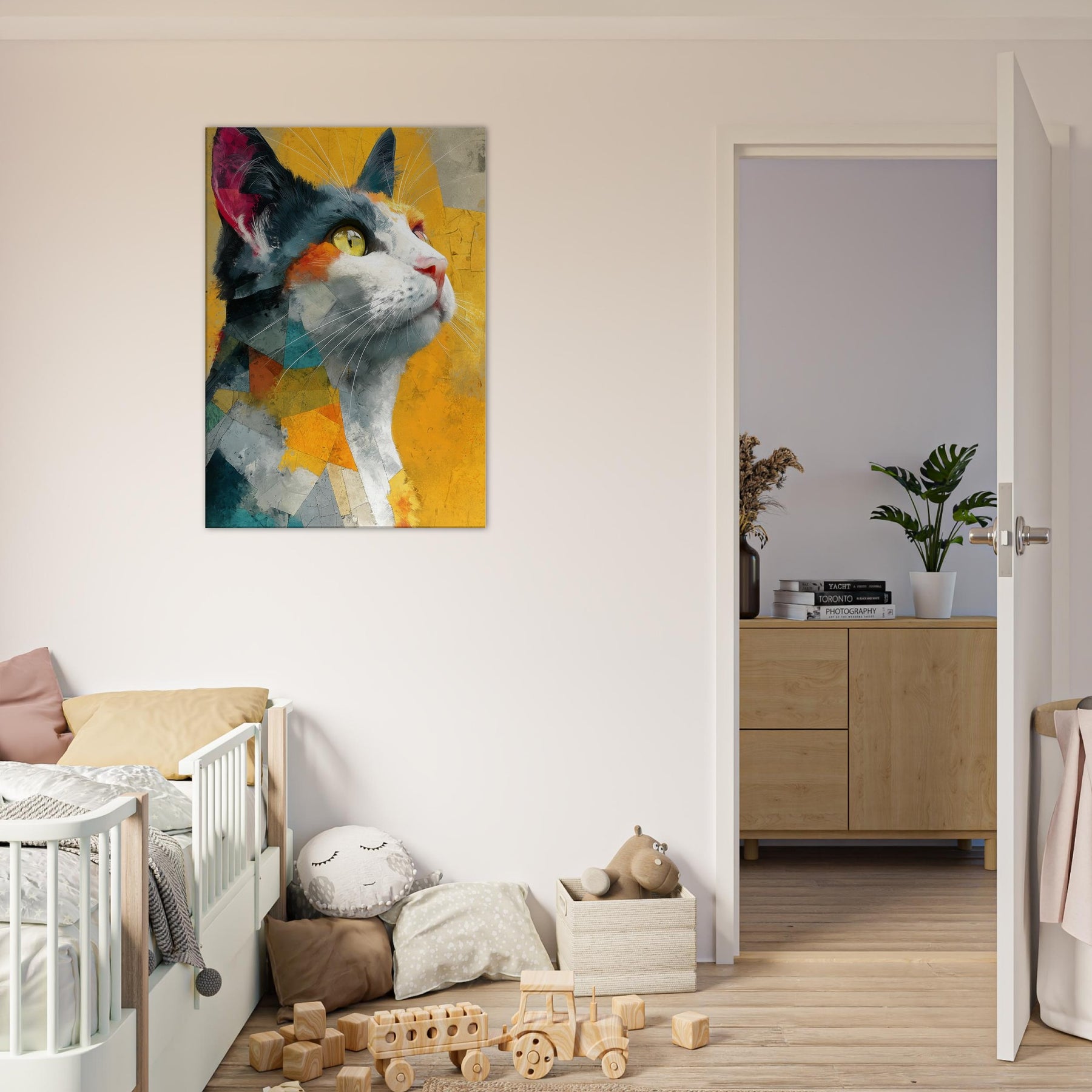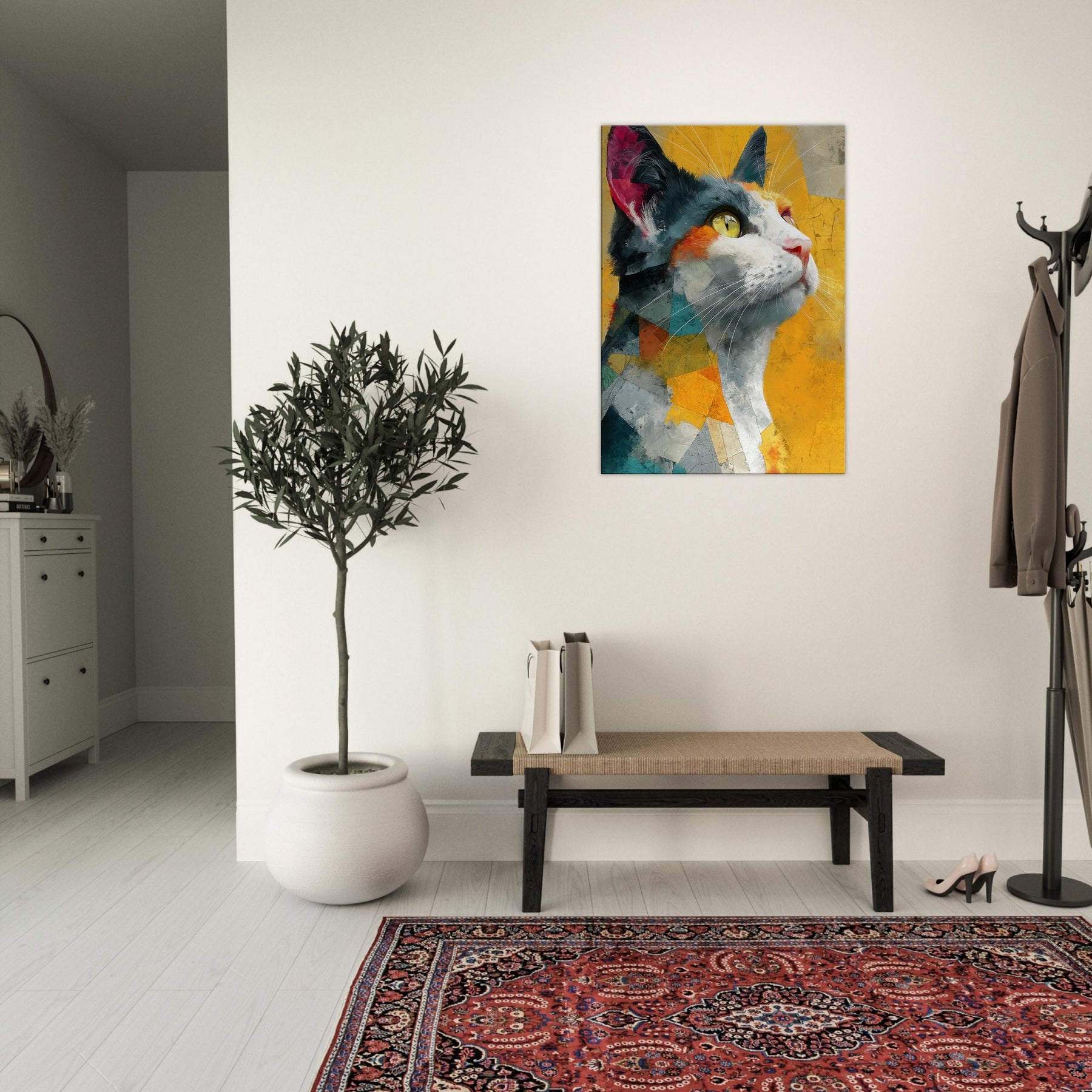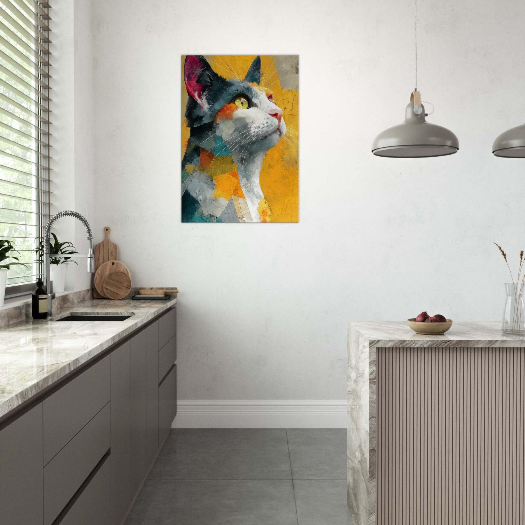 Against a sun washed yellow backdrop, this Cat becomes a dance of light and texture. The painterly shards scatter across the neck and chest, like sunlit mosaic, while delicate whiskers arc free in the air. The gaze is bright and curious, inviting quiet moments of wonder. In a living room, this piece radiates warmth, capturing a playful yet serene energy that softens corners and sparks conversation. A striking fusion of form and color, it makes a space feel larger, more intimate, and endlessly inviting.