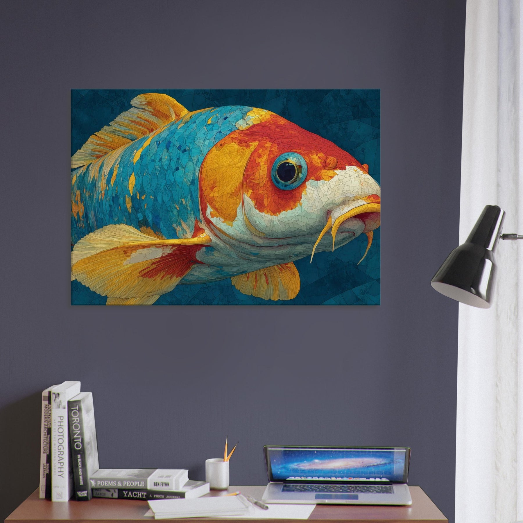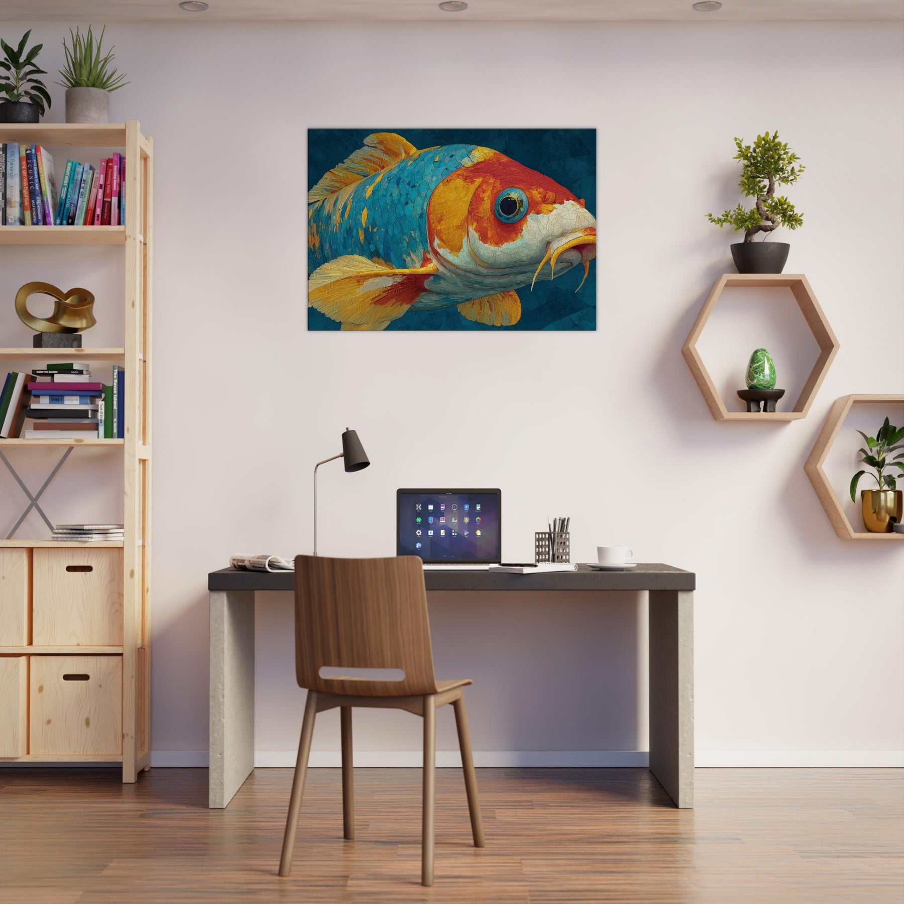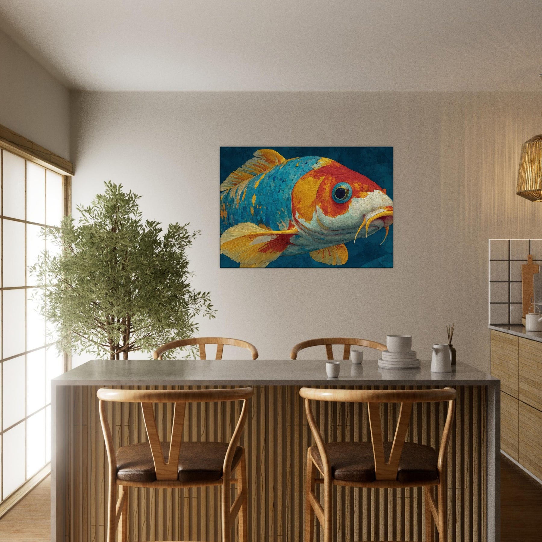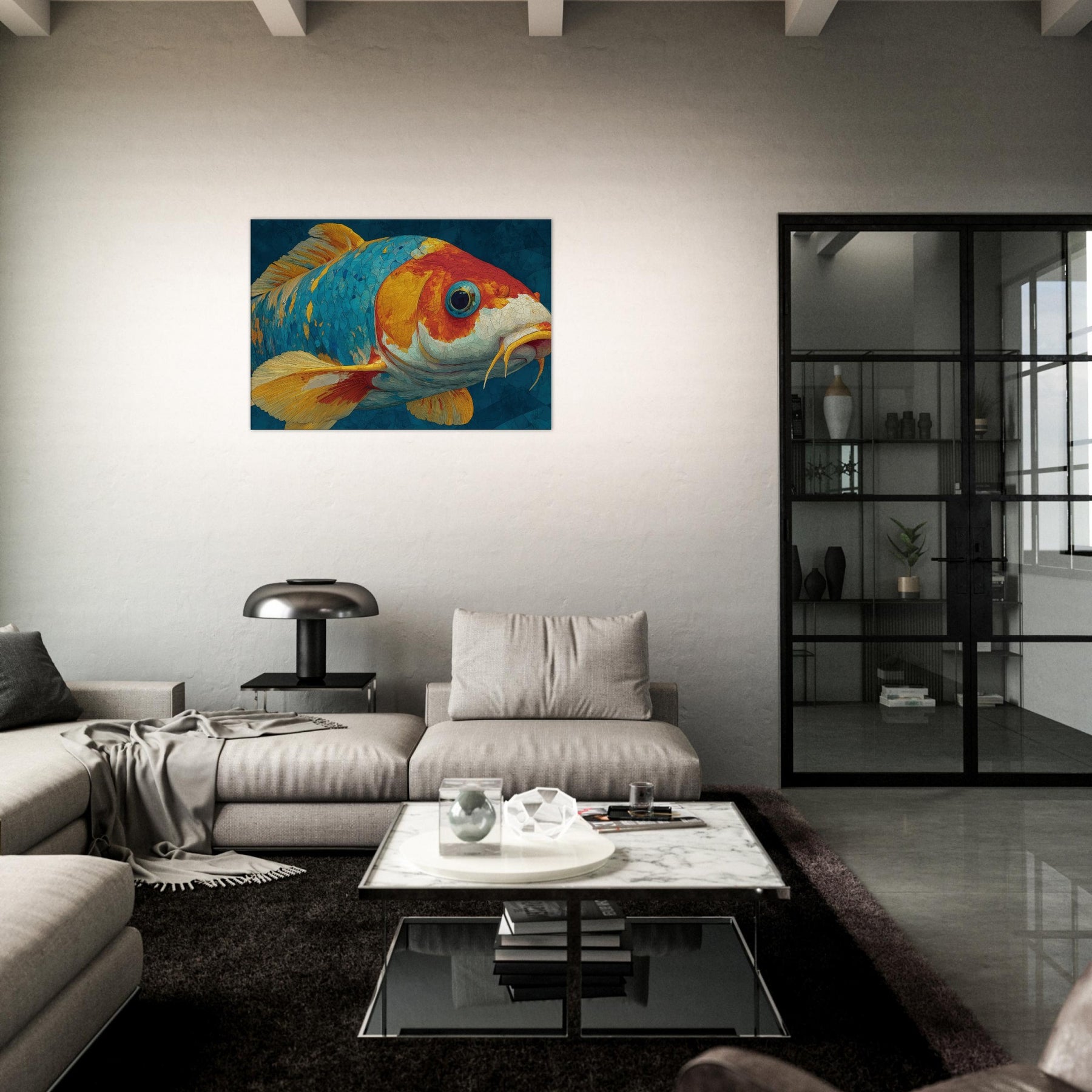 Immerse your space in the luminous pulse of a Koi Fish captured in abstract form. This painting swirls with electric blues and molten oranges, each tile like fragment catching light and echoing a tranquil current. The piece invites a meditative gaze, turning a wall into a living window where energy and calm coexist. Ideal for a serene corner or a bold focal point, it elevates mood with graceful movement and refined color an ode to vitality in flightlike harmony.
