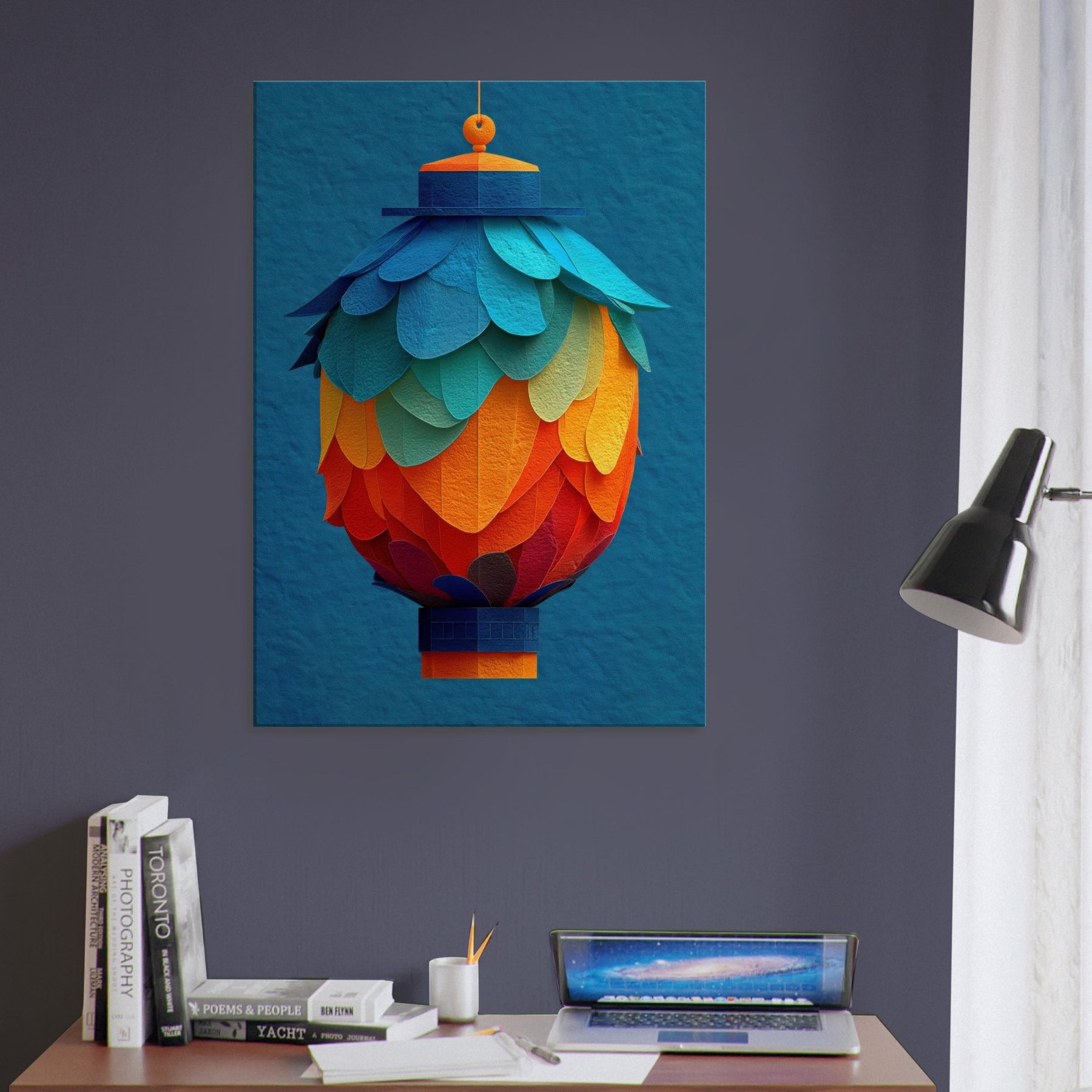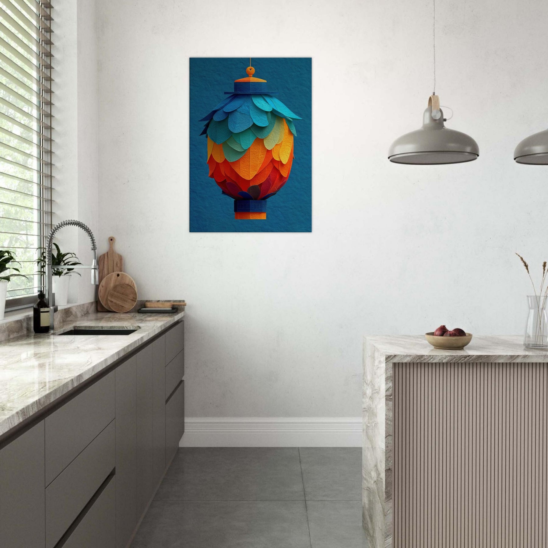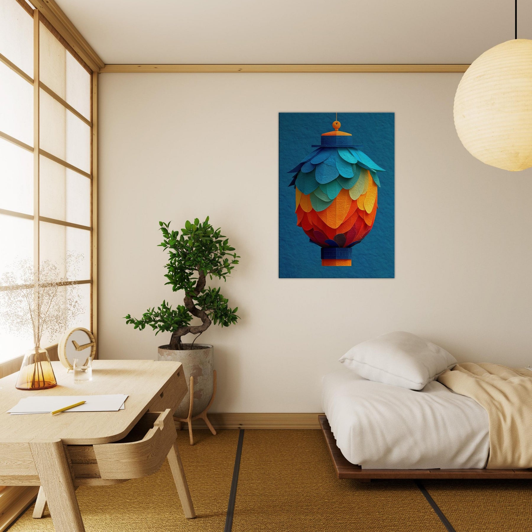 Like a suspended bouquet of flame and sky, this Paper Lantern invites the room to breathe. Its abstract layers bloom in a sunset of teal, azure, and coral, casting a soft, mingled glow across walls and furniture. The texture recalls handmade paper, rewarding close looking with delicate shadows and a warm, human scale presence. Hang it where daylight yields to evening, and let the lantern's quiet radiance soften edges, spark conversation, and transform a familiar space into a tranquil, artful sanctuary.