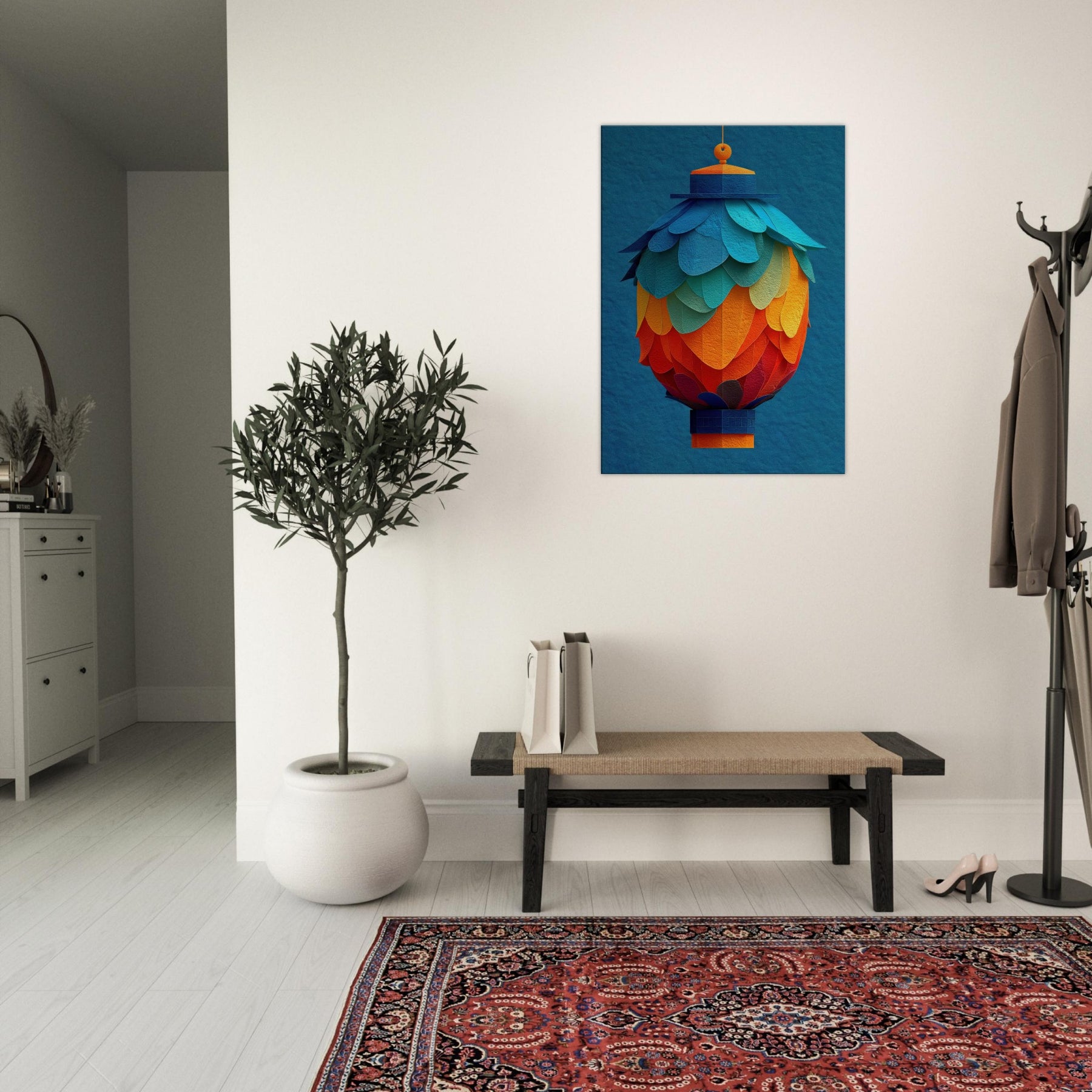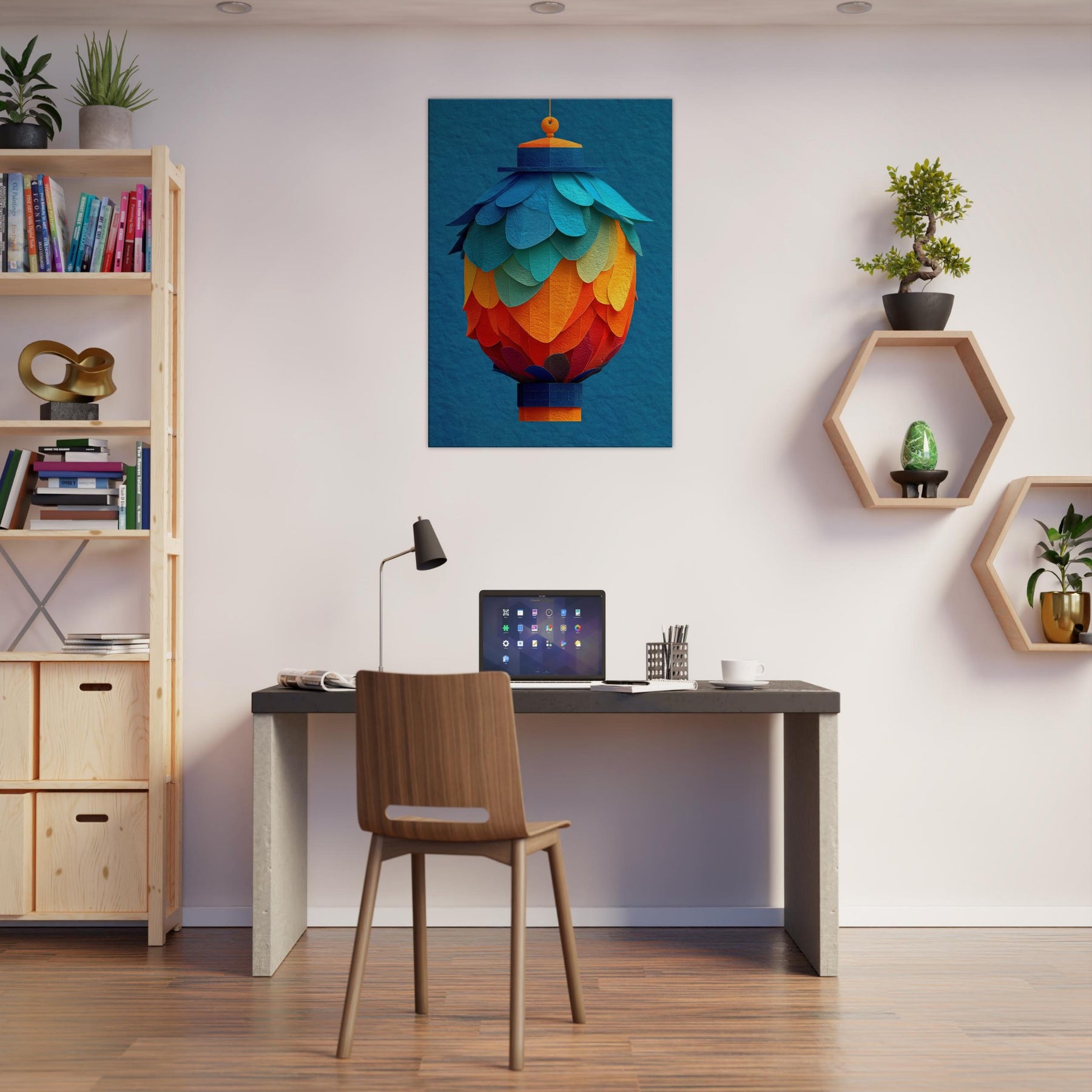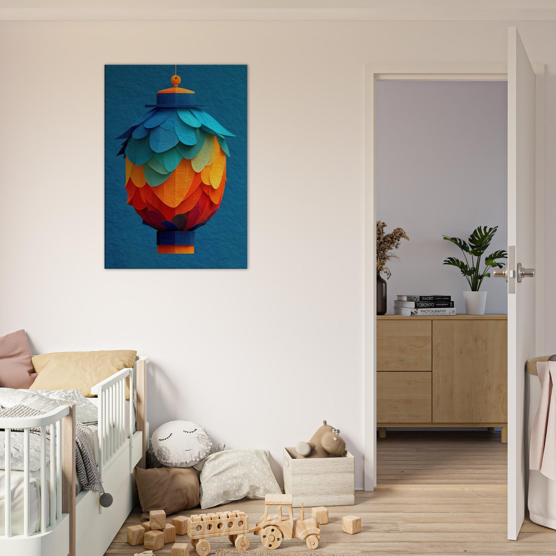 Like a suspended bouquet of flame and sky, this Paper Lantern invites the room to breathe. Its abstract layers bloom in a sunset of teal, azure, and coral, casting a soft, mingled glow across walls and furniture. The texture recalls handmade paper, rewarding close looking with delicate shadows and a warm, human scale presence. Hang it where daylight yields to evening, and let the lantern's quiet radiance soften edges, spark conversation, and transform a familiar space into a tranquil, artful sanctuary.