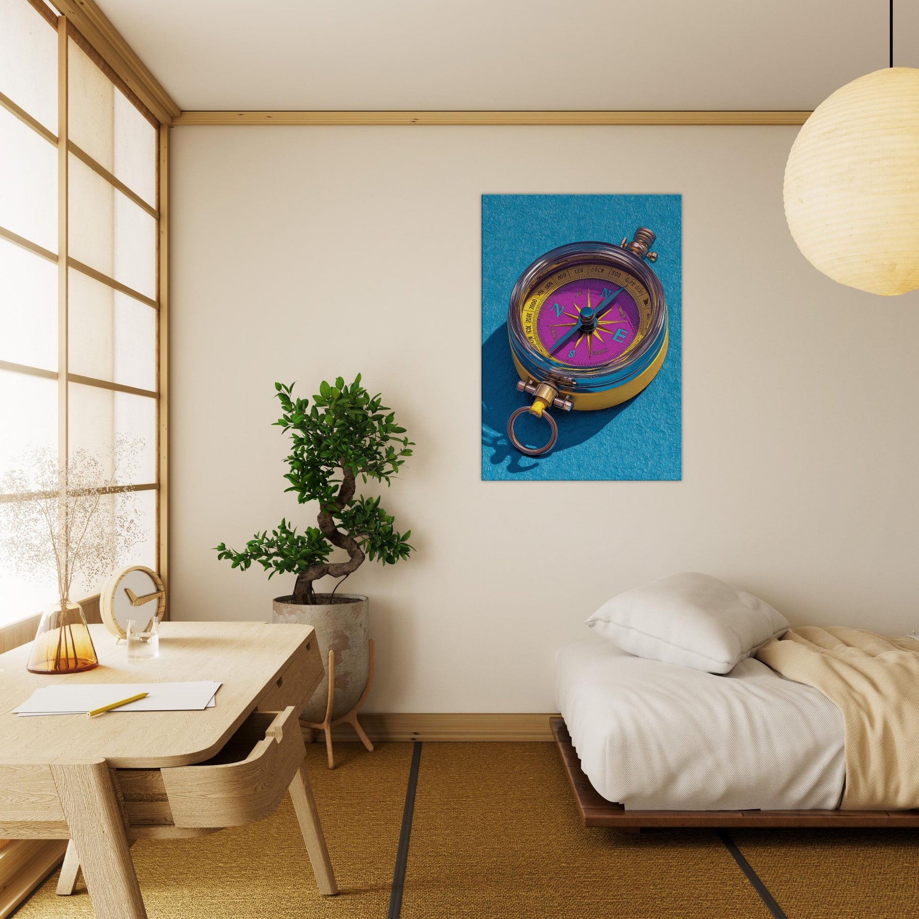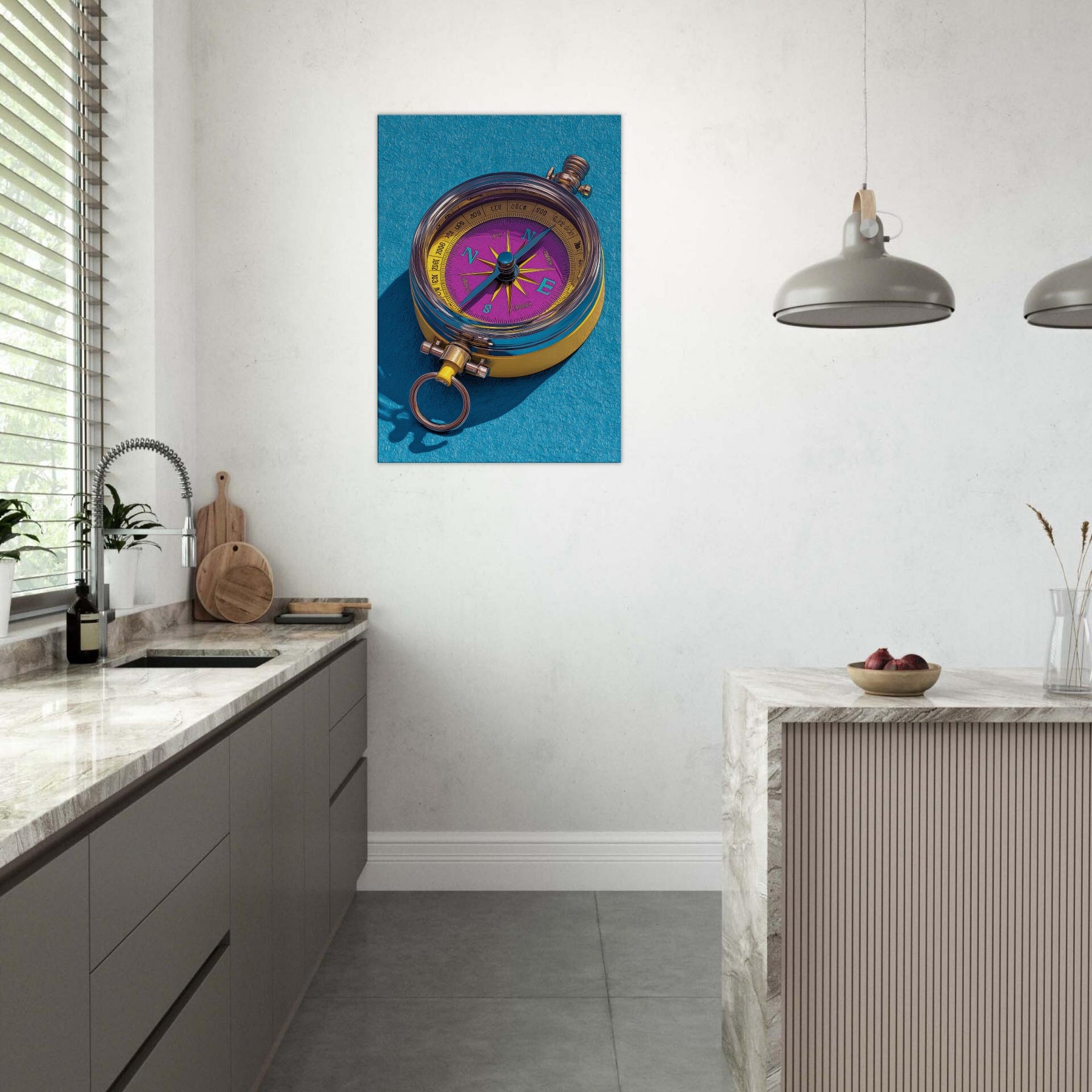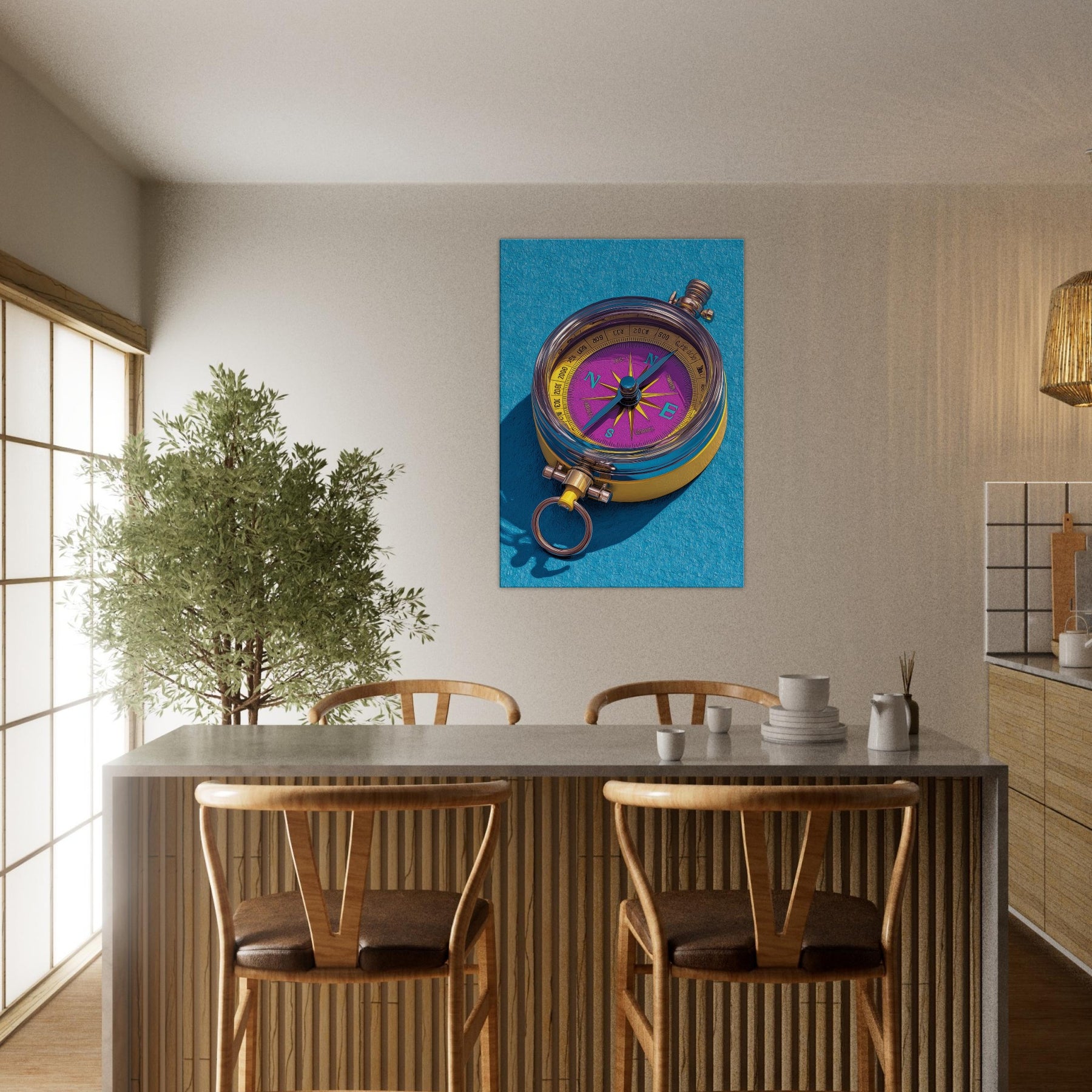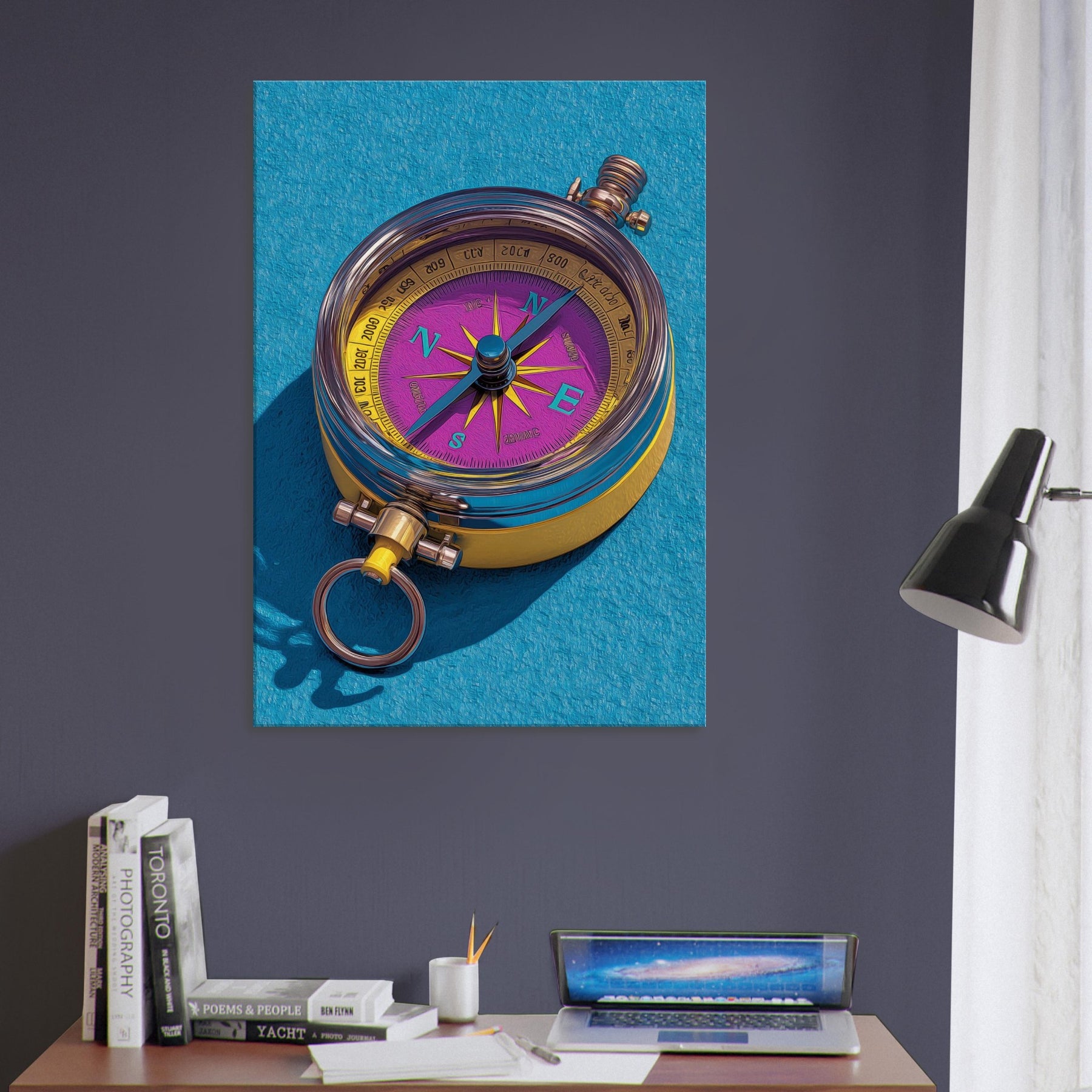 Let the Compass guide your room toward new horizons. This tactile, color rich piece fuses precision and whimsy, turning everyday walls into a ceremonial map of possibility. The luminous dial dances in violet and gold, while clean lines and delicate shadows suggest movement and intention. Hang it in a living room or study to spark conversation, anchor a palette, and invite curiosity. Its presence invites slow, mindful looking, as if tracing a personal route through memory, dream, and destination.