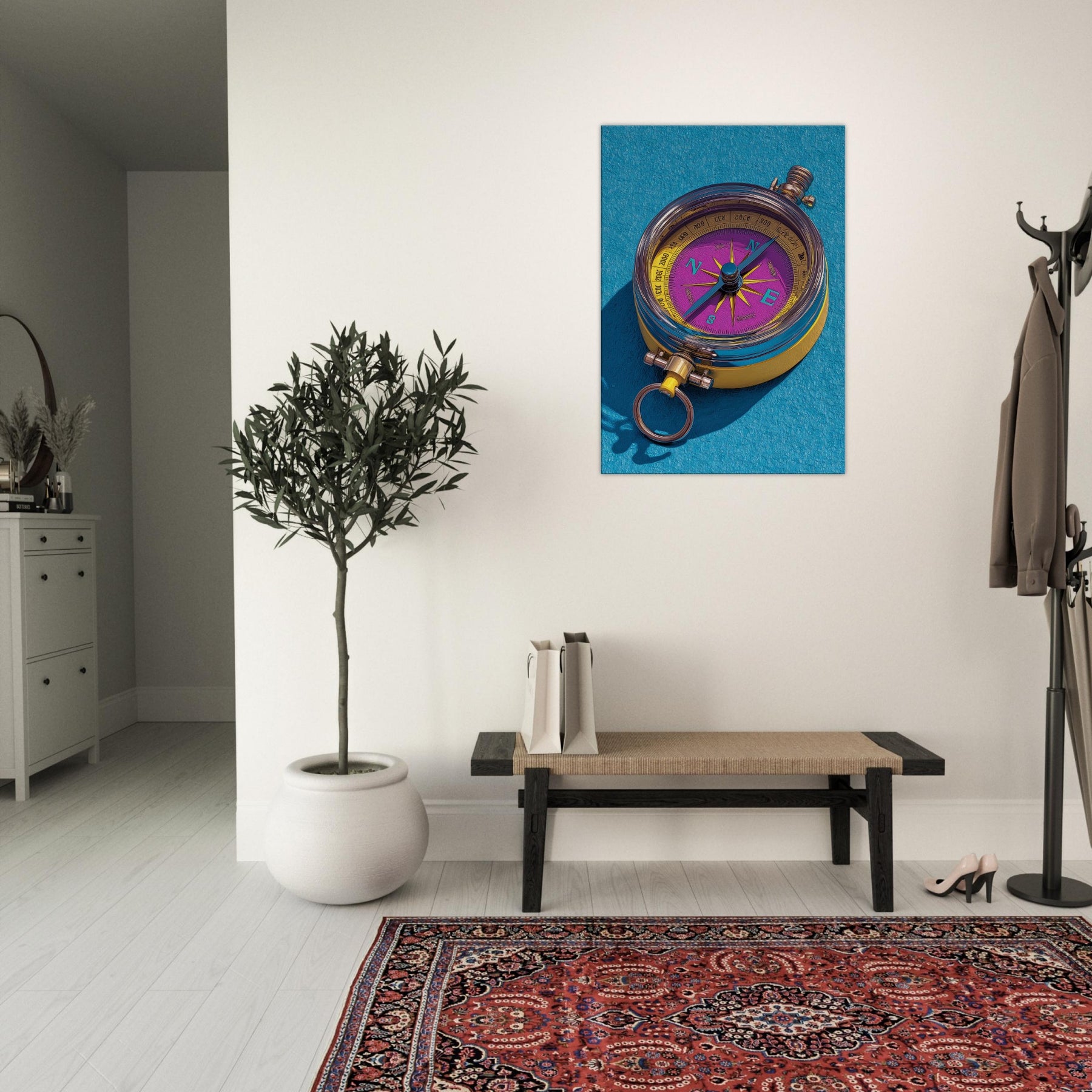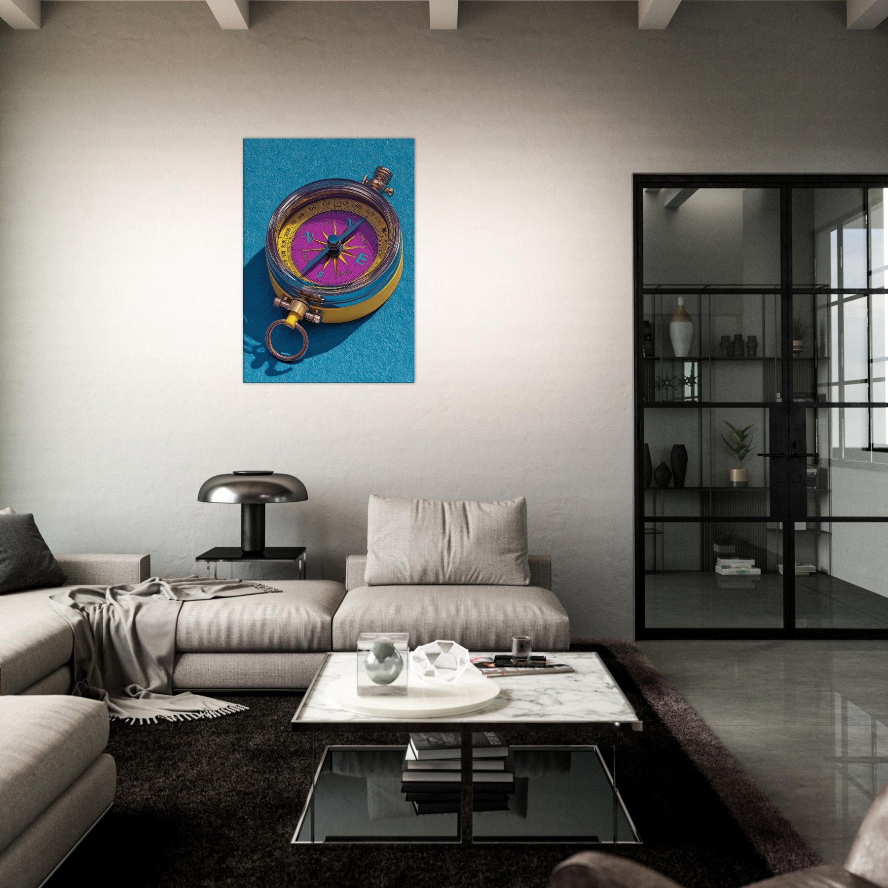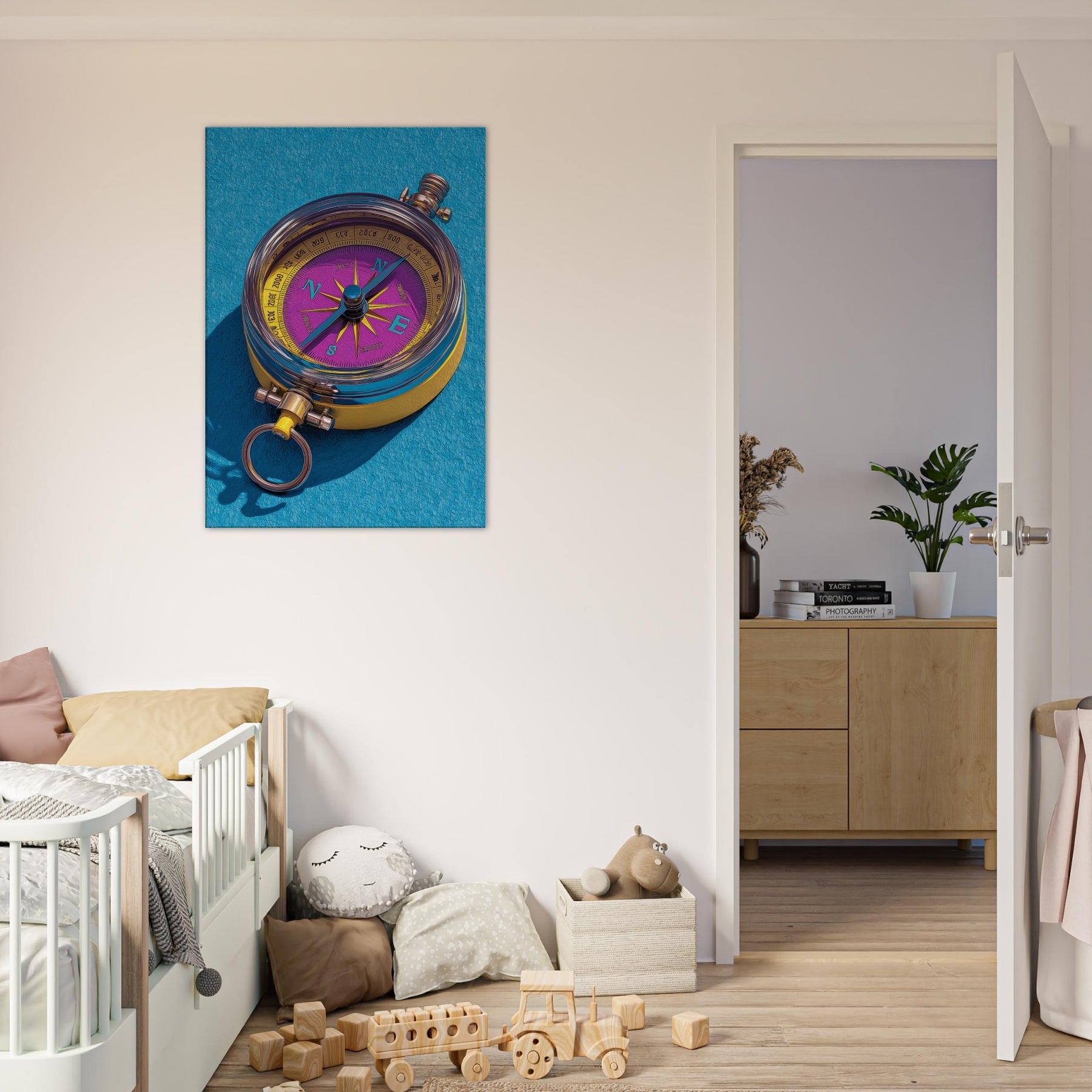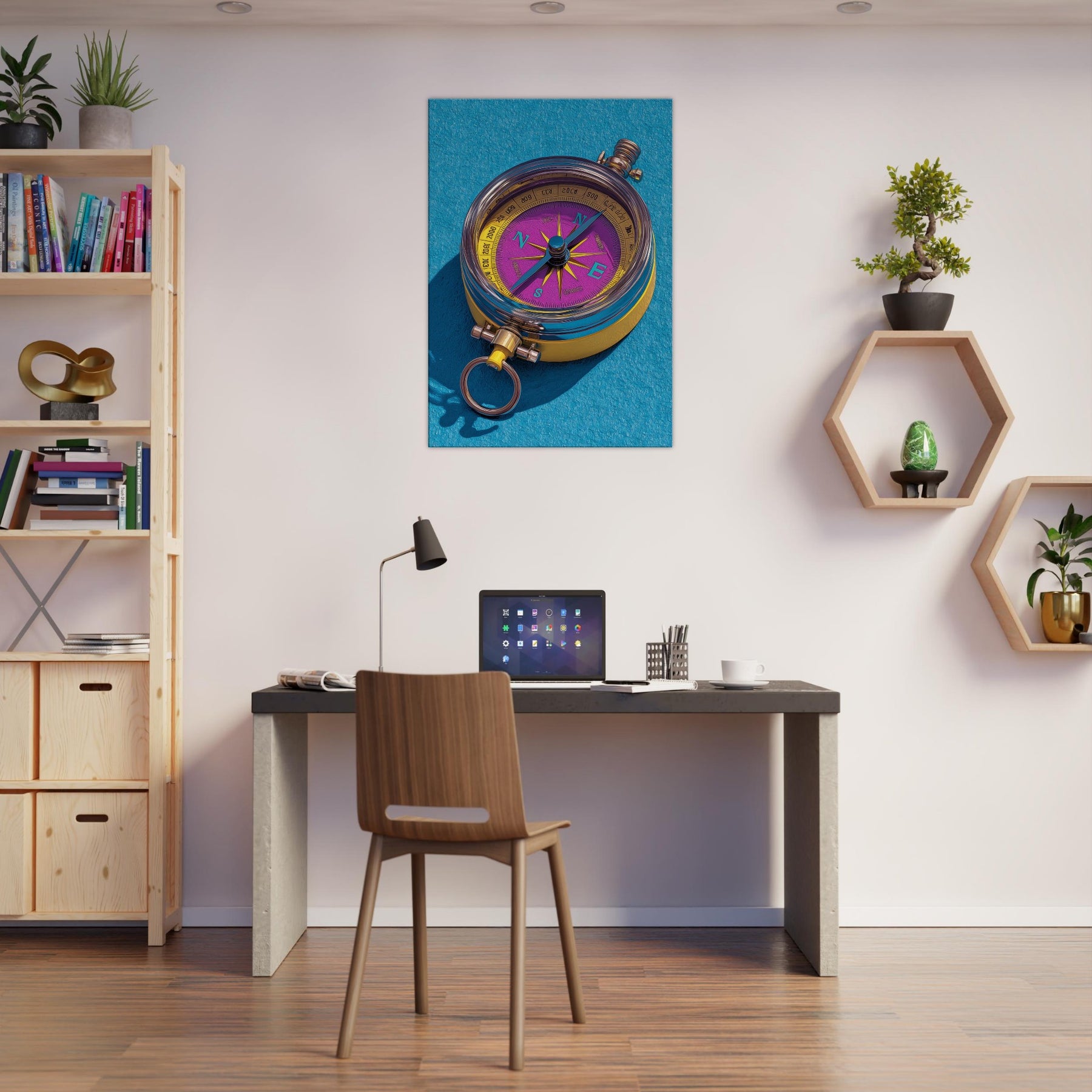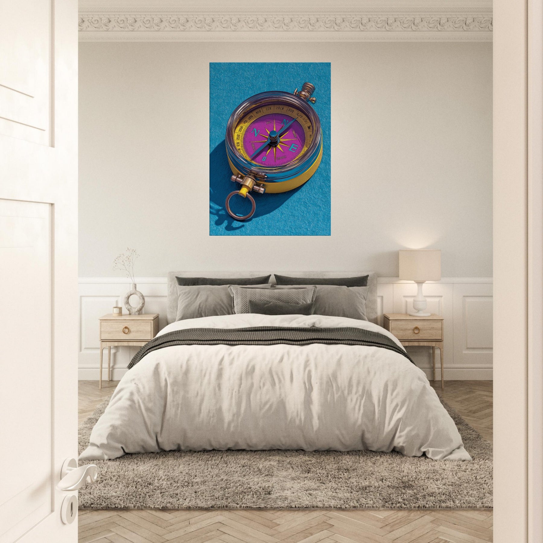 Let the Compass guide your room toward new horizons. This tactile, color rich piece fuses precision and whimsy, turning everyday walls into a ceremonial map of possibility. The luminous dial dances in violet and gold, while clean lines and delicate shadows suggest movement and intention. Hang it in a living room or study to spark conversation, anchor a palette, and invite curiosity. Its presence invites slow, mindful looking, as if tracing a personal route through memory, dream, and destination.