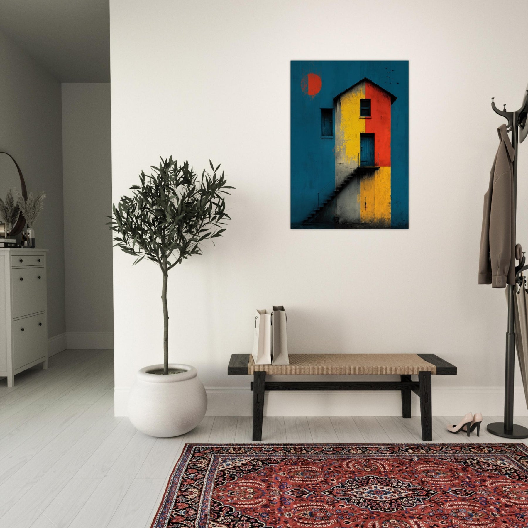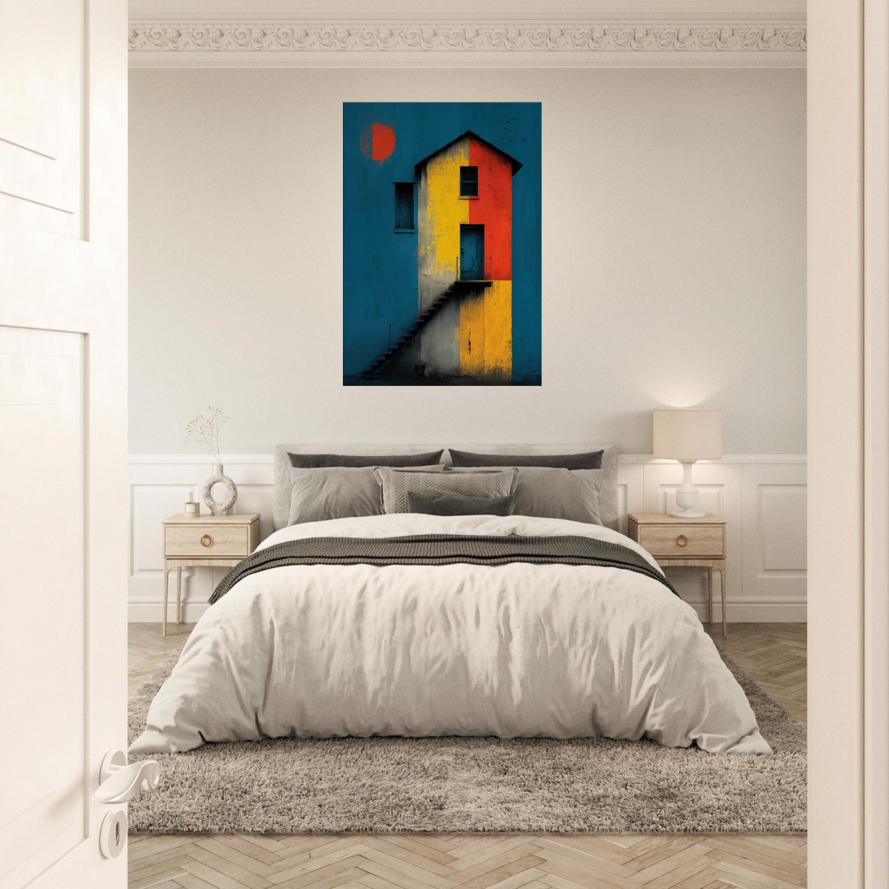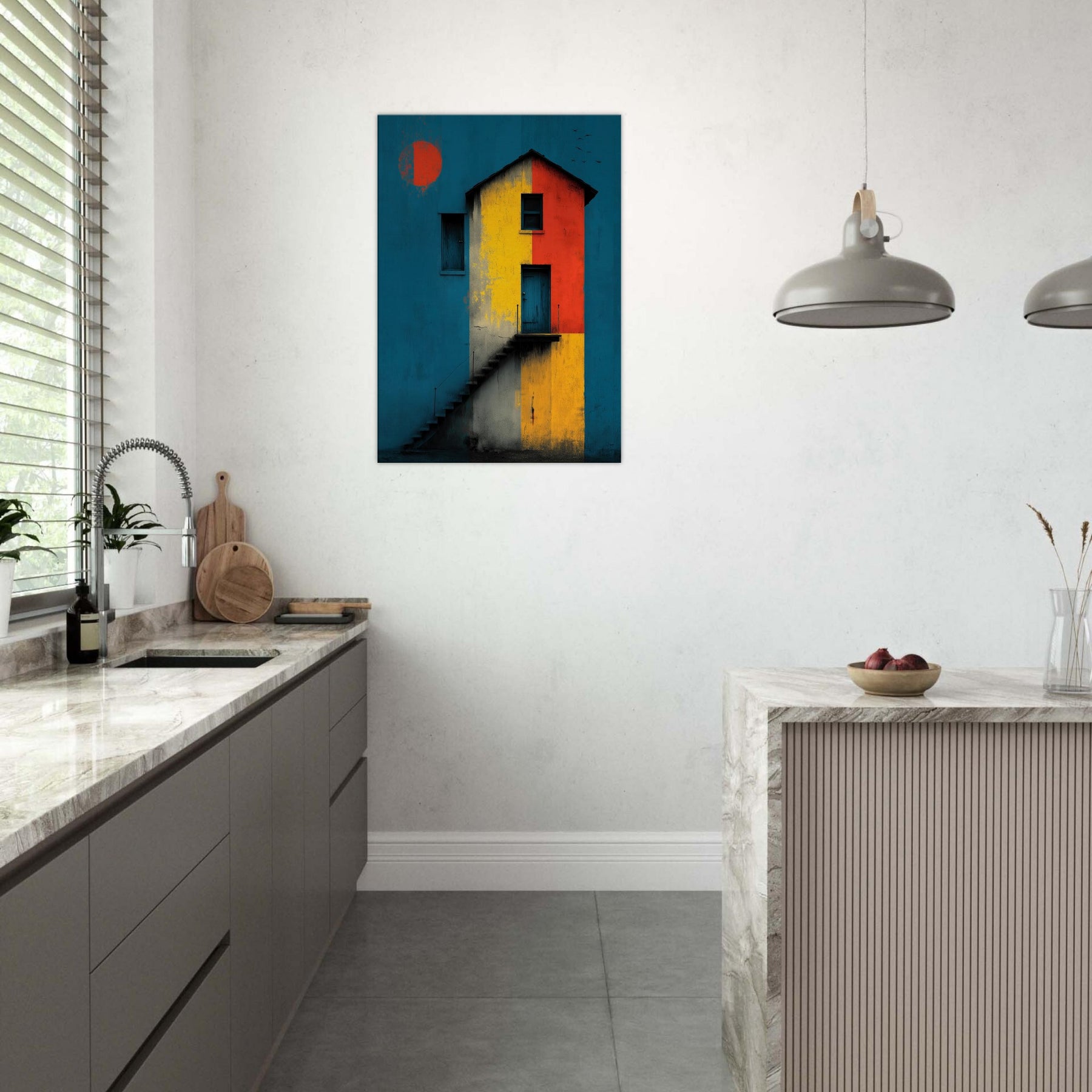 Step closer to a shoreline of color where a lighthouse emerges from a field of bold blocks. This abstract composition conjures salt breeze and twilight lamps, turning architecture into a meditative encounter. The lighthouse stands as a beacon across a canvas of teal, ochre, and crimson, inviting quiet contemplation while lending drama to a living room or study. Its layered textures echo weathered plaster and salt stung walls, so each glance reveals new light, new mood, and a daily voyage home.