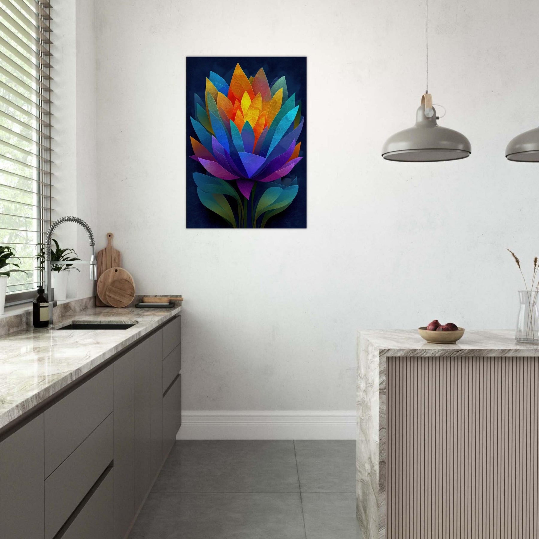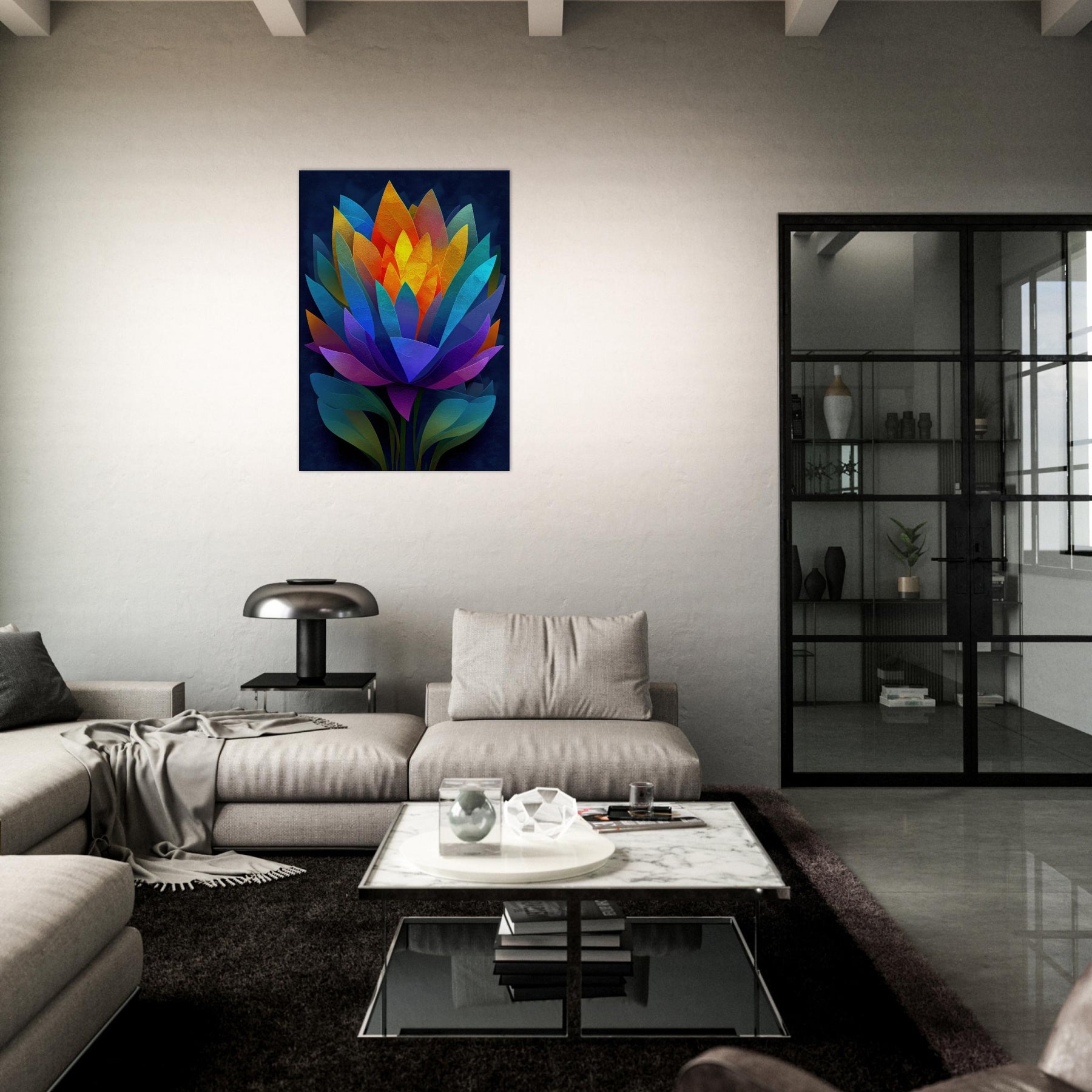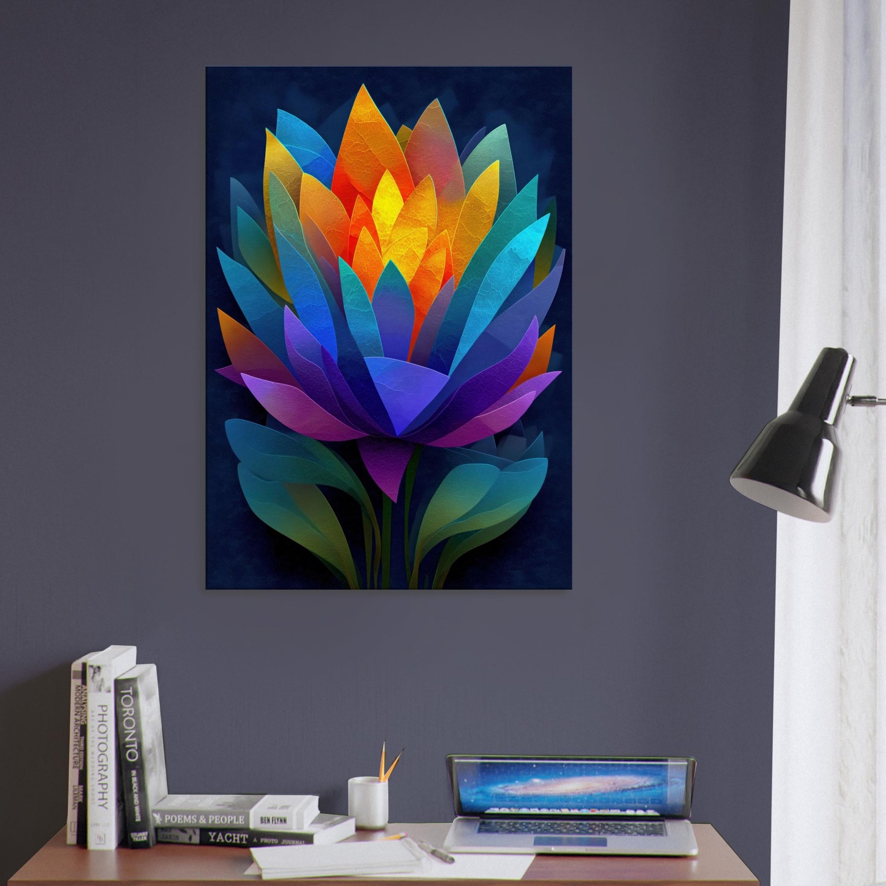 Lotus Throne rises in an electric bloom of color, inviting calm and curiosity into any room. This abstract composition hums with layered petals that shift from sunlit gold to oceanic blues, casting a warm, meditative glow. The atmosphere feels like a quiet sunrise in a private sanctuary perfect for a living room, study, or bedroom. Hang it where light can drift across the surface and watch the space awaken with a sense of tranquil power.