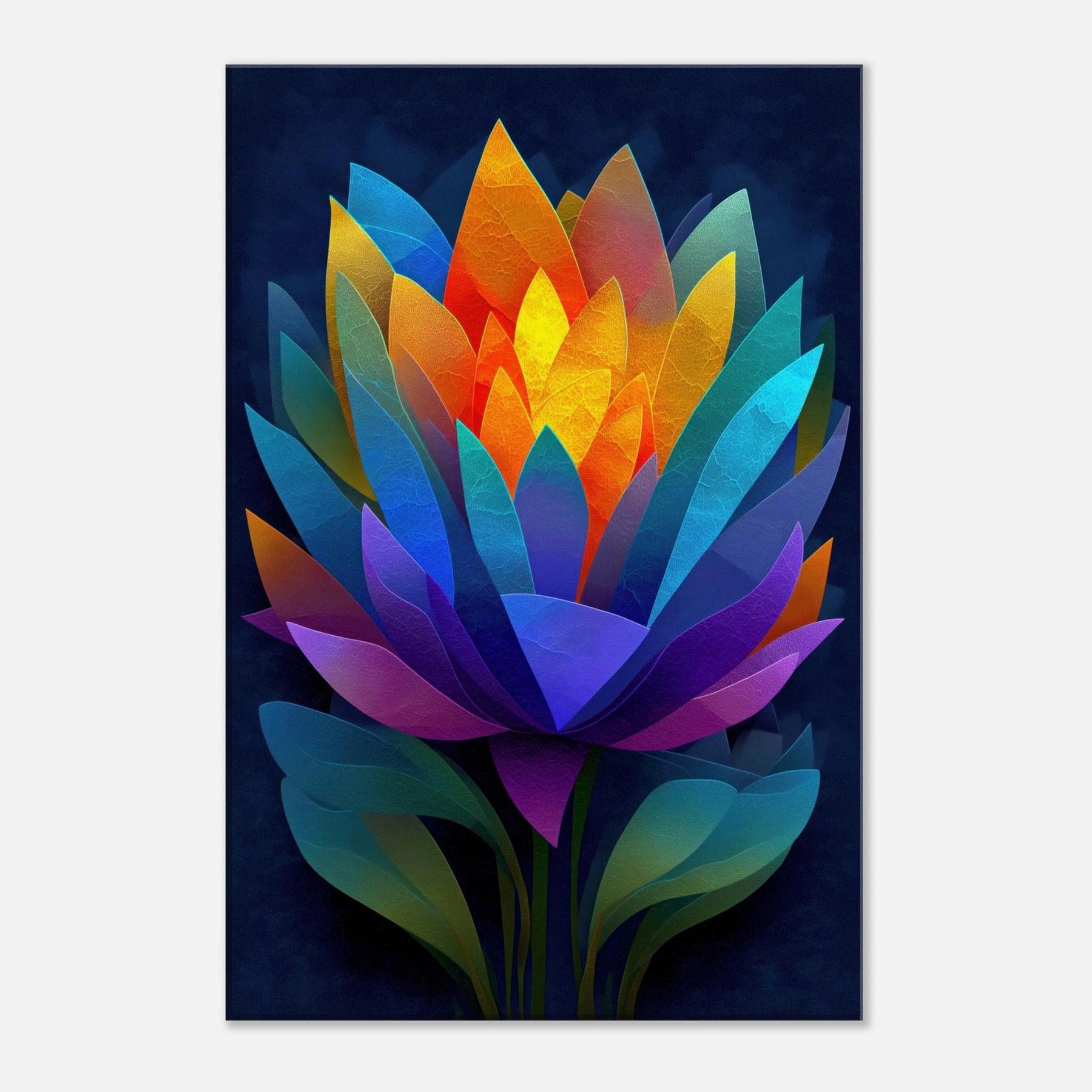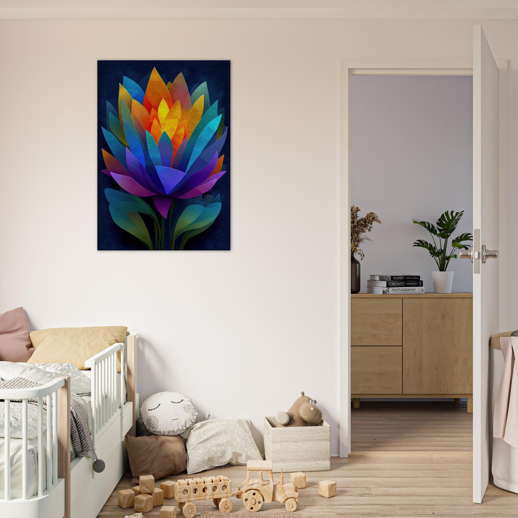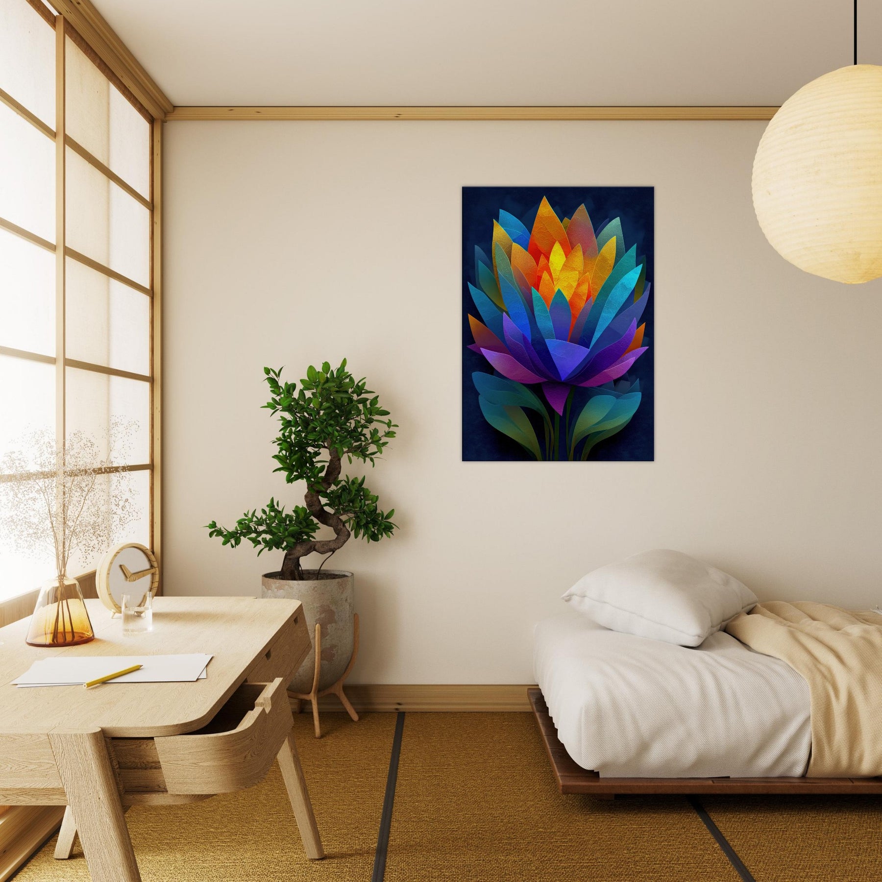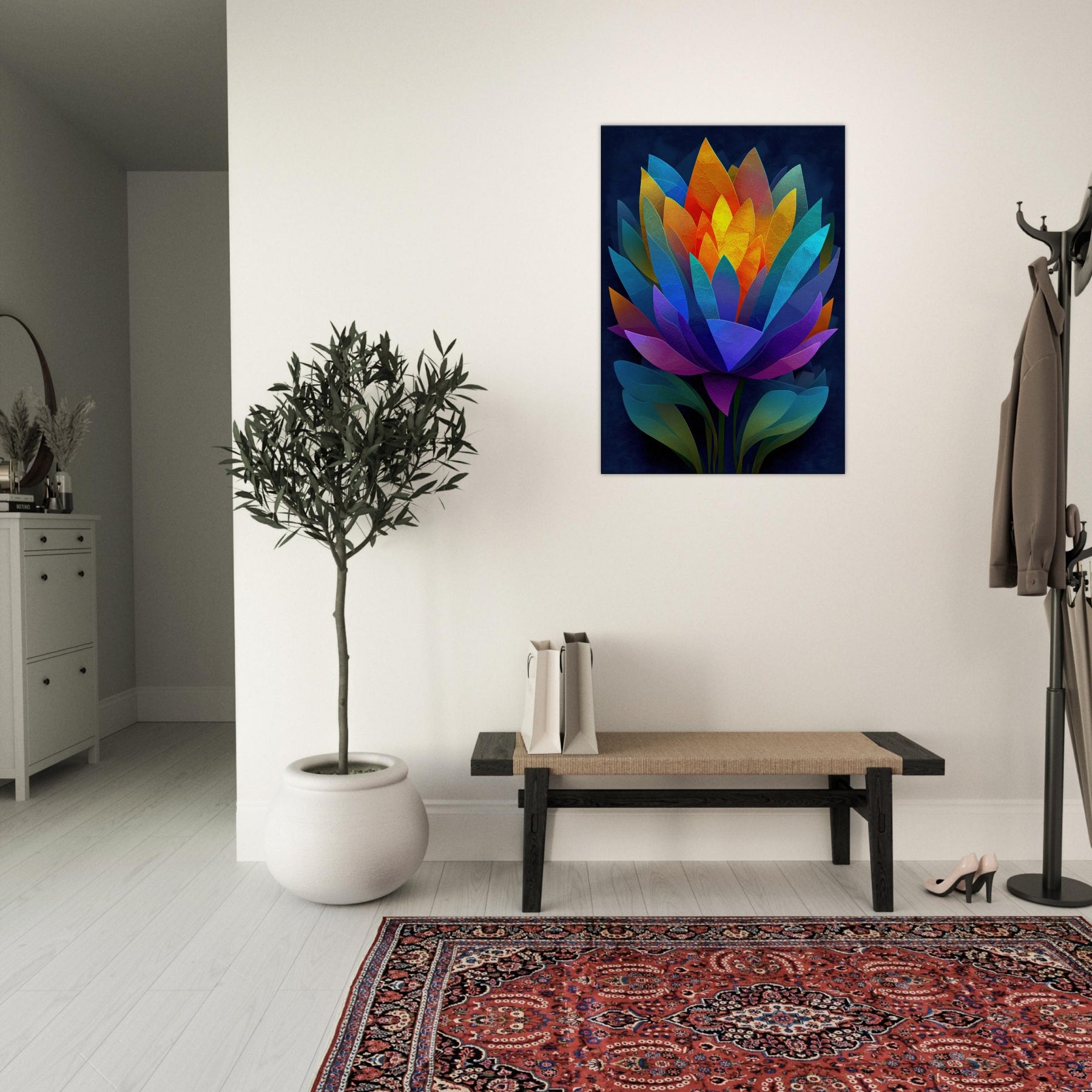 Lotus Throne rises in an electric bloom of color, inviting calm and curiosity into any room. This abstract composition hums with layered petals that shift from sunlit gold to oceanic blues, casting a warm, meditative glow. The atmosphere feels like a quiet sunrise in a private sanctuary perfect for a living room, study, or bedroom. Hang it where light can drift across the surface and watch the space awaken with a sense of tranquil power.