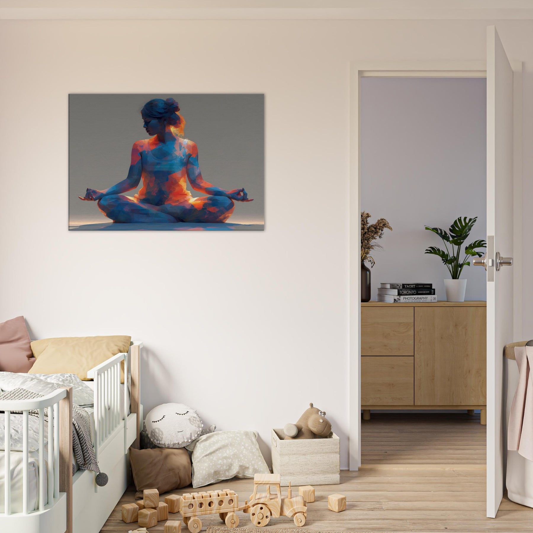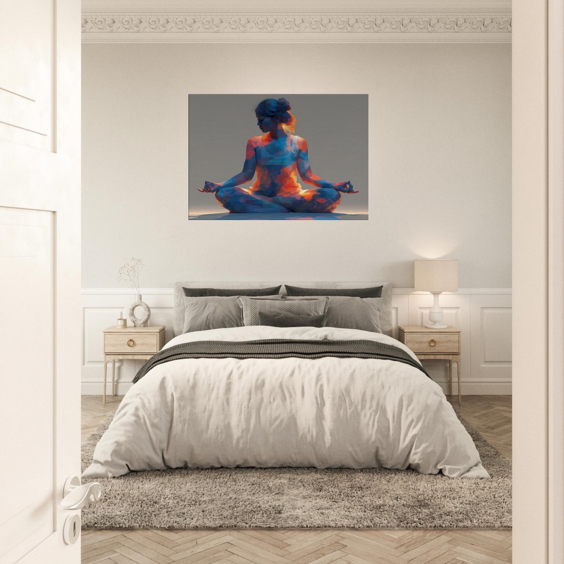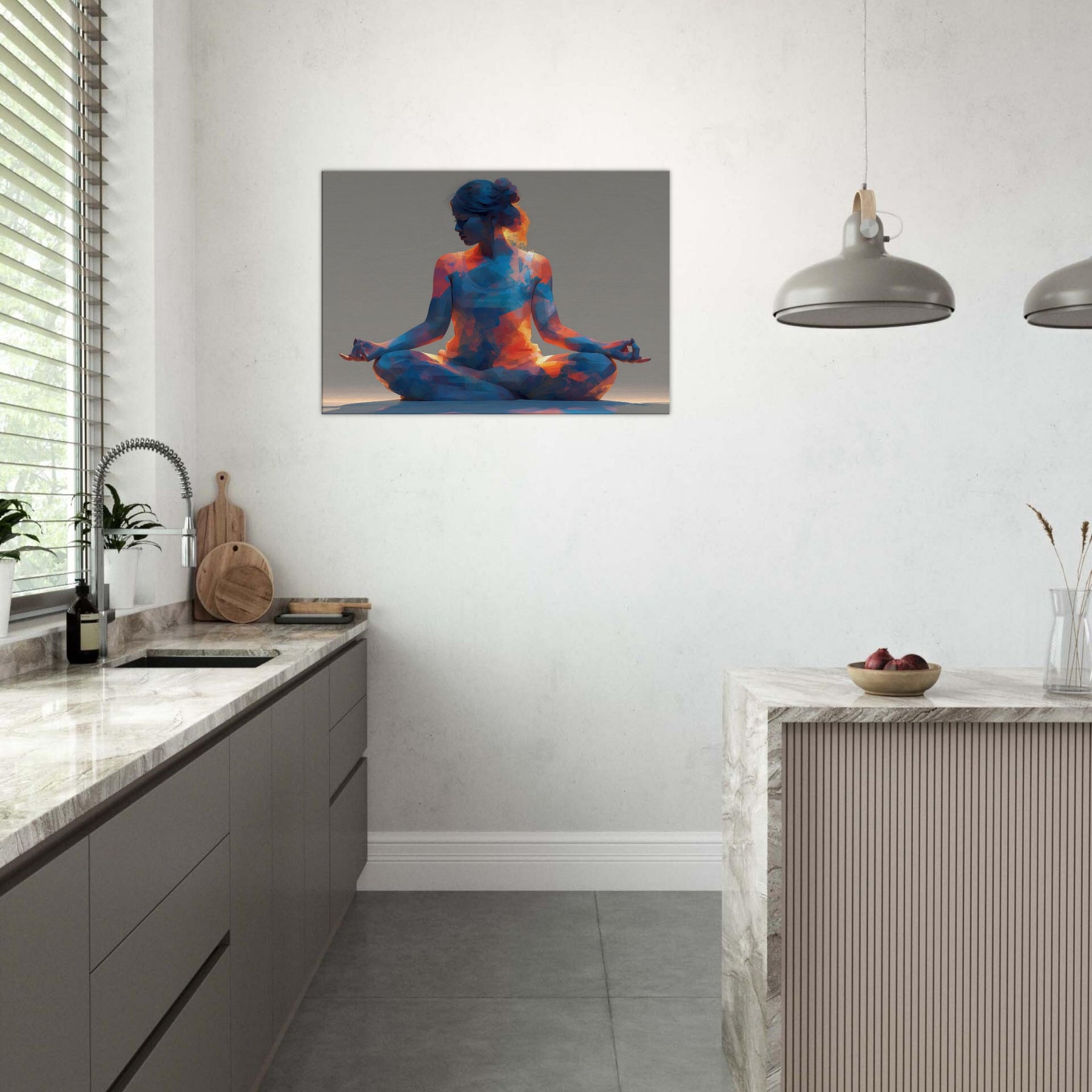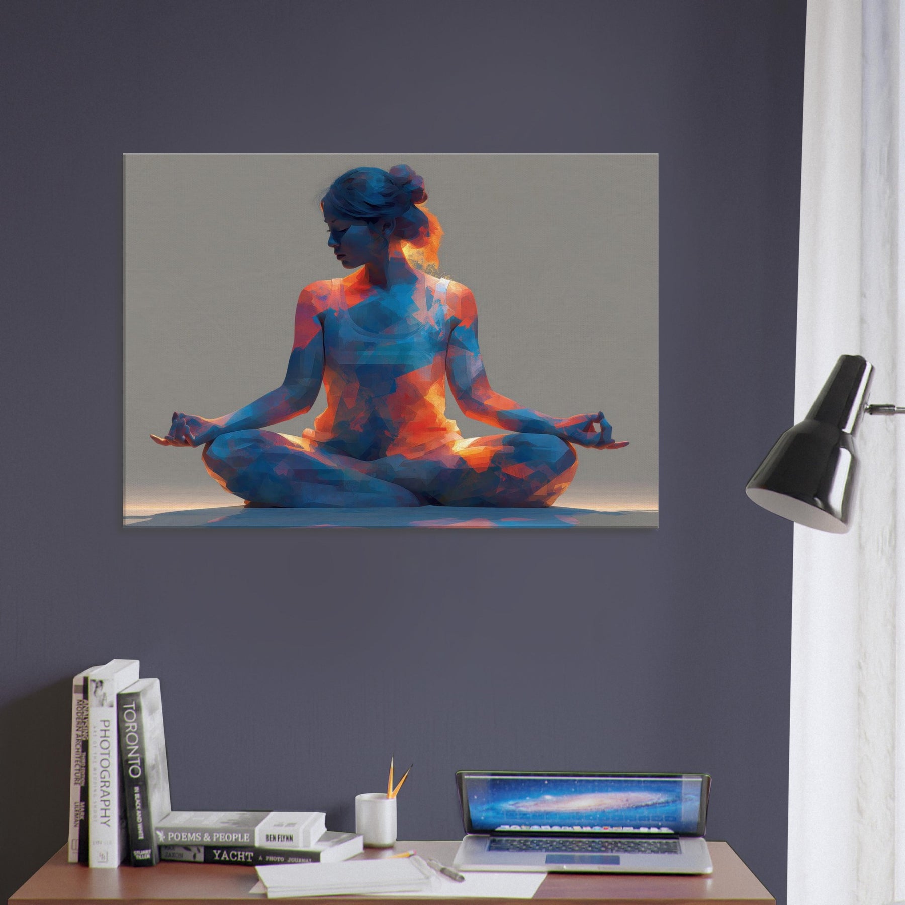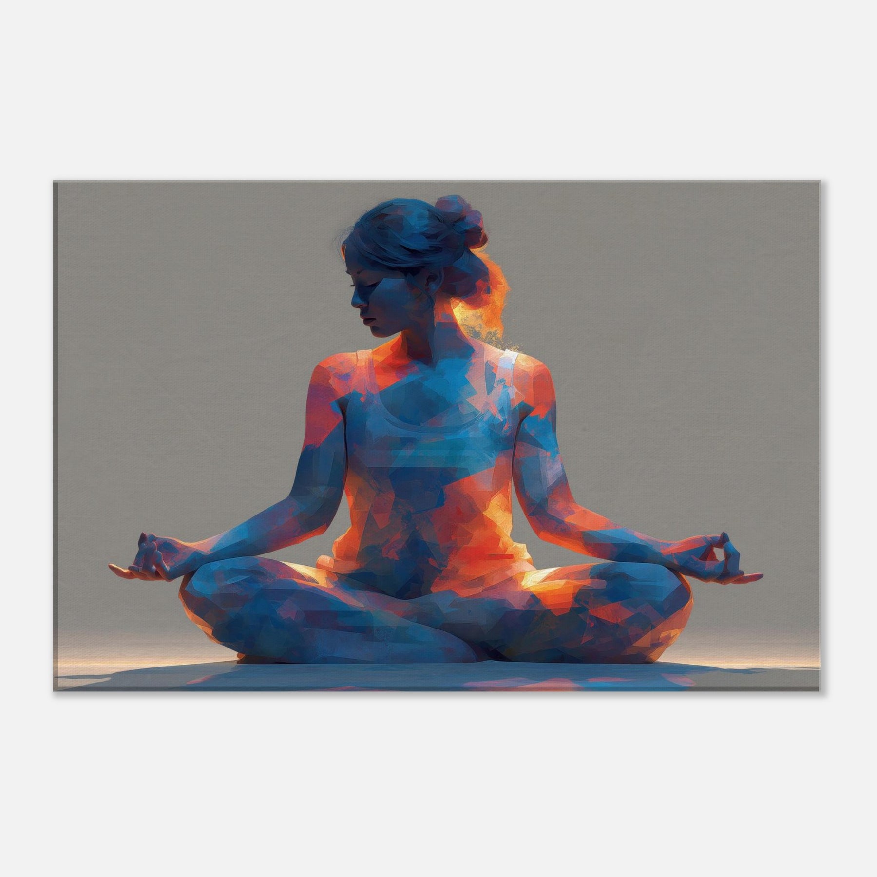 A luminous study in stillness, the Yoga Lotus Pose is rendered as a faceted, pulsing silhouette that invites breath and balance. Warm oranges spill into cool blues, creating a meditative glow that could transform a quiet corner into a sanctuary. The abstract forms echo the rhythm of a slow inhale and exhale, making the space feel opened, calm, and alive. Hang this piece where daily routines meet intention, and let serenity float through your living space.
