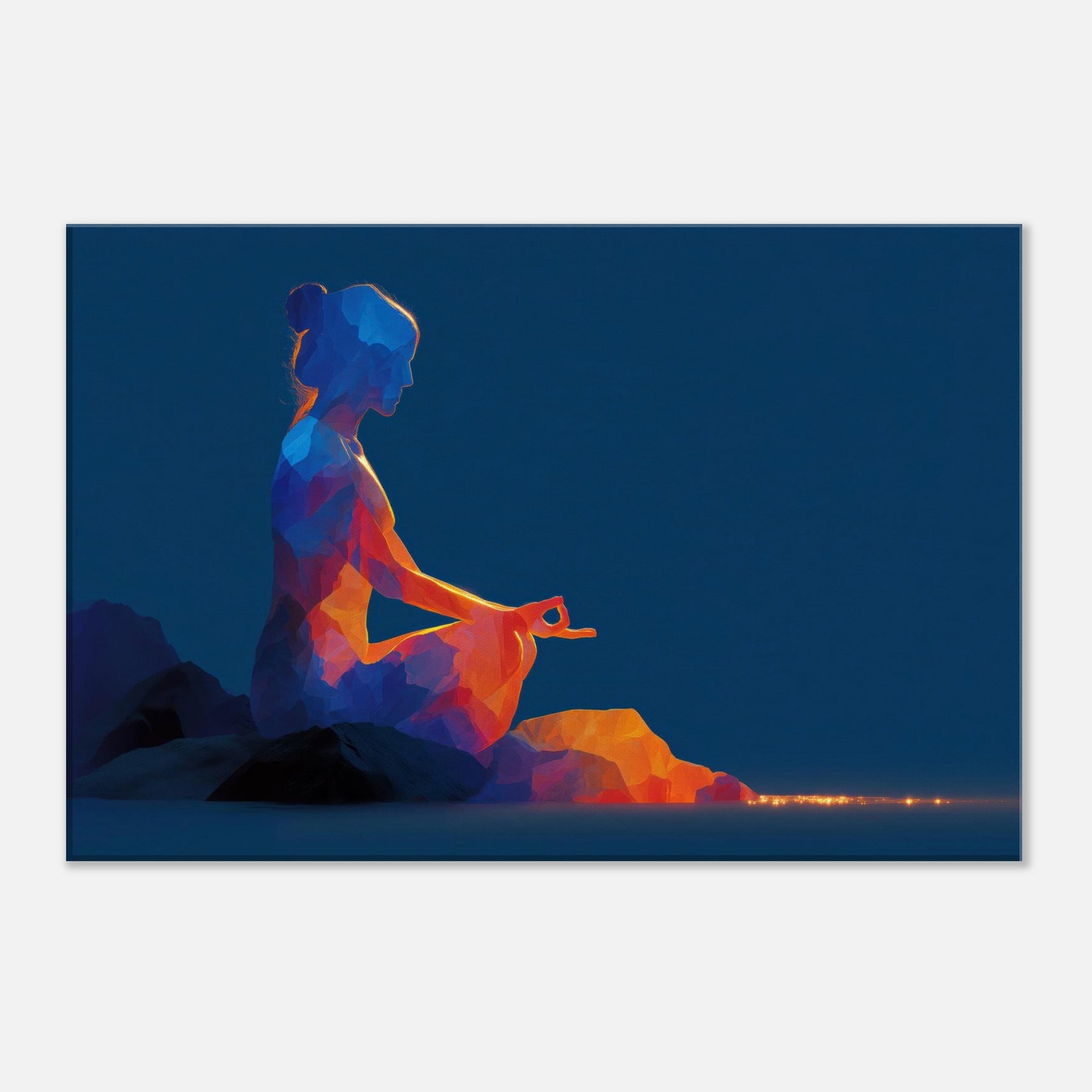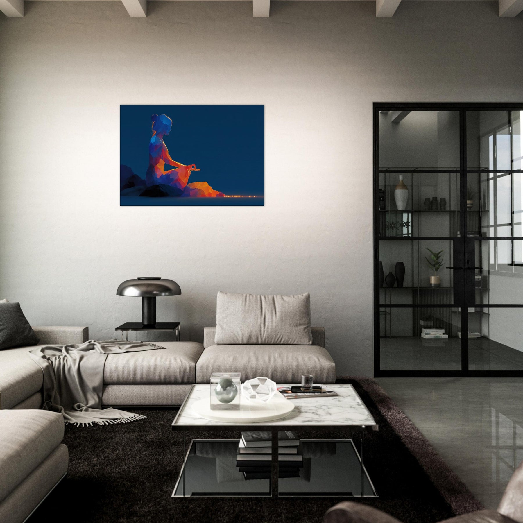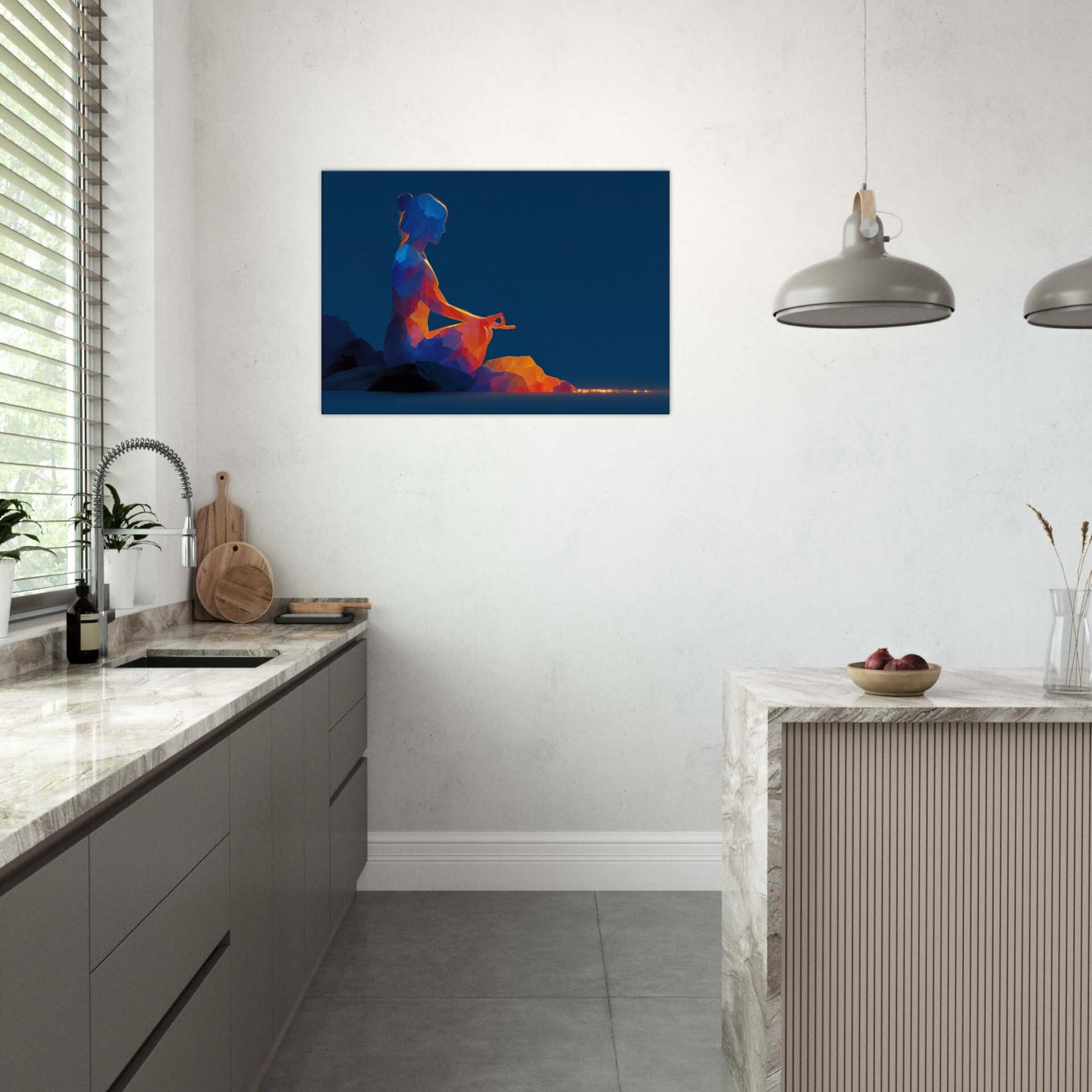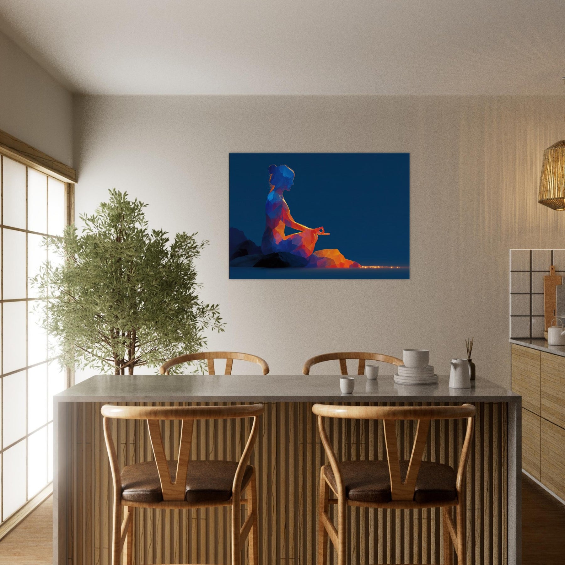 An abstract meditation rendered in prism like facets, this sculpture of a seated Yoga Lotus Pose exudes calm as evening tide. The piece rests on imagined rocks, bathed in warm oranges and cool blues that mimic sunrise and shadow. It invites slow breathing, a soft gaze inward, and a tranquil heartbeat into any living space. Its faces and bodies motif whispers that strength and serenity coexist, turning a room into a sanctuary of focus, balance, and quiet optimism.