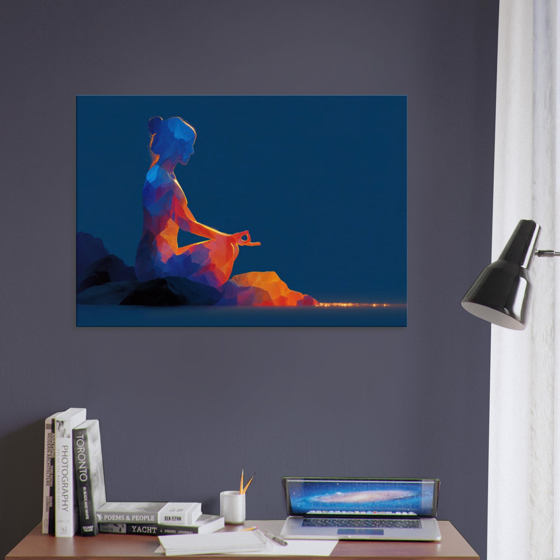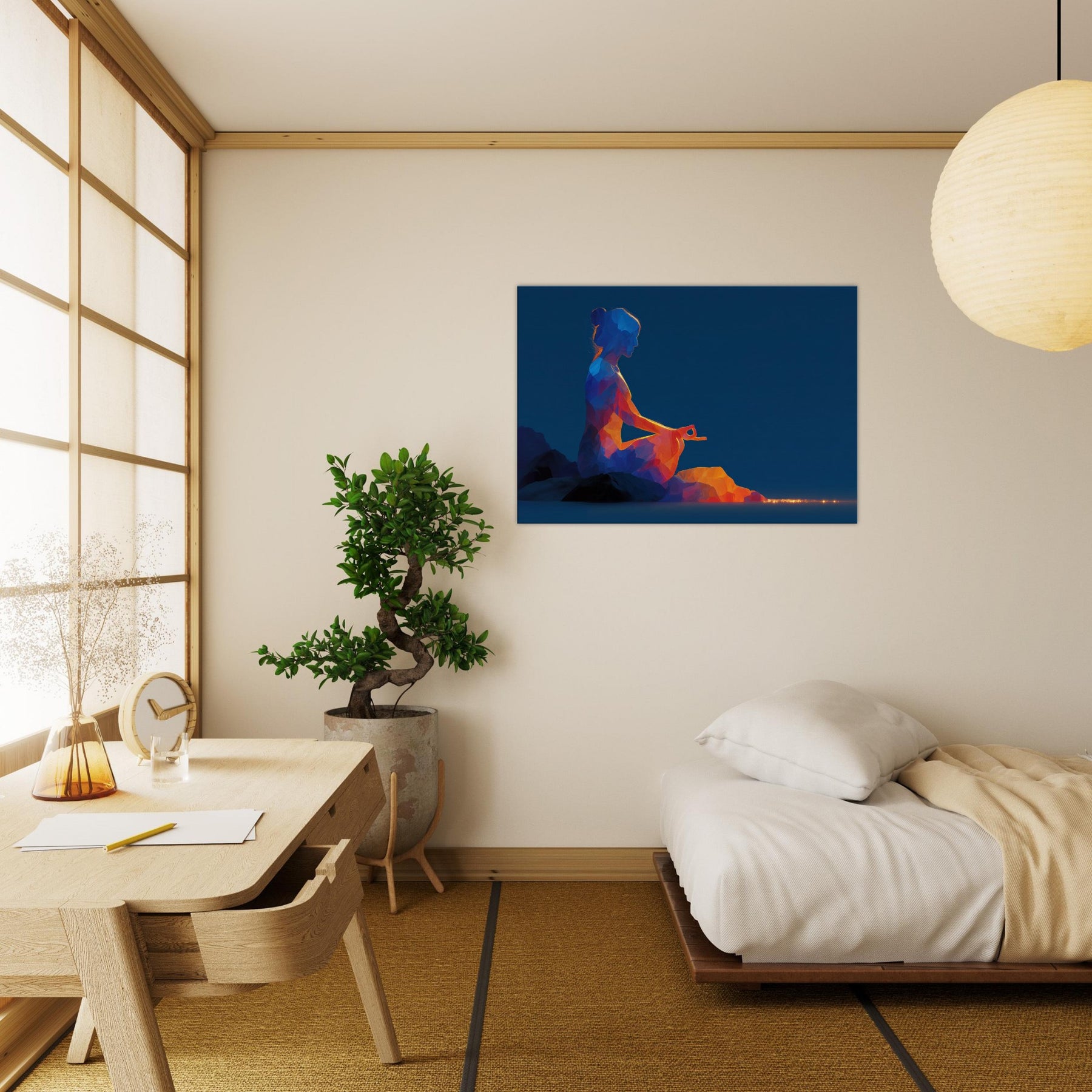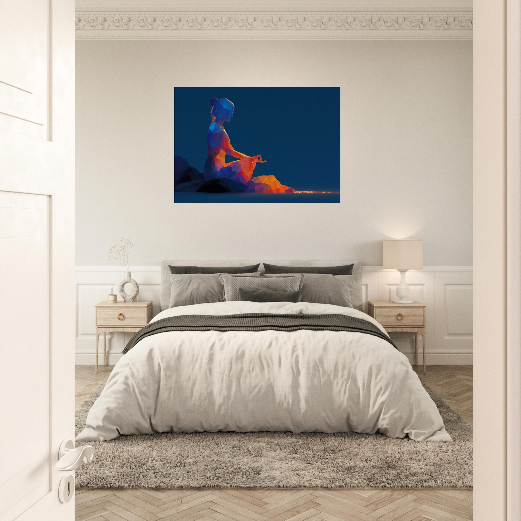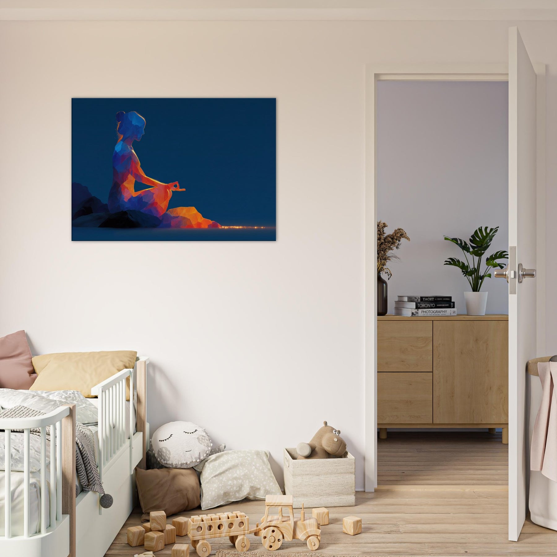 An abstract meditation rendered in prism like facets, this sculpture of a seated Yoga Lotus Pose exudes calm as evening tide. The piece rests on imagined rocks, bathed in warm oranges and cool blues that mimic sunrise and shadow. It invites slow breathing, a soft gaze inward, and a tranquil heartbeat into any living space. Its faces and bodies motif whispers that strength and serenity coexist, turning a room into a sanctuary of focus, balance, and quiet optimism.