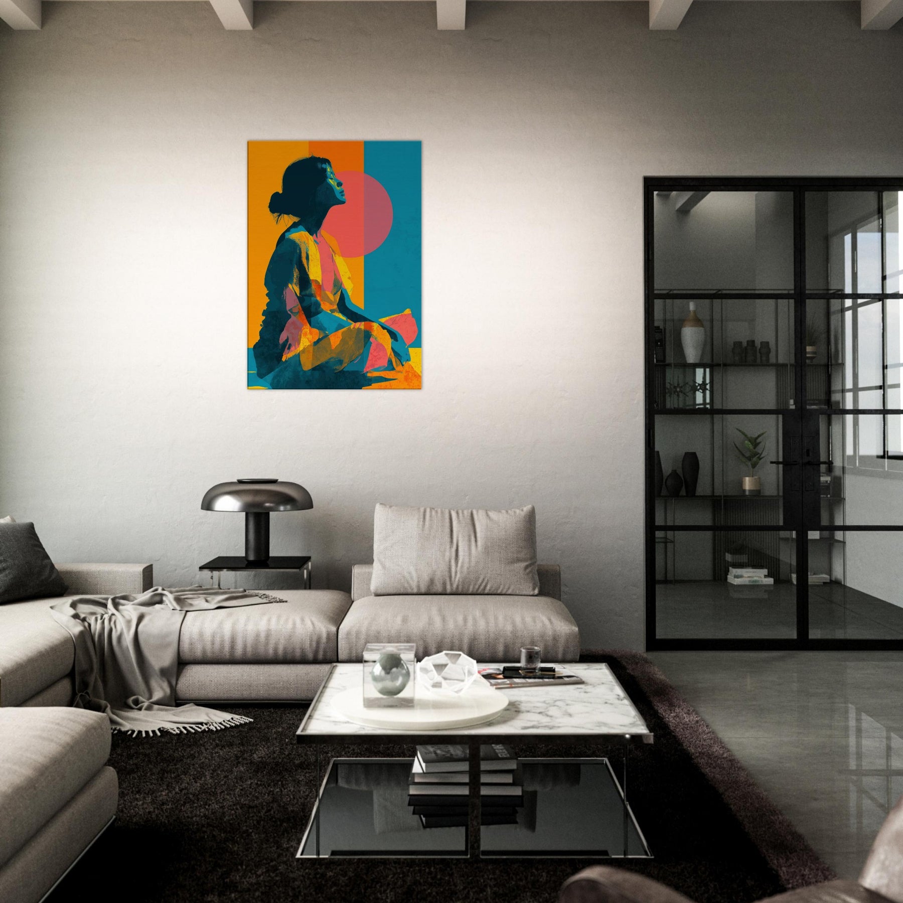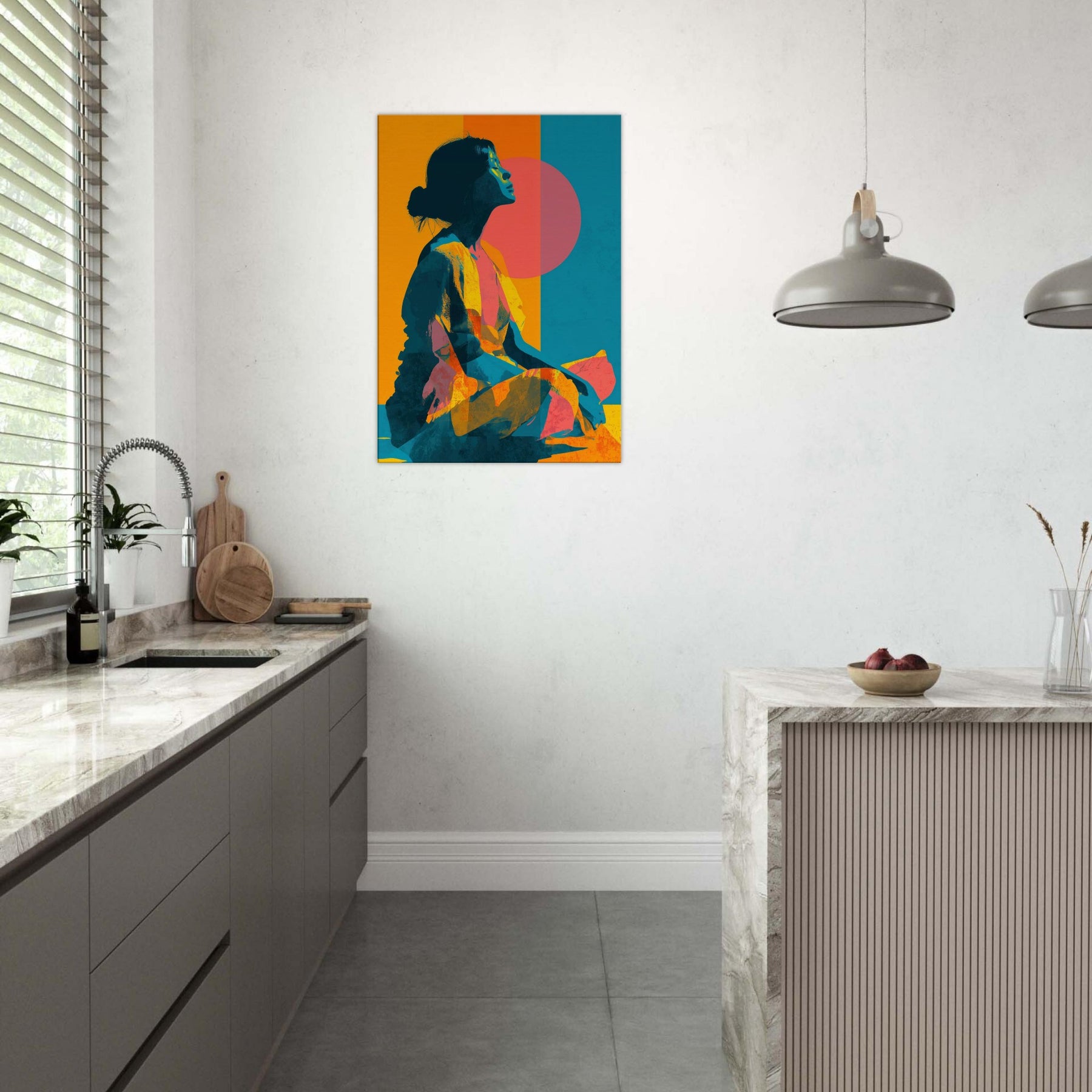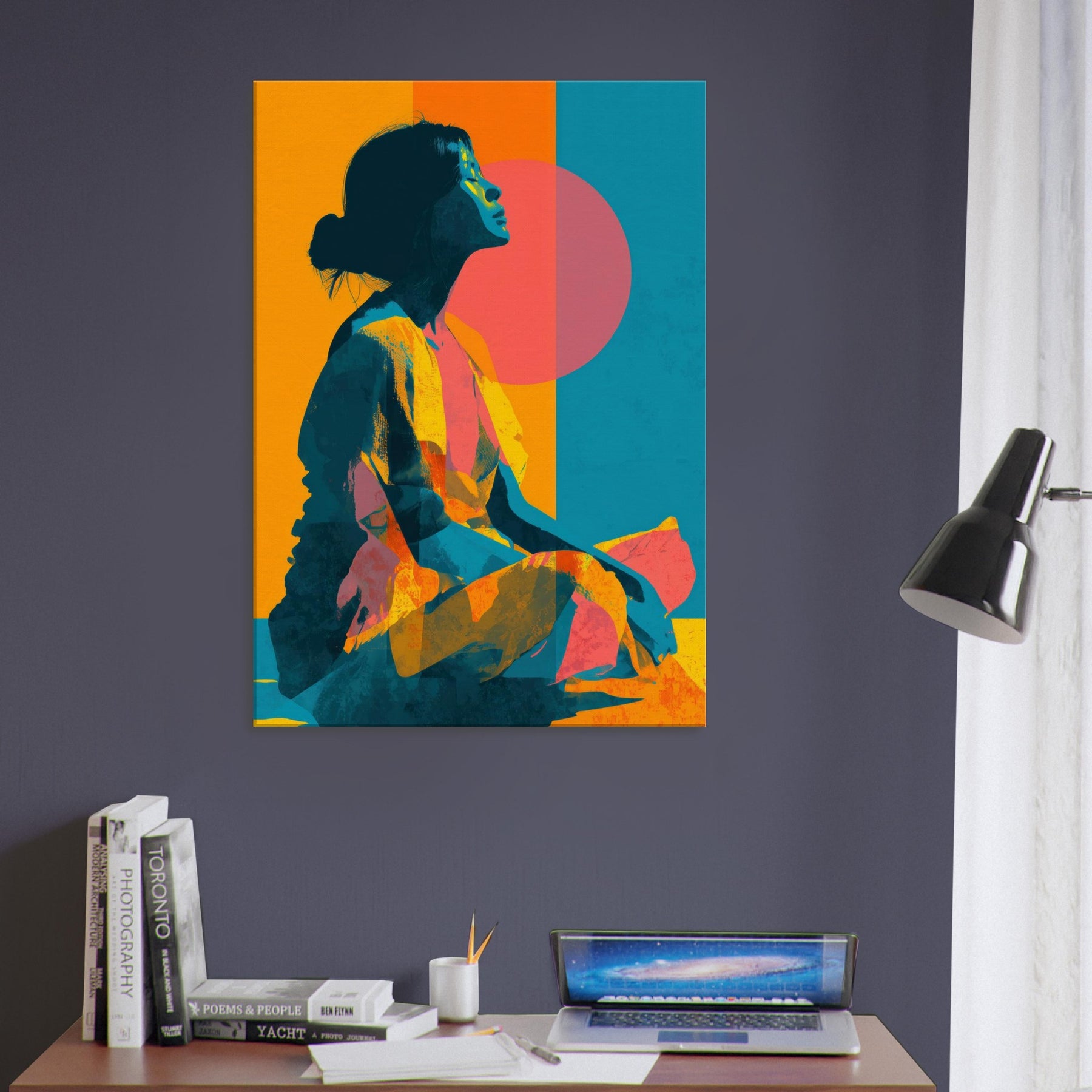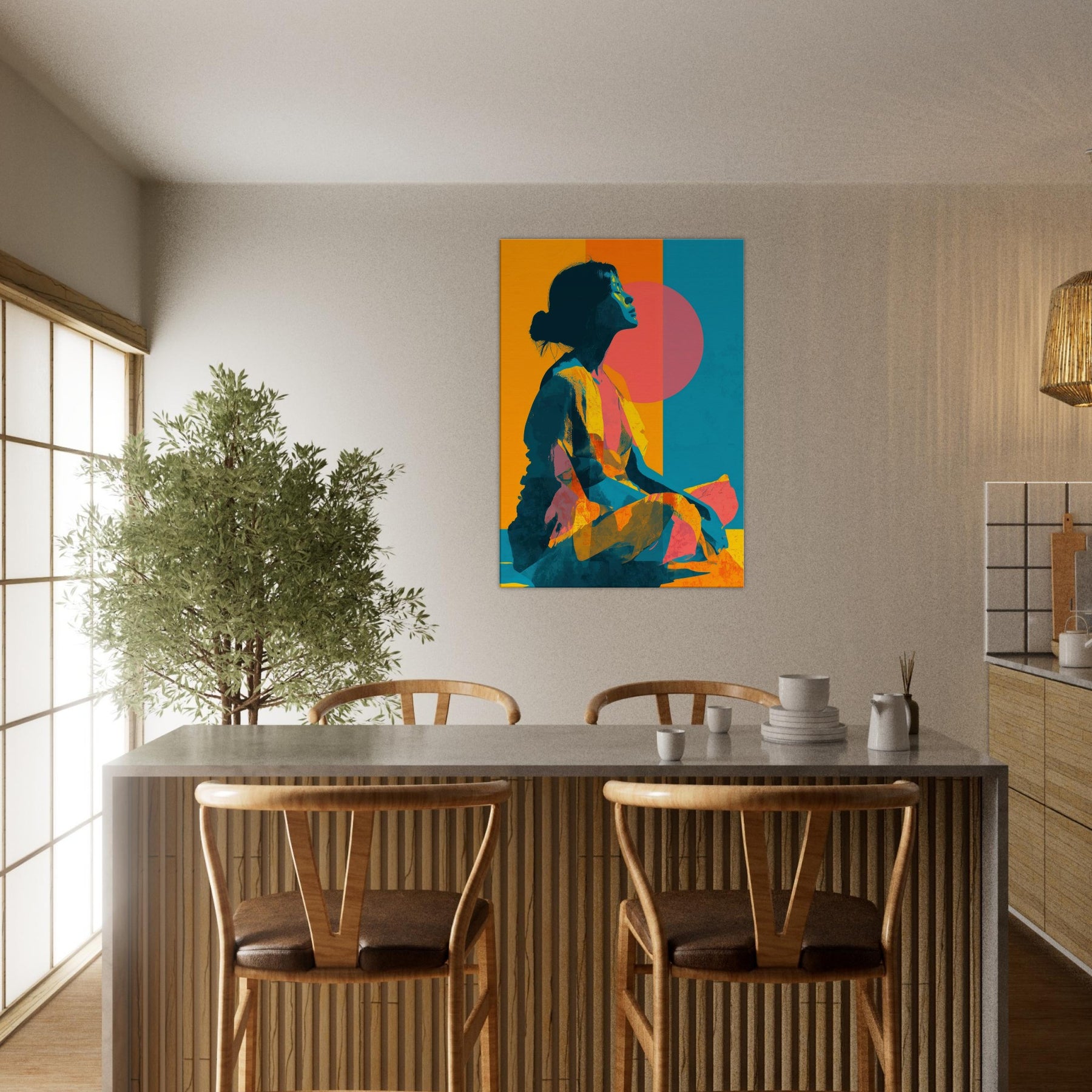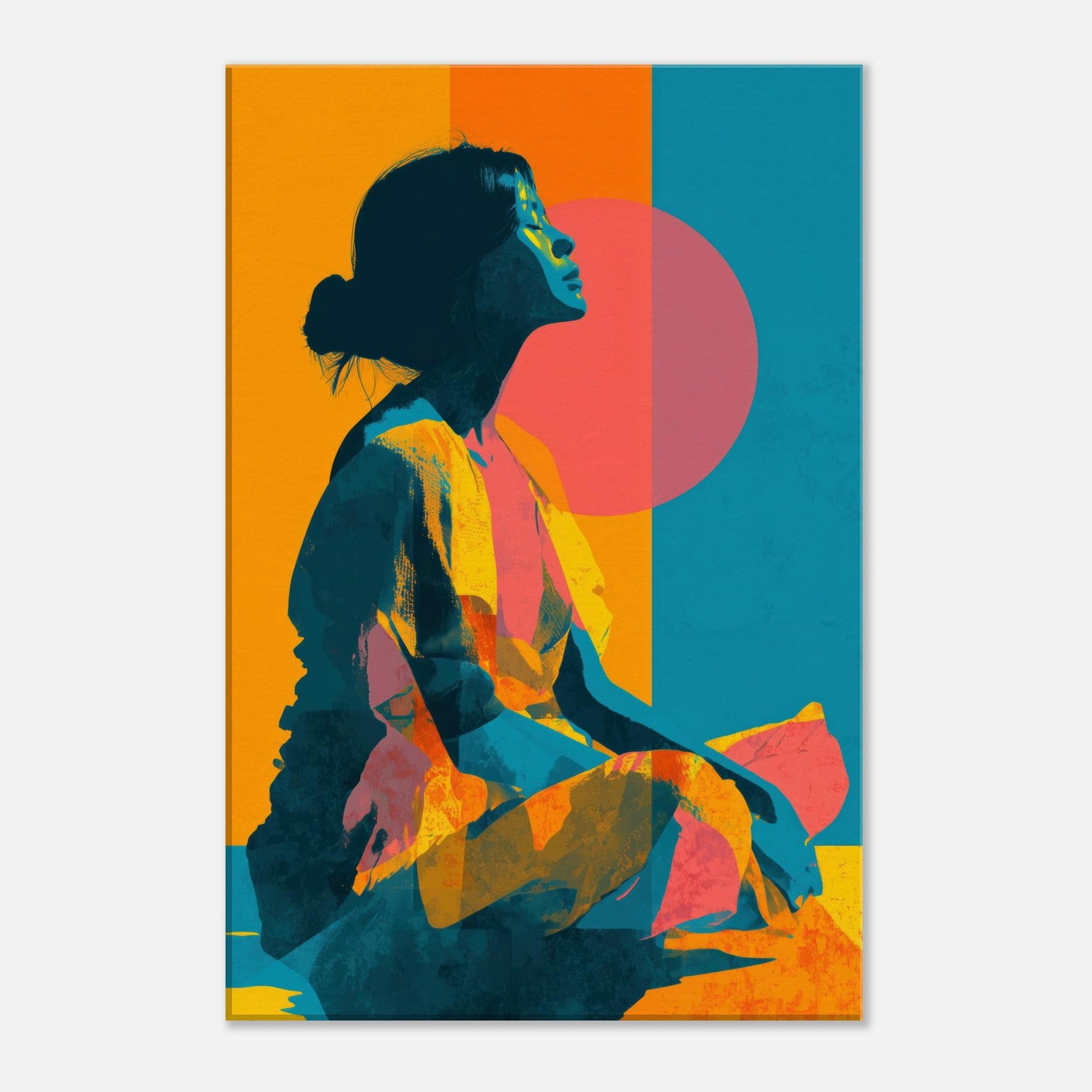 This piece centers the Yoga Lotus Pose in a vibrant symphony of color, where form dissolves into mood and light. A solitary figure is captured in quiet poise, rendered in bold blues, oranges, and pinks that pulse with life. Abstract shapes cradle the silhouette, creating a serene aura that feels both meditative and contemporary. Hang it in a living room or studio to invite balance, warmth, and focus a visual invitation to slow the pace and breathe.