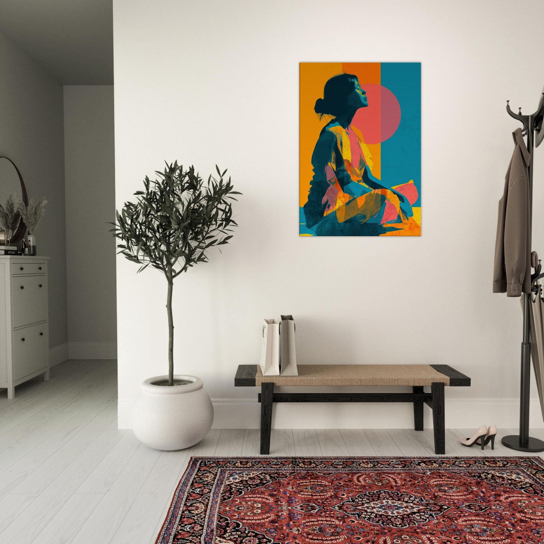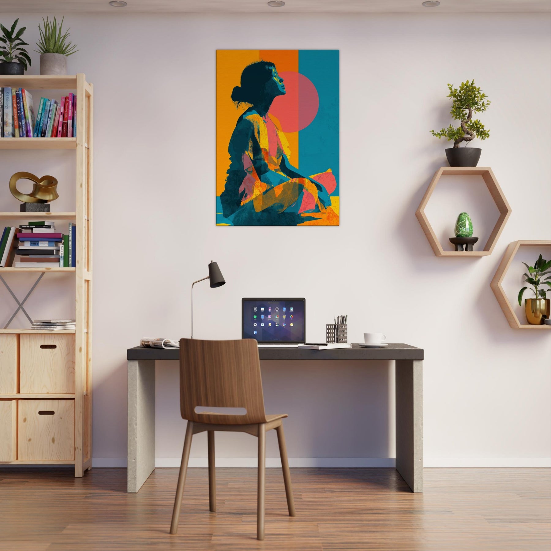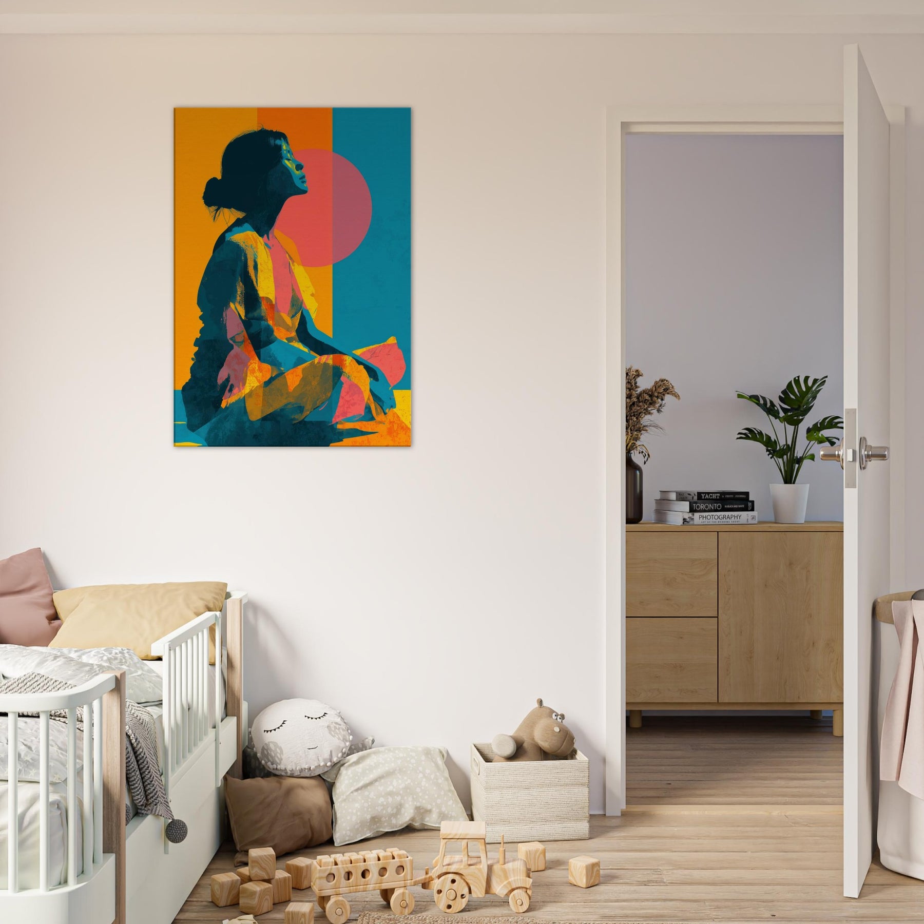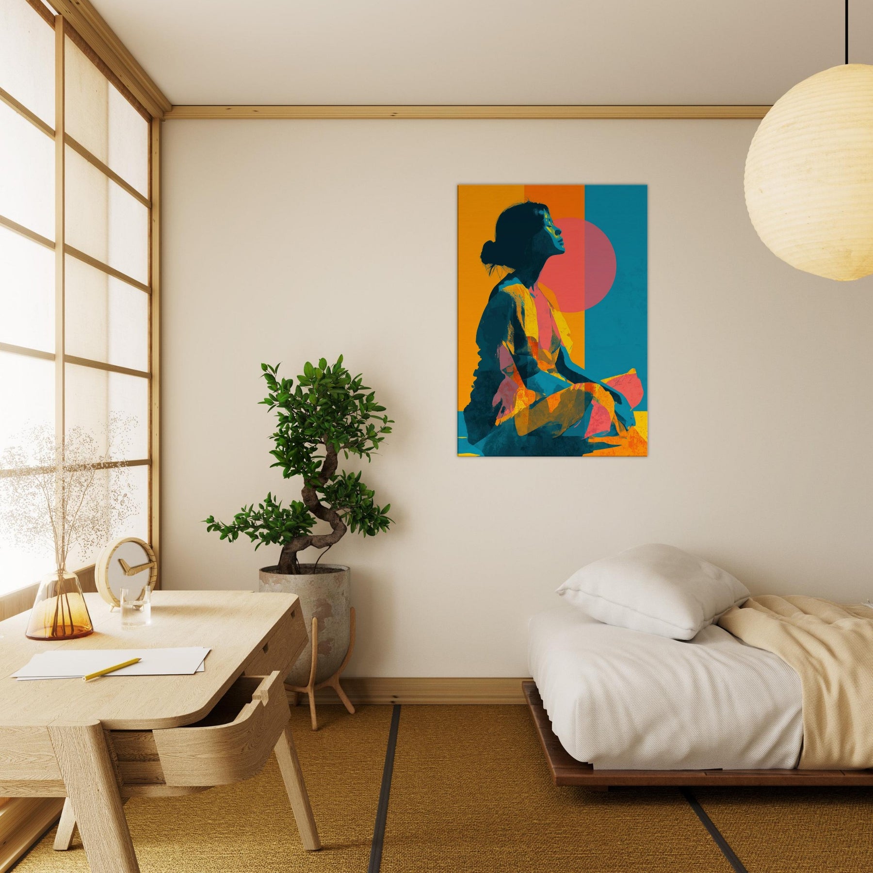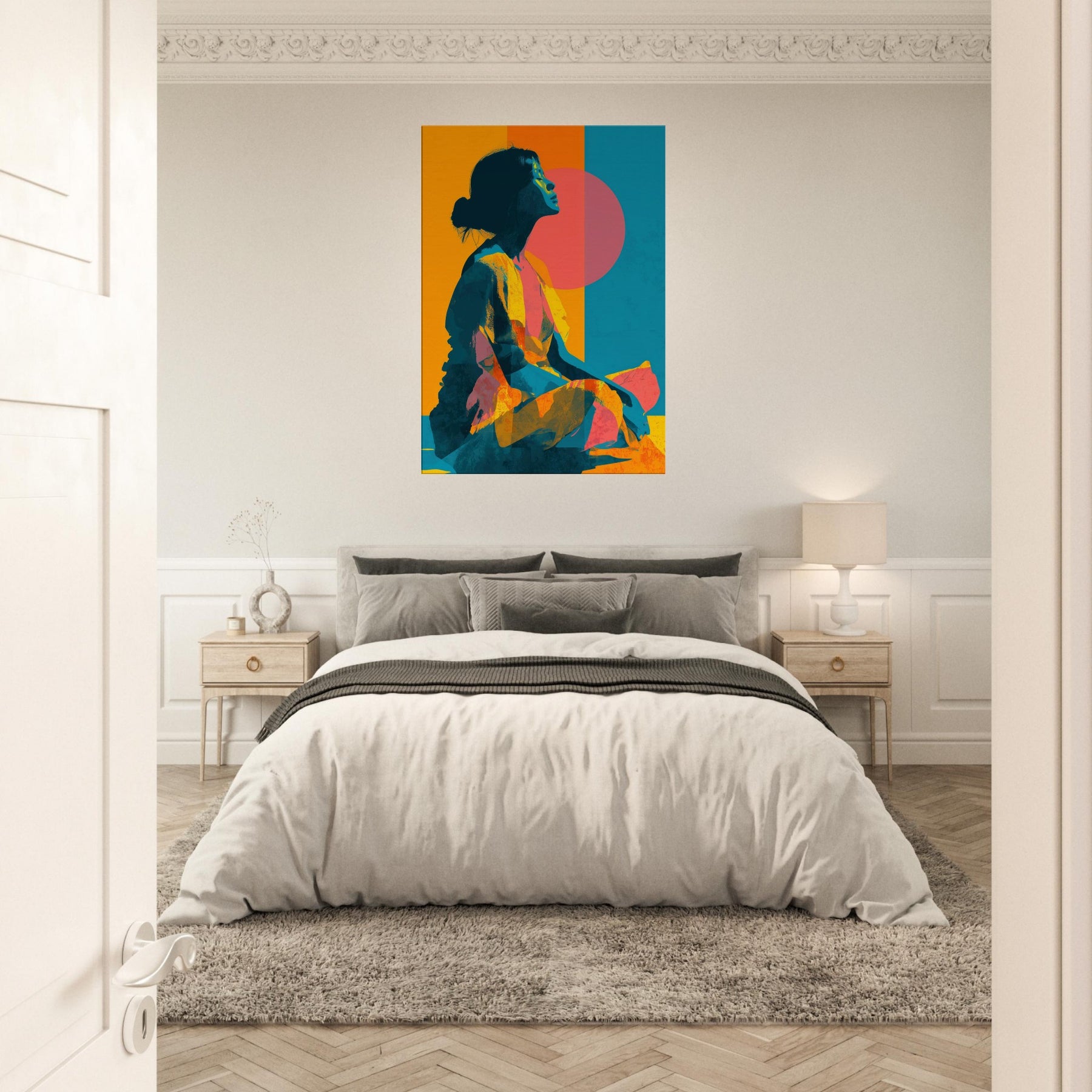 This piece centers the Yoga Lotus Pose in a vibrant symphony of color, where form dissolves into mood and light. A solitary figure is captured in quiet poise, rendered in bold blues, oranges, and pinks that pulse with life. Abstract shapes cradle the silhouette, creating a serene aura that feels both meditative and contemporary. Hang it in a living room or studio to invite balance, warmth, and focus a visual invitation to slow the pace and breathe.