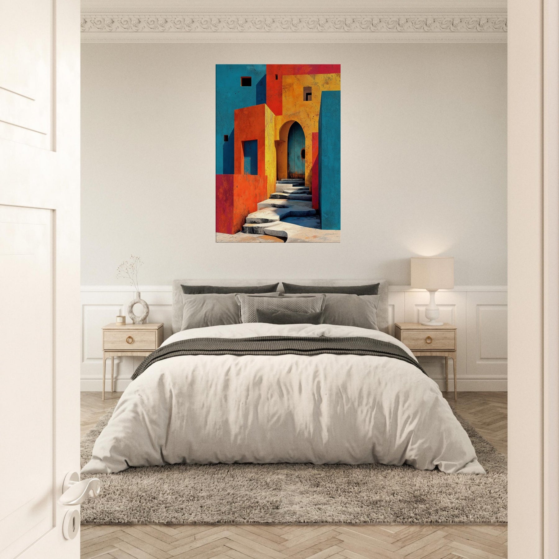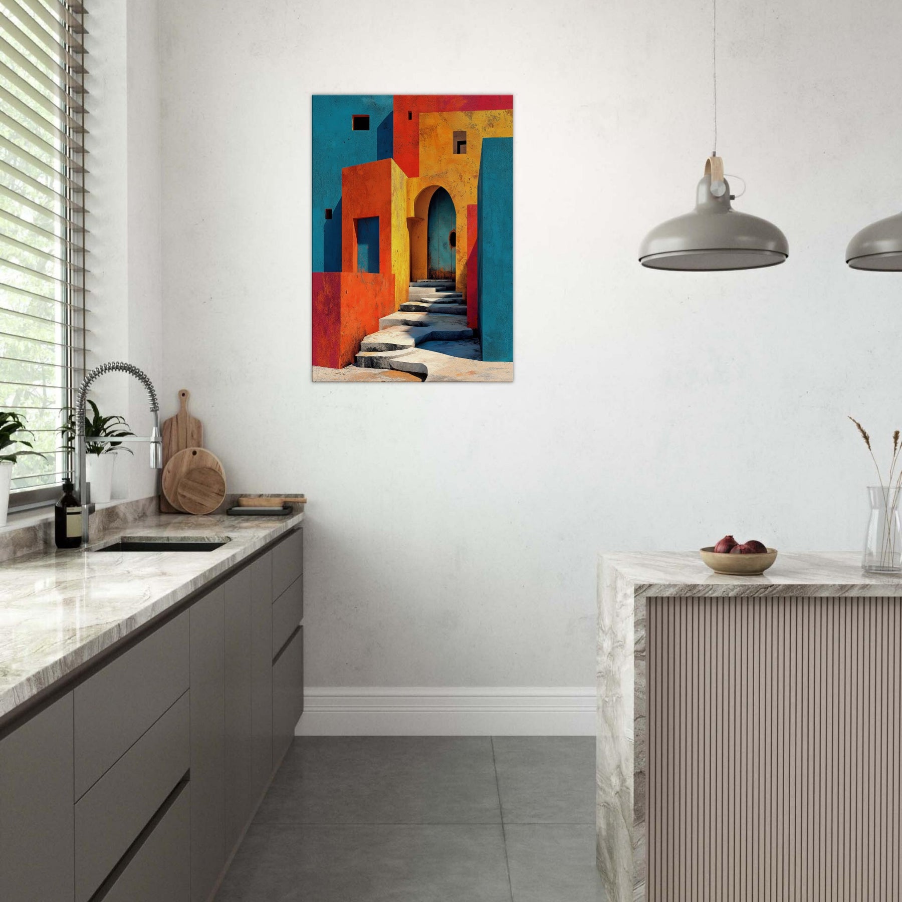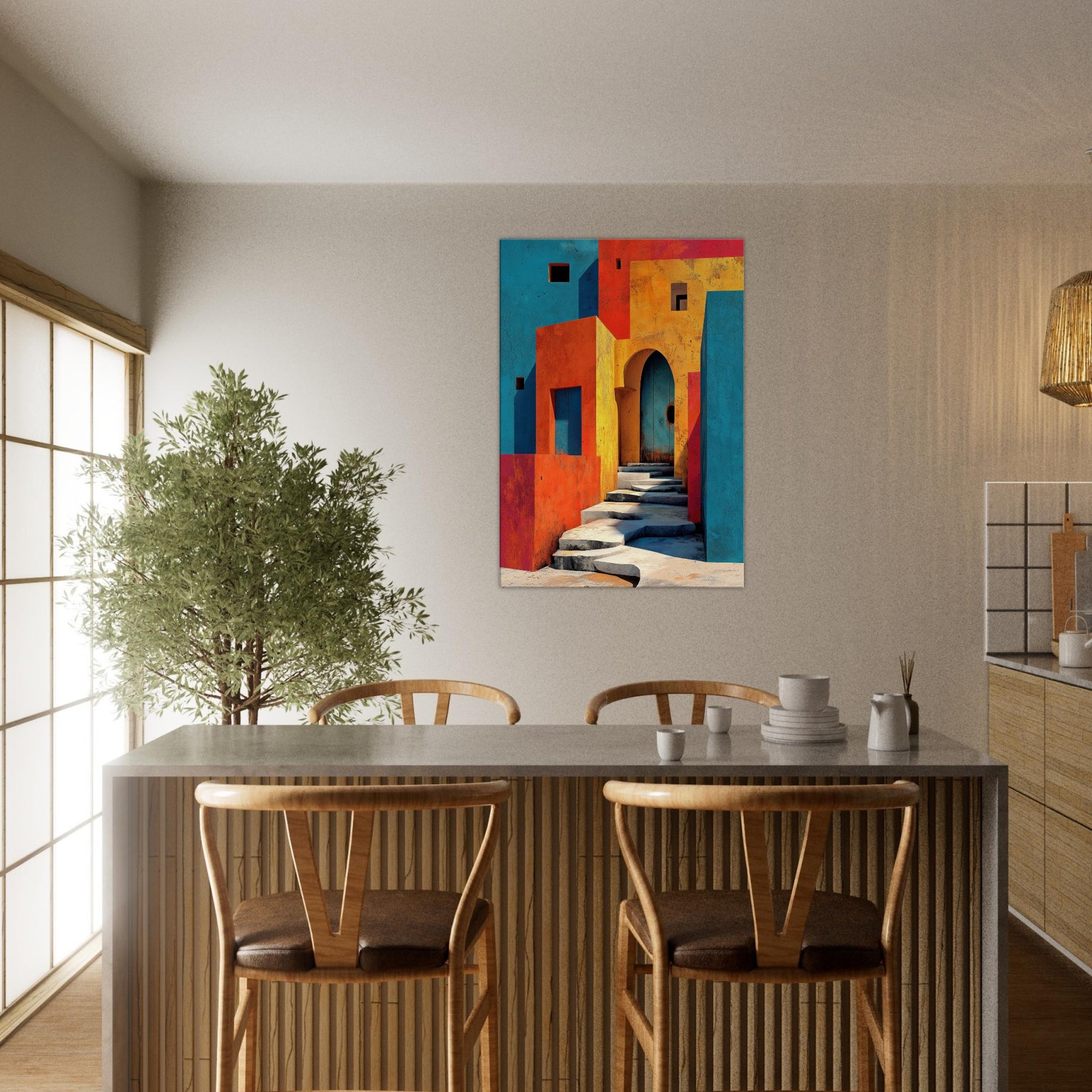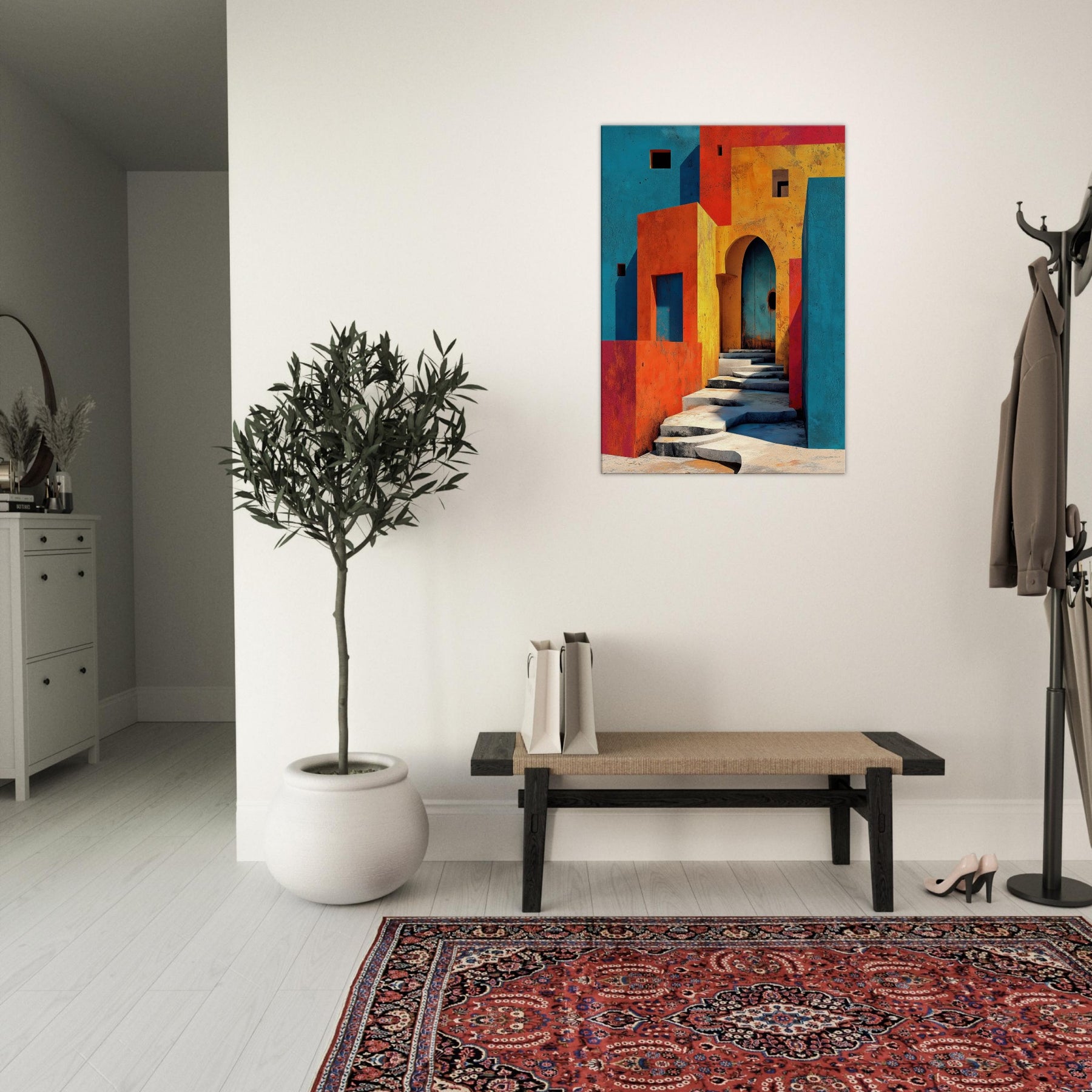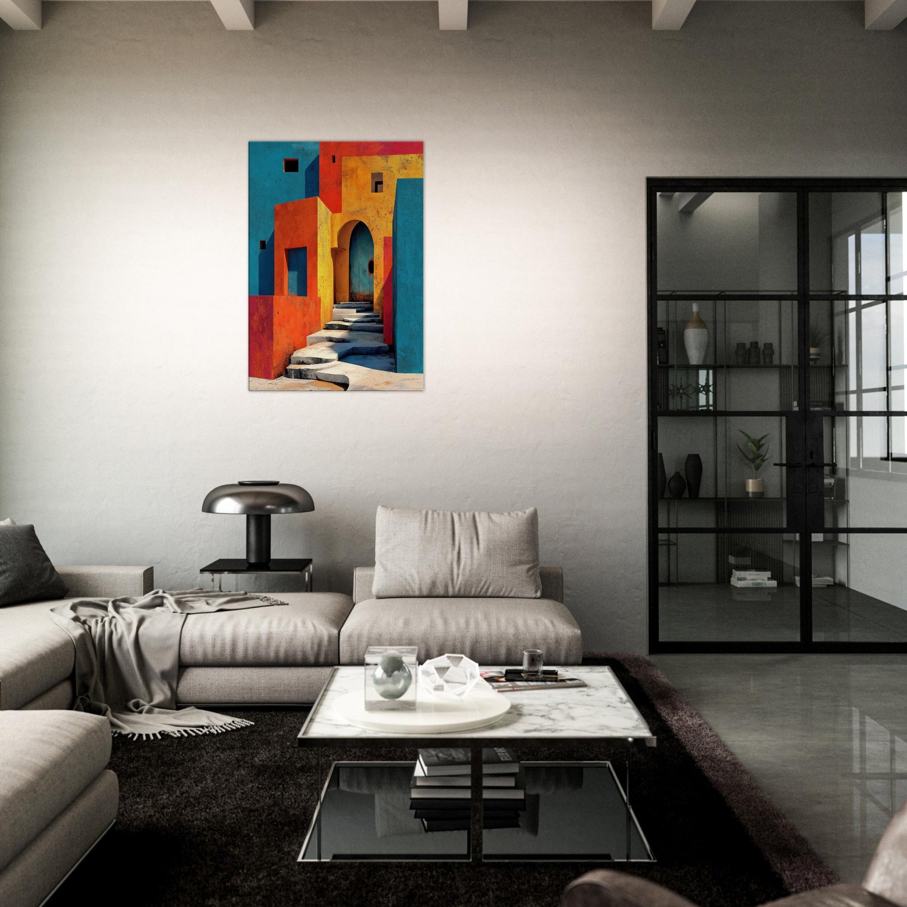 Archway unfurls as a living portal of color, where teal, orange, and yellow collude to refract light across the room. This abstract cityscape conjures a sun warmed stroll through arches, the air tasting of citrus and rain, footsteps tracing pale stone. The Archway invites curiosity and depth, anchoring furniture while guiding the eye deeper into the space. A bold, poetic statement that heightens mood, making your living room feel open, energized, and endlessly invite able.
