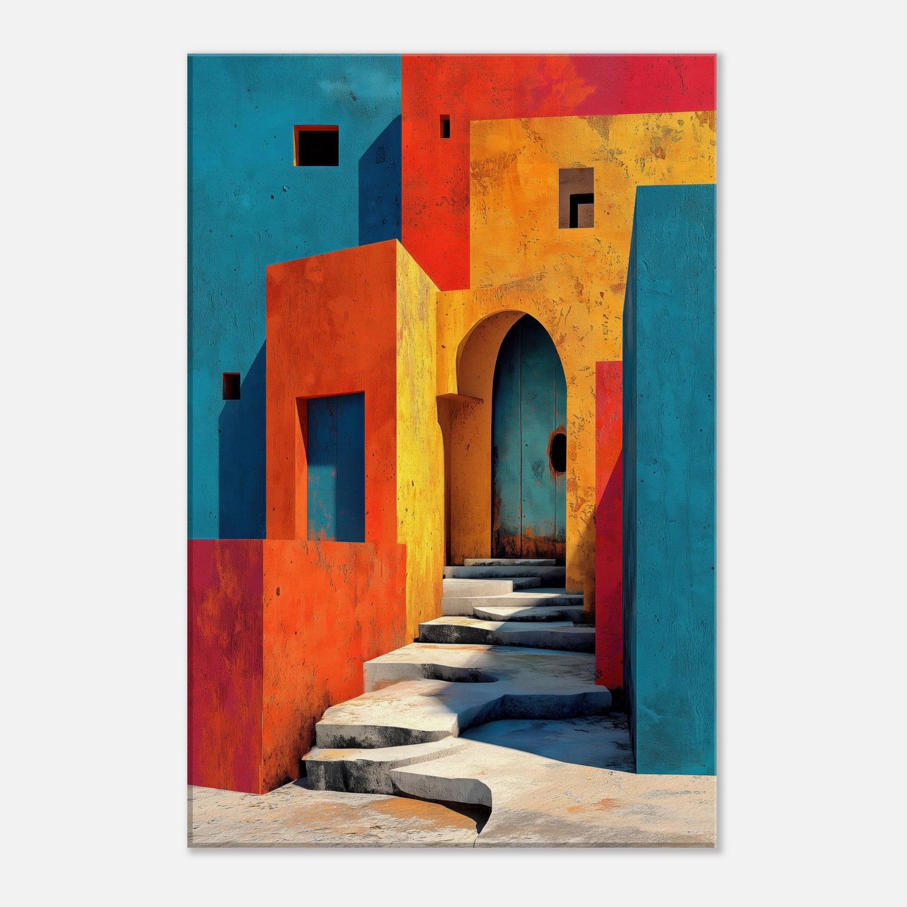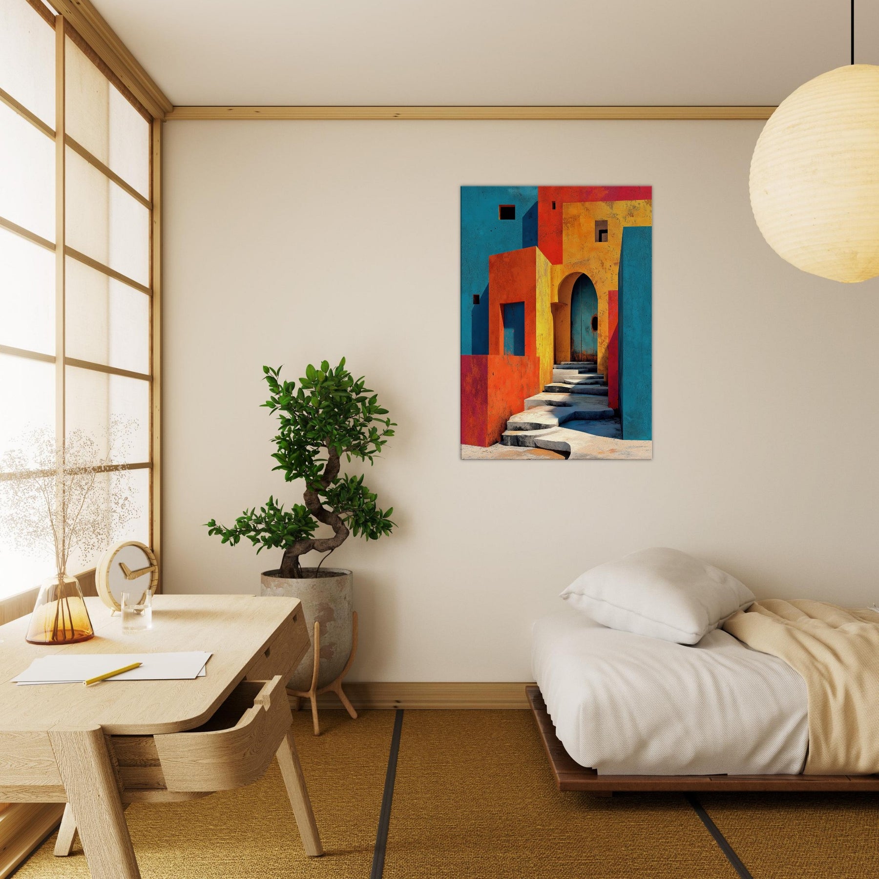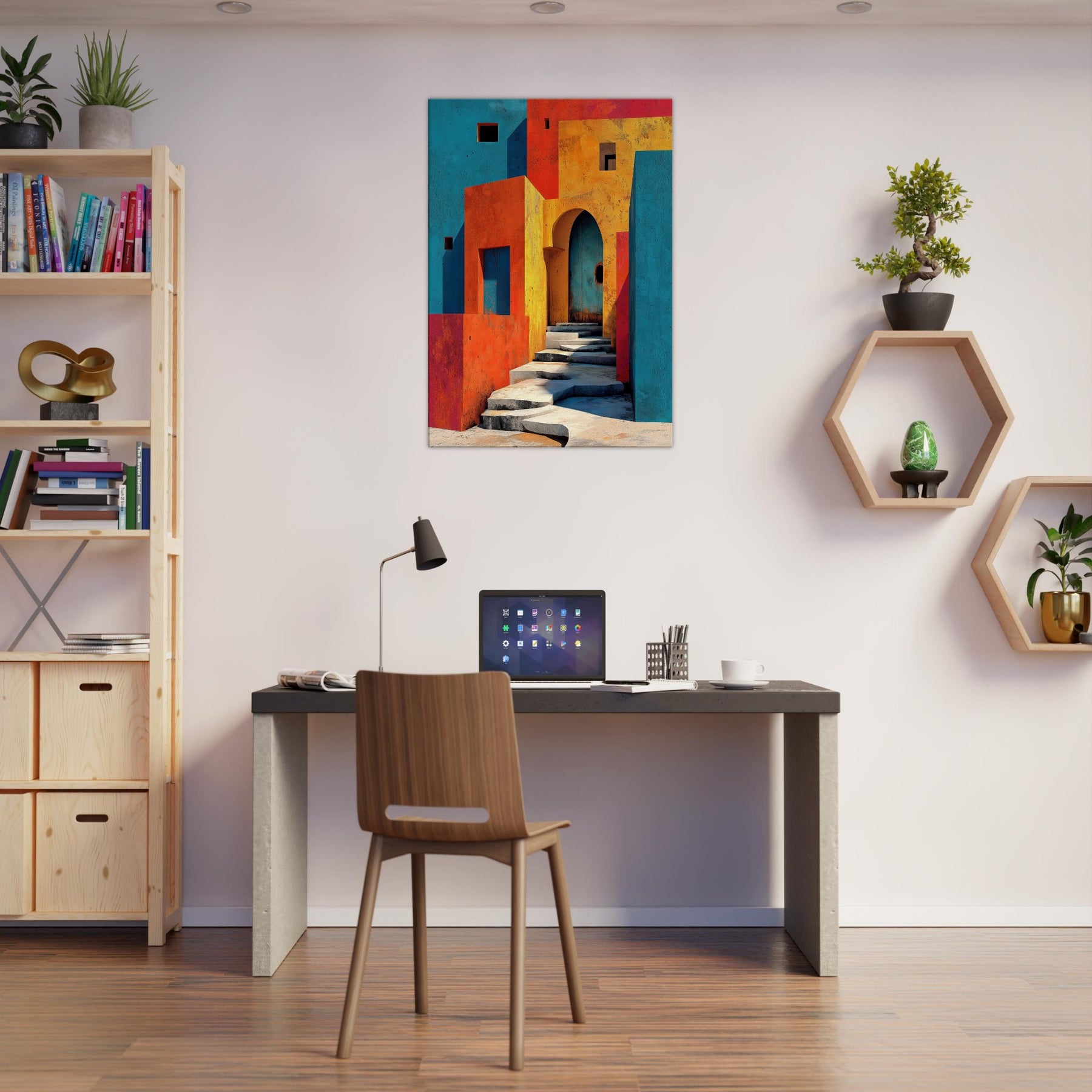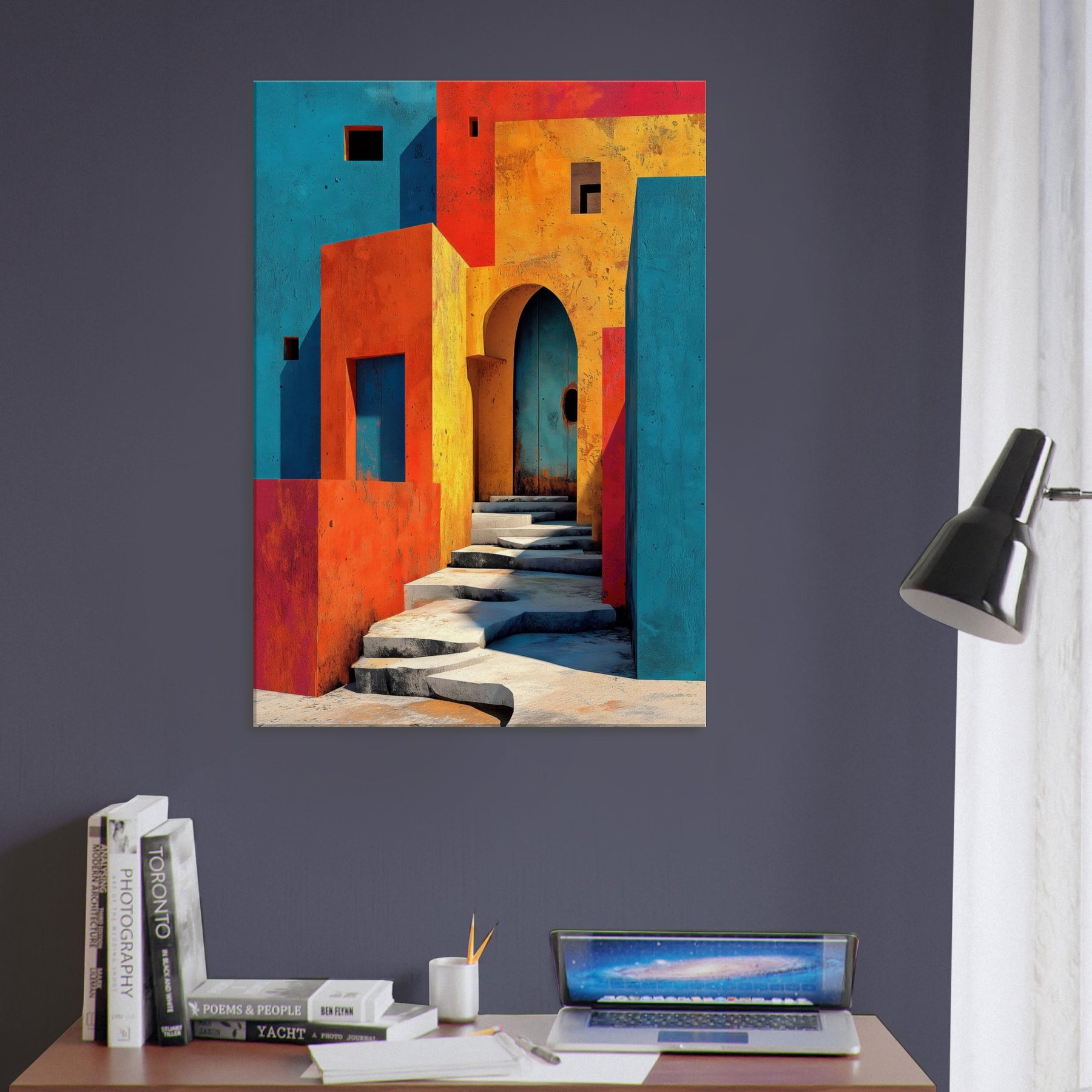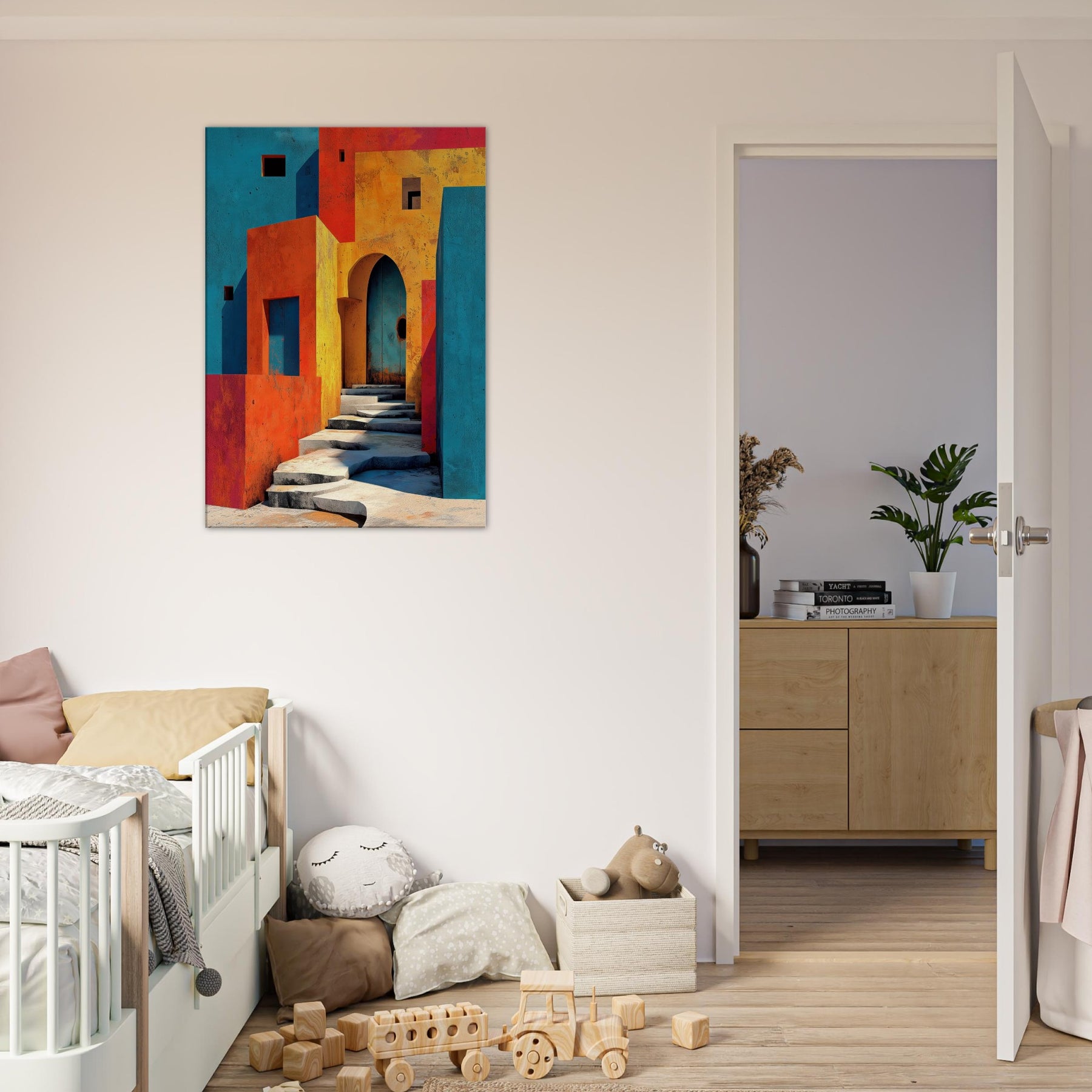 Archway unfurls as a living portal of color, where teal, orange, and yellow collude to refract light across the room. This abstract cityscape conjures a sun warmed stroll through arches, the air tasting of citrus and rain, footsteps tracing pale stone. The Archway invites curiosity and depth, anchoring furniture while guiding the eye deeper into the space. A bold, poetic statement that heightens mood, making your living room feel open, energized, and endlessly invite able.