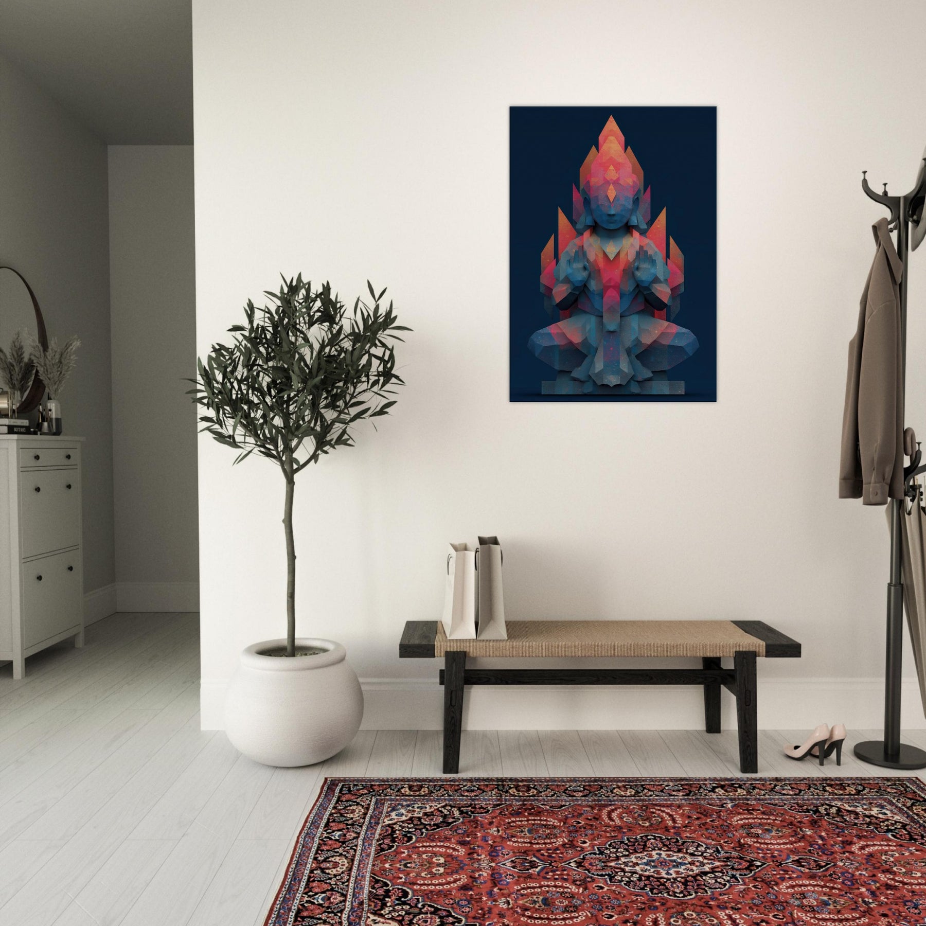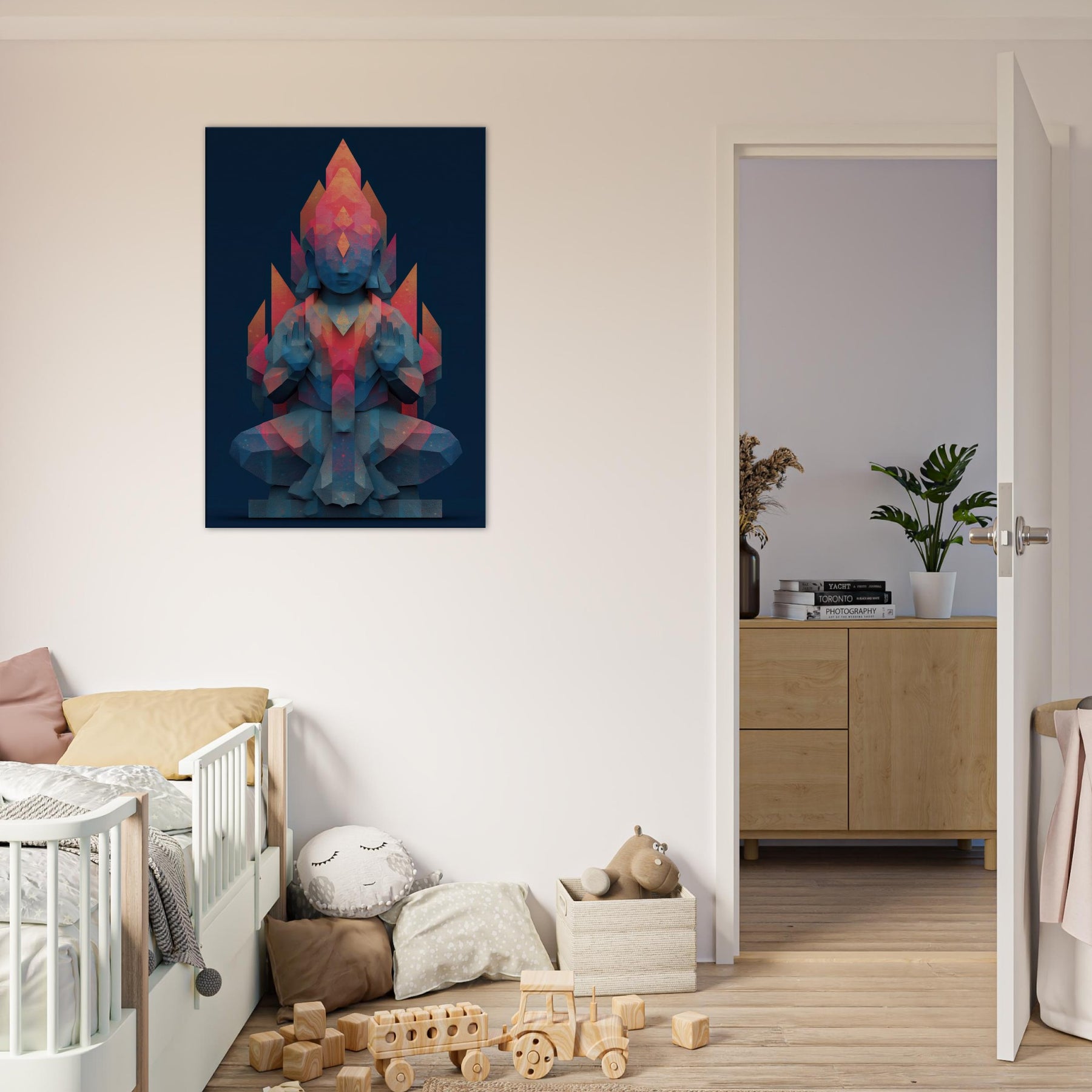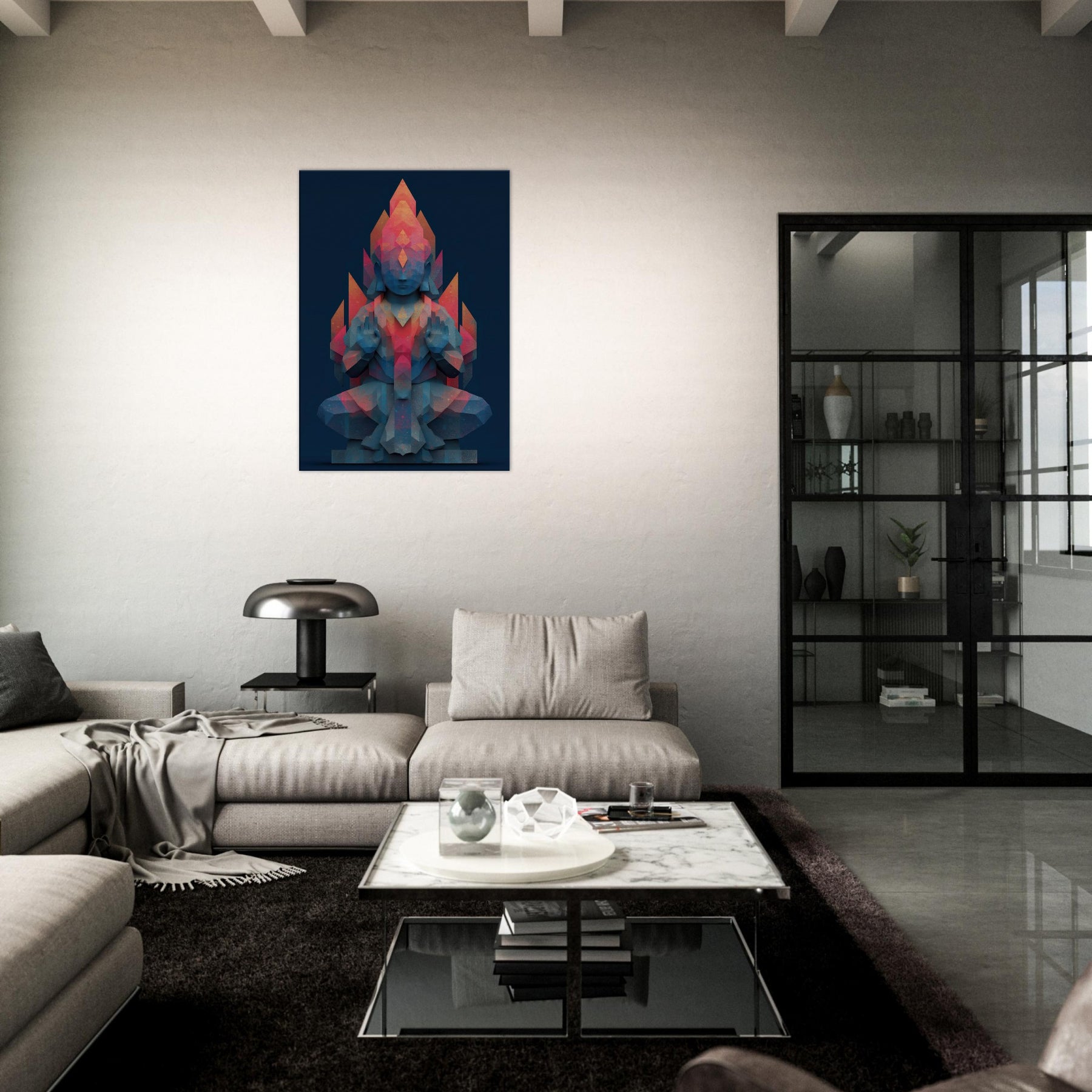 Enter a serene realm where Lakshmi rises from crystalline geometry in a sea of dusk blue and coral light. This abstract composition gathers shifting facets into a meditative stature, inviting soft focus and quiet breath. The piece breathes warmth into cool spaces, turning a wall into a shrine of abundance and calm. Perfect for a living room or study, it anchors conversations with goddess like presence while remaining accessible through its luminous, modern geometry.