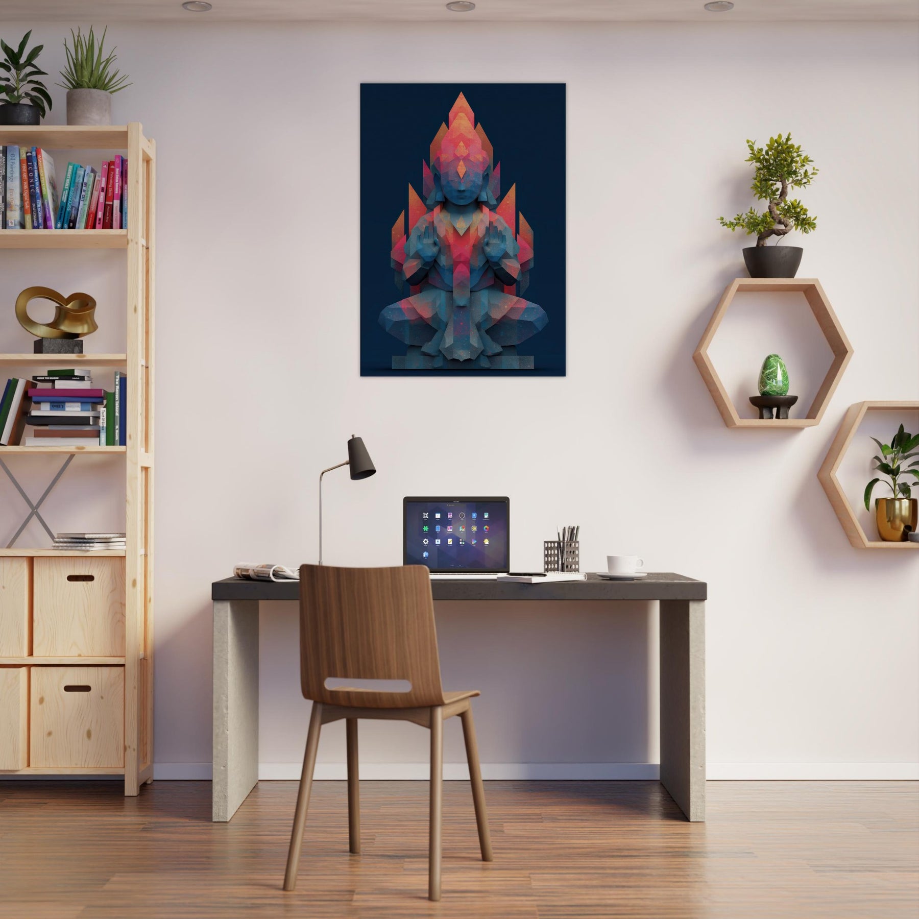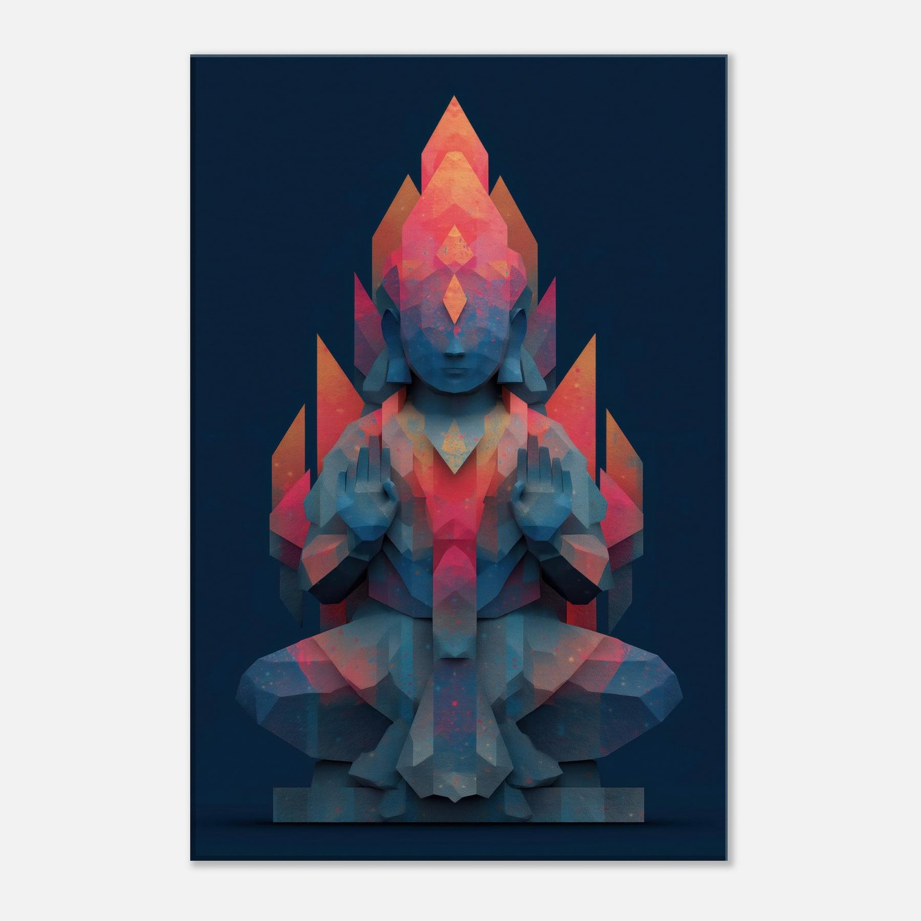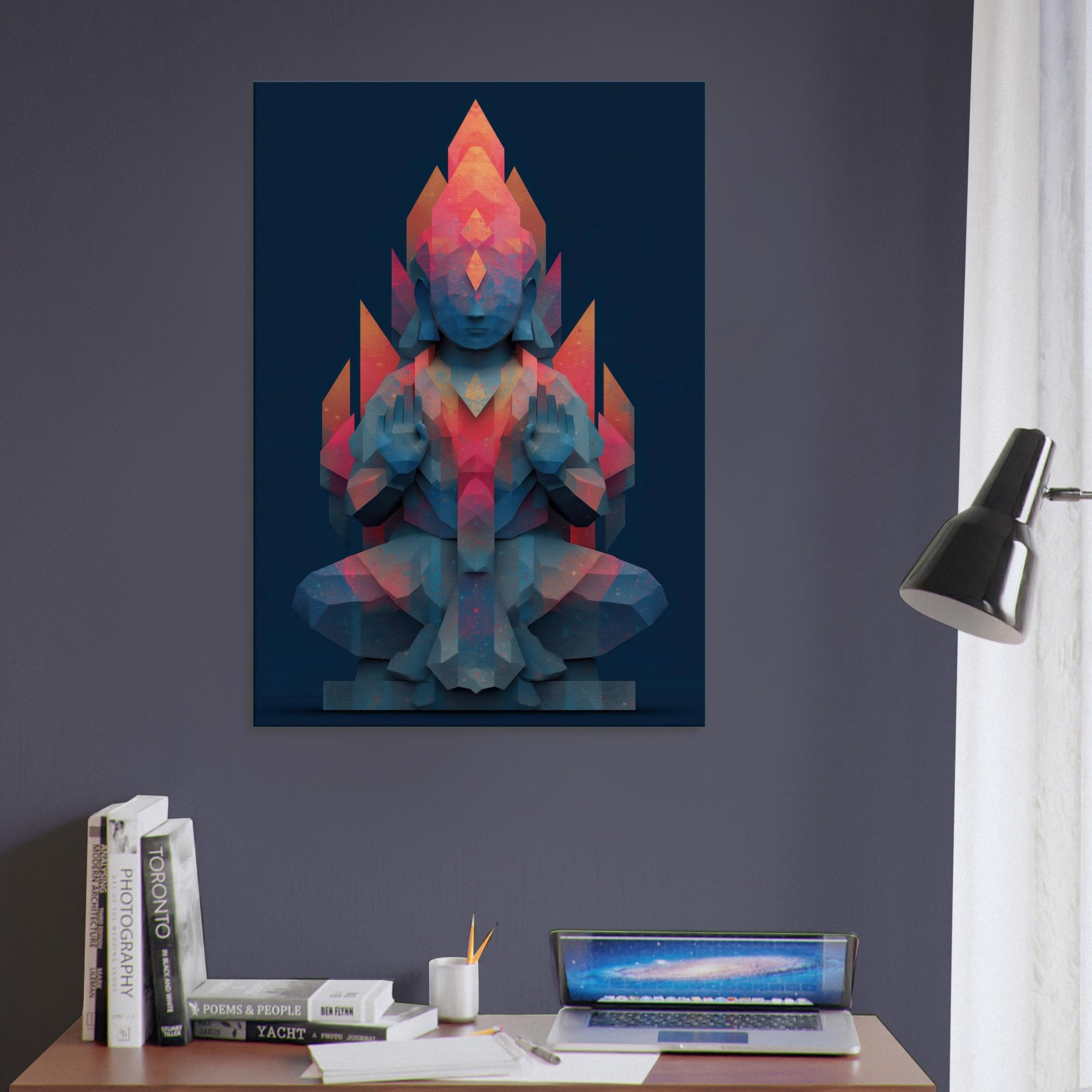 Enter a serene realm where Lakshmi rises from crystalline geometry in a sea of dusk blue and coral light. This abstract composition gathers shifting facets into a meditative stature, inviting soft focus and quiet breath. The piece breathes warmth into cool spaces, turning a wall into a shrine of abundance and calm. Perfect for a living room or study, it anchors conversations with goddess like presence while remaining accessible through its luminous, modern geometry.