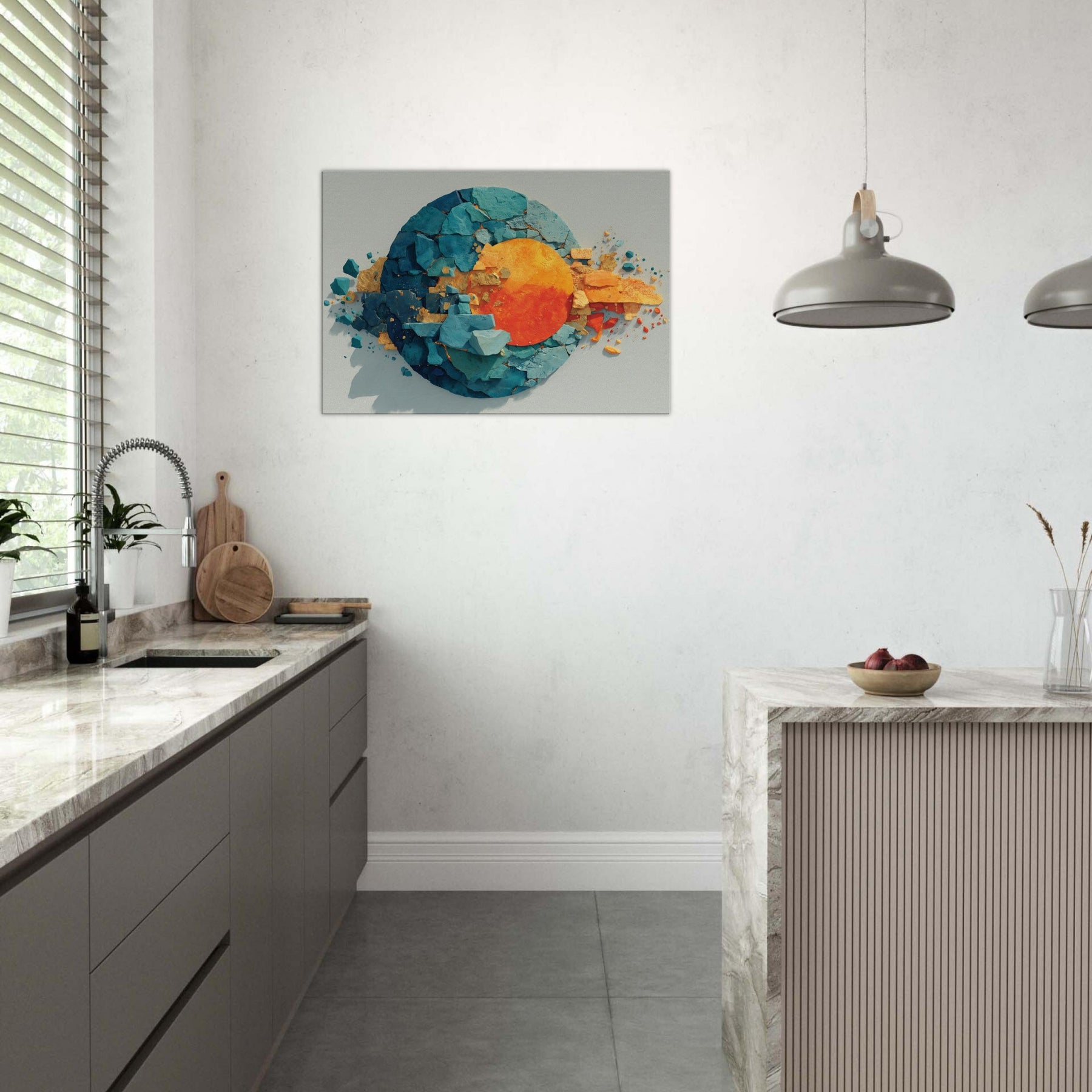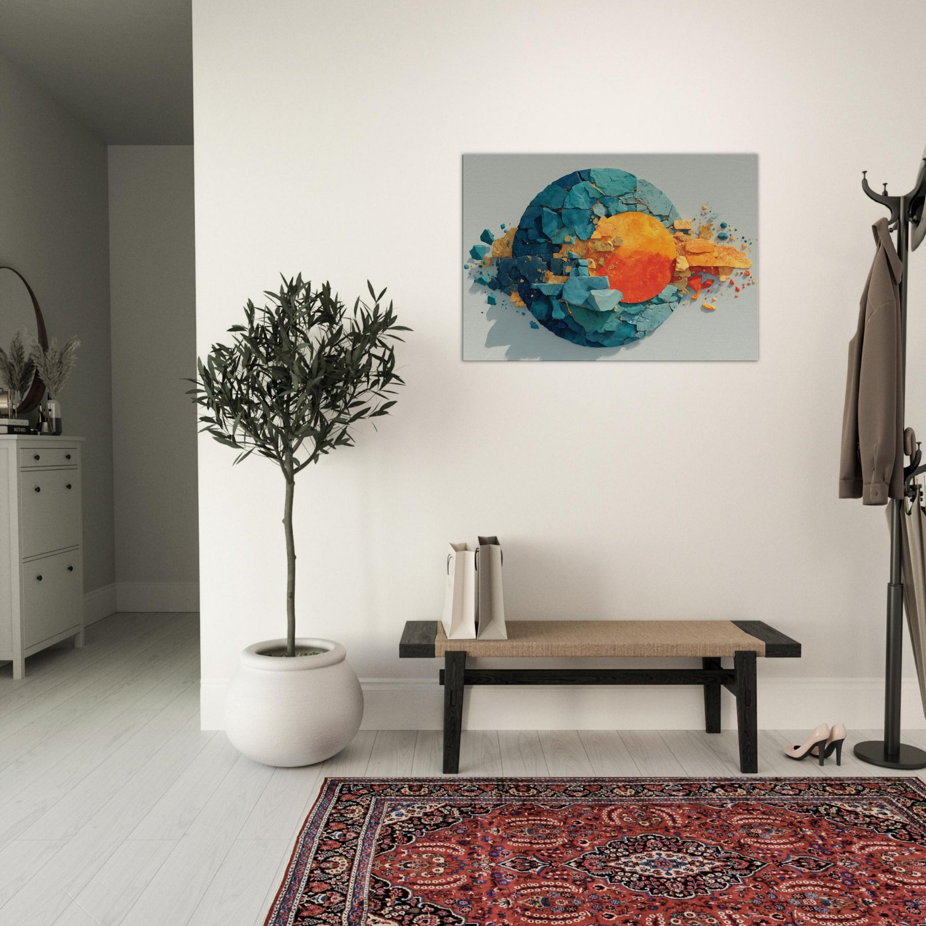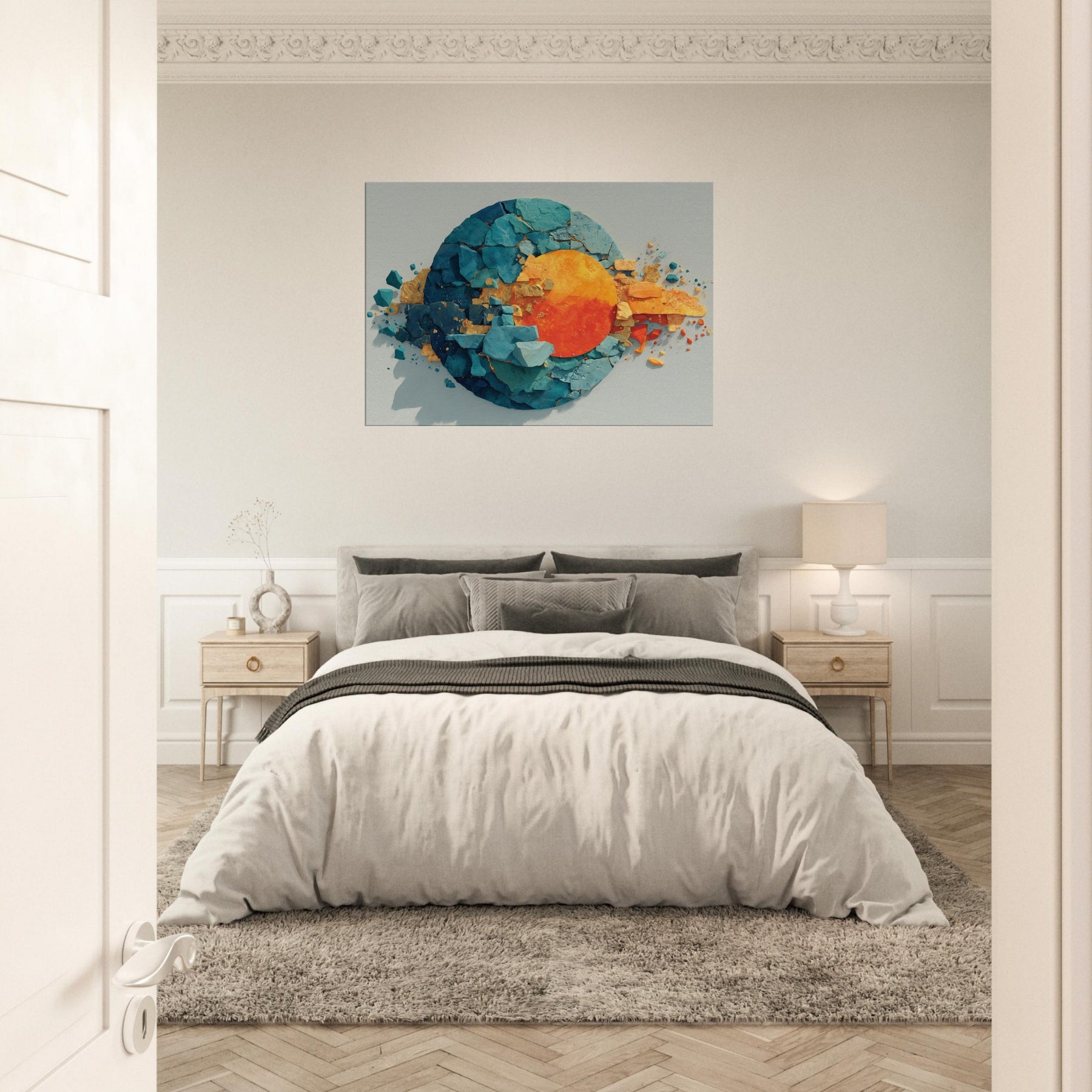 Let the Moon rise within your space as an architect of atmosphere. This abstract composition folds the hush of night into a luminous circle, surrounded by shattered shards of color that pulse with quiet energy. You’ll feel cool blue whispers and a warm solar heart bouncing across the walls, transforming a living room or bedroom into a sanctuary of contemplation. The piece invites slow, breathing moments, turning ordinary evenings into rituals of pause and wonder.