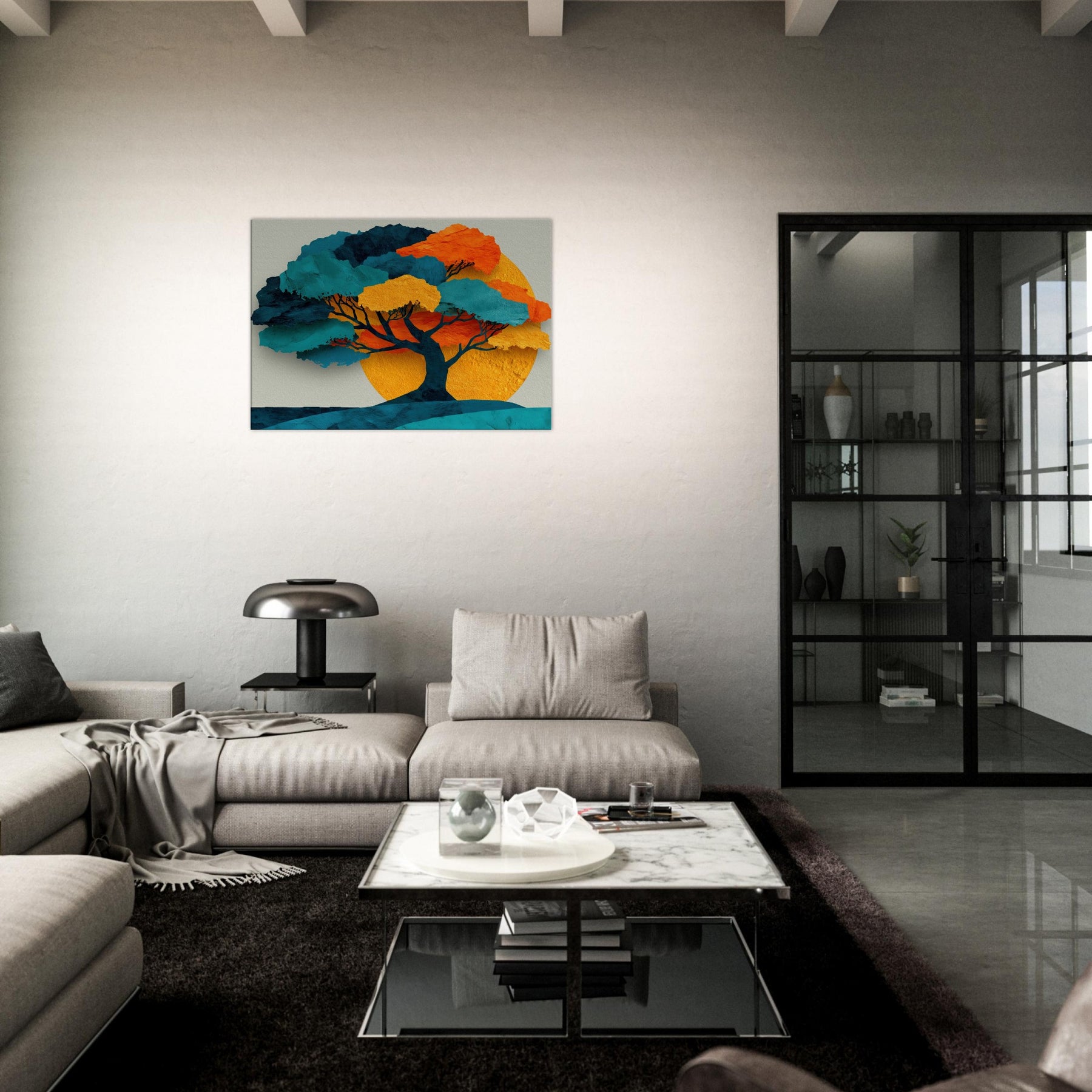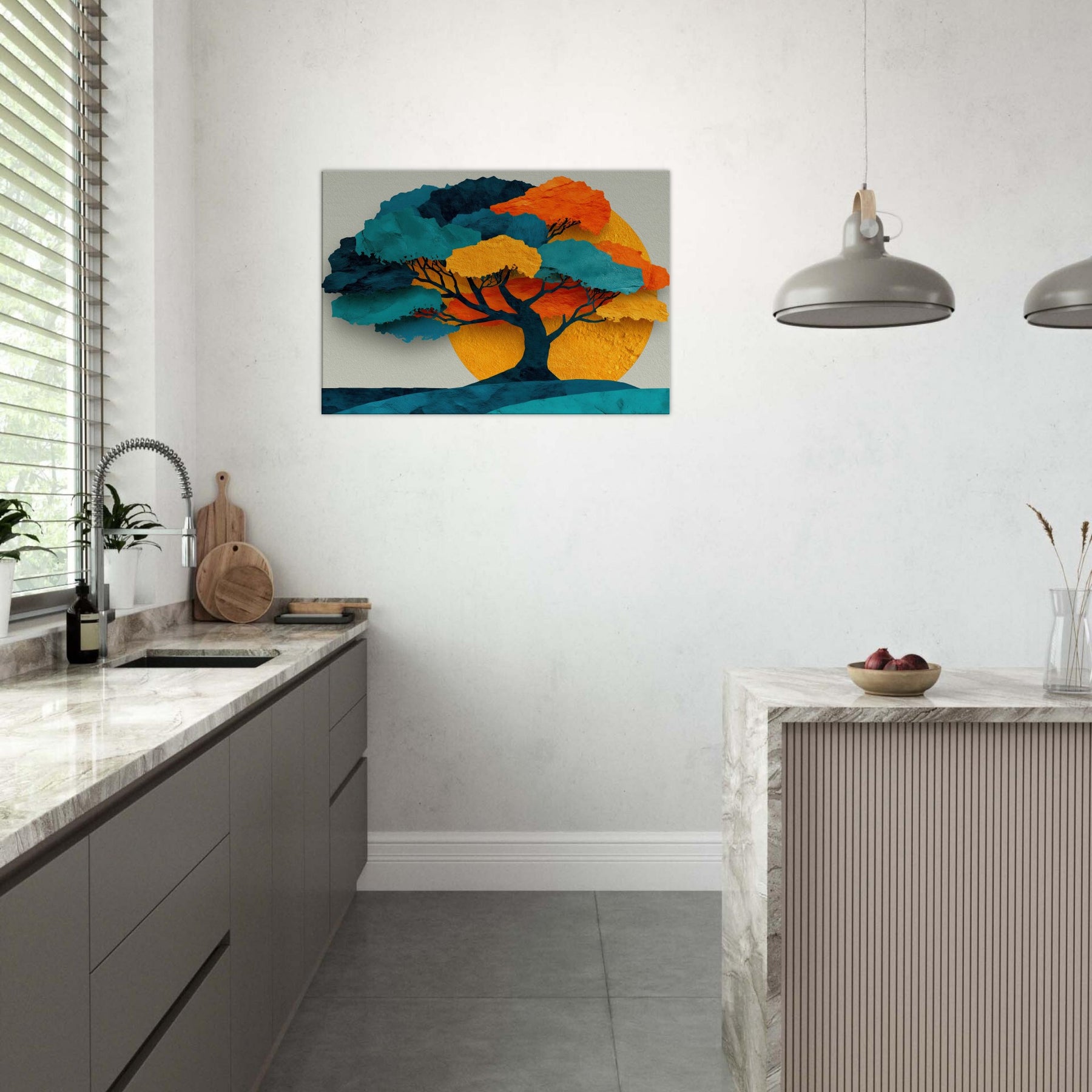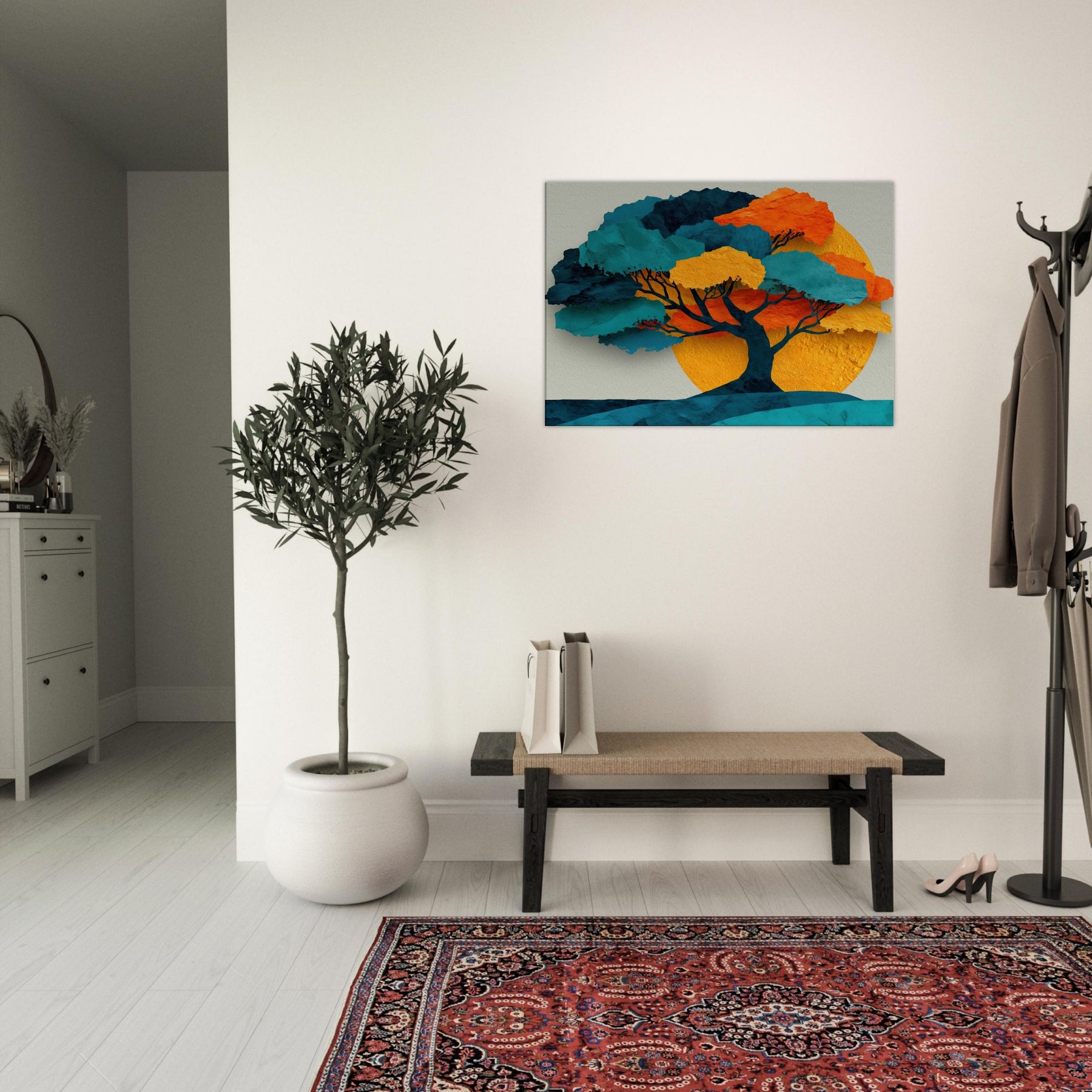 In this abstract meditation, the Tree of Life rises against a sun washed horizon, its branches unfurling in a spectrum of turquoise, teal, and gold. The piece hums with mystery, as if ancient winds carry whispers of renewal. The tactile textures invite a finger to linger, while the radiant circle behind it bathes a room in warm, living light. Hang it where conversation blooms and daily space becomes a sanctuary.