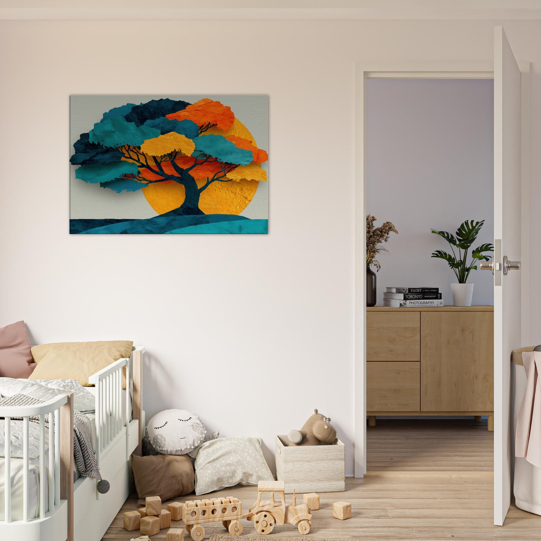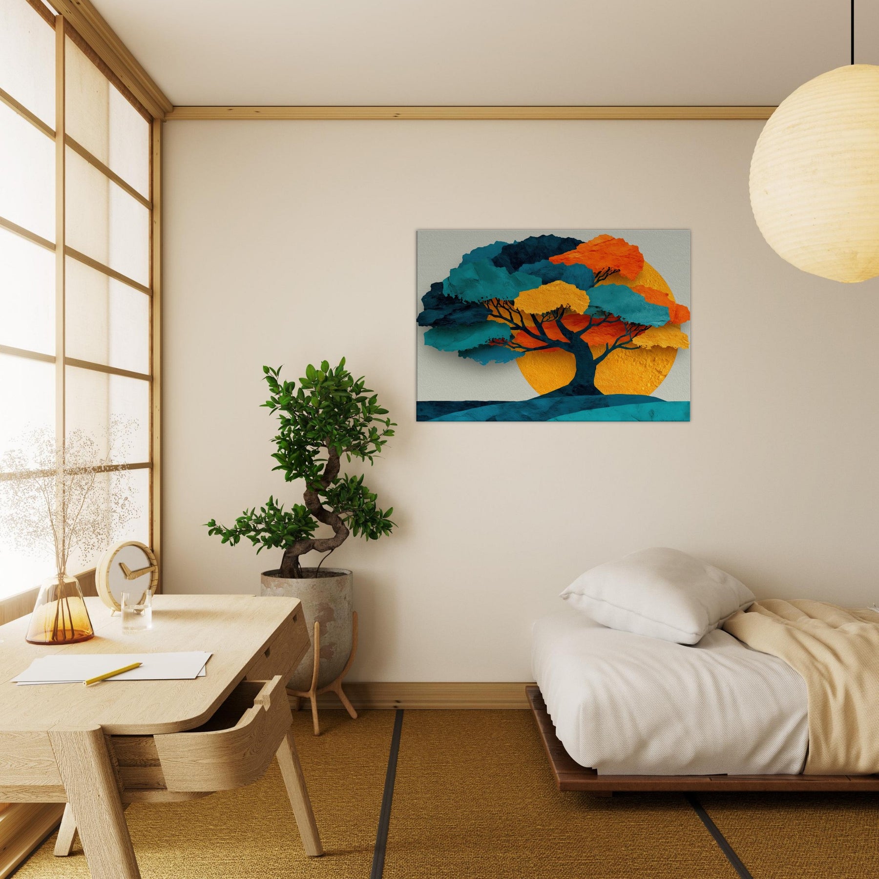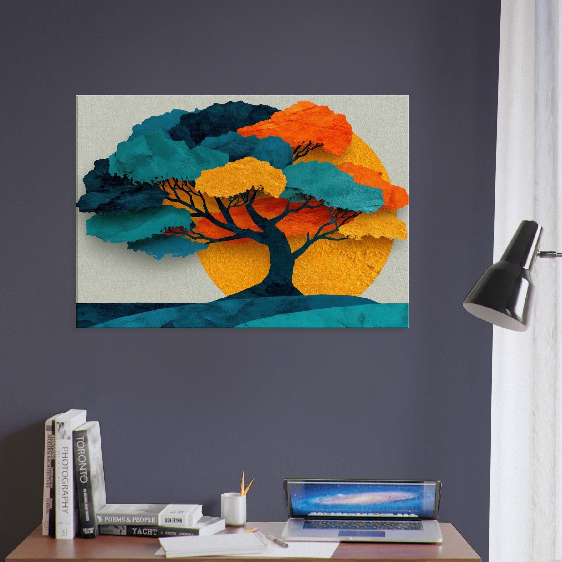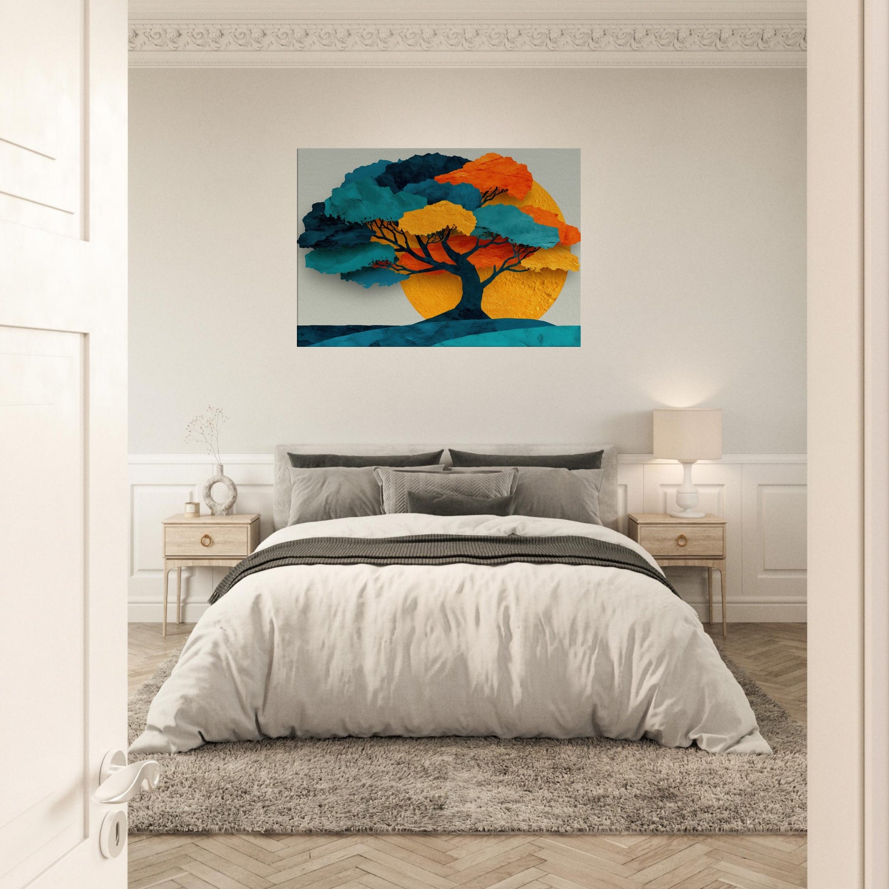 In this abstract meditation, the Tree of Life rises against a sun washed horizon, its branches unfurling in a spectrum of turquoise, teal, and gold. The piece hums with mystery, as if ancient winds carry whispers of renewal. The tactile textures invite a finger to linger, while the radiant circle behind it bathes a room in warm, living light. Hang it where conversation blooms and daily space becomes a sanctuary.