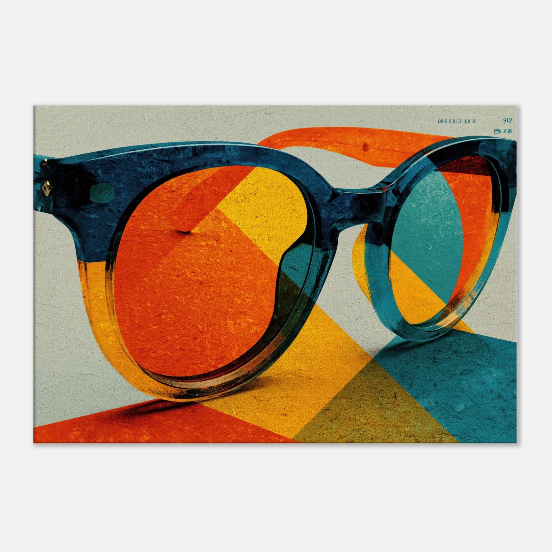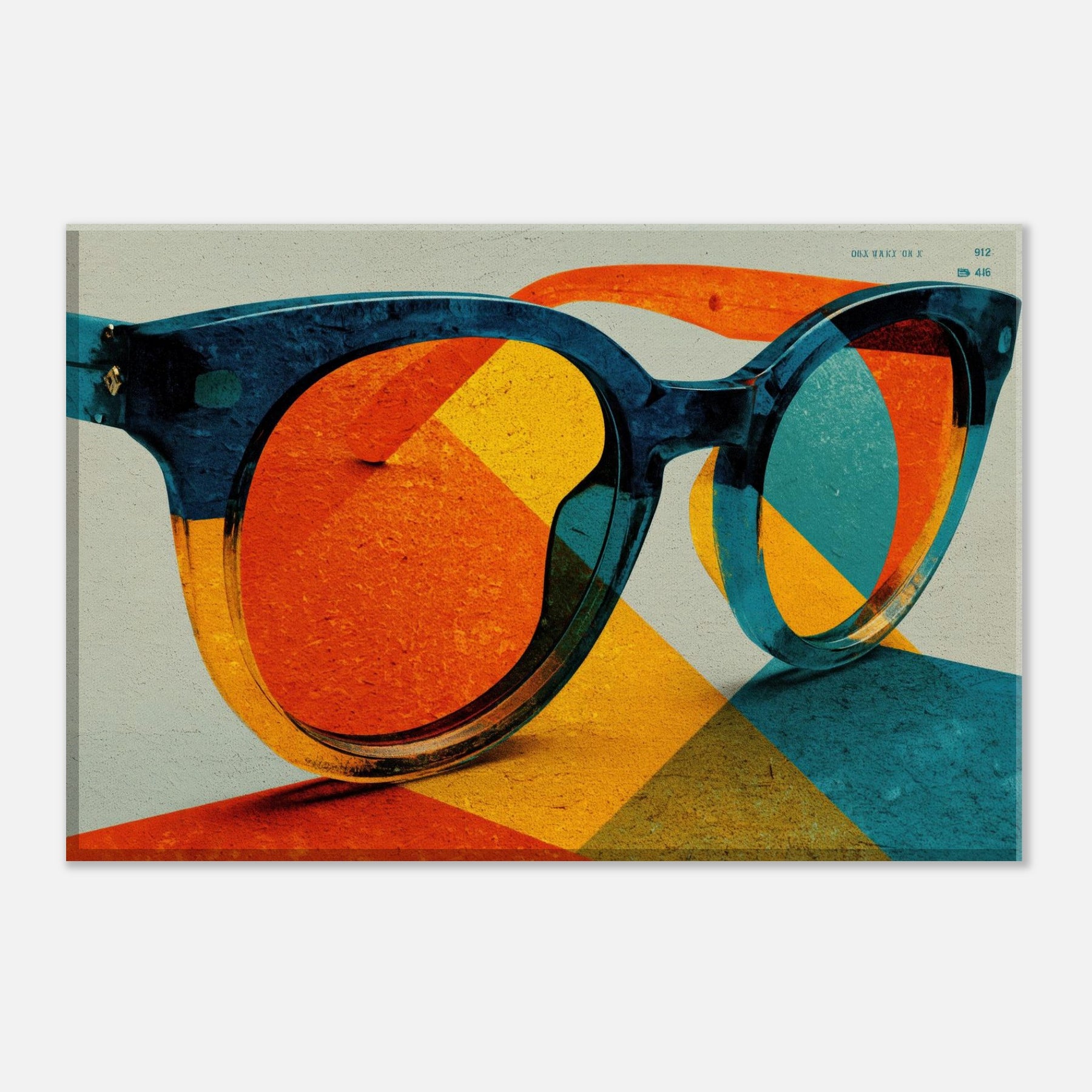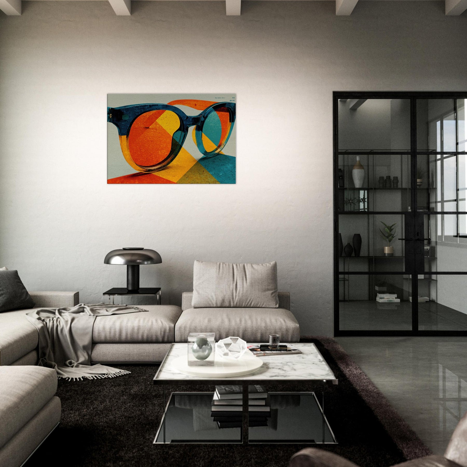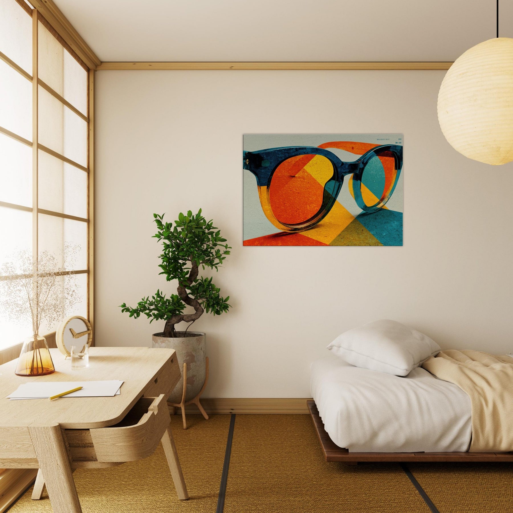 An abstract field of color curves folds over the Sunglasses, transforming a familiar accessory into a gleaming portal of memory and mood. The lenses shimmer with sun washed oranges, teal shadows, and charcoal edges, inviting the eye to wander along geometric planes that echo a warm afternoon. This piece turns any living room into a sunlit lounge: it cools the space with light, sparks conversation, and makes the ordinary feel iconic. Let the Sunglasses anchor your space with quiet confidence.