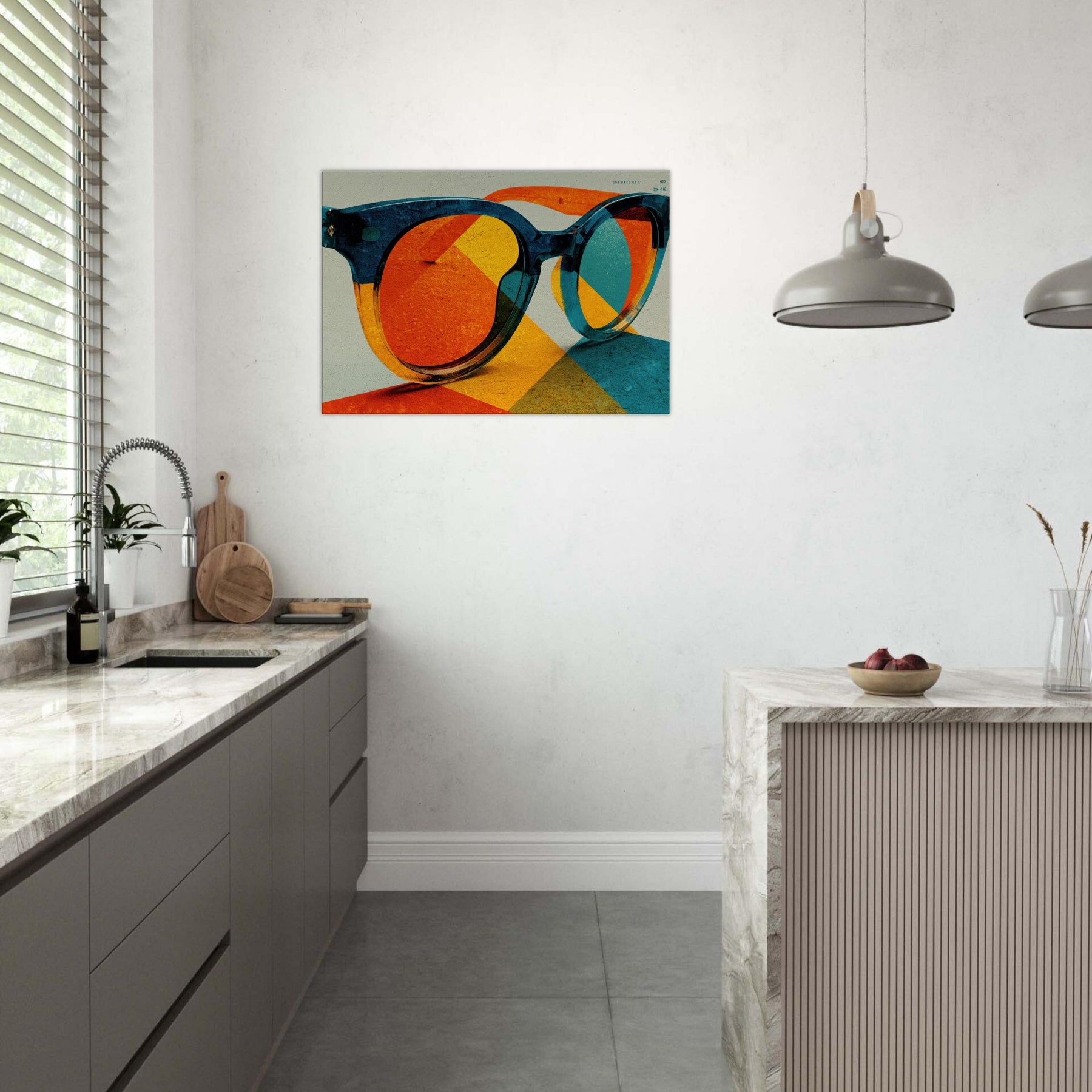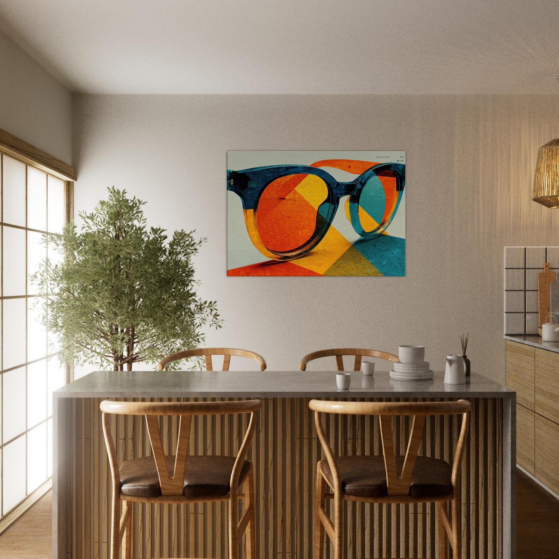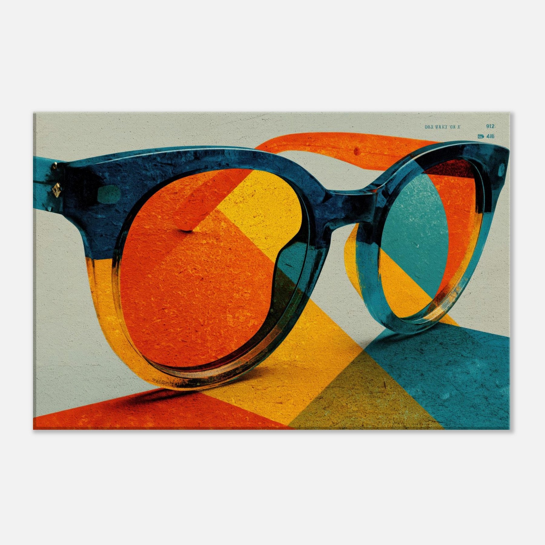 An abstract field of color curves folds over the Sunglasses, transforming a familiar accessory into a gleaming portal of memory and mood. The lenses shimmer with sun washed oranges, teal shadows, and charcoal edges, inviting the eye to wander along geometric planes that echo a warm afternoon. This piece turns any living room into a sunlit lounge: it cools the space with light, sparks conversation, and makes the ordinary feel iconic. Let the Sunglasses anchor your space with quiet confidence.
