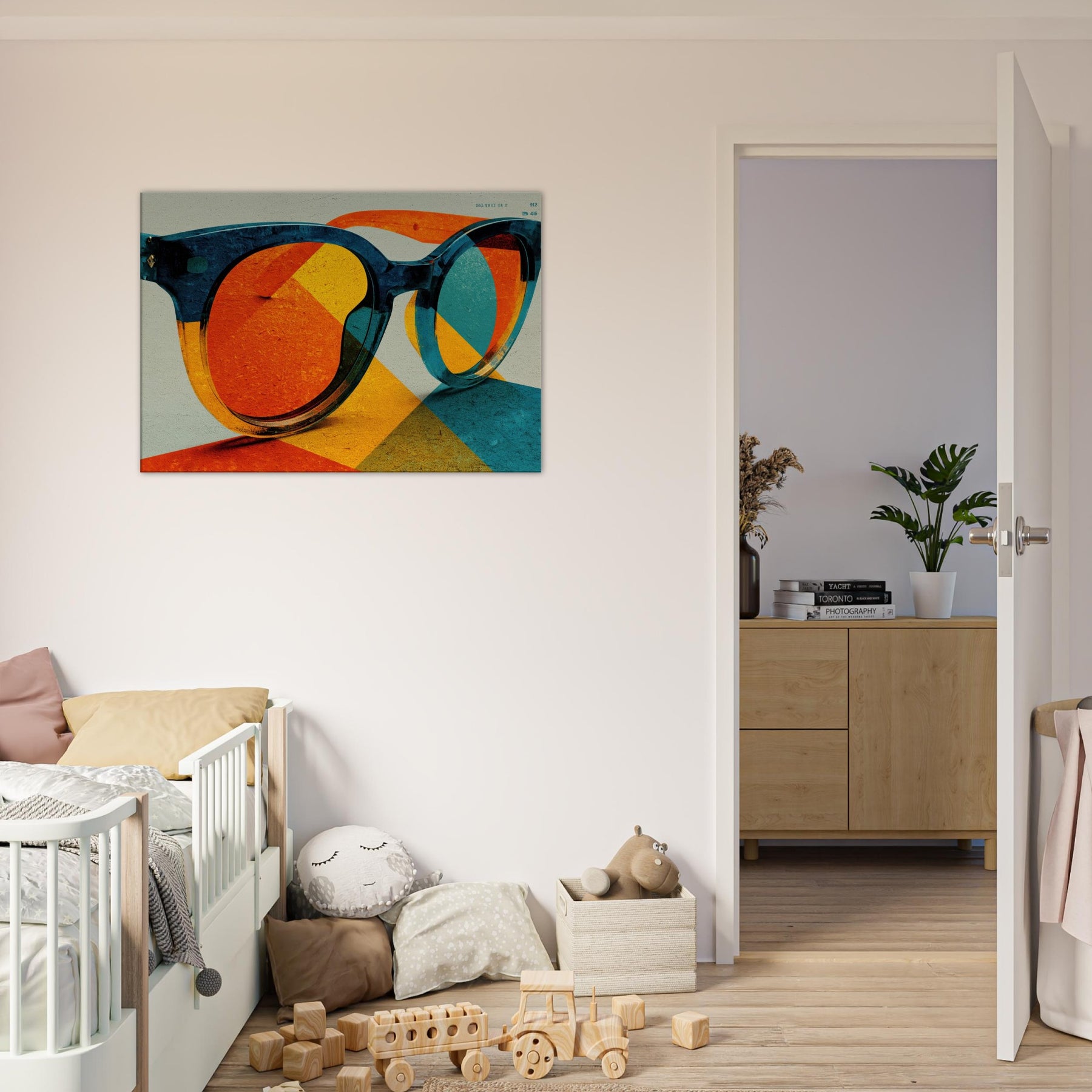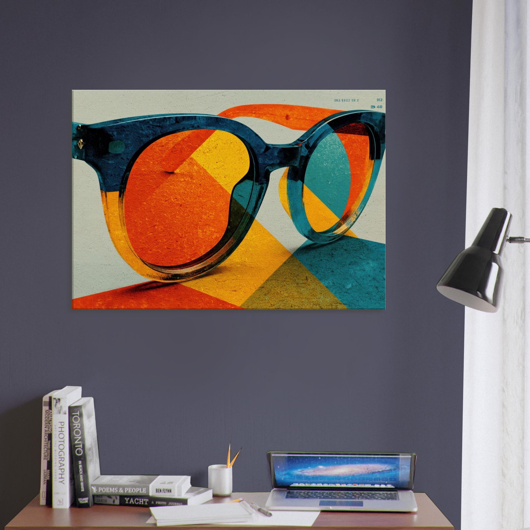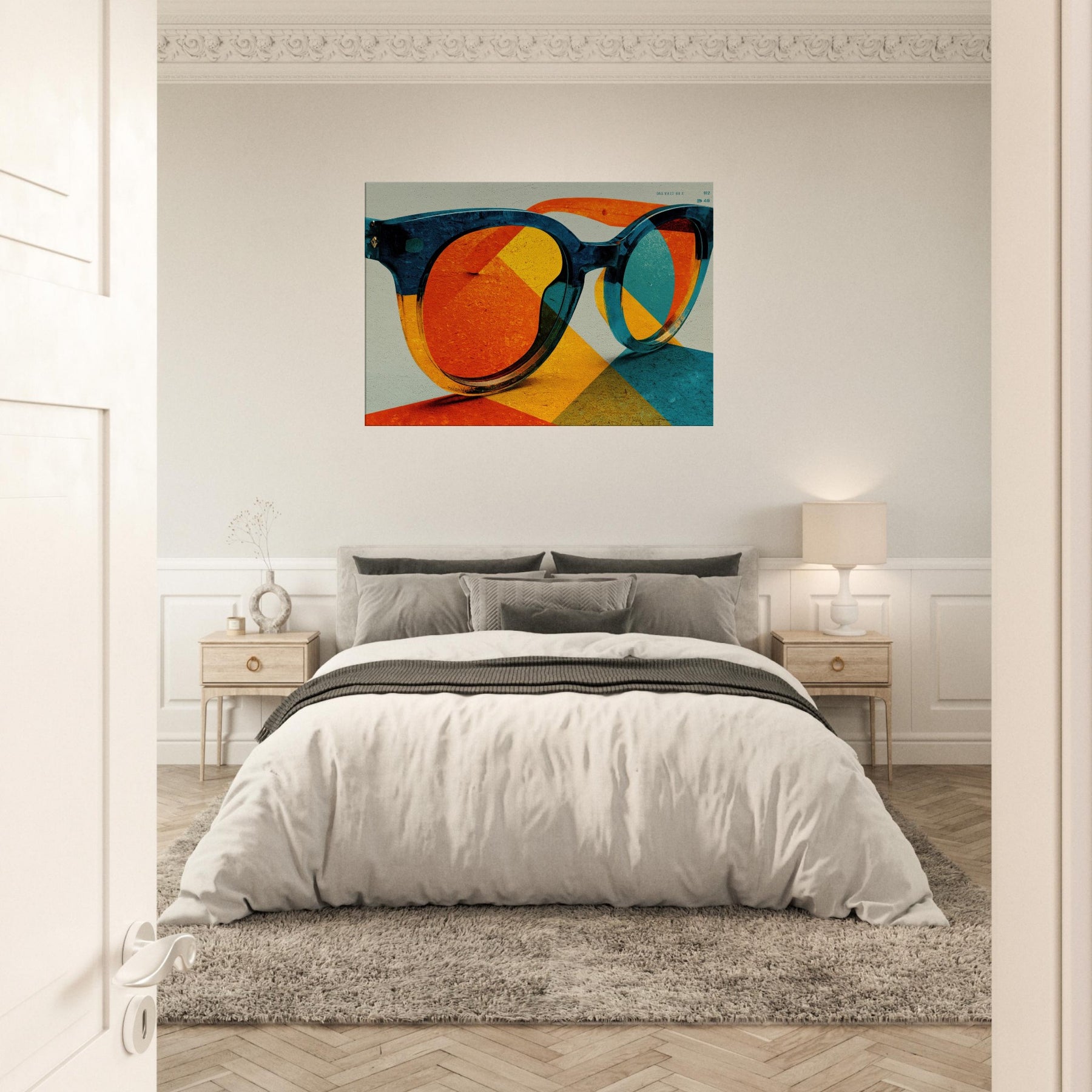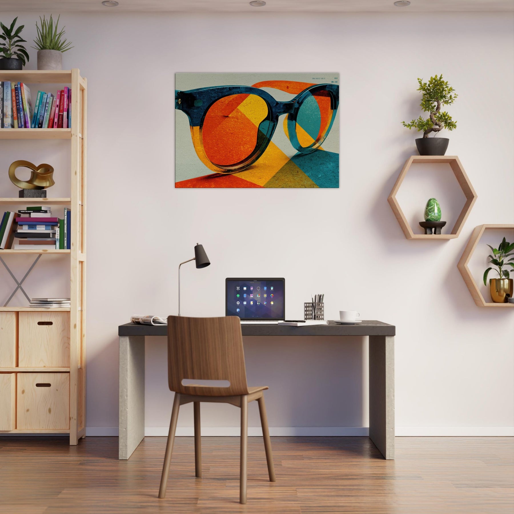 An abstract field of color curves folds over the Sunglasses, transforming a familiar accessory into a gleaming portal of memory and mood. The lenses shimmer with sun washed oranges, teal shadows, and charcoal edges, inviting the eye to wander along geometric planes that echo a warm afternoon. This piece turns any living room into a sunlit lounge: it cools the space with light, sparks conversation, and makes the ordinary feel iconic. Let the Sunglasses anchor your space with quiet confidence.