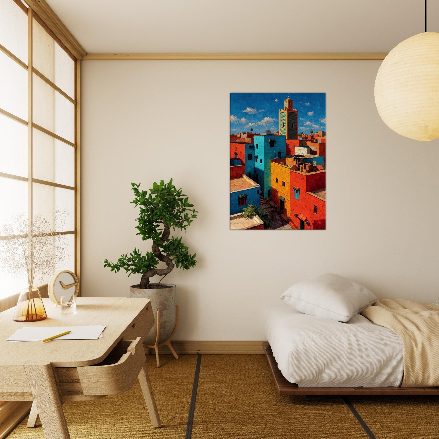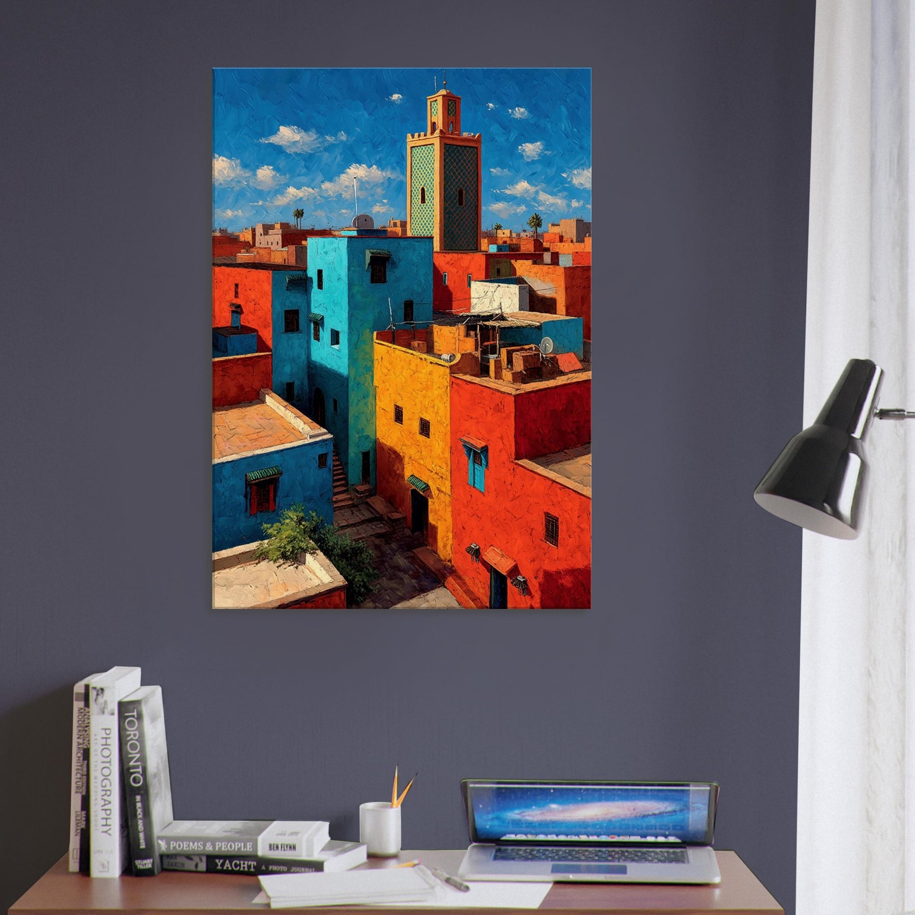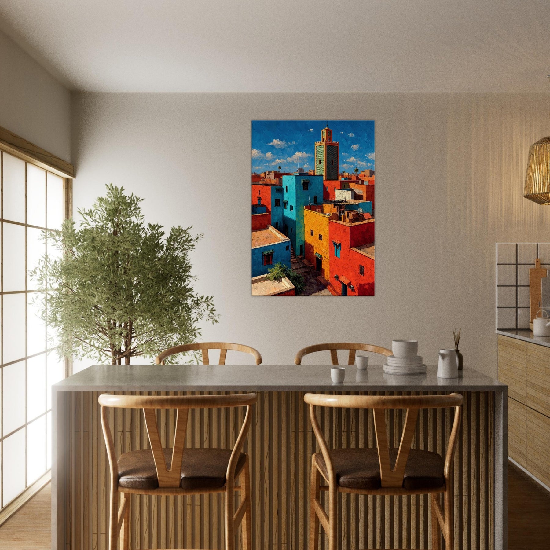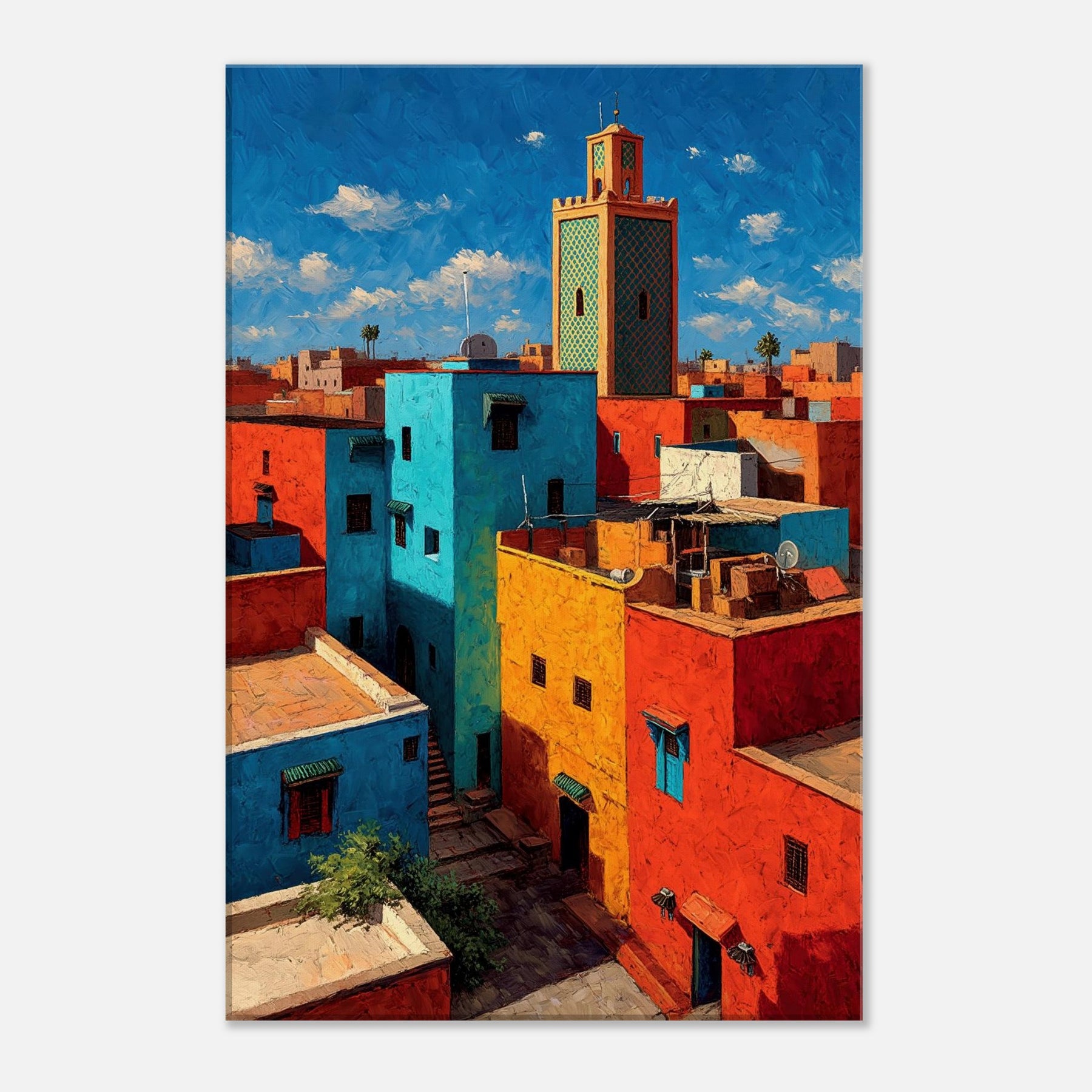 Let Marrakech unfold across your wall in bold, sunlit strokes. This abstract cityscape breathes with citrus yellows, turquoise courtyards, and coral rooftops that catch the light and never let it go. The piece invites the eye to wander between narrow alleys and open horizons, turning a living room into a sanctuary of warmth and rhythm. Hang it where conversation glows and everyday moments feel like a stroll through a vibrant medina.