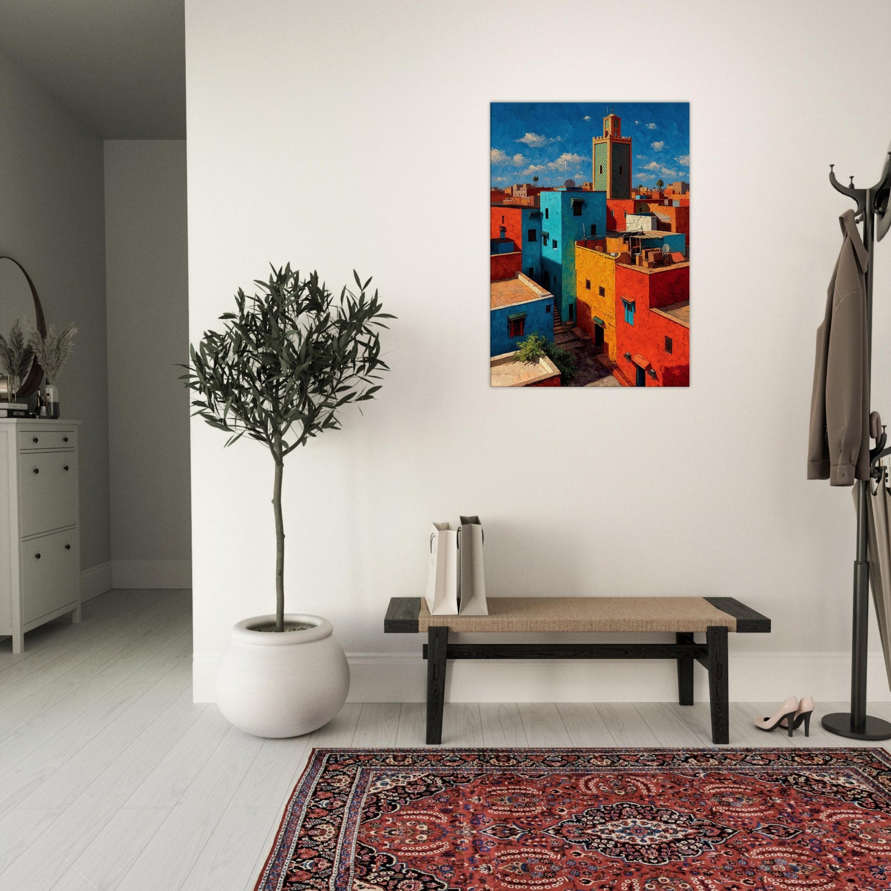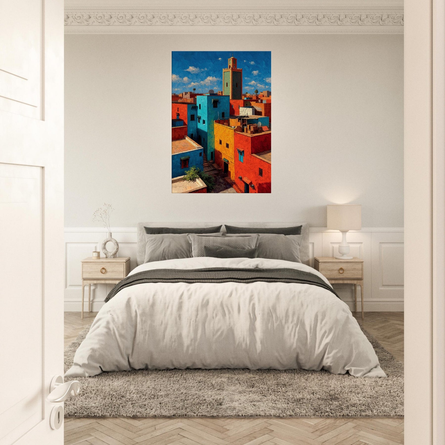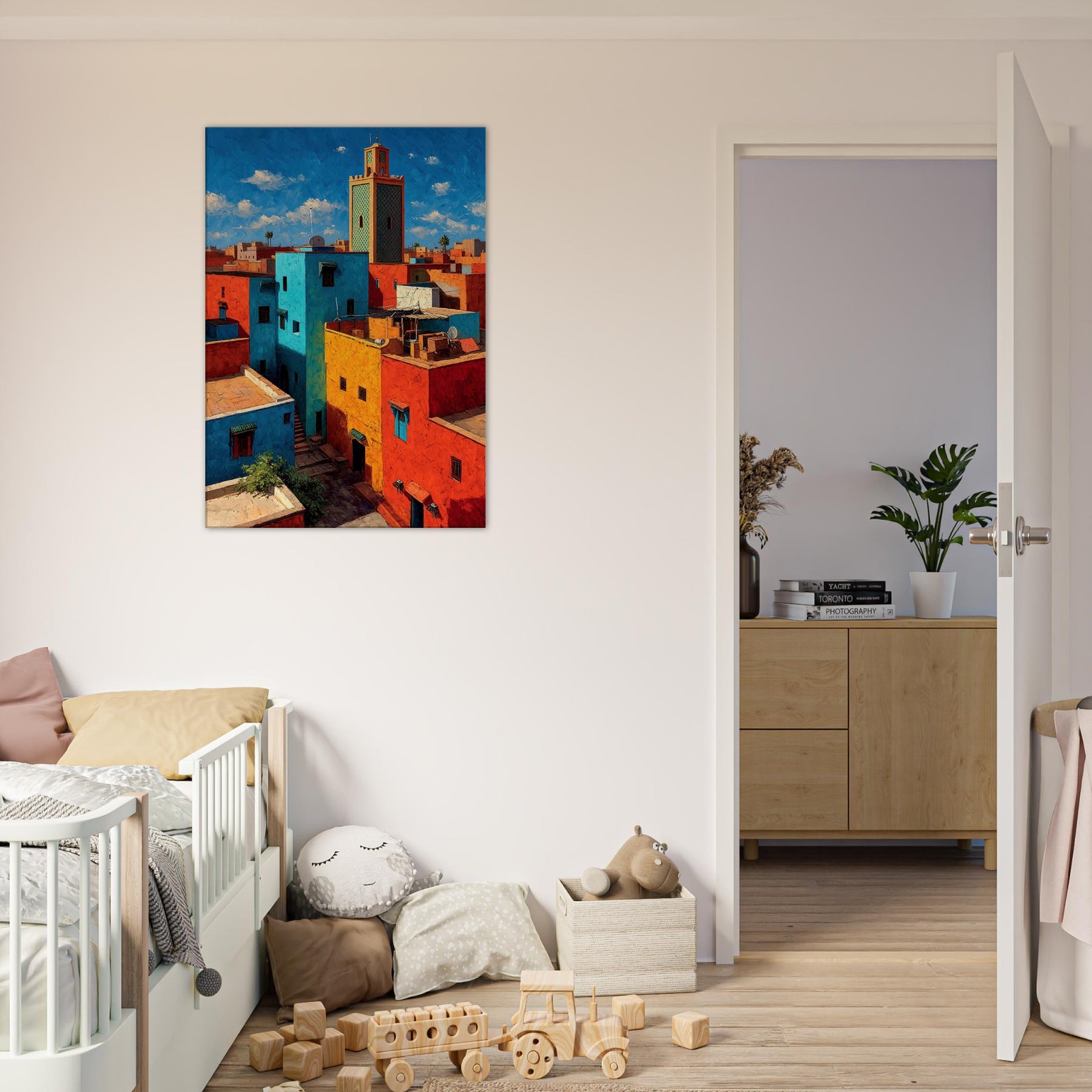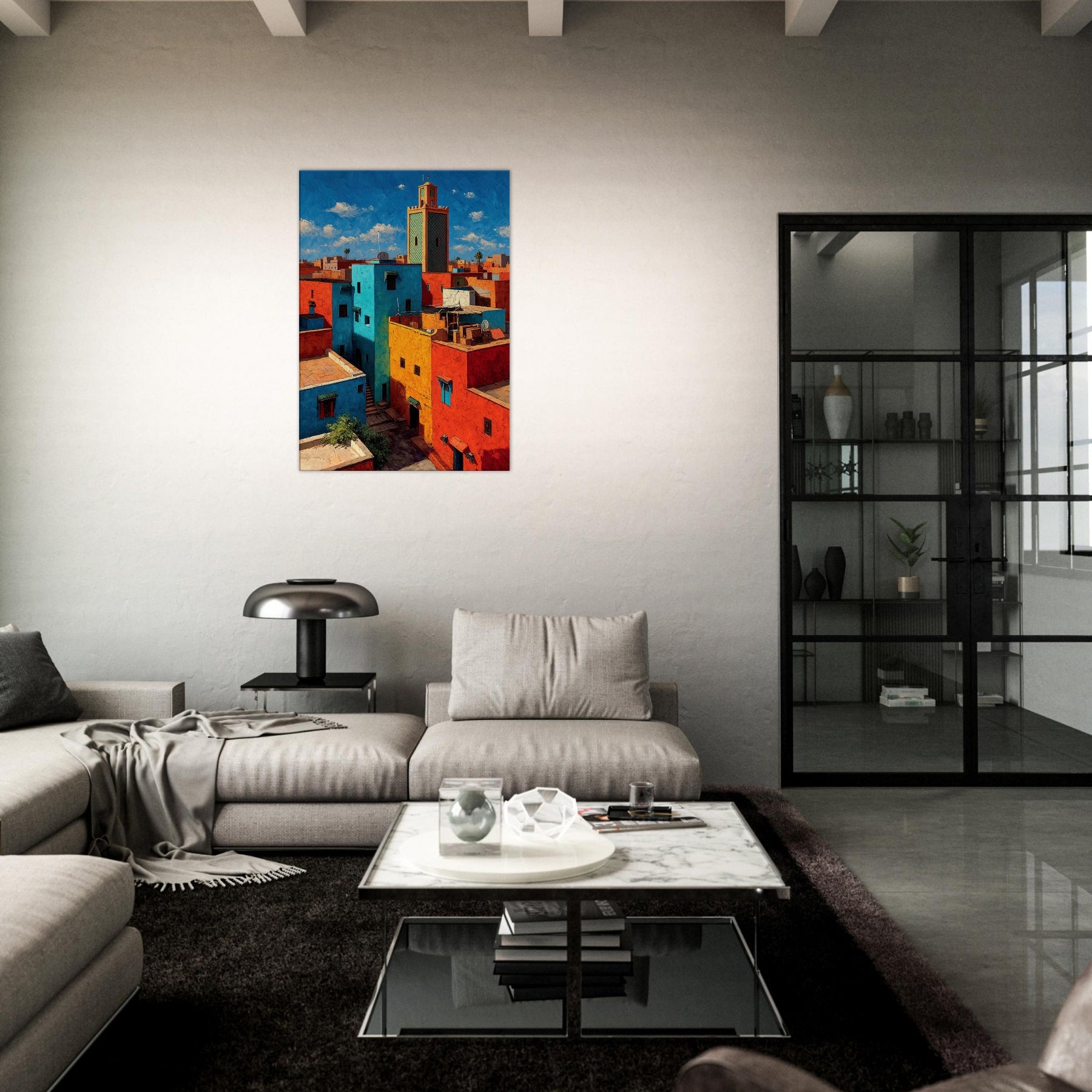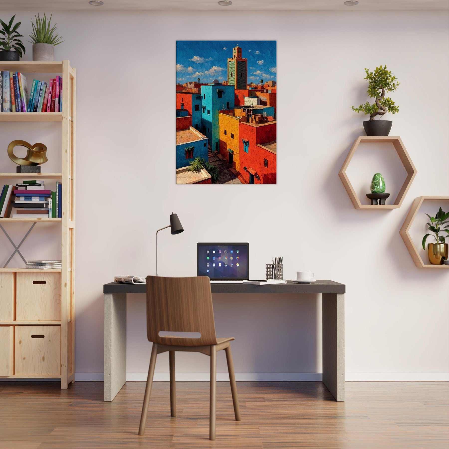 Let Marrakech unfold across your wall in bold, sunlit strokes. This abstract cityscape breathes with citrus yellows, turquoise courtyards, and coral rooftops that catch the light and never let it go. The piece invites the eye to wander between narrow alleys and open horizons, turning a living room into a sanctuary of warmth and rhythm. Hang it where conversation glows and everyday moments feel like a stroll through a vibrant medina.
