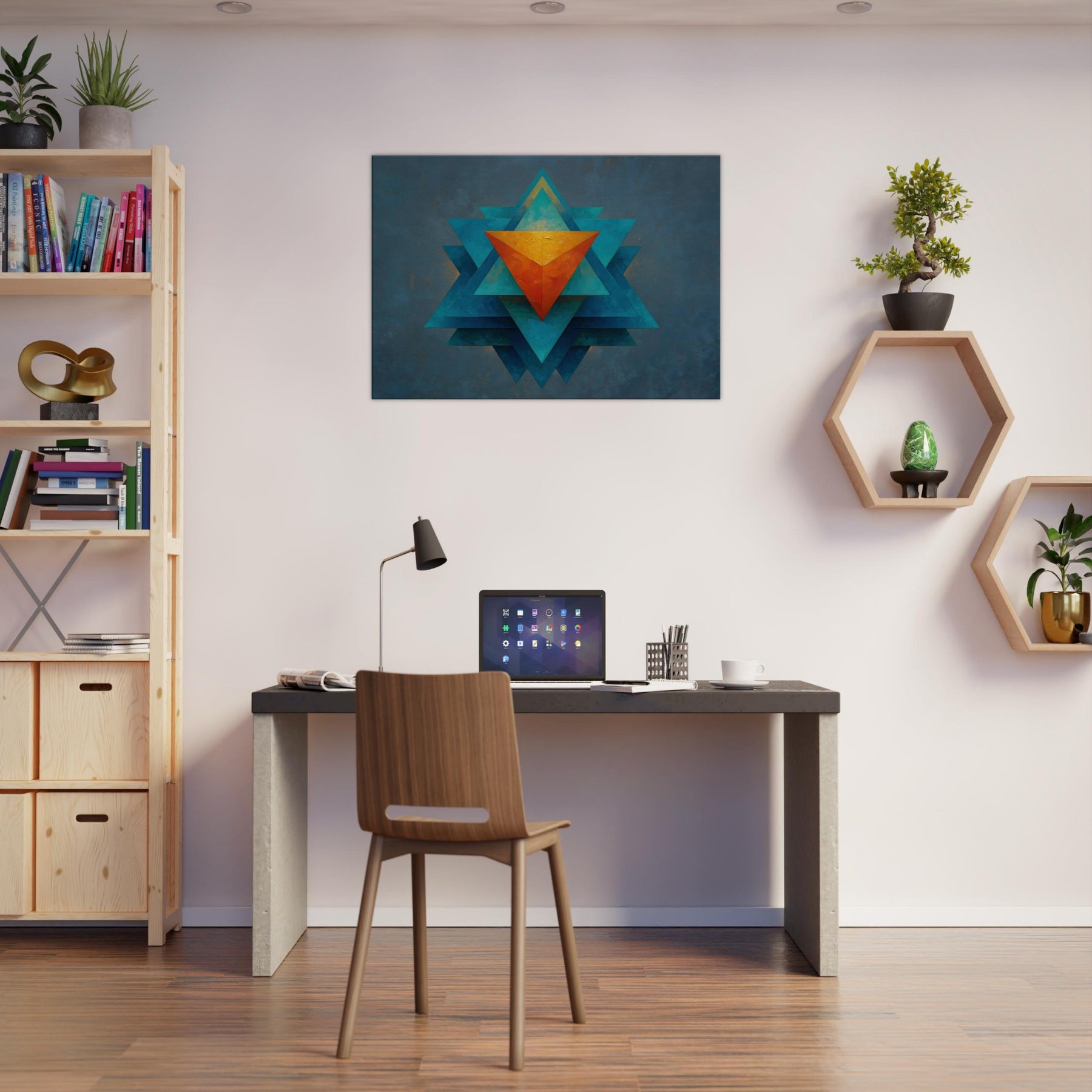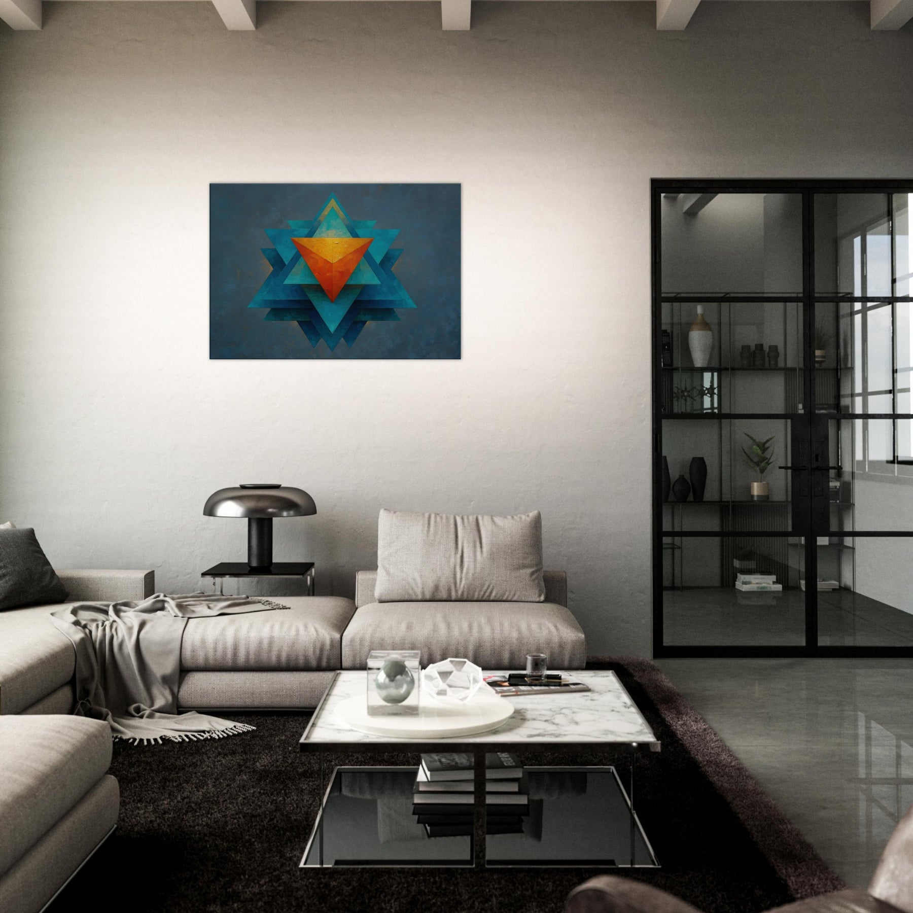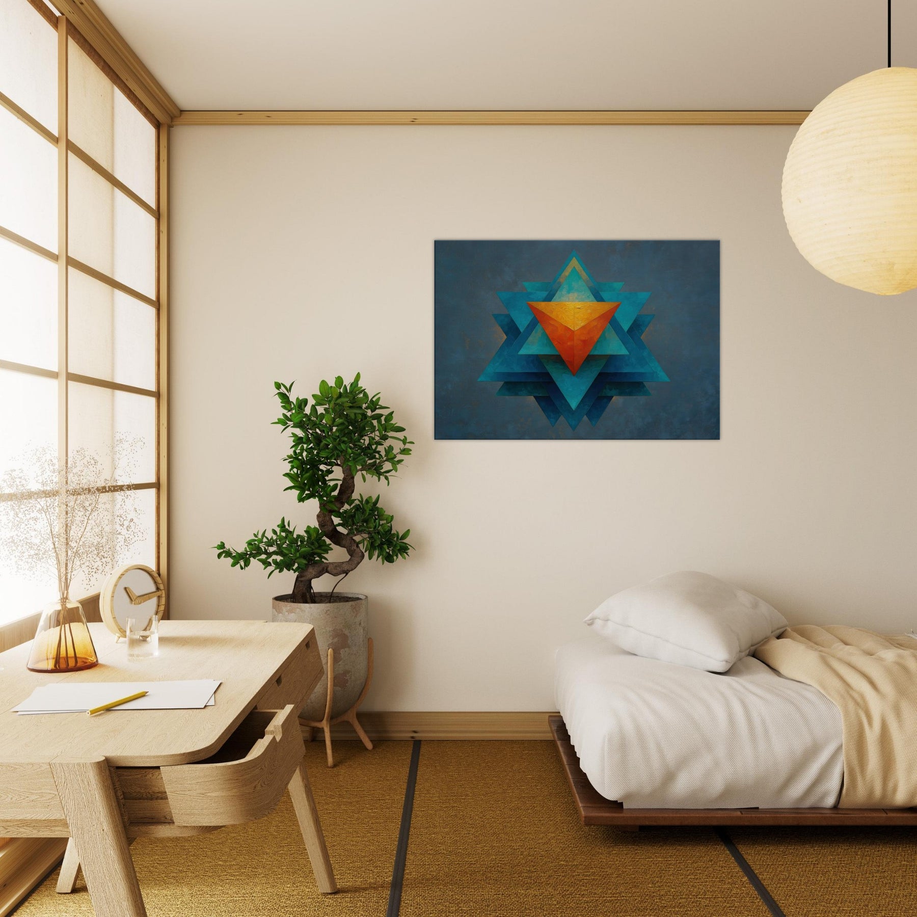 Merkaba is the guiding light at the center of this abstract composition, where a vibrant orange inverted triangle hovers like a dawn lit emblem. Surrounding it, jewel toned blue facets unfold in a star tetrahedron rhythm, producing a sense of depth that breathes with each glance. The textured surfaces catch light and mood, inviting quiet contemplation and transforming a living room into a sanctuary. This piece pairs mysticism with contemporary form, offering a luminous focal point that elevates both minimalist and layered interiors. The central subject is Merkaba (Star Tetrahedron).