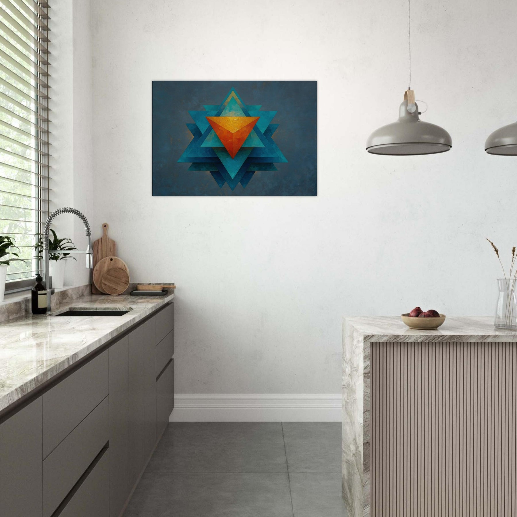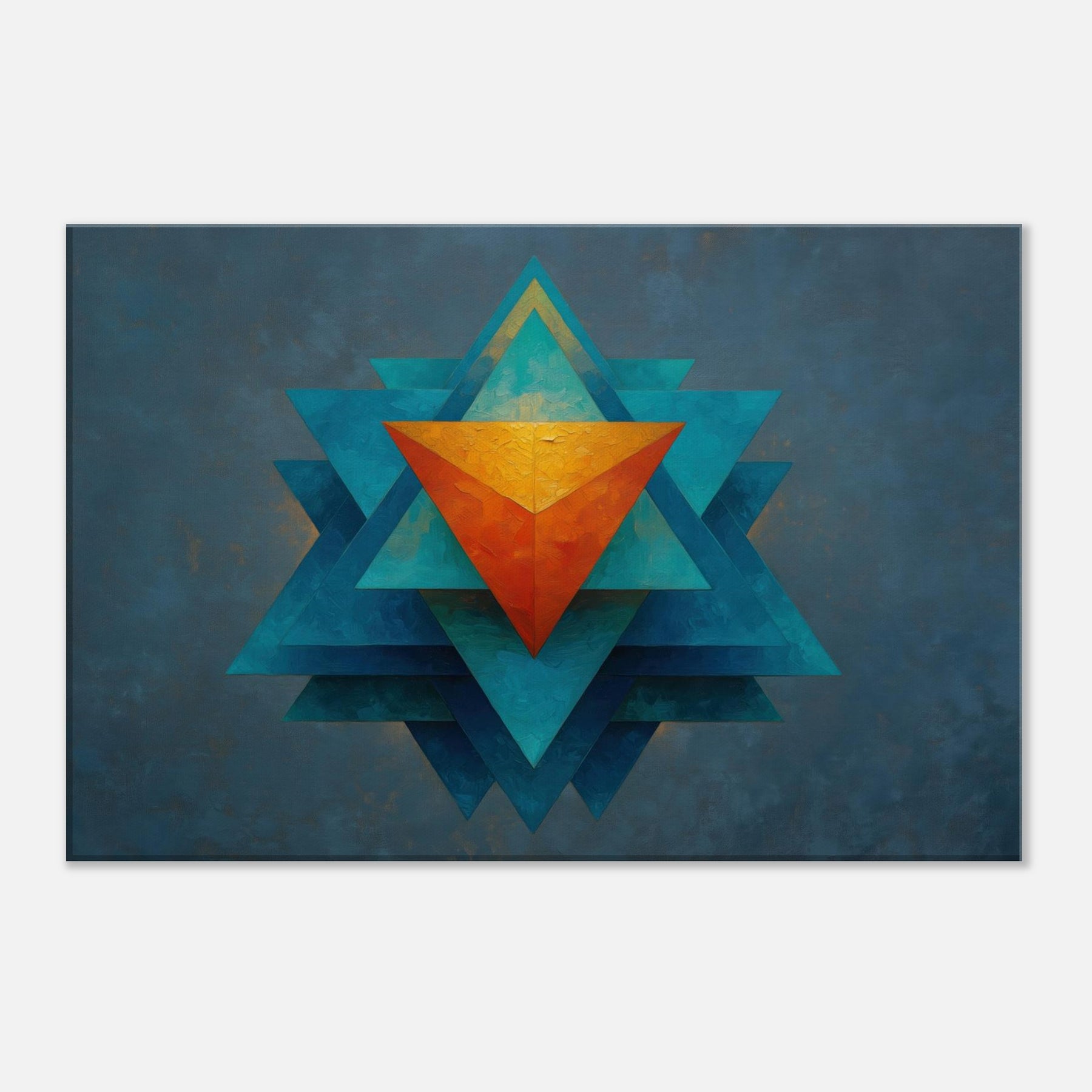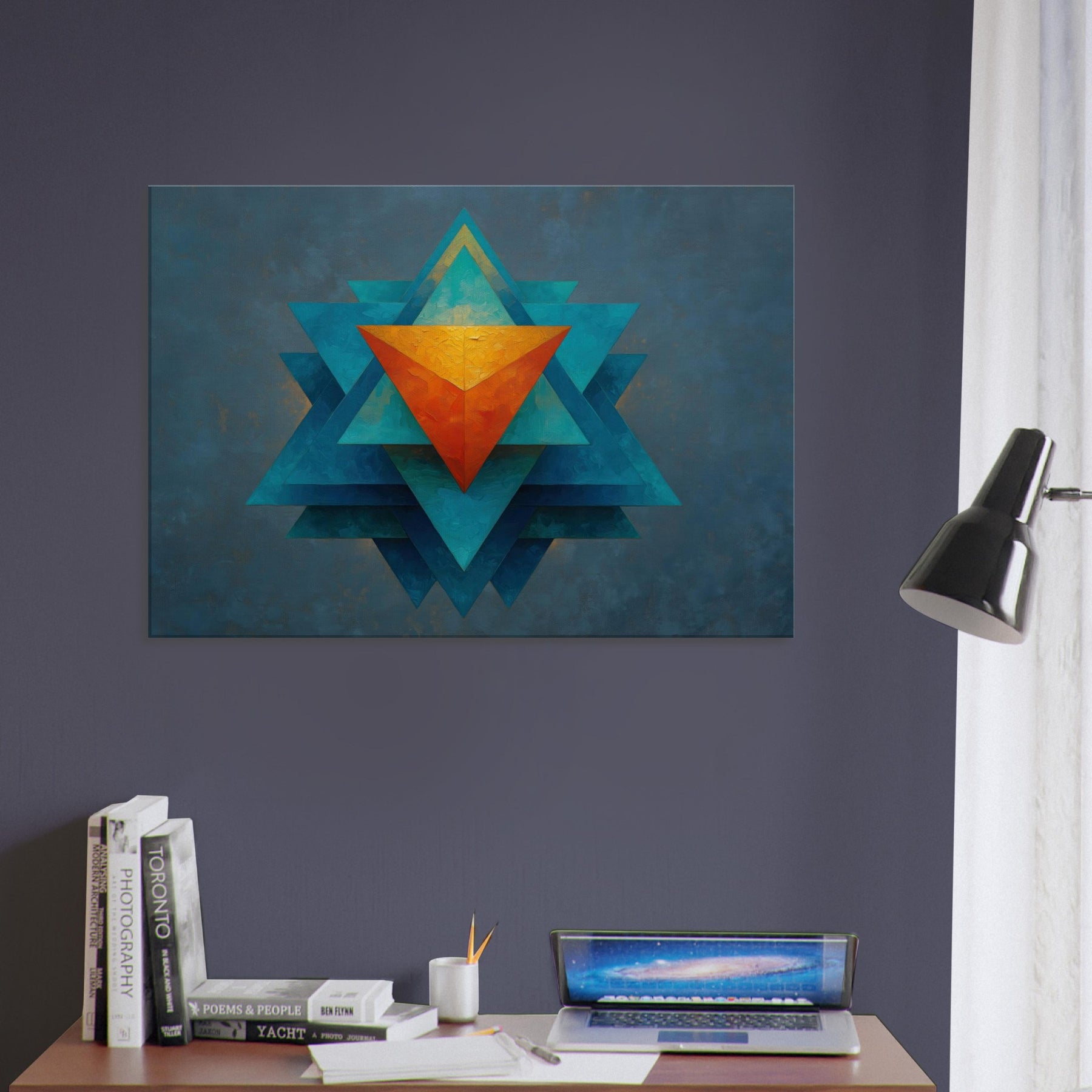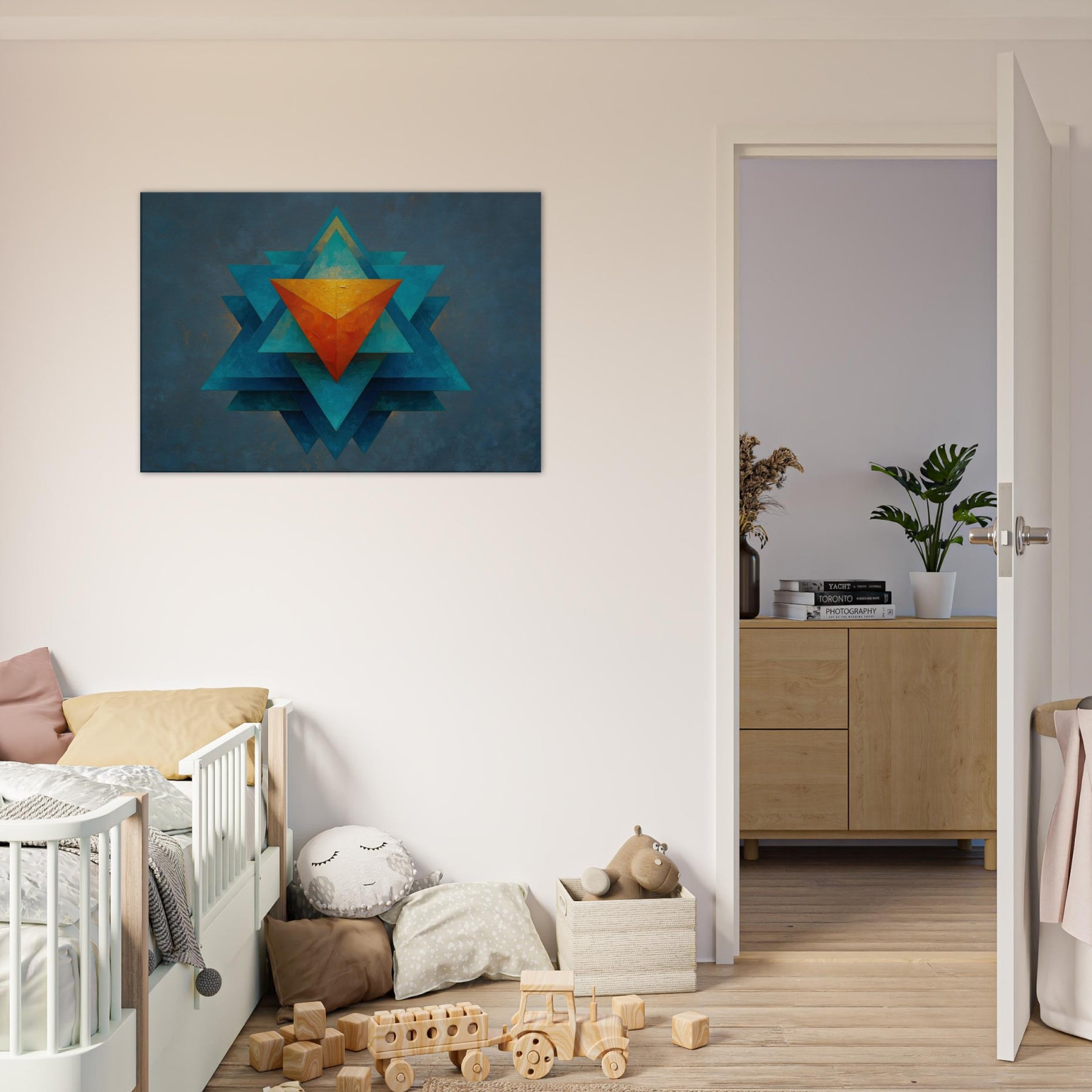 Merkaba is the guiding light at the center of this abstract composition, where a vibrant orange inverted triangle hovers like a dawn lit emblem. Surrounding it, jewel toned blue facets unfold in a star tetrahedron rhythm, producing a sense of depth that breathes with each glance. The textured surfaces catch light and mood, inviting quiet contemplation and transforming a living room into a sanctuary. This piece pairs mysticism with contemporary form, offering a luminous focal point that elevates both minimalist and layered interiors. The central subject is Merkaba (Star Tetrahedron).