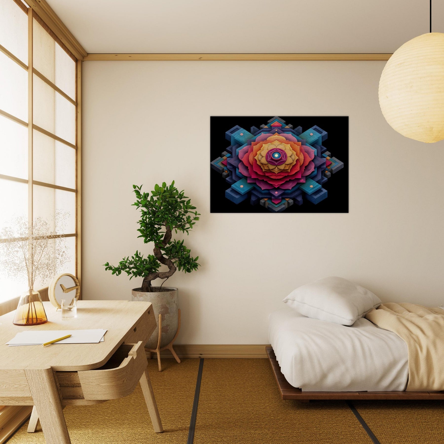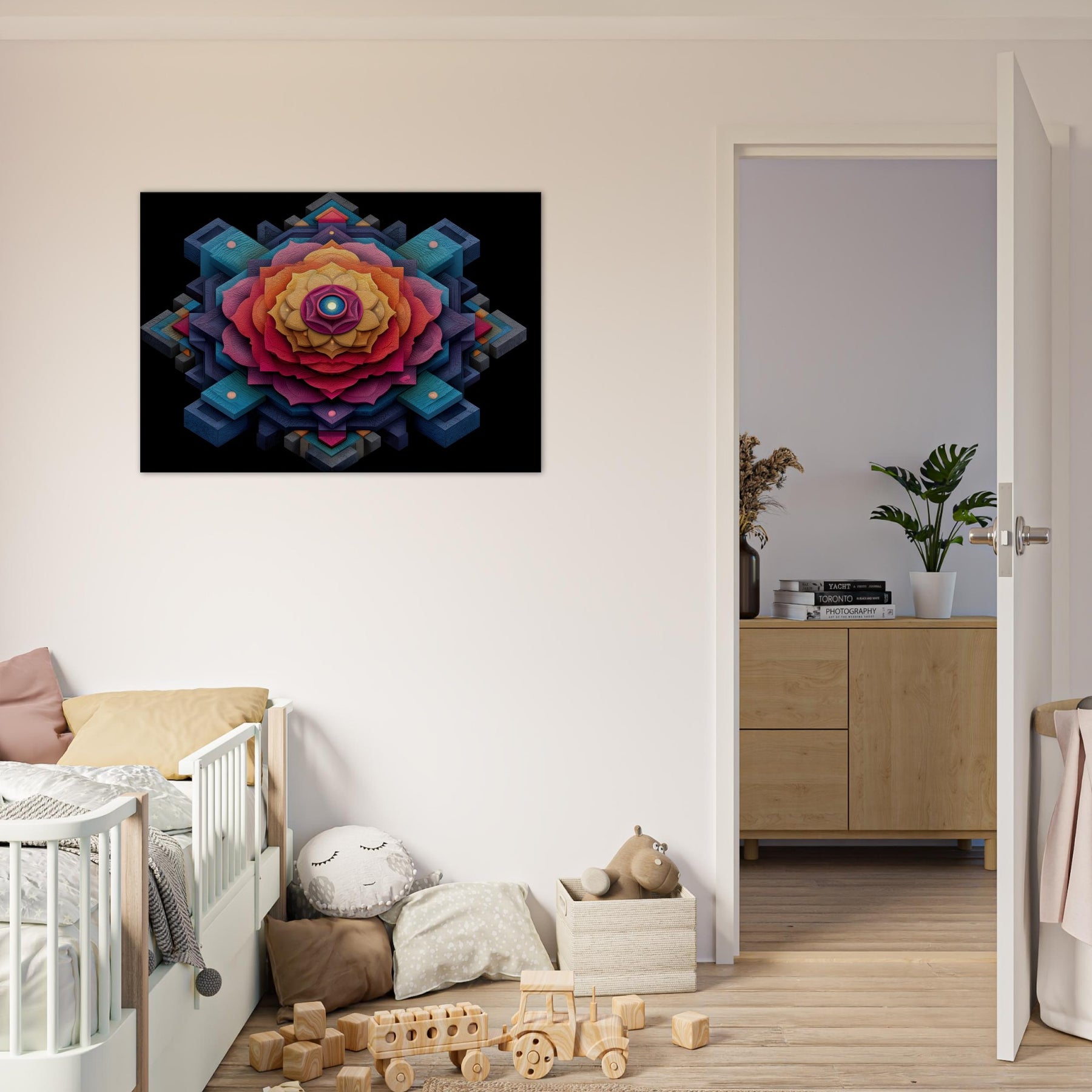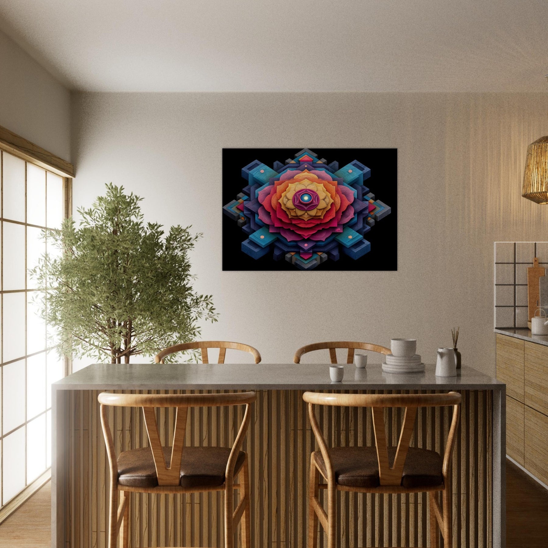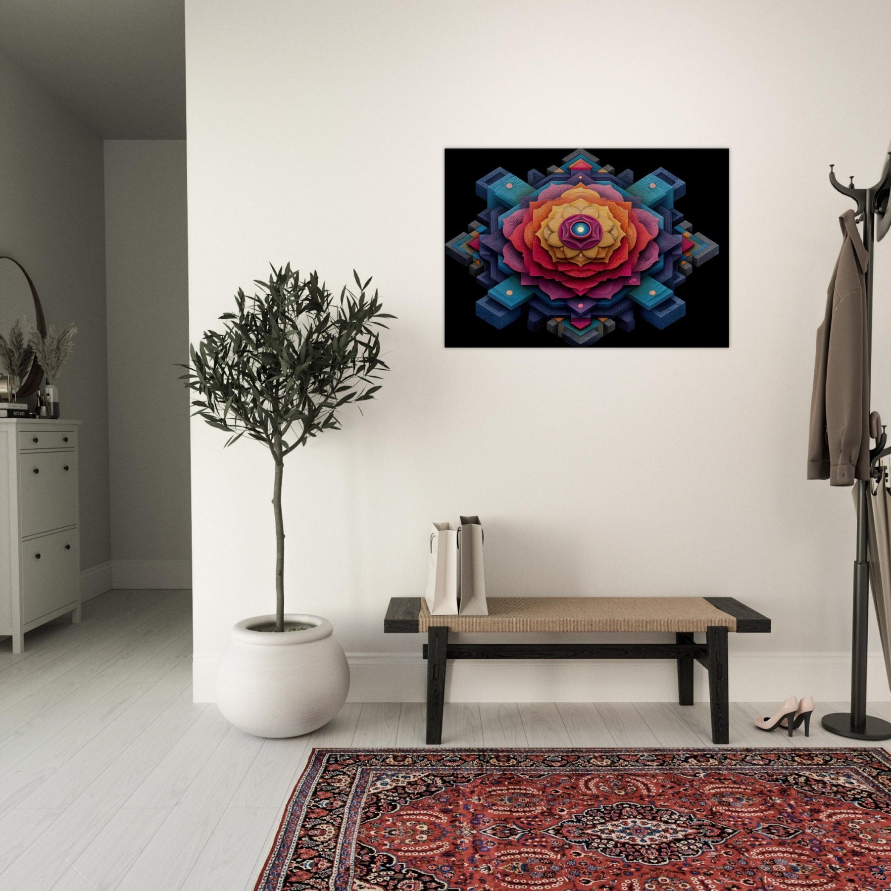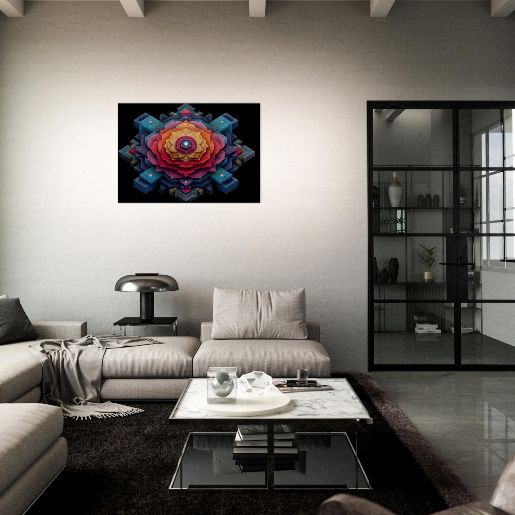 Immerse your space in the geometry of Metatron’S Cube, reimagined as a luminous mandala of color and shadow. This abstract composition layers petals and stepped blocks into a radiant bloom, inviting calm, focus, and wonder. The piece glows against a deep backdrop, transforming a living room with a sense of balance and mystery, while the tactile textures evoke warmth under lamp light. Perfect for meditative corners or statement walls, it invites slow contemplation and inspired conversations.