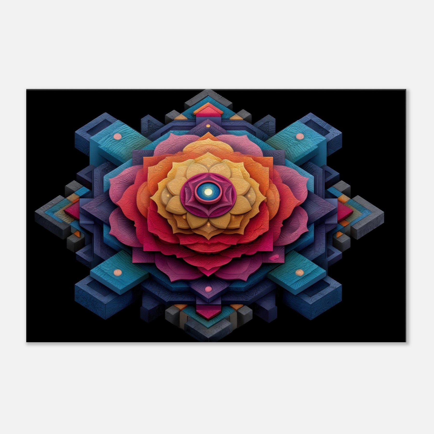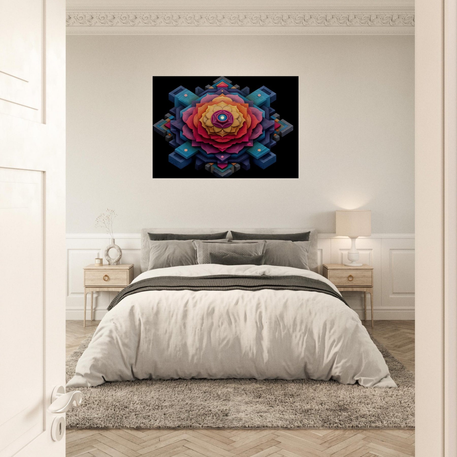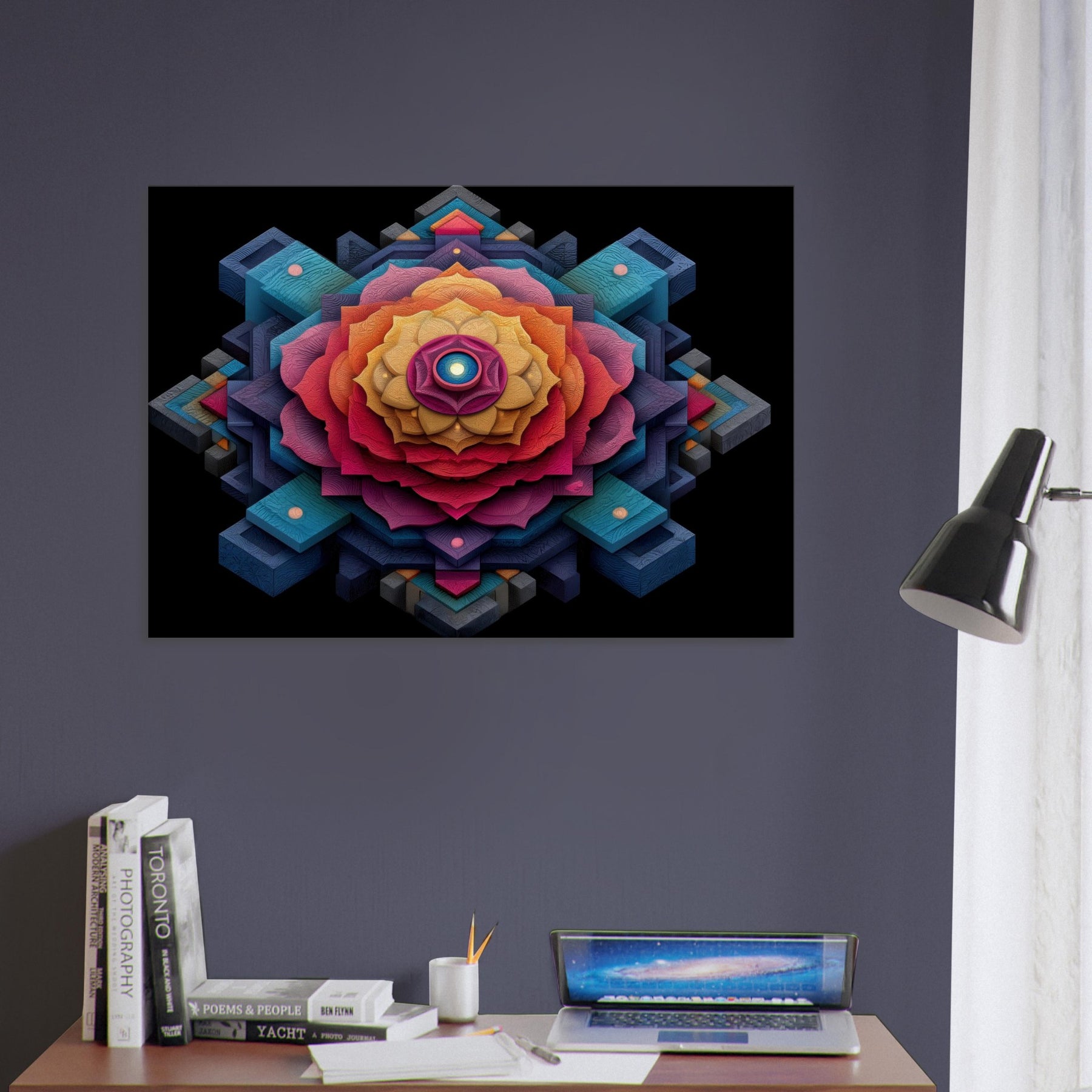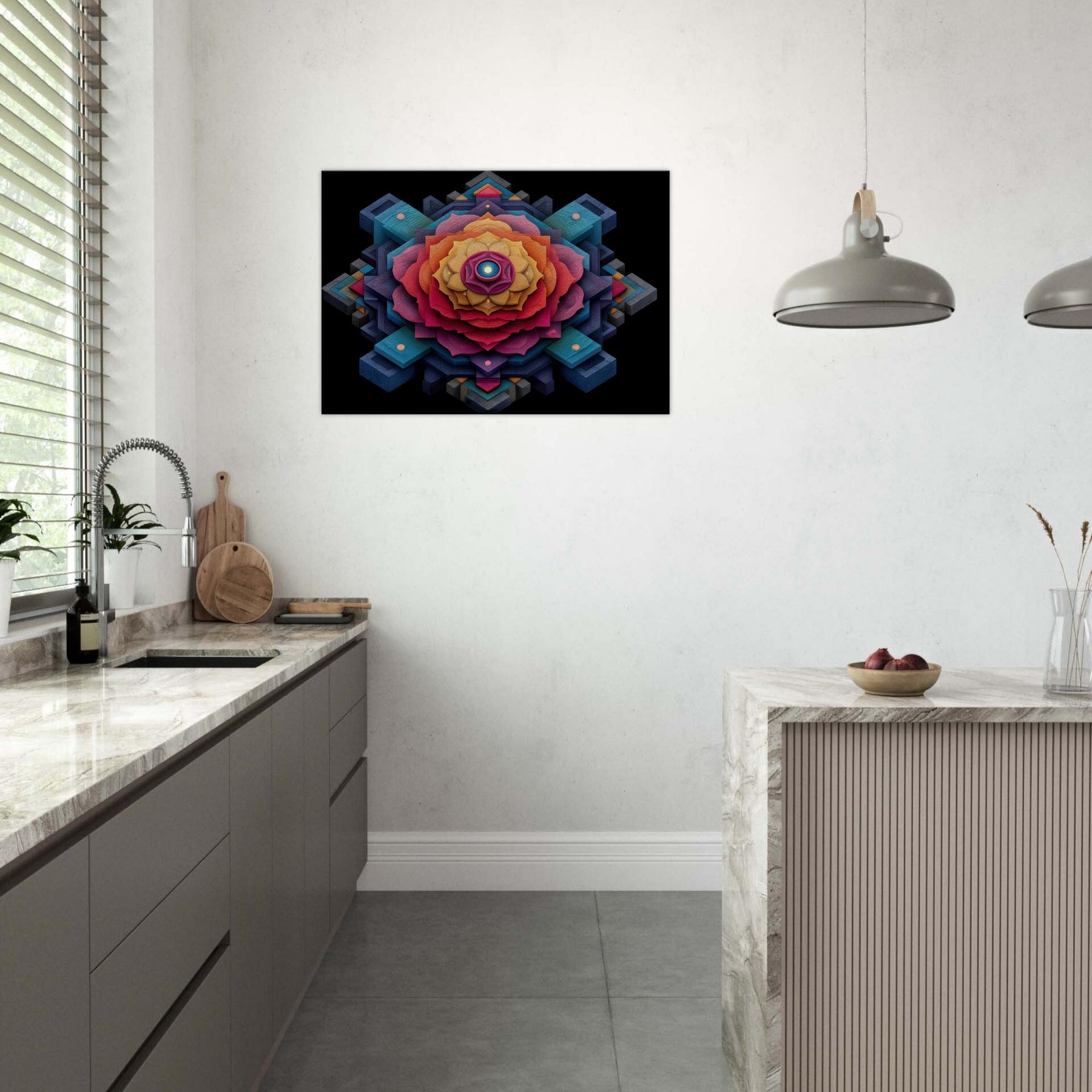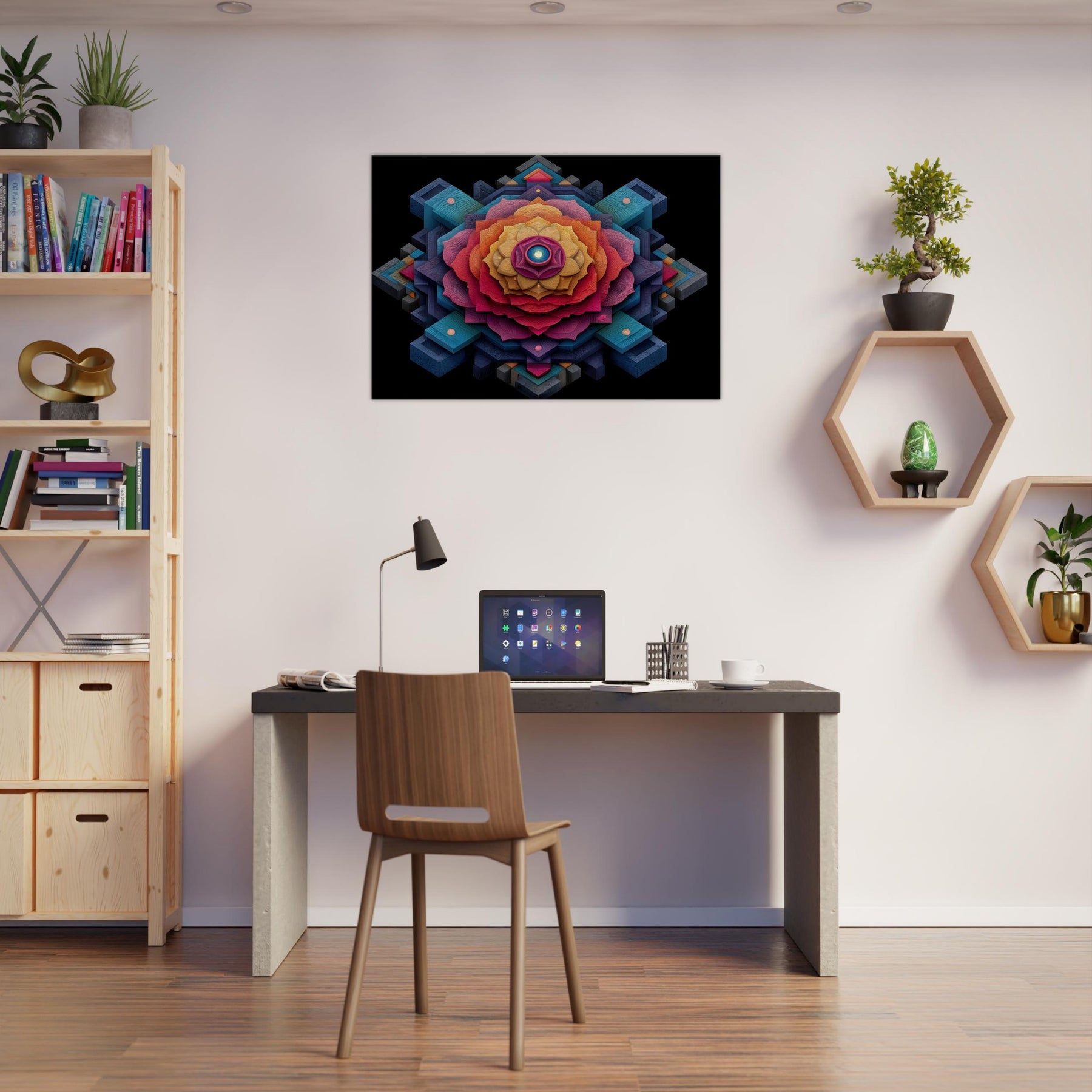Immerse your space in the geometry of Metatron’S Cube, reimagined as a luminous mandala of color and shadow. This abstract composition layers petals and stepped blocks into a radiant bloom, inviting calm, focus, and wonder. The piece glows against a deep backdrop, transforming a living room with a sense of balance and mystery, while the tactile textures evoke warmth under lamp light. Perfect for meditative corners or statement walls, it invites slow contemplation and inspired conversations.