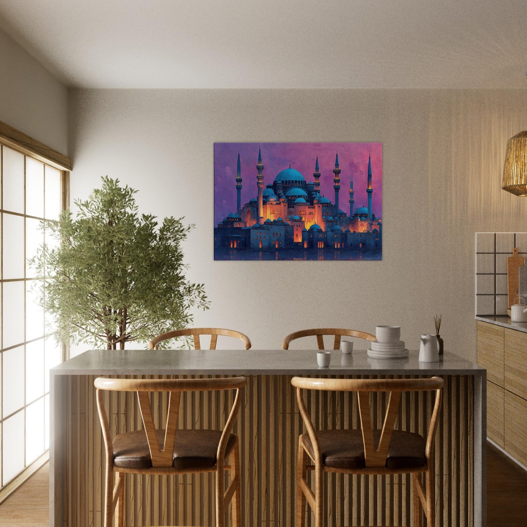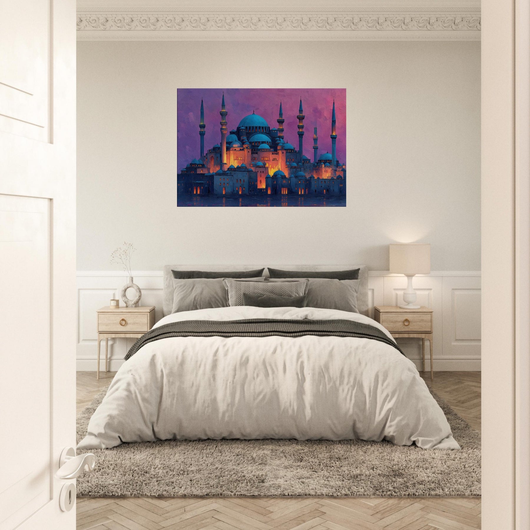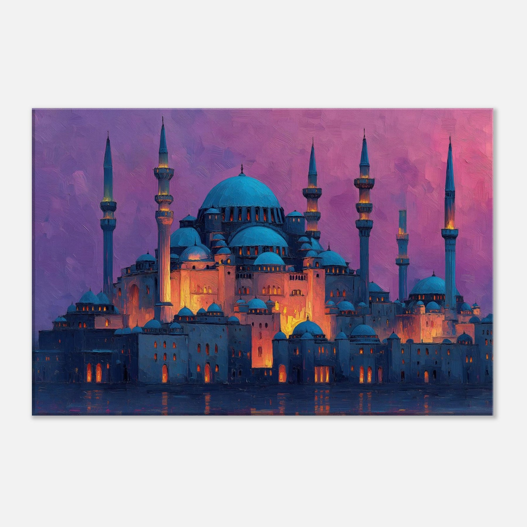Like a dawn lit skyline floating on velvet water, this Mosque gathers light in its domes and minarets. Abstract strokes ripple across warm amber highlights and cool blue shadows, turning architecture into a breathing sanctuary. The atmosphere feels hushed, ceremonial, and intimate as if you can hear distant bells, prayers, and rain. It elevates any living space with a sense of quiet grandeur, inviting reflection and conversation. Perfect for a living room or entry where artistry meets memory.