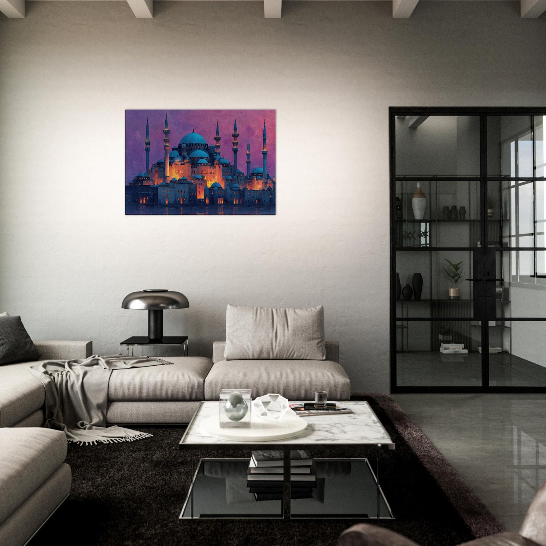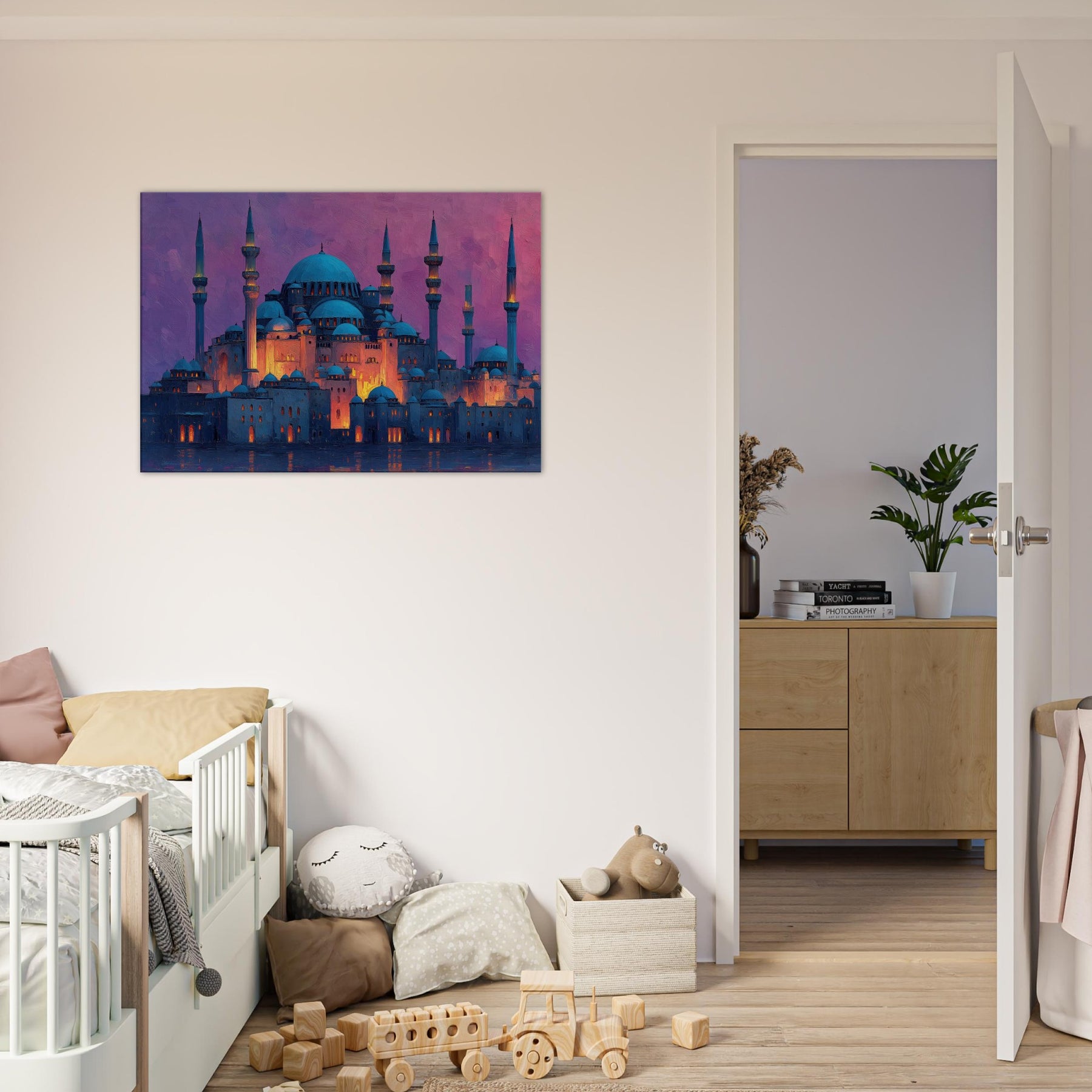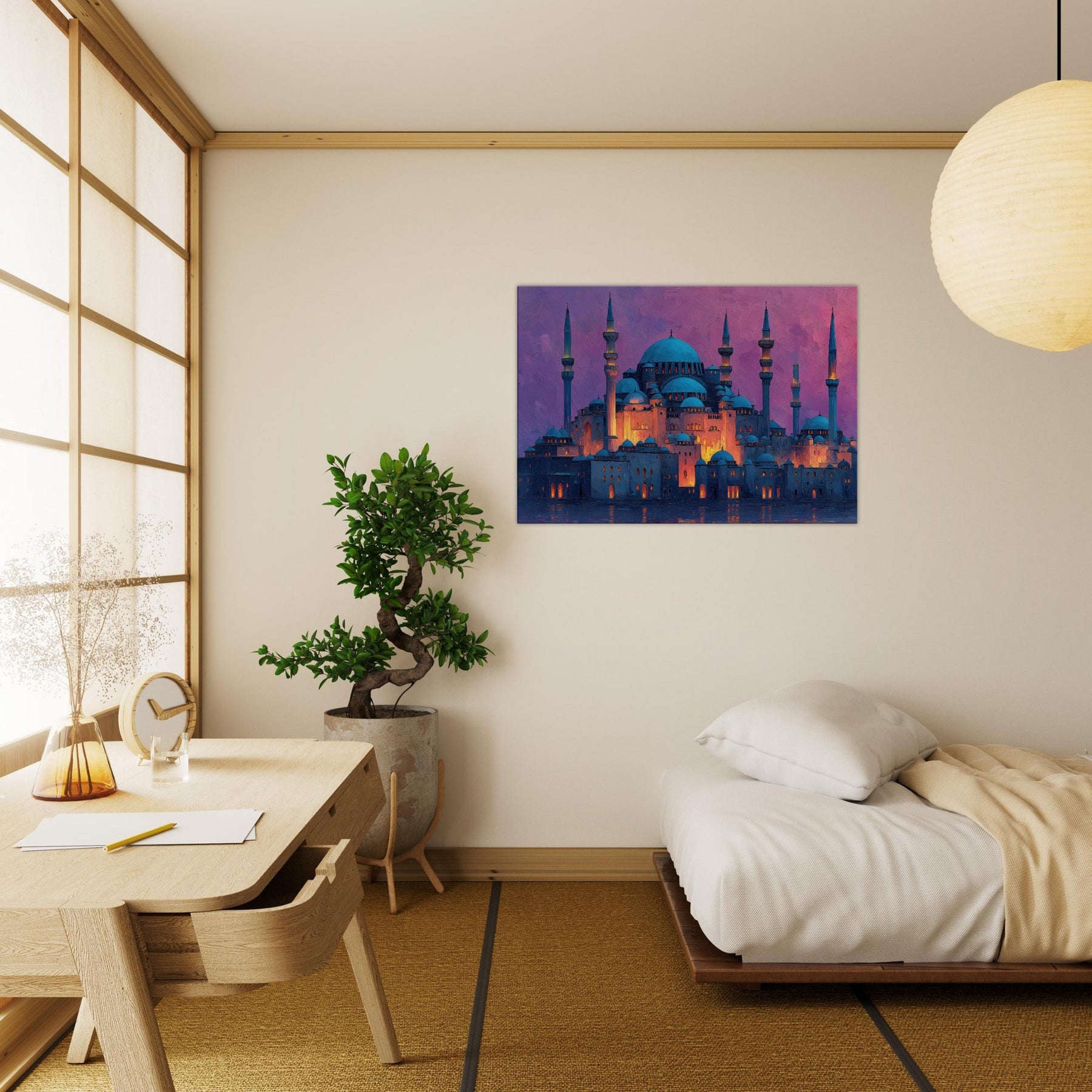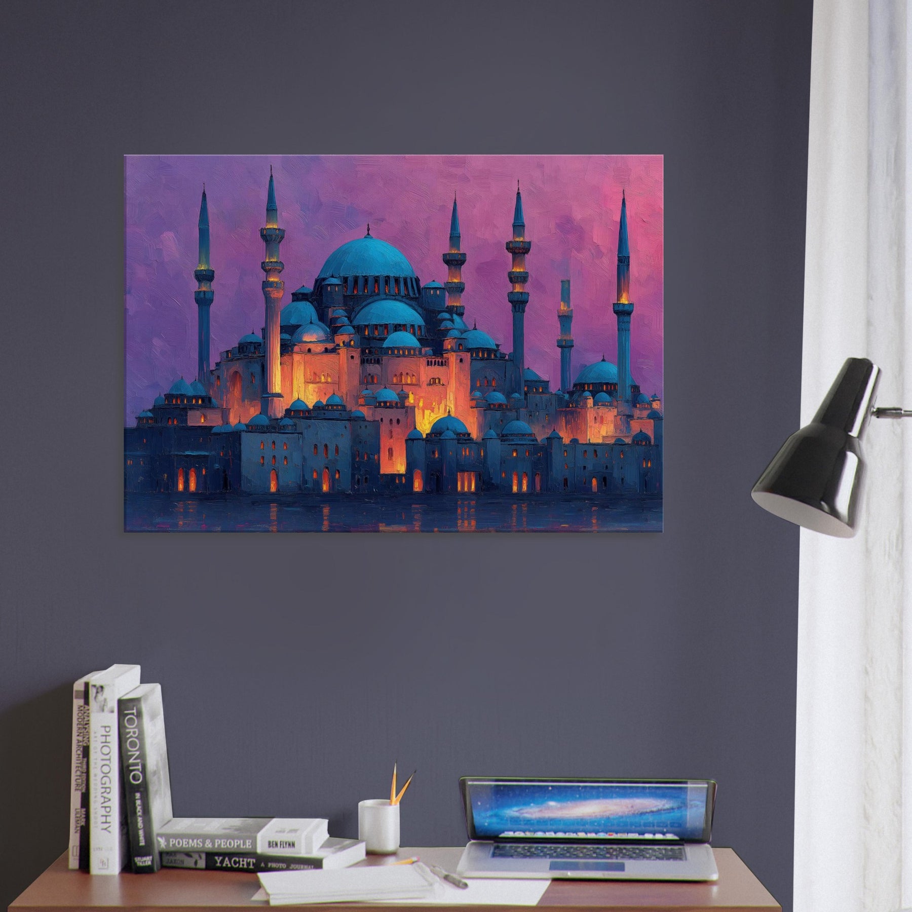 Like a dawn lit skyline floating on velvet water, this Mosque gathers light in its domes and minarets. Abstract strokes ripple across warm amber highlights and cool blue shadows, turning architecture into a breathing sanctuary. The atmosphere feels hushed, ceremonial, and intimate as if you can hear distant bells, prayers, and rain. It elevates any living space with a sense of quiet grandeur, inviting reflection and conversation. Perfect for a living room or entry where artistry meets memory.
