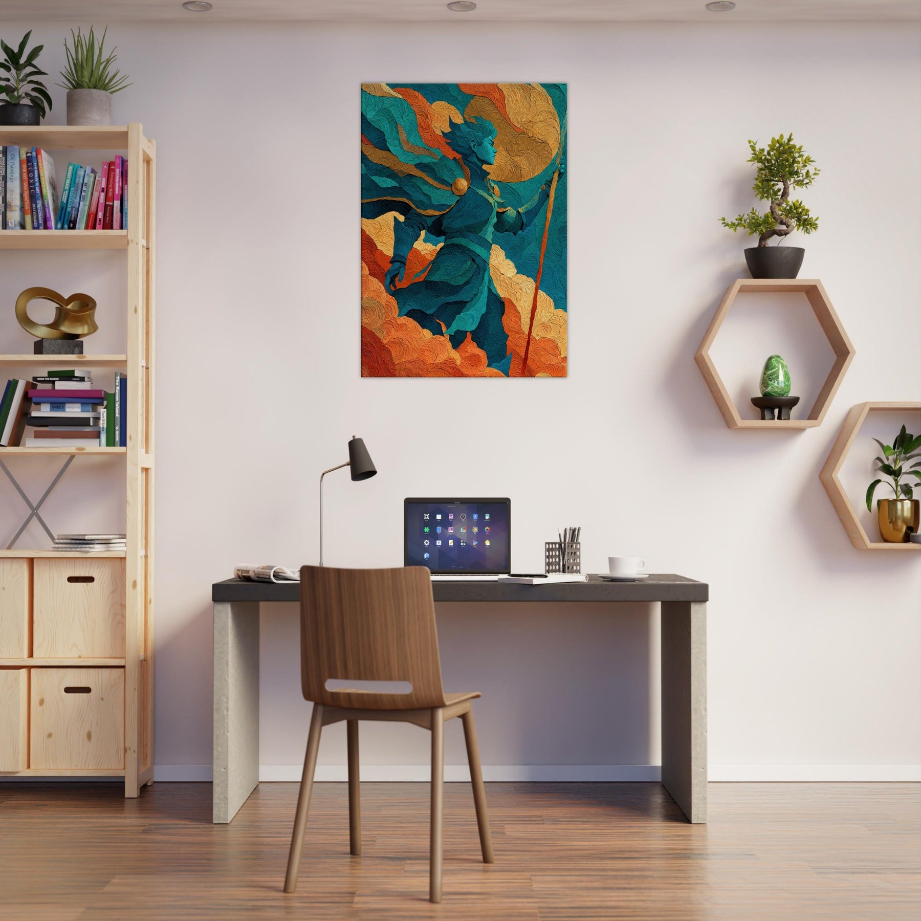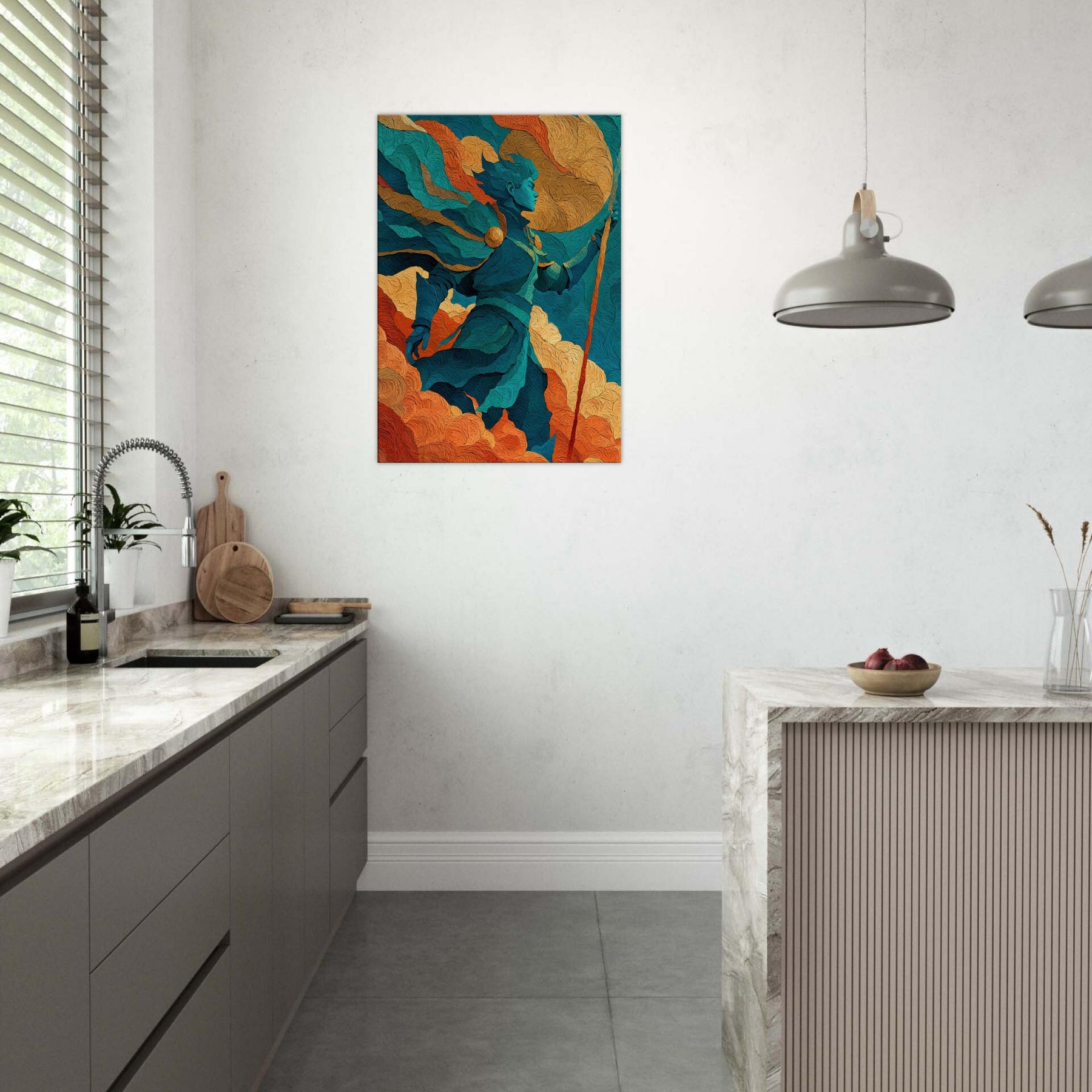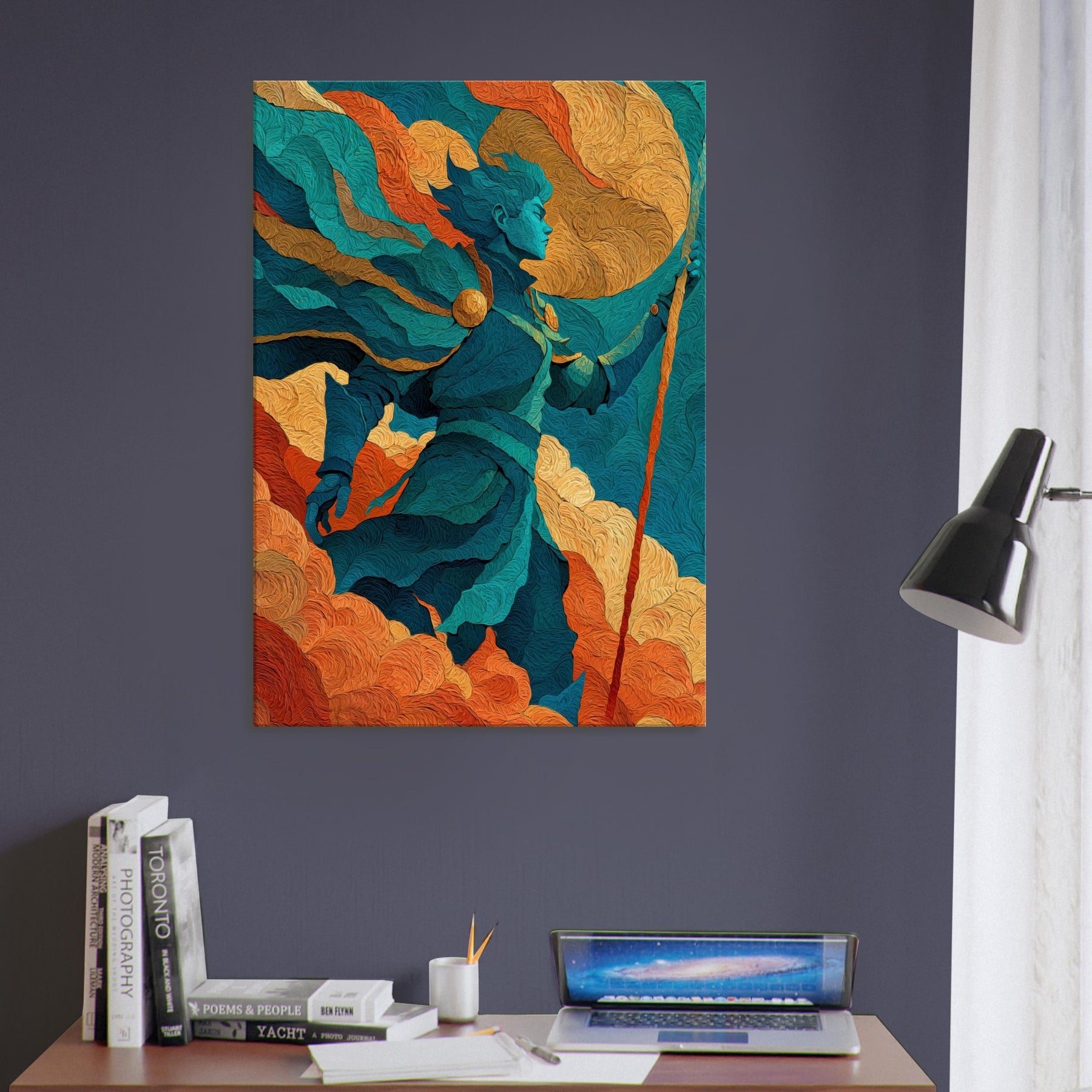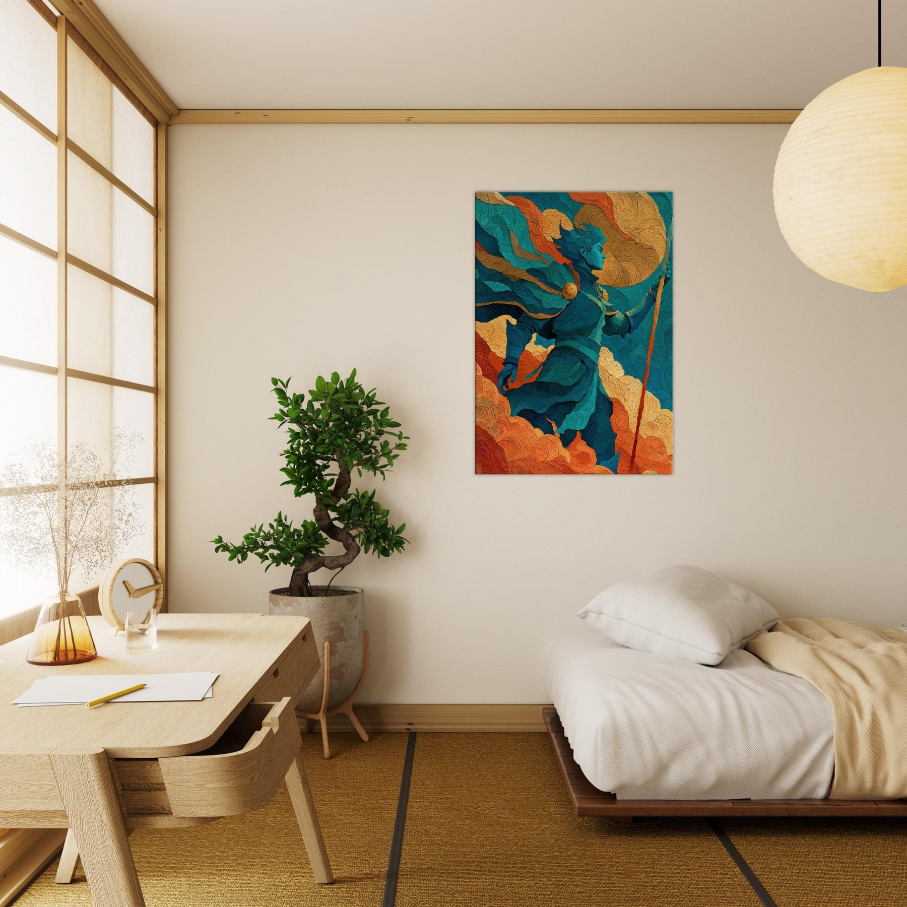 Immerse your space in a mythic breeze with this vivid portrayal of Wukong, the Monkey King Wielding His Golden Staff Above the Clouds. The abstract swirls of teal, orange, and cobalt create a kinetic hush, a living tapestry where courage, mystery, and dawn light converge. This piece elevates a room with cinematic energy, inviting contemplation and bold color shifts while remaining harmonious with modern decor. A centerpiece that sparks conversation and inspires daily wonder.
