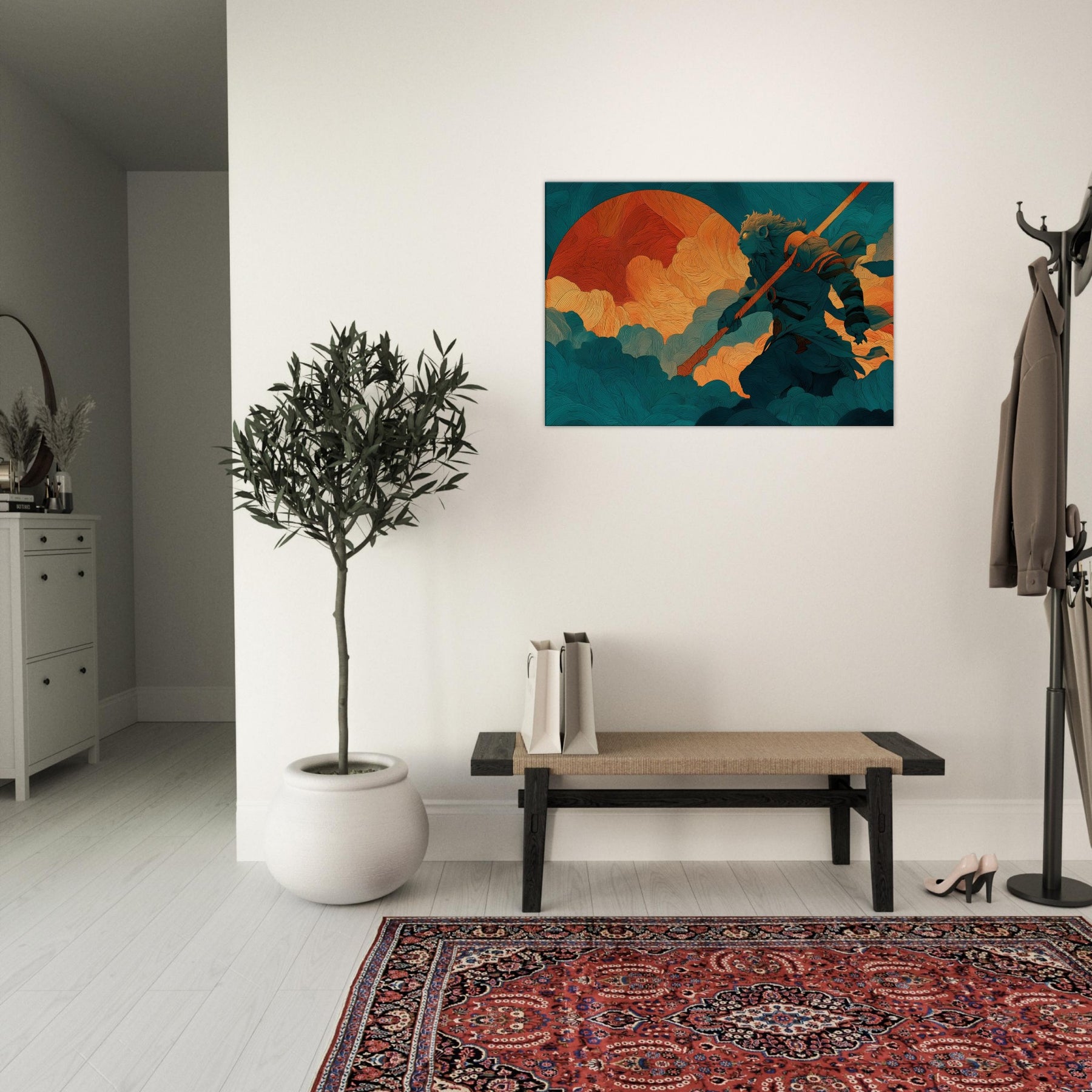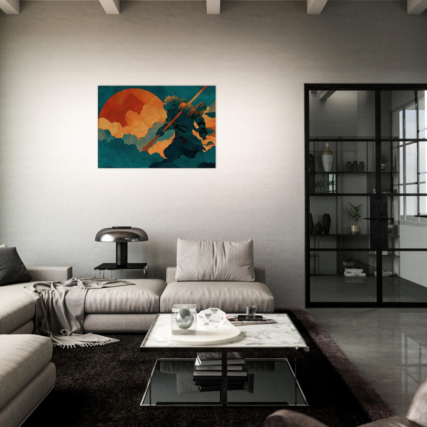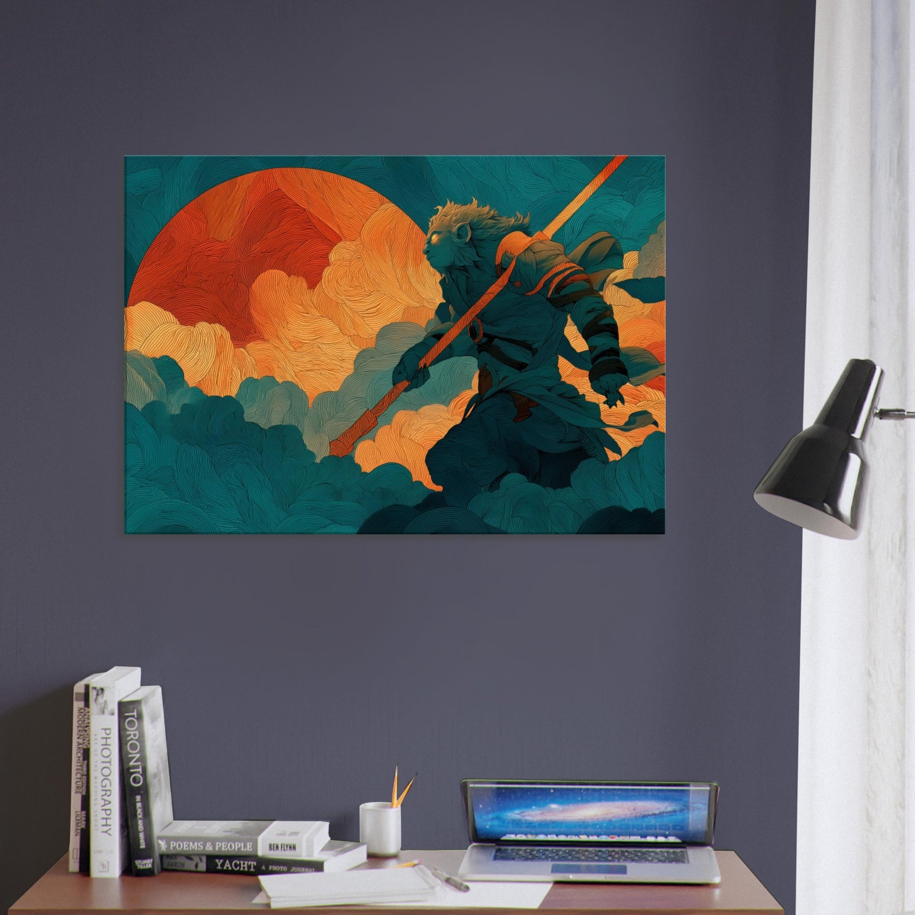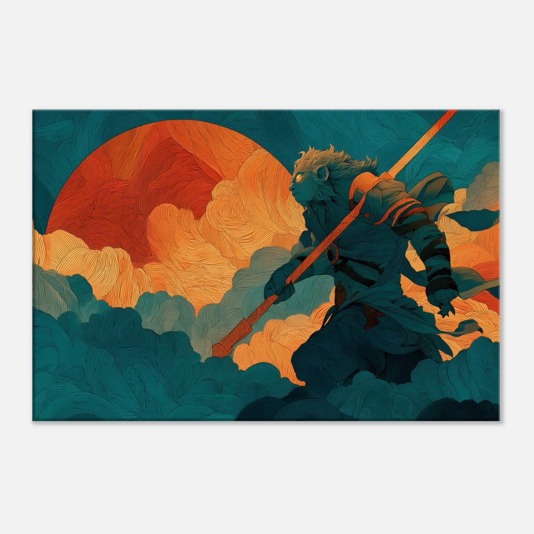 A bold homage to Wukong, the Monkey King Wielding His Golden Staff Above the Clouds, this piece swirls in teal and copper, turning momentum and myth into luminous forms. The atmosphere feels like sunrise on a churning sea of color, inviting calm focus or spirited conversation. Perfect for living rooms, studies, or entryways, it lends a kinetic, dreamlike energy that elevates every moment spent beneath it.