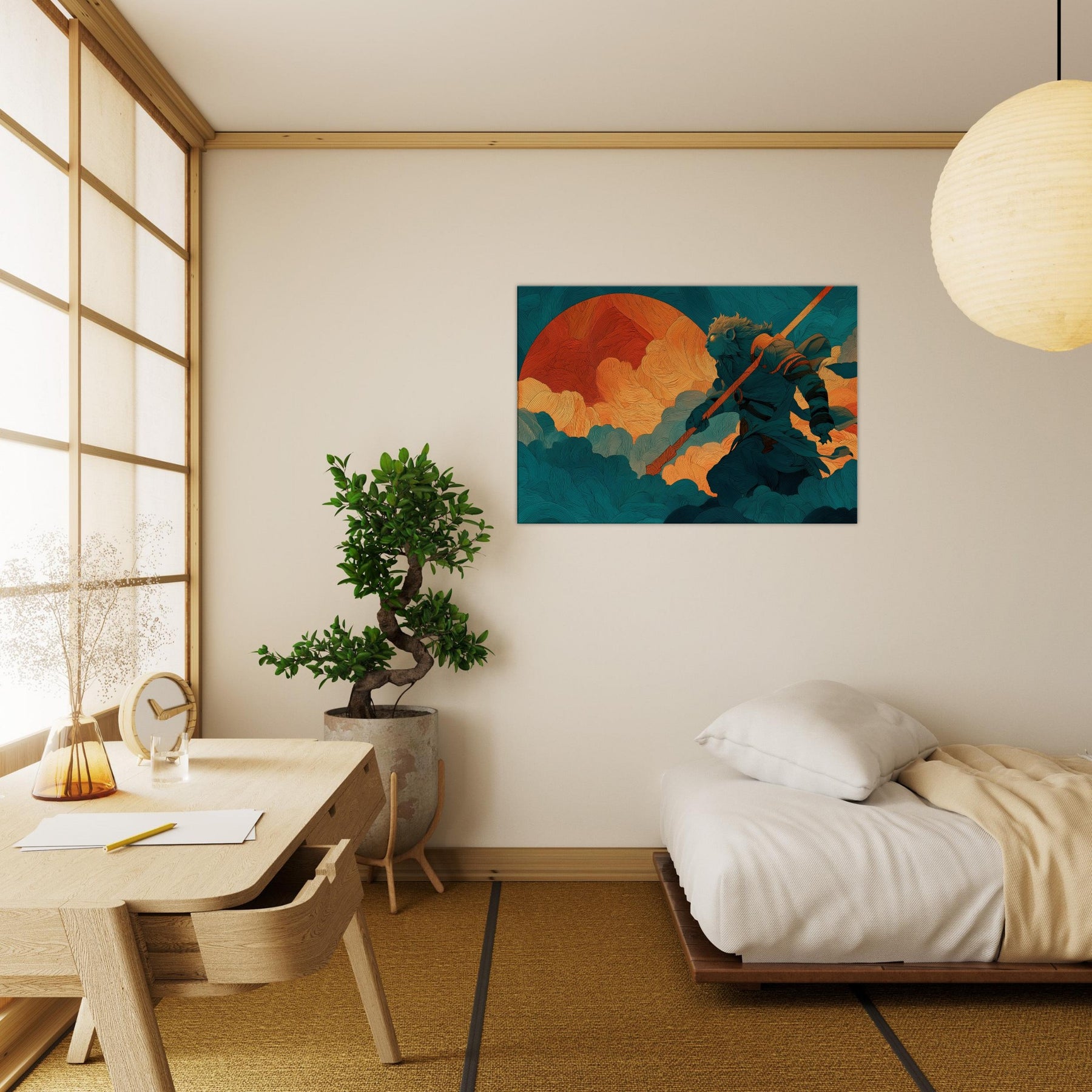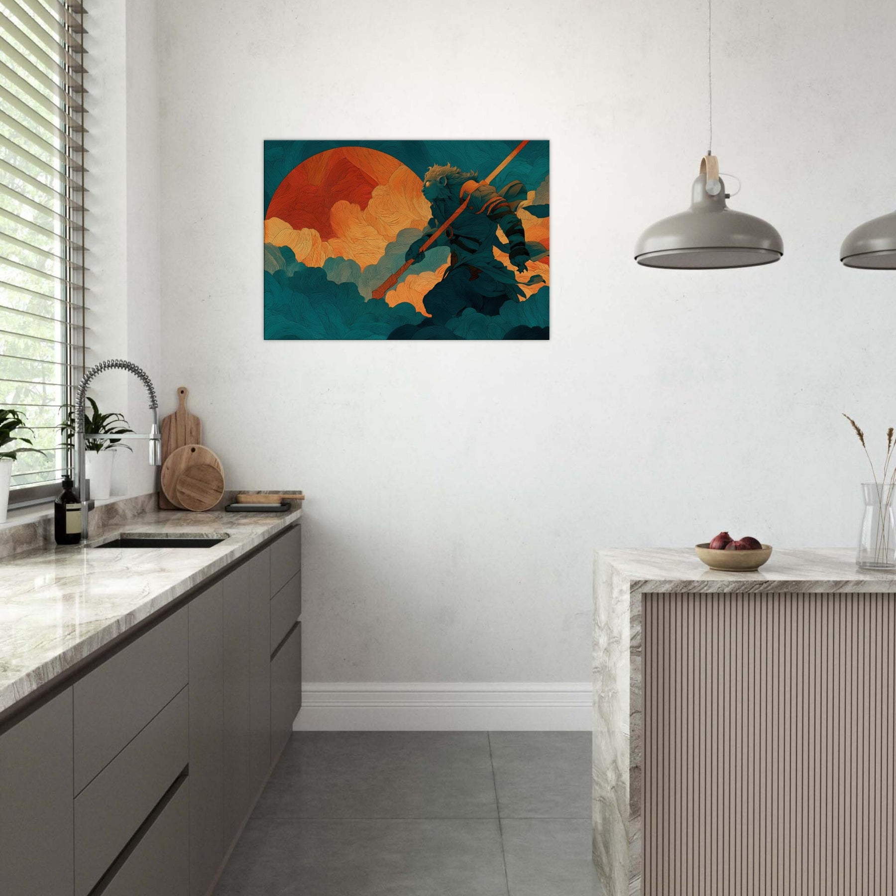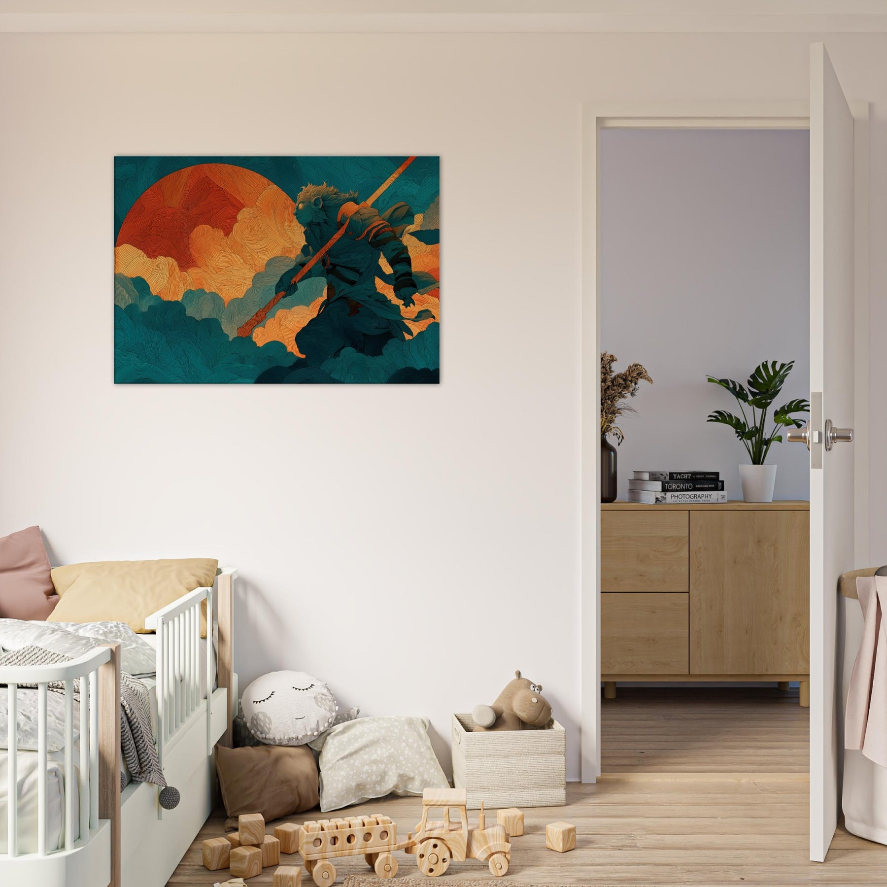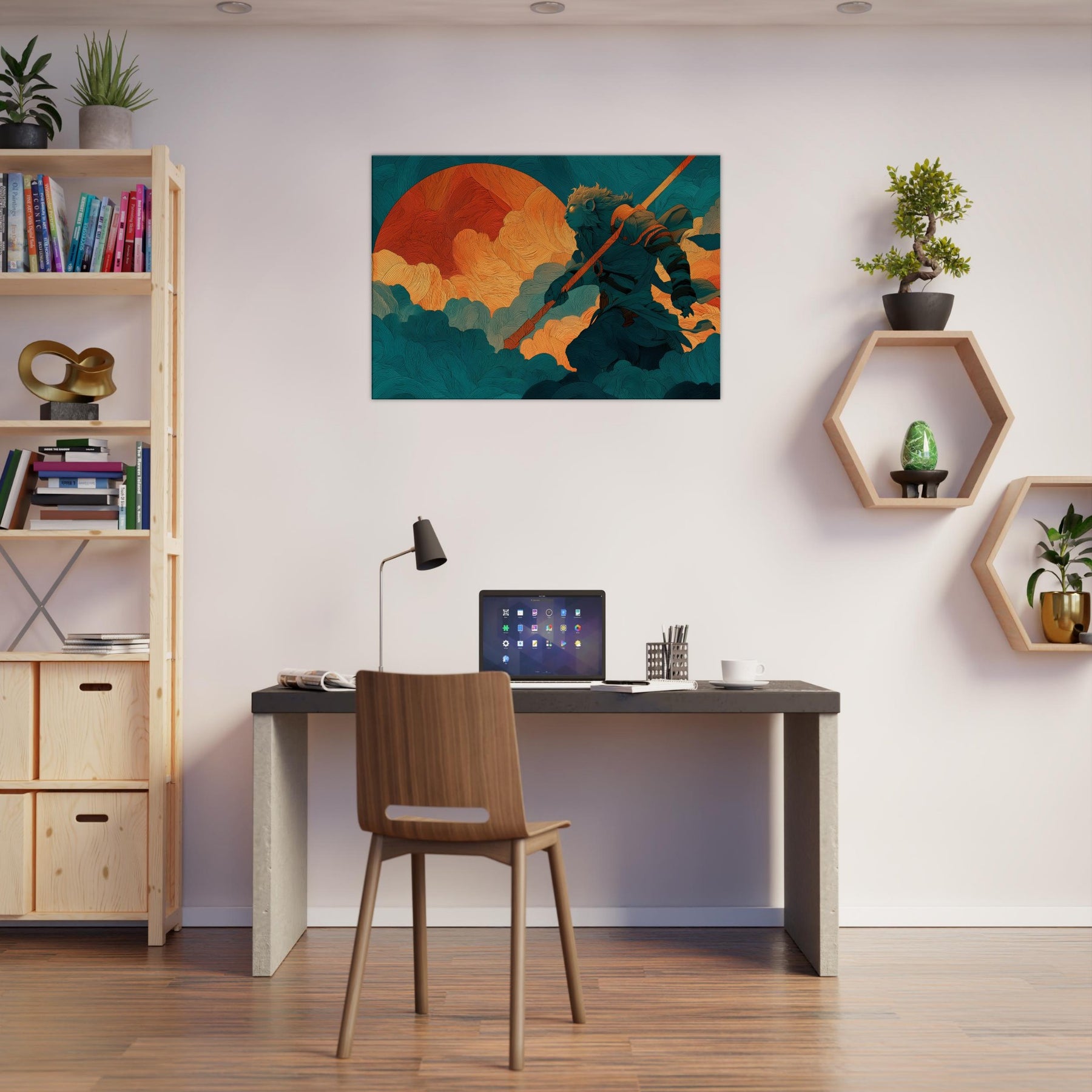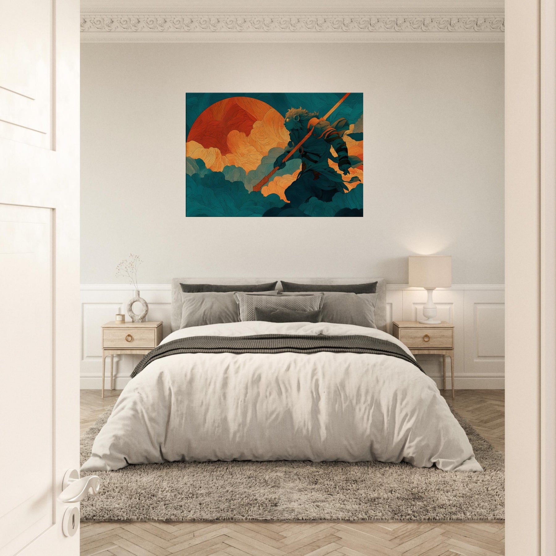 A bold homage to Wukong, the Monkey King Wielding His Golden Staff Above the Clouds, this piece swirls in teal and copper, turning momentum and myth into luminous forms. The atmosphere feels like sunrise on a churning sea of color, inviting calm focus or spirited conversation. Perfect for living rooms, studies, or entryways, it lends a kinetic, dreamlike energy that elevates every moment spent beneath it.