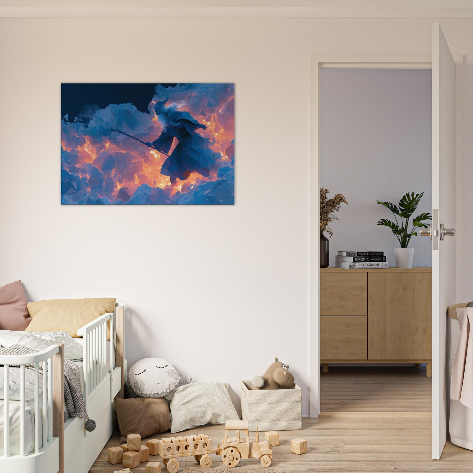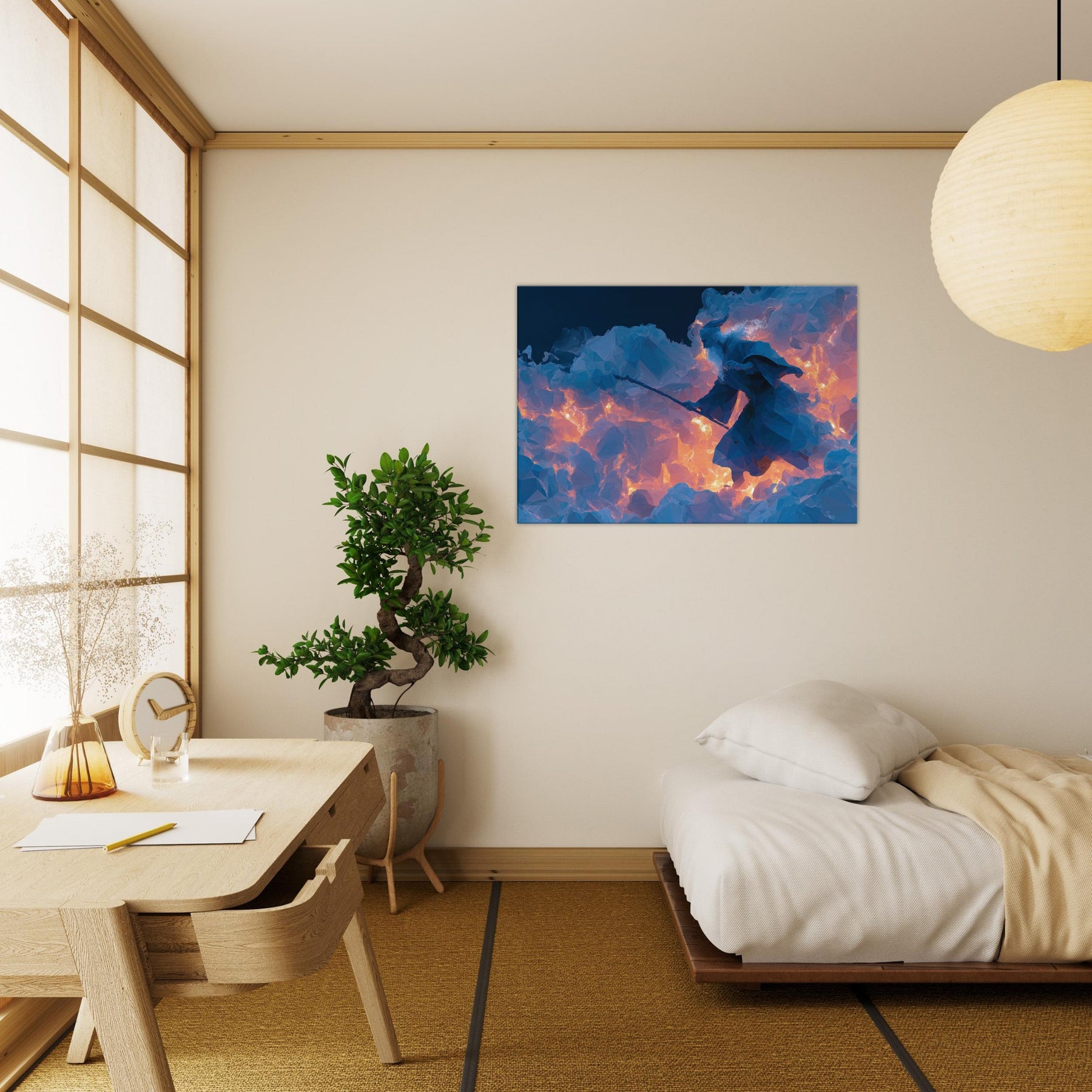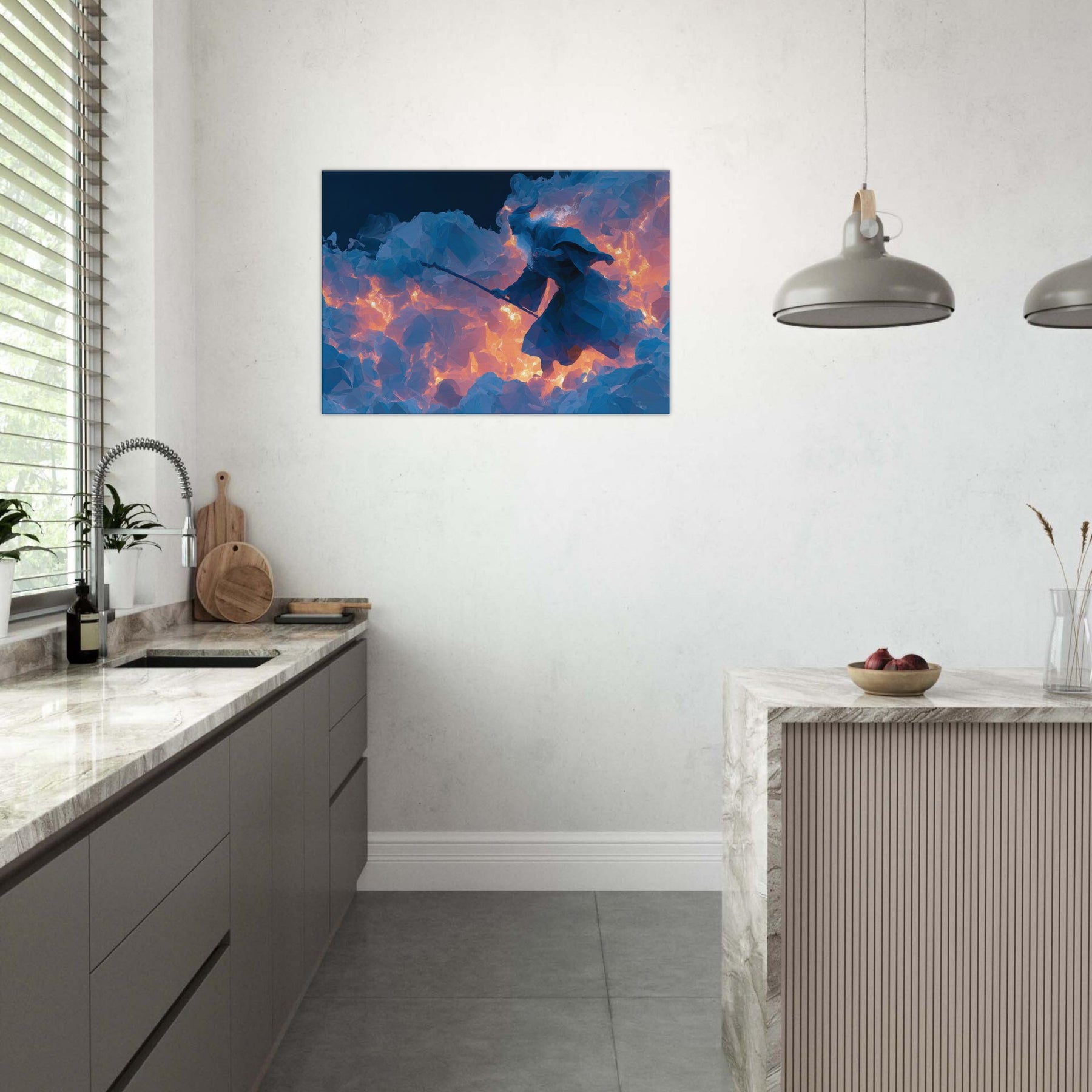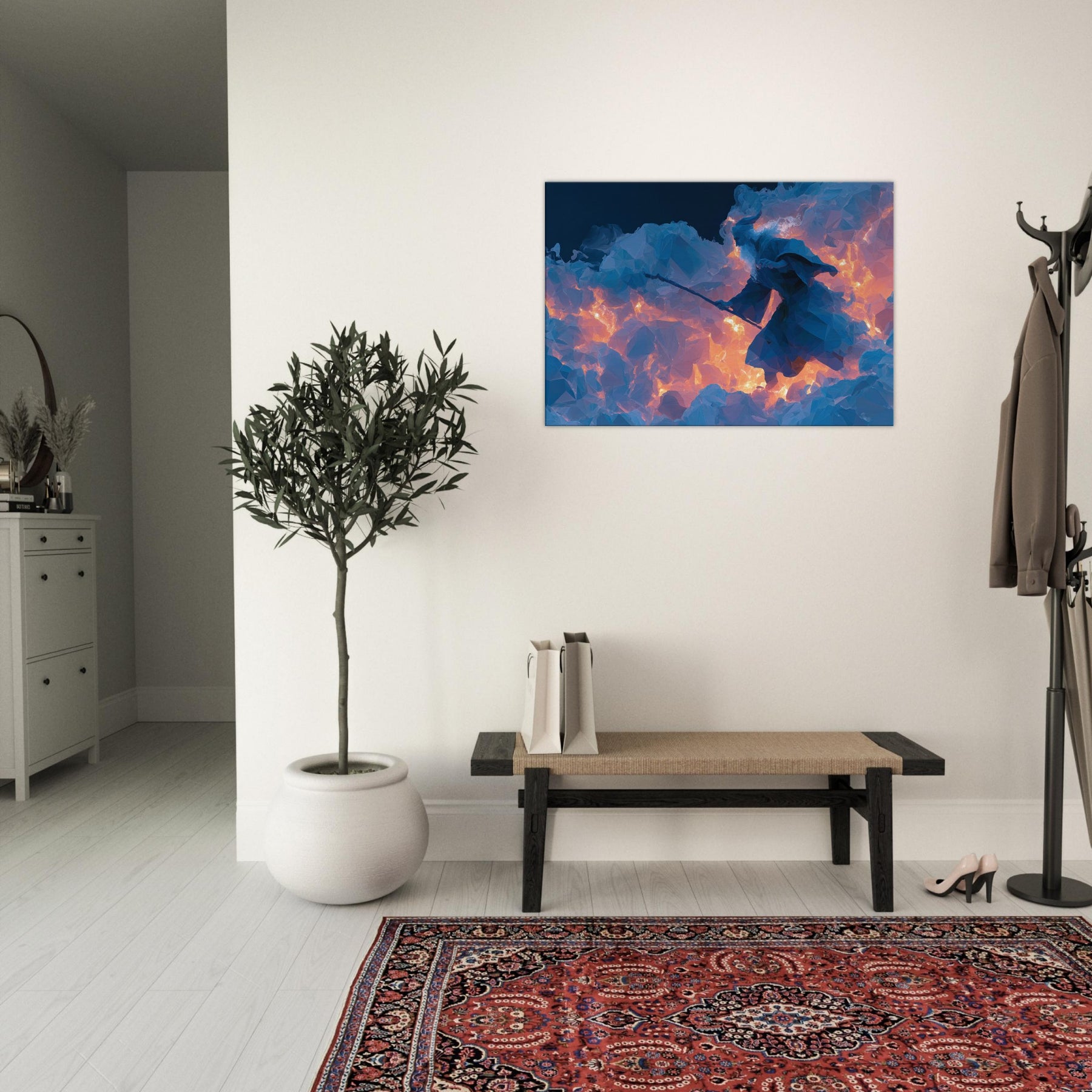Step into a tranquil blaze of color where a Mysterious Wizard Casting Spells glides between blue frost and ember gold. This abstract meditation on form and light awakens ancient magic in the heart of your room. The piece breathes warmth into cool corners, turning dusk into invitation and conversation into quiet awe. Let the spellbinding movement drift across your wall, guiding the eye with luminous swirls and soft edges that feel both mythical and intimate.
