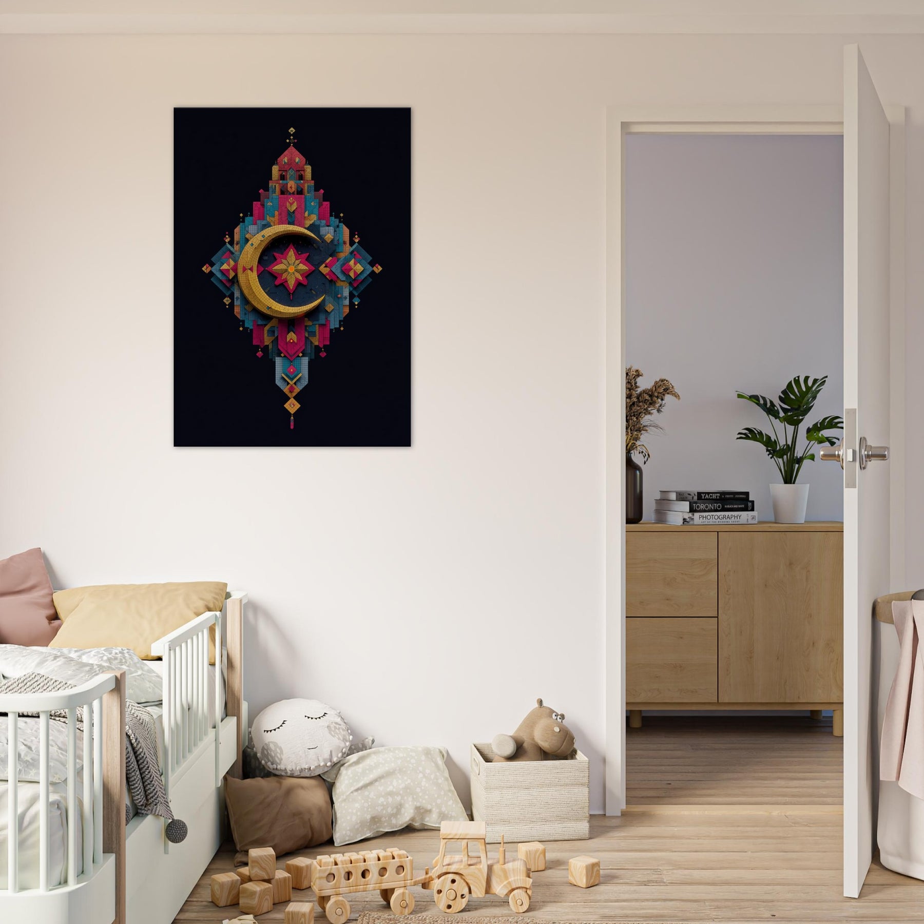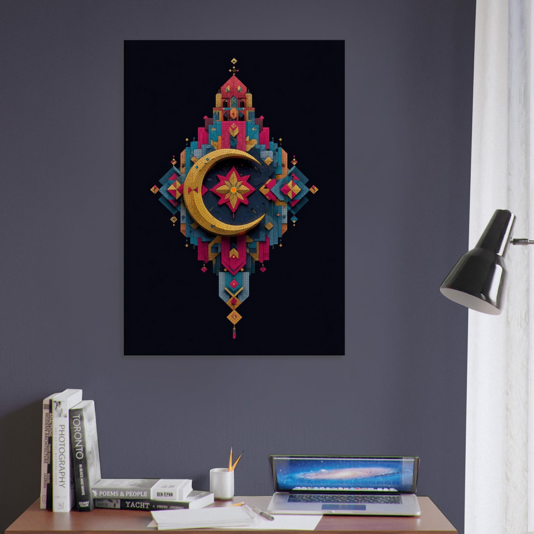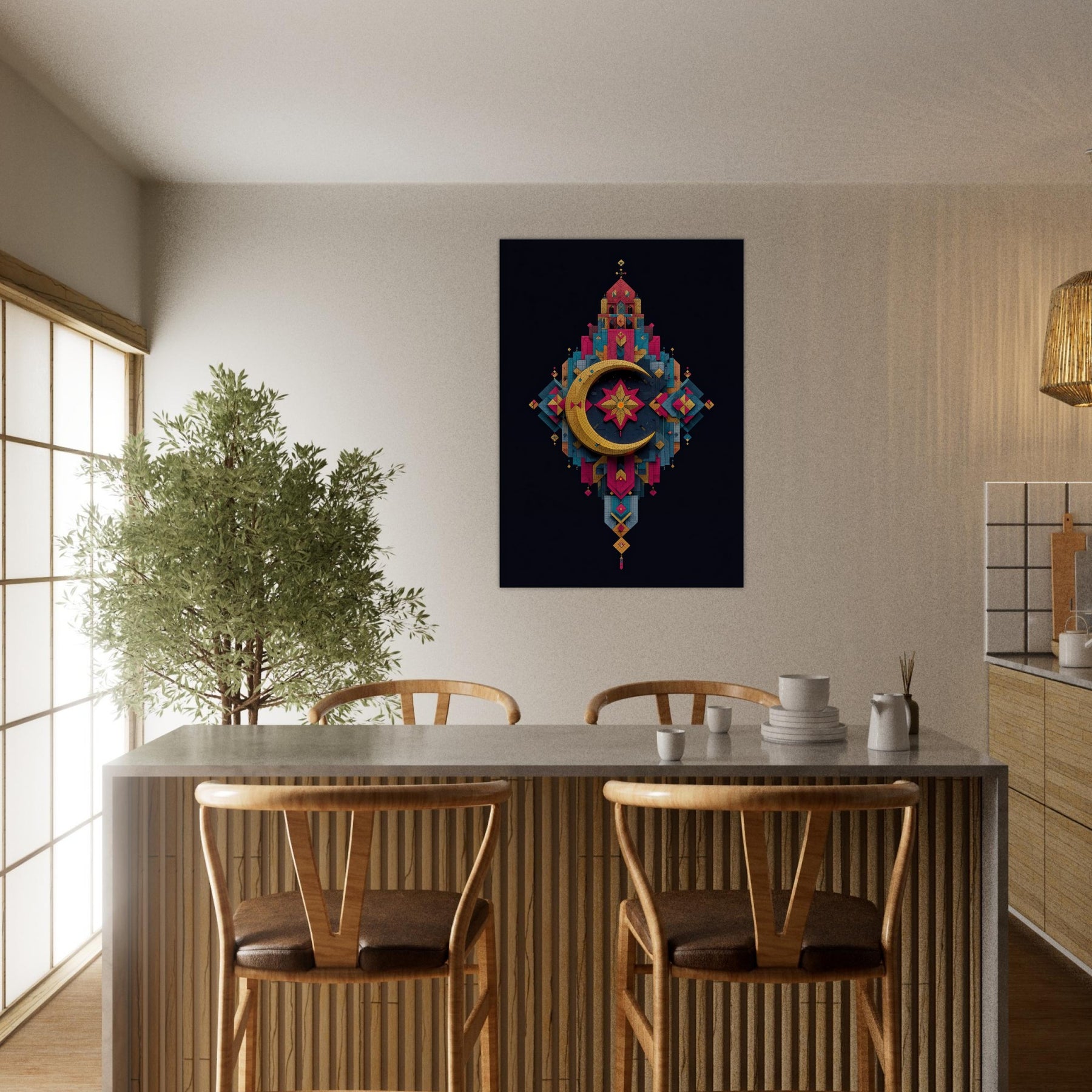 With the Crescent & Star motif at center stage, this piece unfolds as a nocturnal city rendered in color and grain. Layered geometric planes in gold, teal, pink, and cobalt breathe light and shadow, inviting the eye to travel inward. The minimal elegance heightens a room's atmosphere, calm, confident, and subtly magical. Hang it where conversations drift from dusk to evening, and watch the space awaken: a quiet gallery of mood, texture, and wonder around everyday moments. The central subject is Crescent & Star (Minimal).