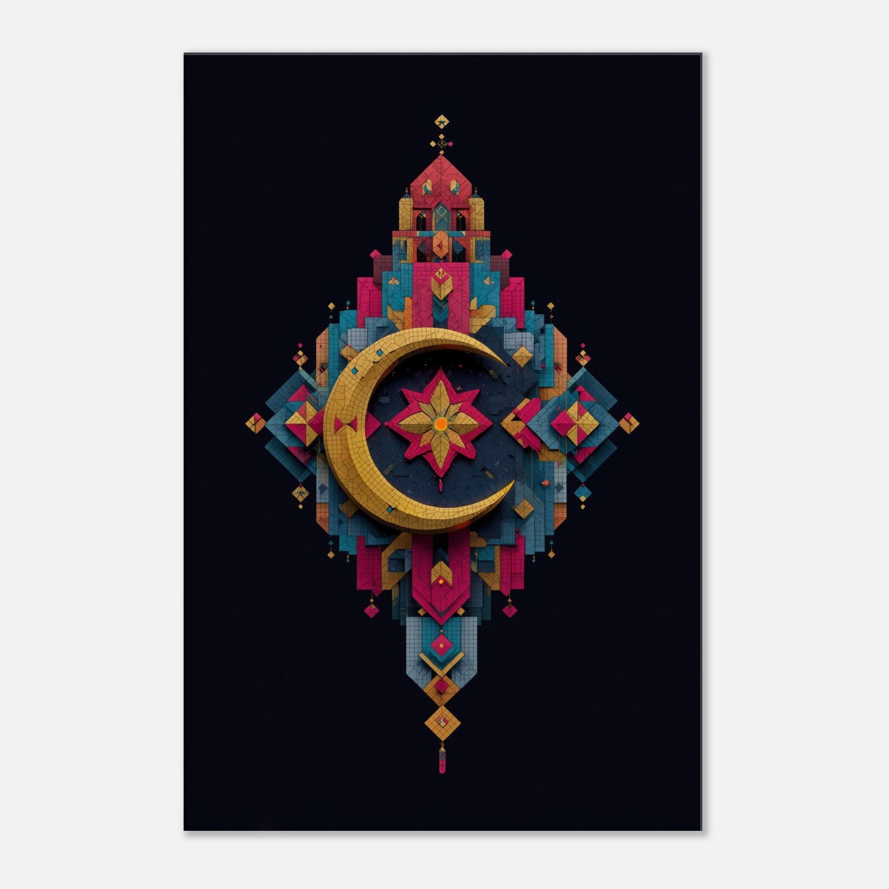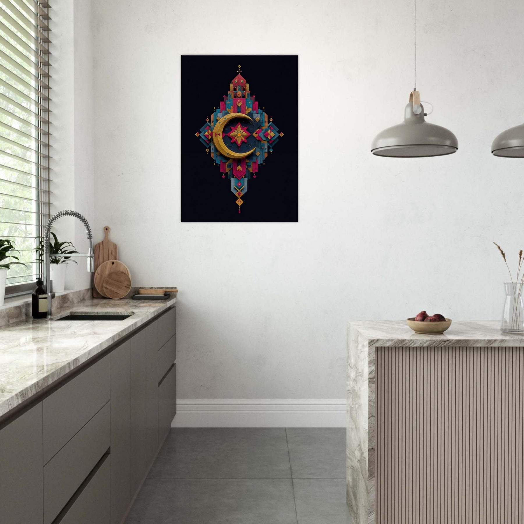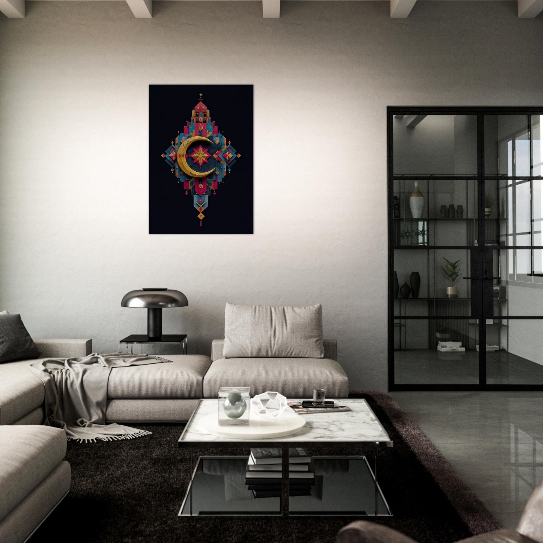 With the Crescent & Star motif at center stage, this piece unfolds as a nocturnal city rendered in color and grain. Layered geometric planes in gold, teal, pink, and cobalt breathe light and shadow, inviting the eye to travel inward. The minimal elegance heightens a room's atmosphere, calm, confident, and subtly magical. Hang it where conversations drift from dusk to evening, and watch the space awaken: a quiet gallery of mood, texture, and wonder around everyday moments. The central subject is Crescent & Star (Minimal).