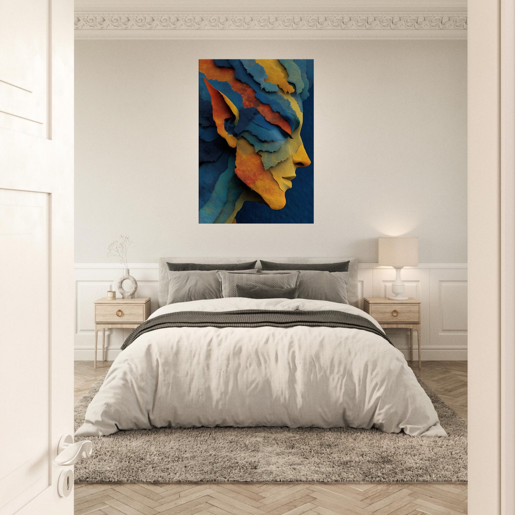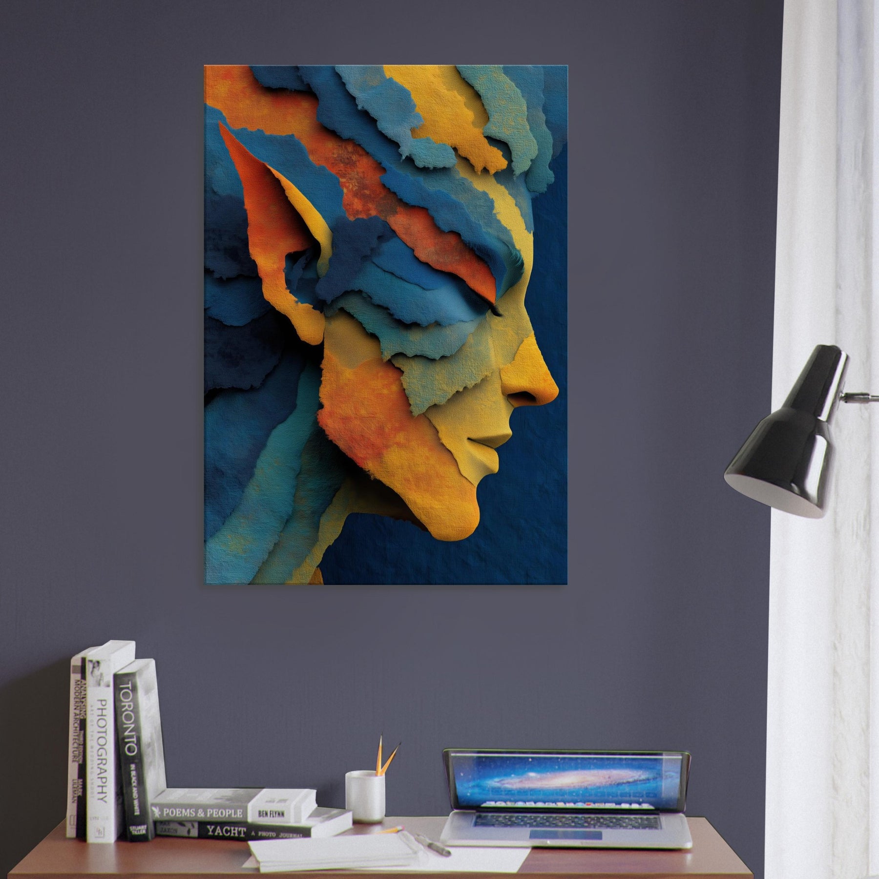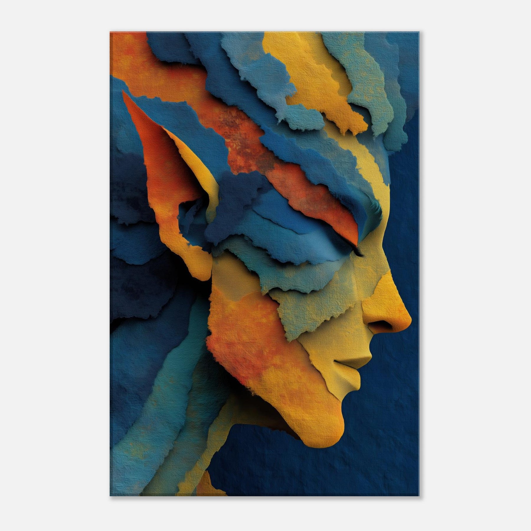 Let the Moonlit Elf drift across your living room like a whispered legend. This abstract distills myth and memory into layered ribbons of color azure, gold, and coral that fold and unfold with every step of the eye. The Elf's profile emerges from the tessellated textures, inviting a quiet ritual of pause and reflection. Placed in a sunlit nook or a moody study, it reframes light into warmth and depth, turning ordinary walls into a portal to fantasy, grace, and inner calm.
