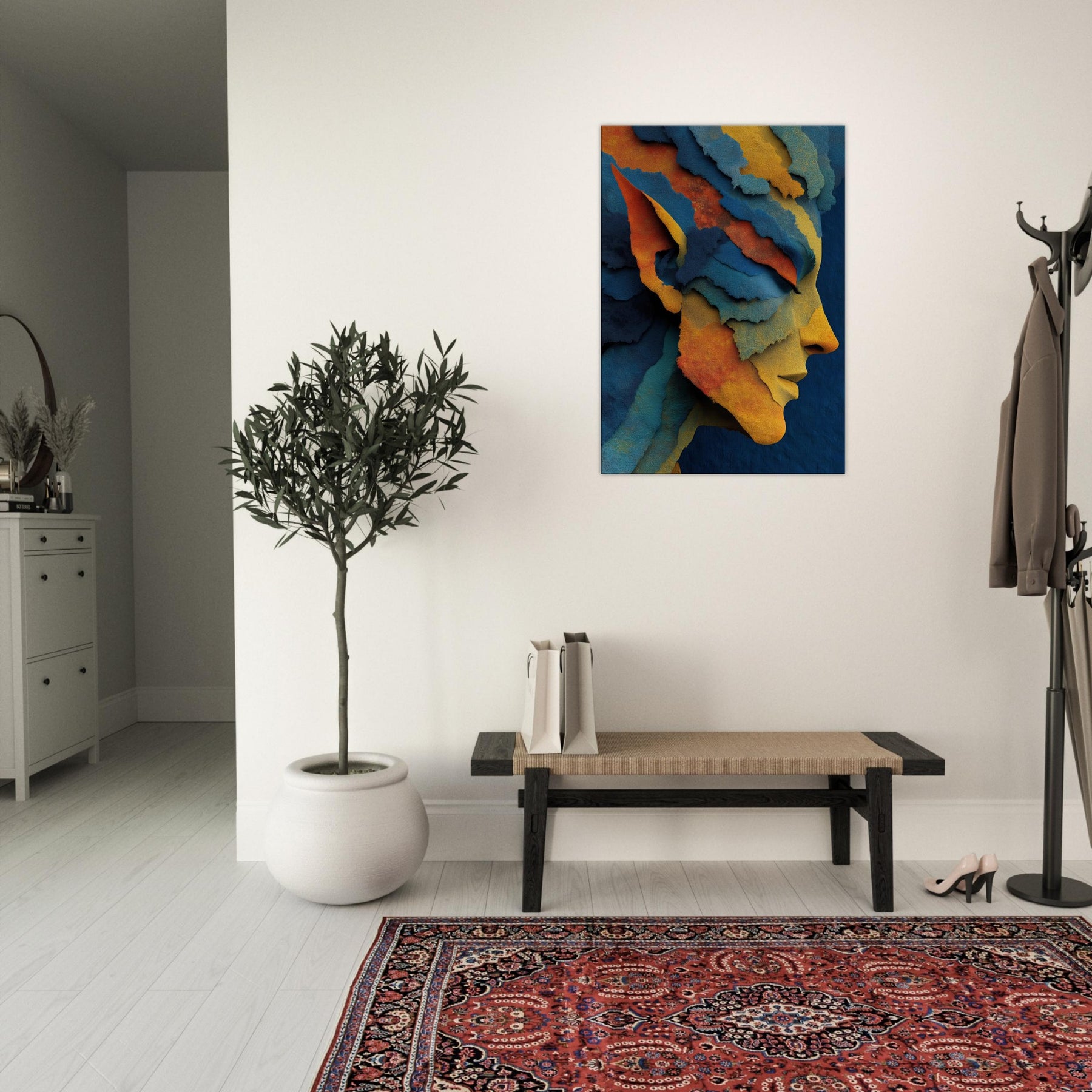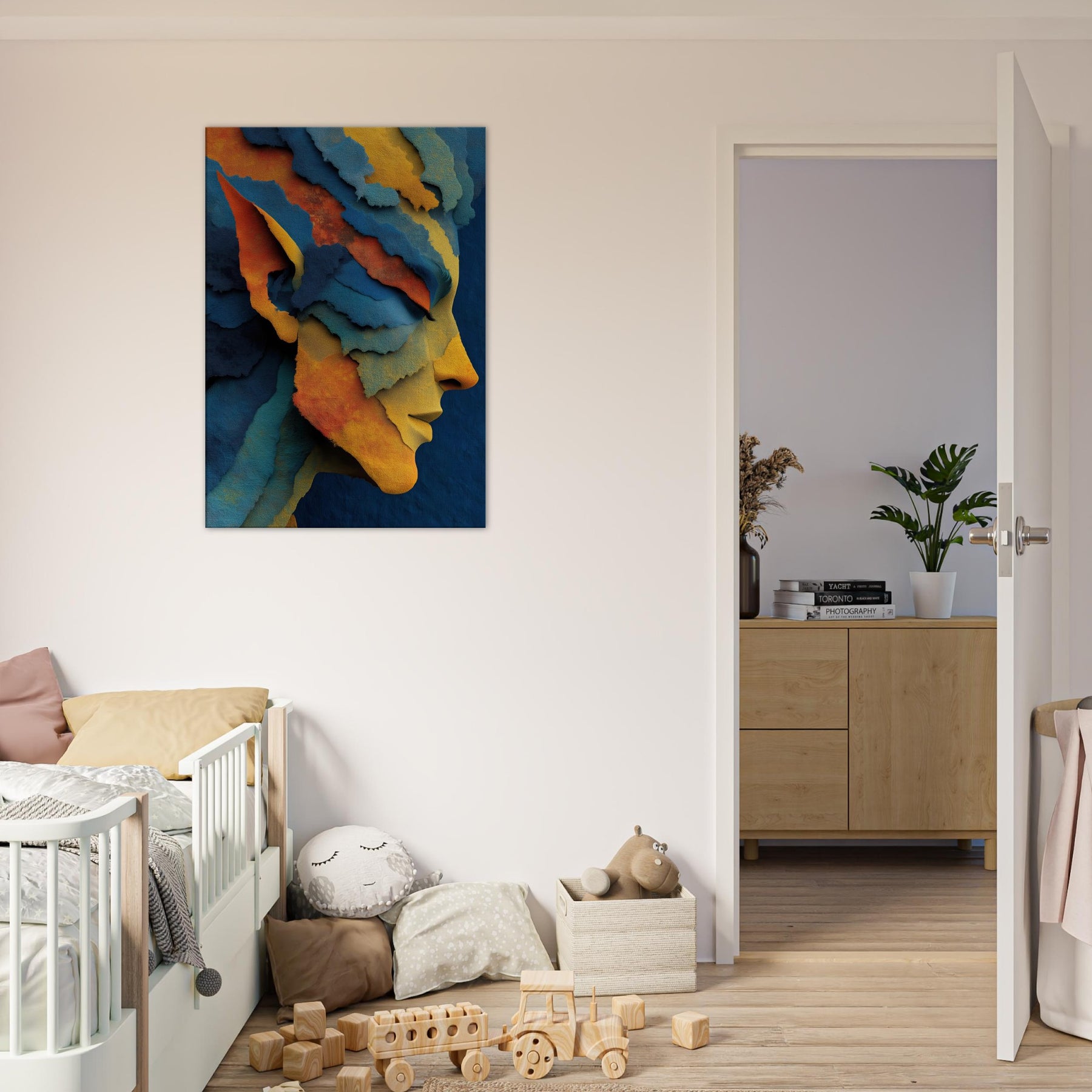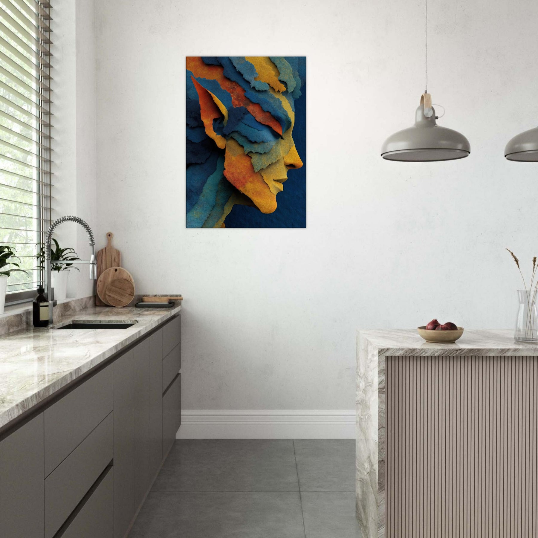 Let the Moonlit Elf drift across your living room like a whispered legend. This abstract distills myth and memory into layered ribbons of color azure, gold, and coral that fold and unfold with every step of the eye. The Elf's profile emerges from the tessellated textures, inviting a quiet ritual of pause and reflection. Placed in a sunlit nook or a moody study, it reframes light into warmth and depth, turning ordinary walls into a portal to fantasy, grace, and inner calm.