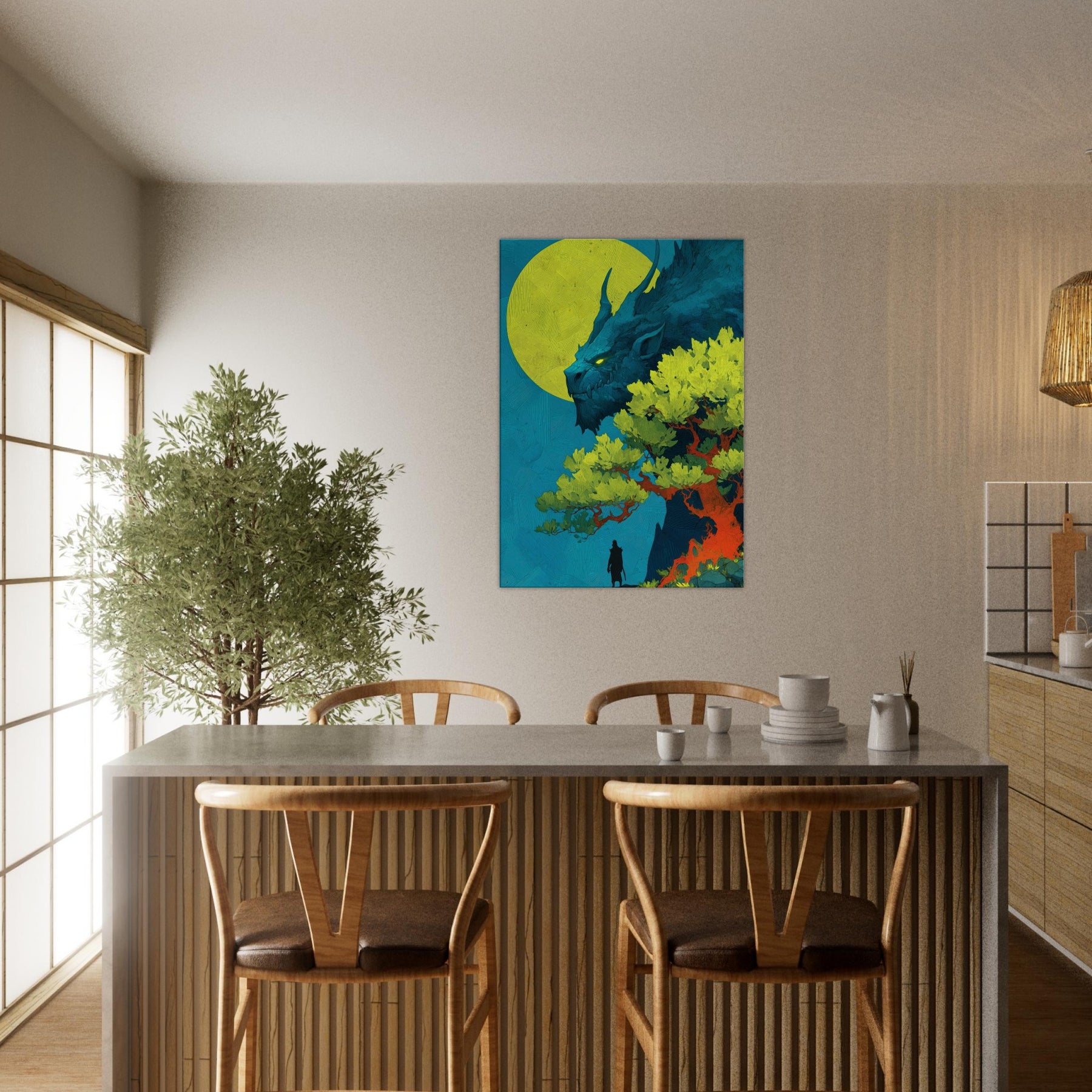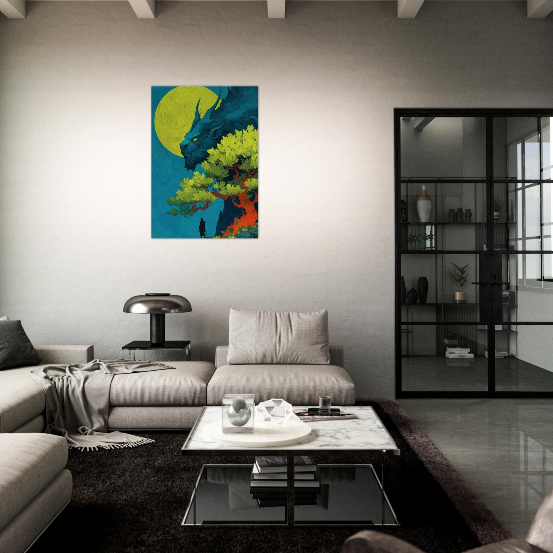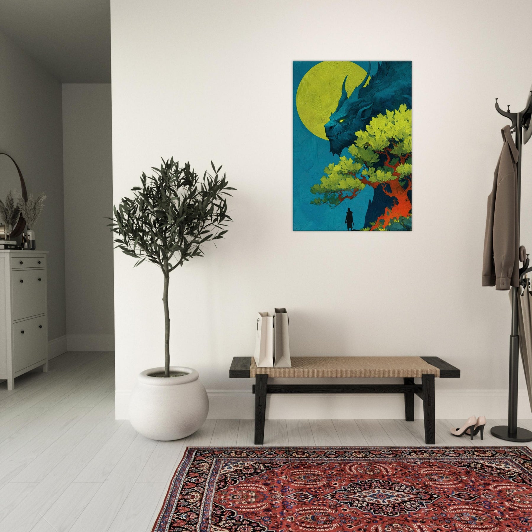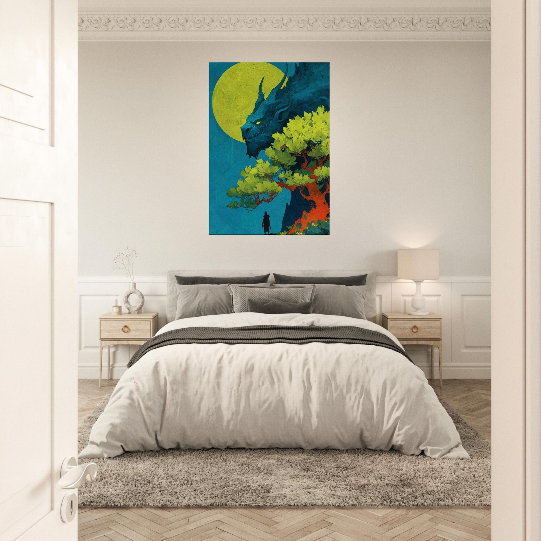 Step into a dream where an ancient dragon curls above a moonlit grove, and a lone wanderer gaze upward from shadowed pines. The Enchanted Forest unfurls in luminous greens and electric blues, rendered in fluid, sculptural strokes that shimmer with mystery. This abstract composition balances bold color with hum of myth, inviting quiet evenings and sunlit corners alike. Hang it in a living room or study to invite wonder, conversation, and a sense of otherworldly calm that makes walls breathe and the imagination step forward.