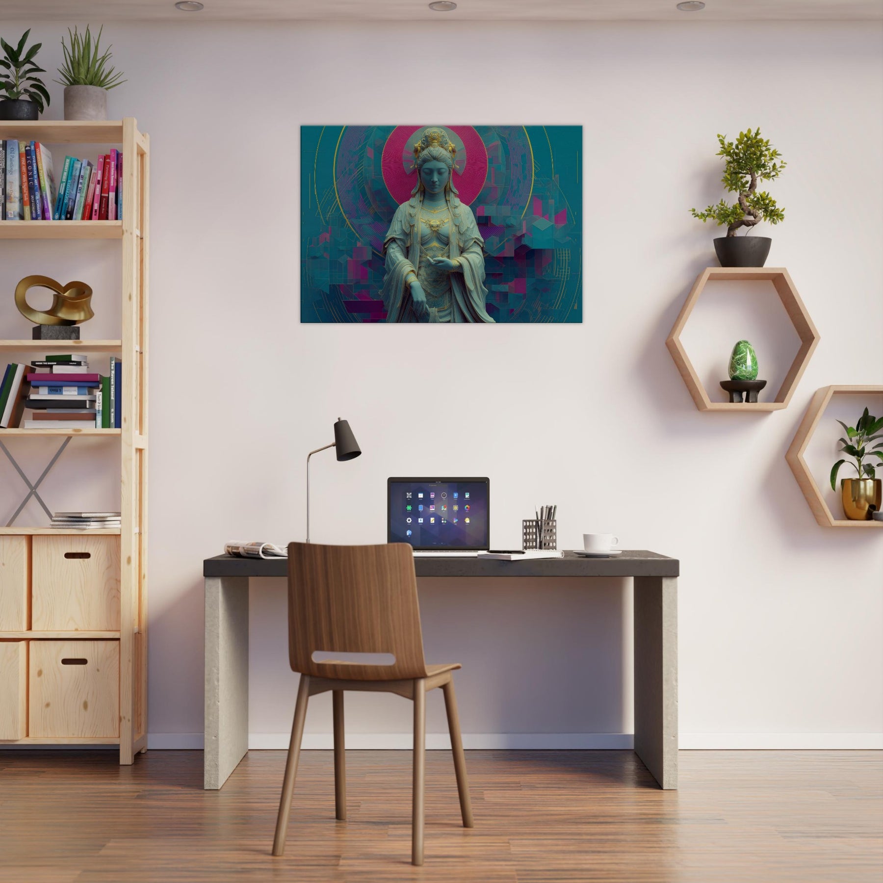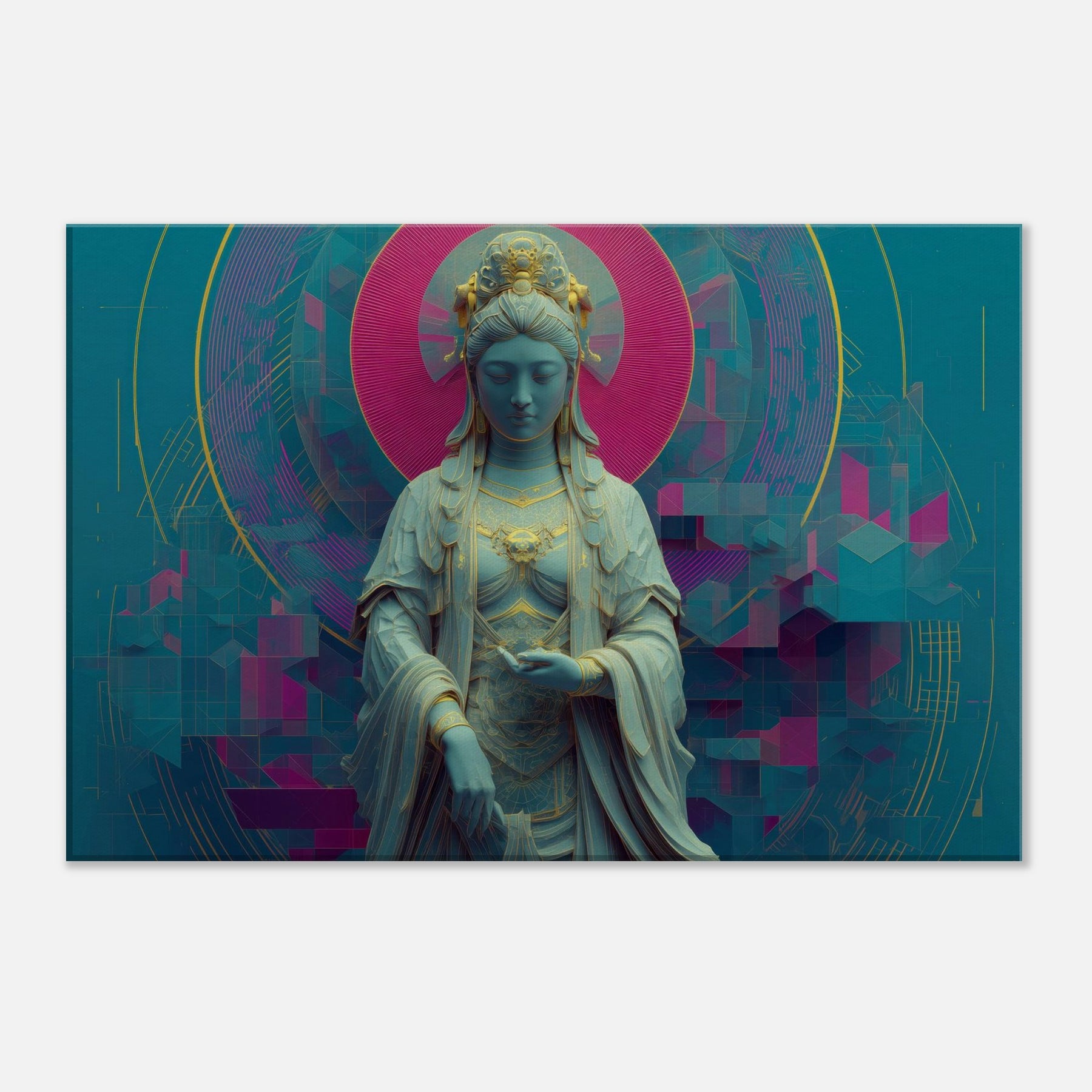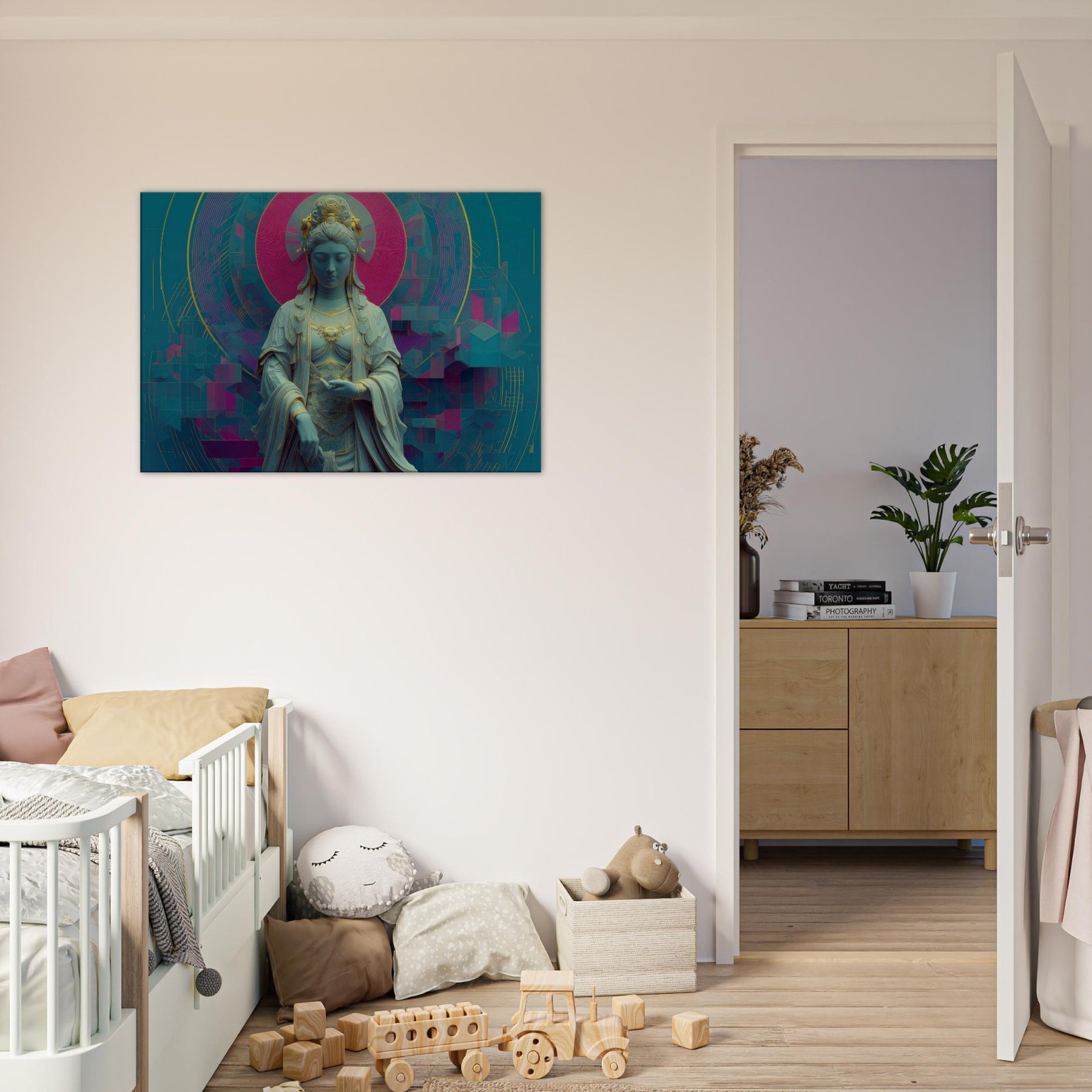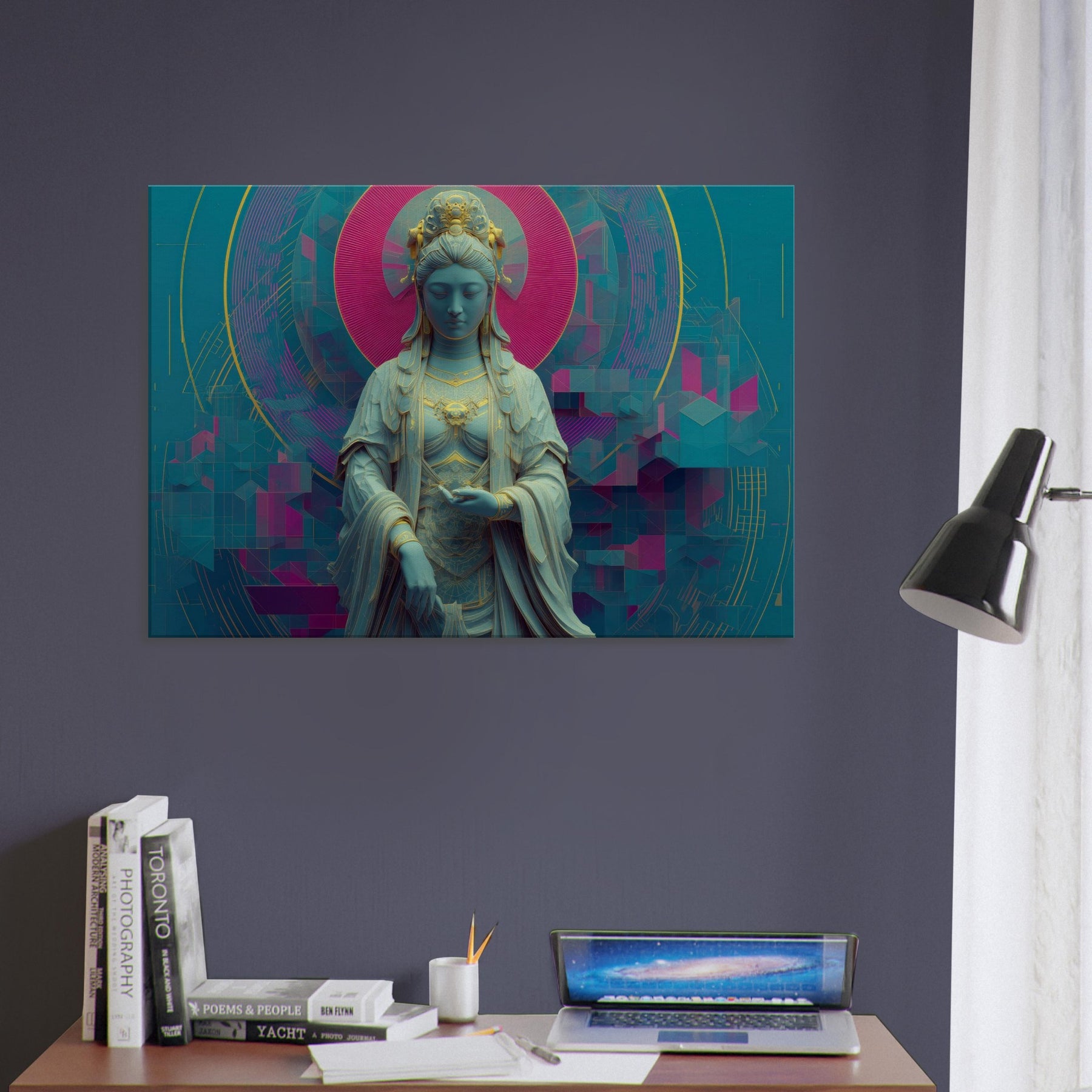 Drifting between memory and reverie, this Kuan Yin figure emerges with a quiet radiance that softens any room. The sculpted form is bathed in teal and gold, its serene expression mirrored by a halo of luminous rings that expand behind her. Geometric planes and ambient glow weave a mystical atmosphere, conjuring calm, balance, and protection. Hang it where light travels or where conversations pause, and let the presence of Kuan Yin invite mindful stillness, gentle generosity, and a subtle sense of wonder into everyday life. The central subject is Kuan Yin (Guanyin).